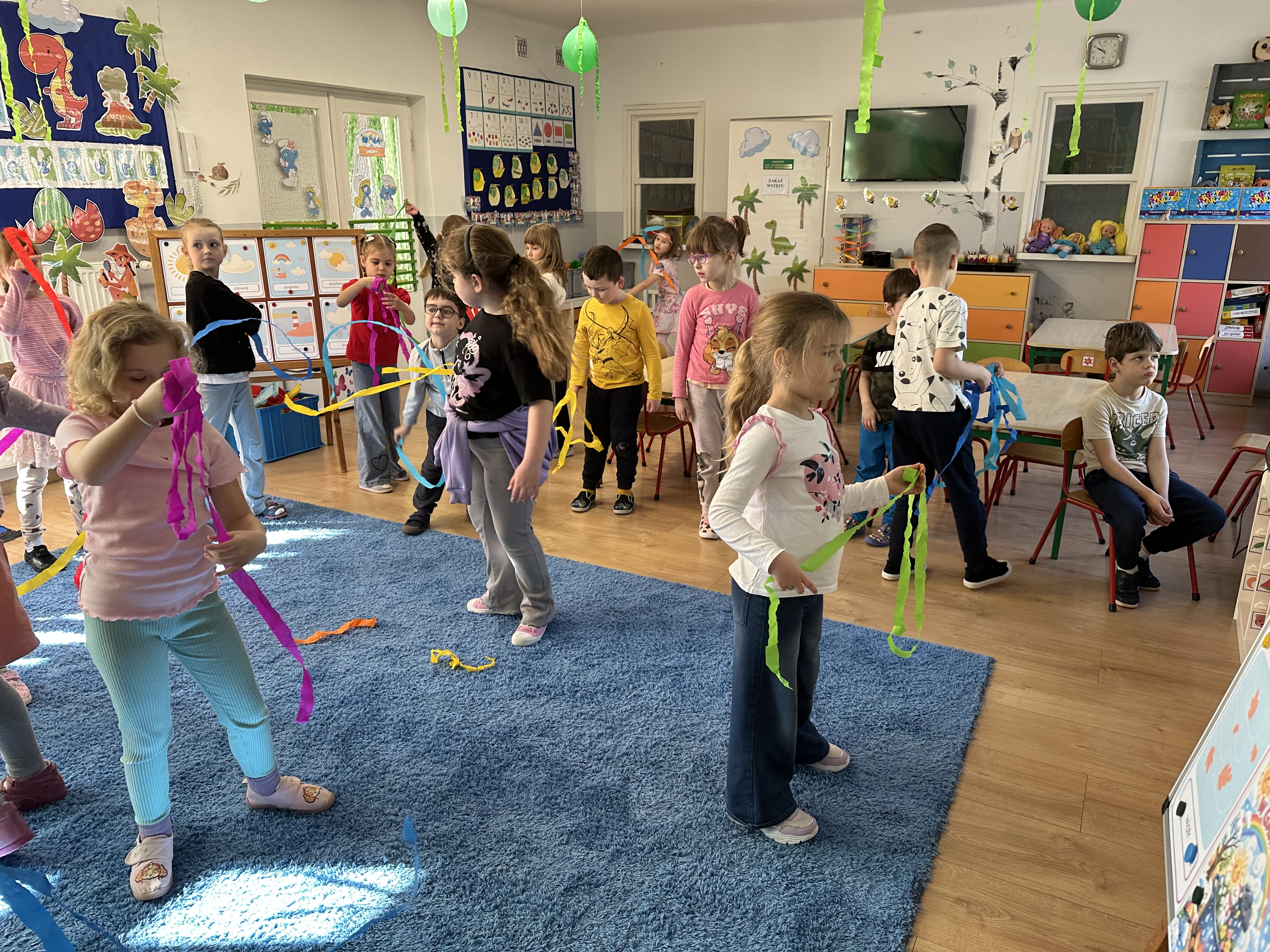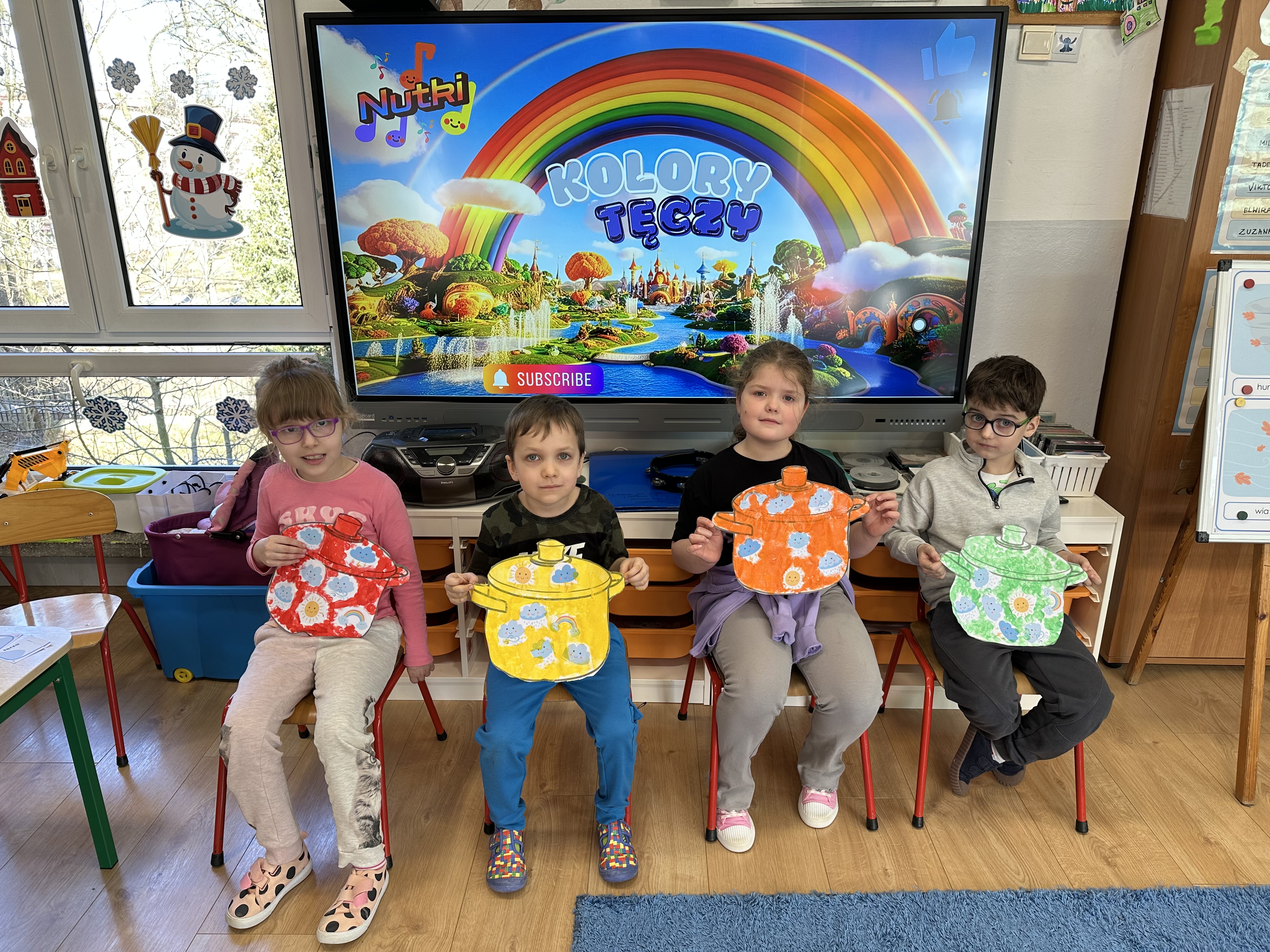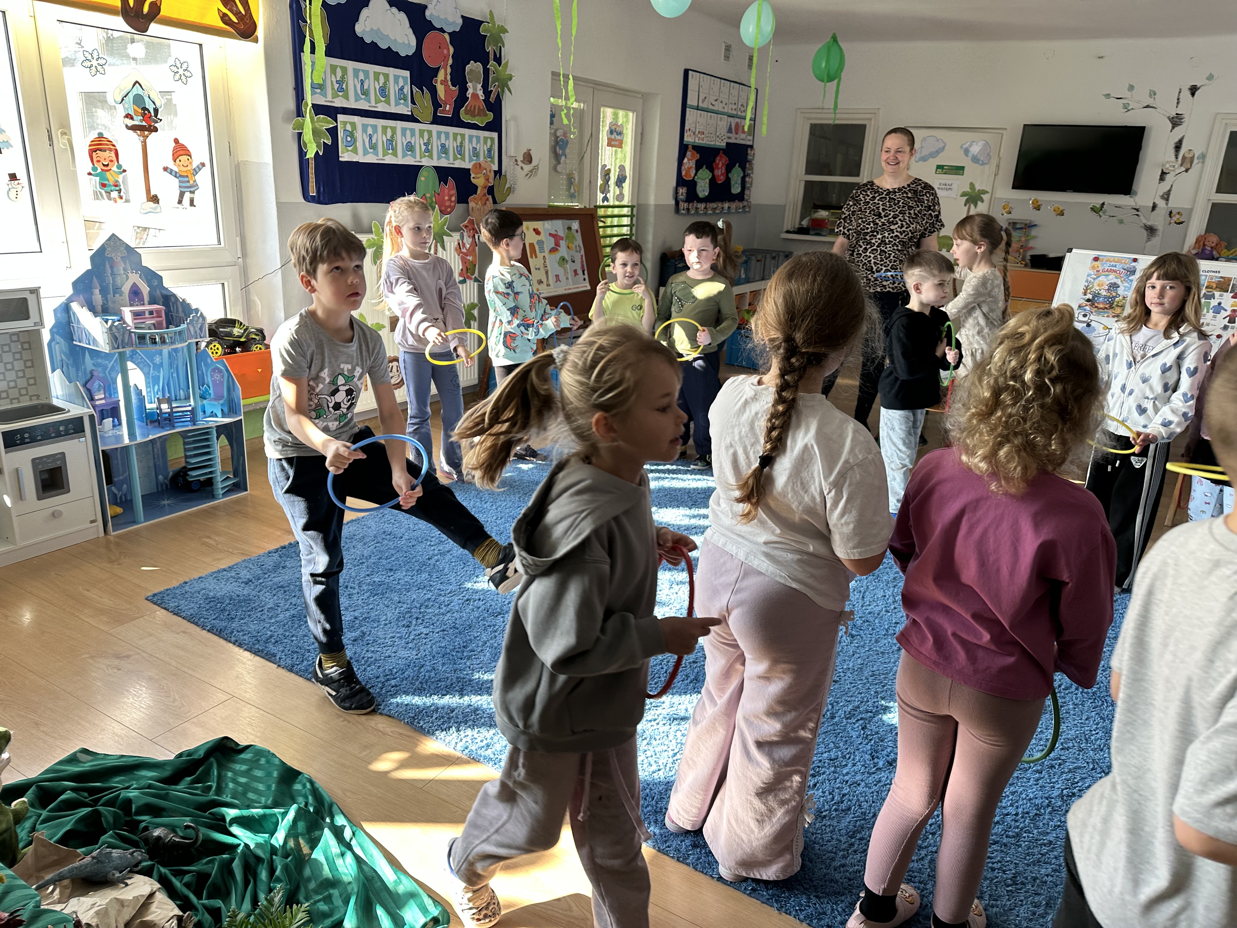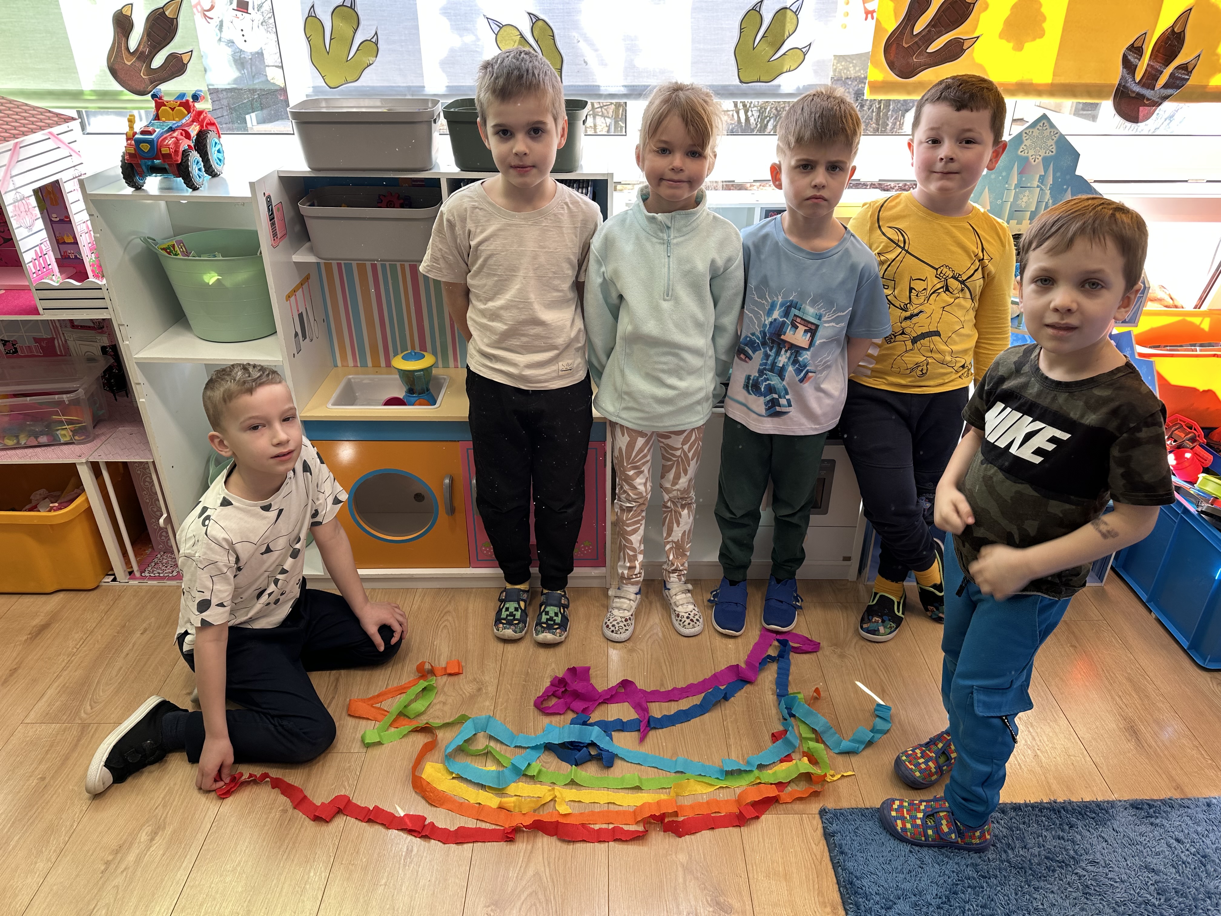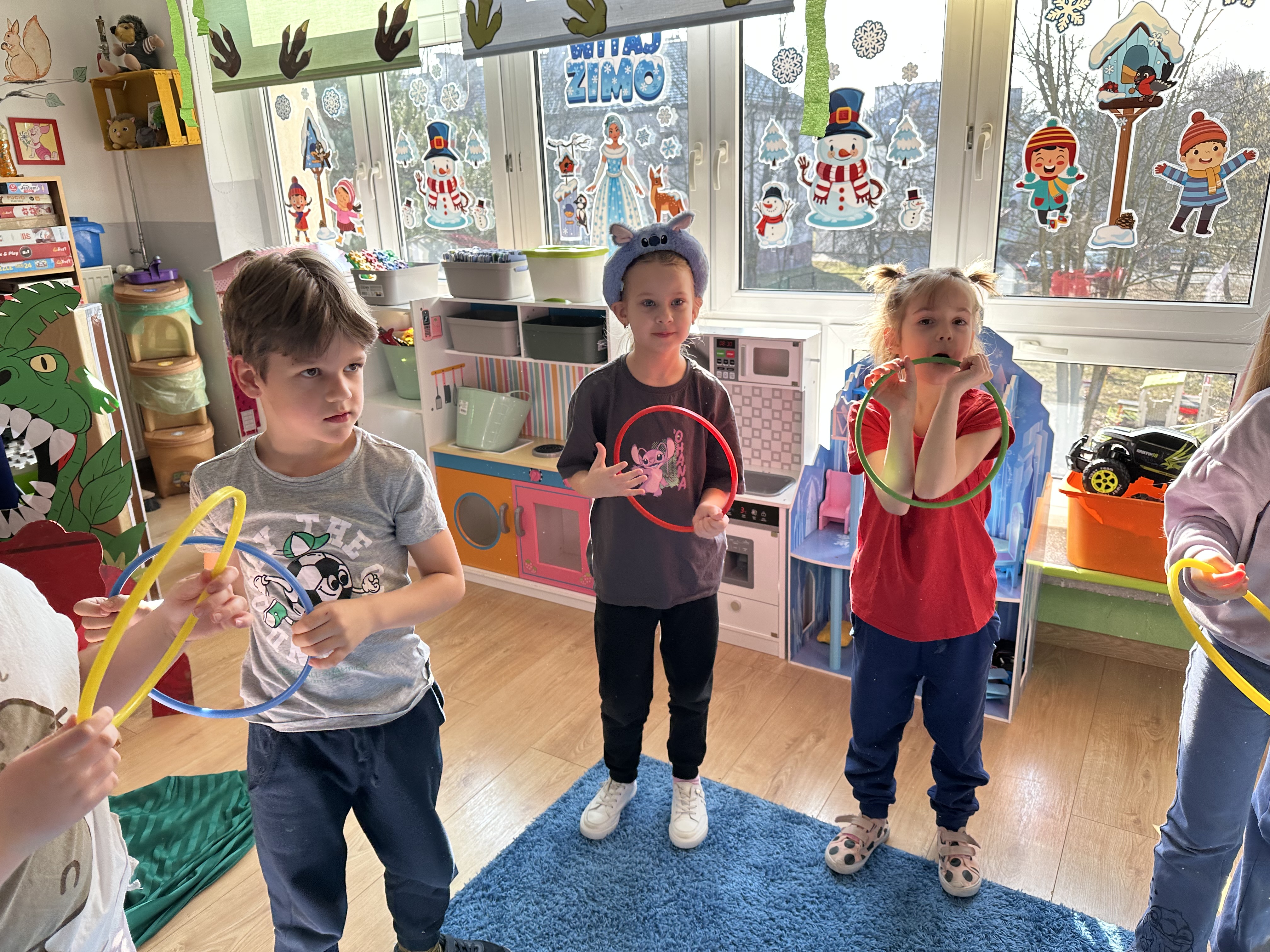 z ciekawostkami na temat budzenia się zwierząt ze snu zimowego. Nauczyły się rymowanki ,,Koncert dzięcioła”, a pod koniec dnia brały udział w „Kwiatowej zakrywajce” – grze matematycznej, podczas której rozwijały umiejętności przeliczania elementów i rozpoznawania obrazu graficznego liczb. W piątek dzieci utrwaliły nazwy i kolejność miesięcy oraz dni tygodnia. Dodatkowo przedszkolaki rozwijały również ekspresję taneczną w trakcie zabawy ,,Taniec Pani Wiosny”, a także doskonaliły analizę głoskową podczas zabawy językowej „Psotny wiatr”. Dzień zakończyły pracą plastyczną, tzn. wykonały witraż według instrukcji.