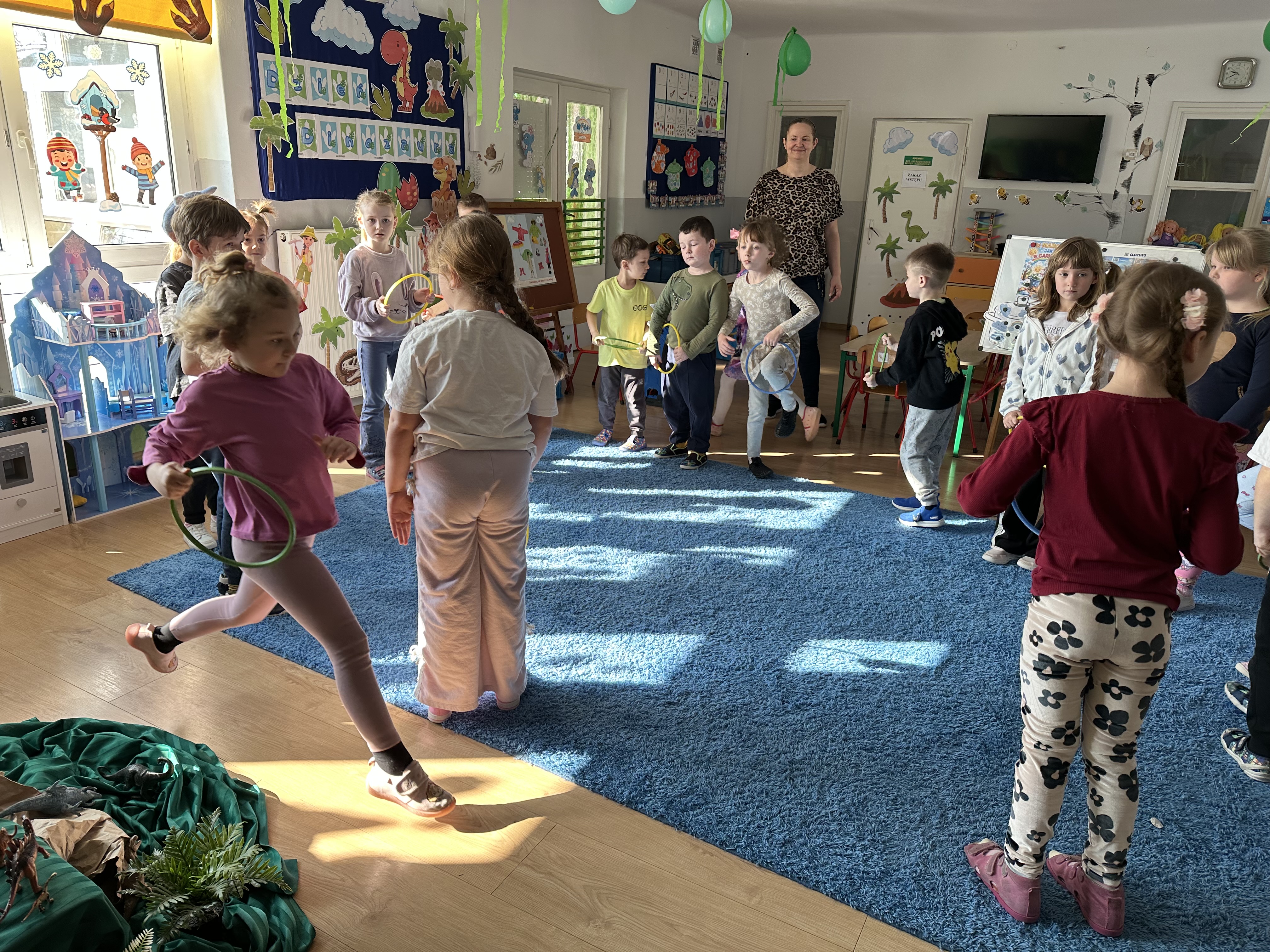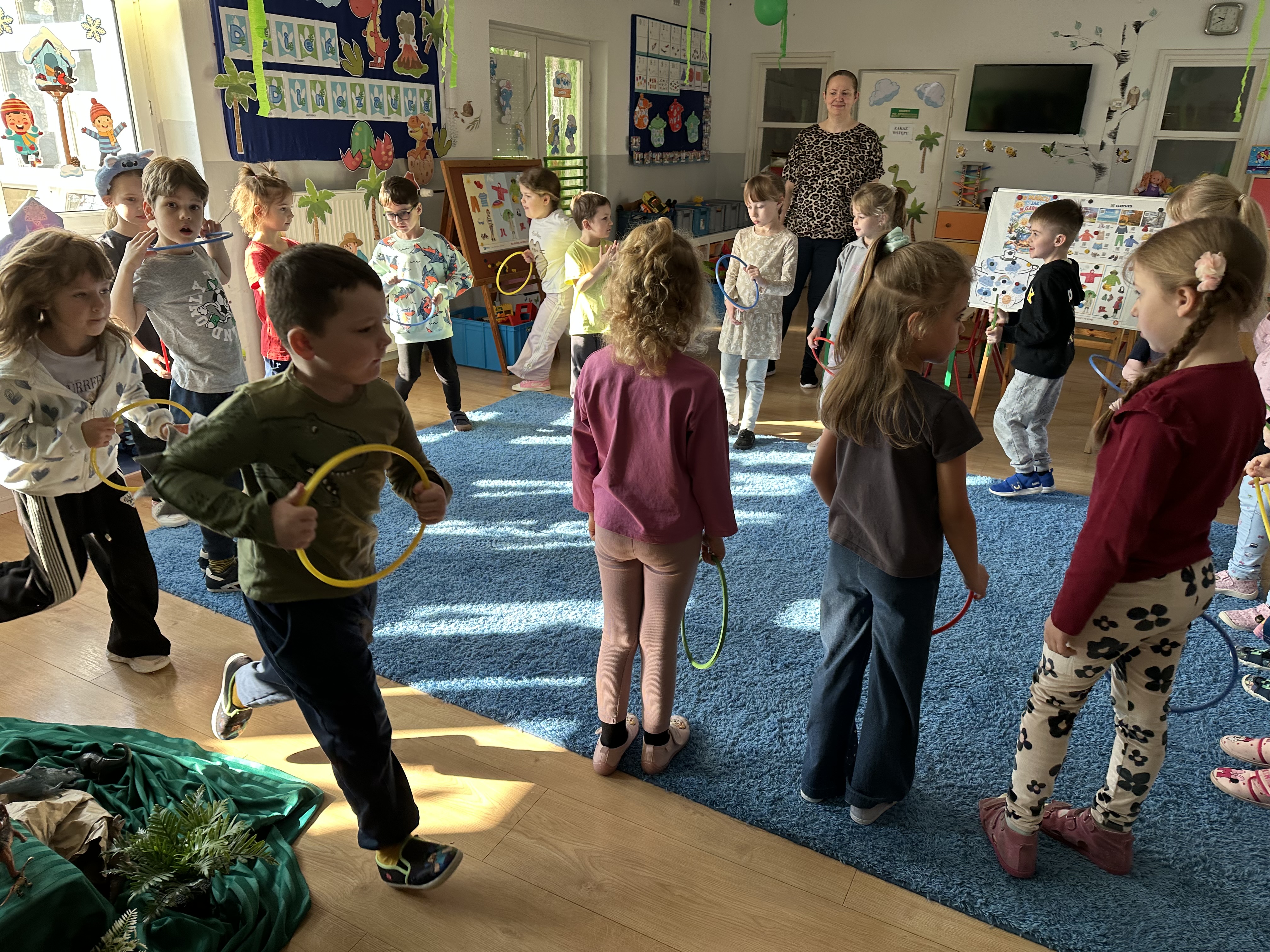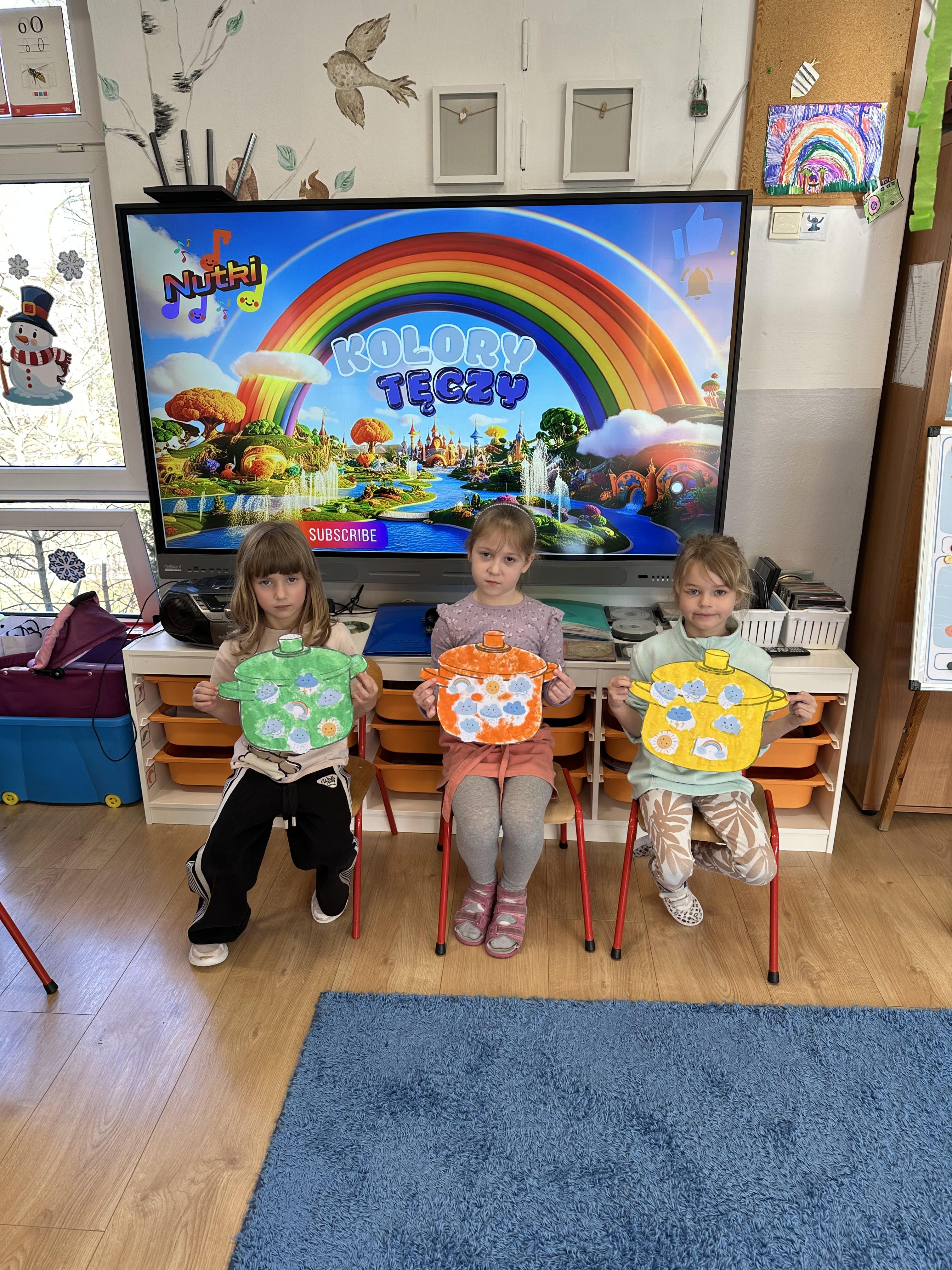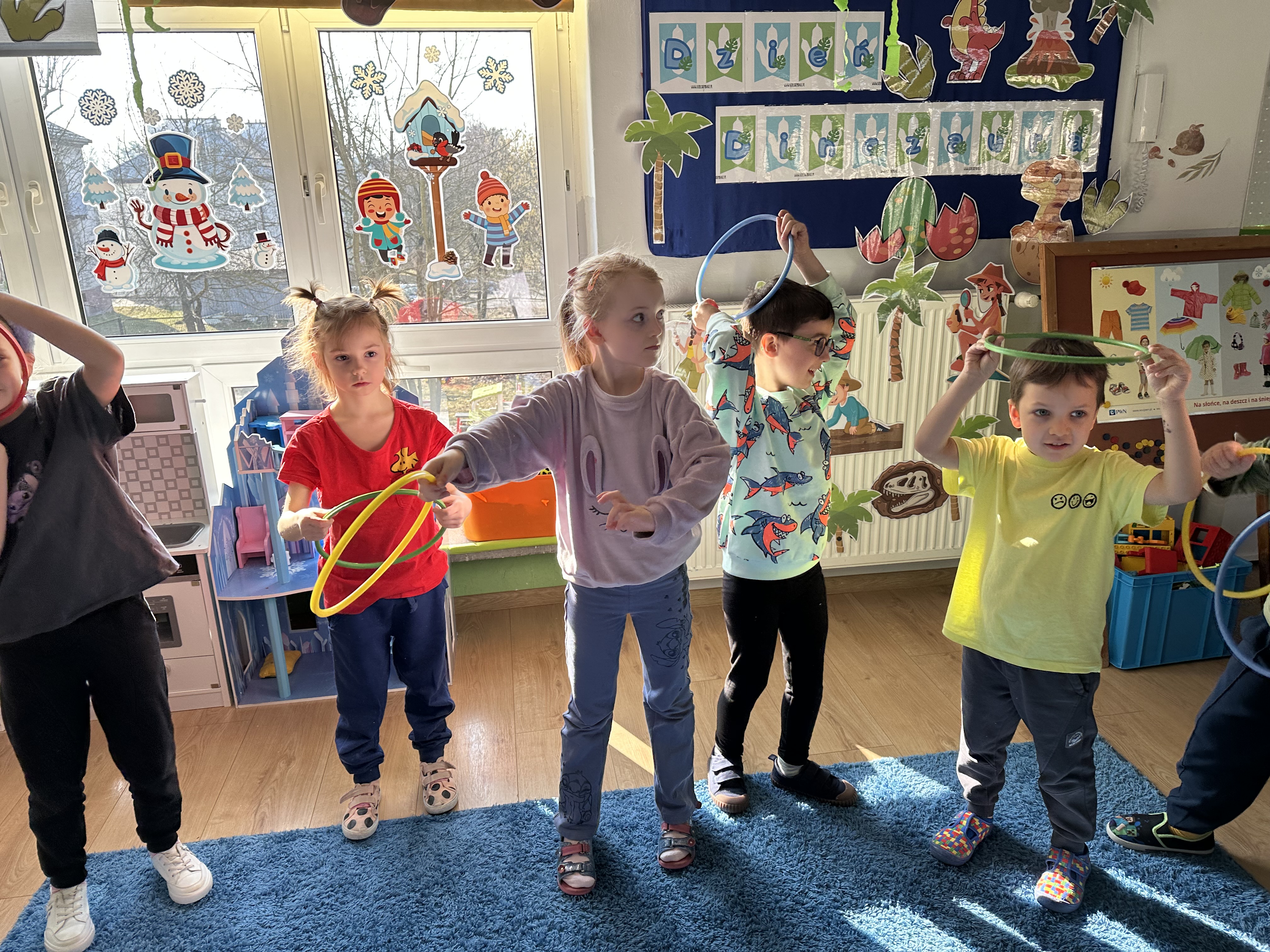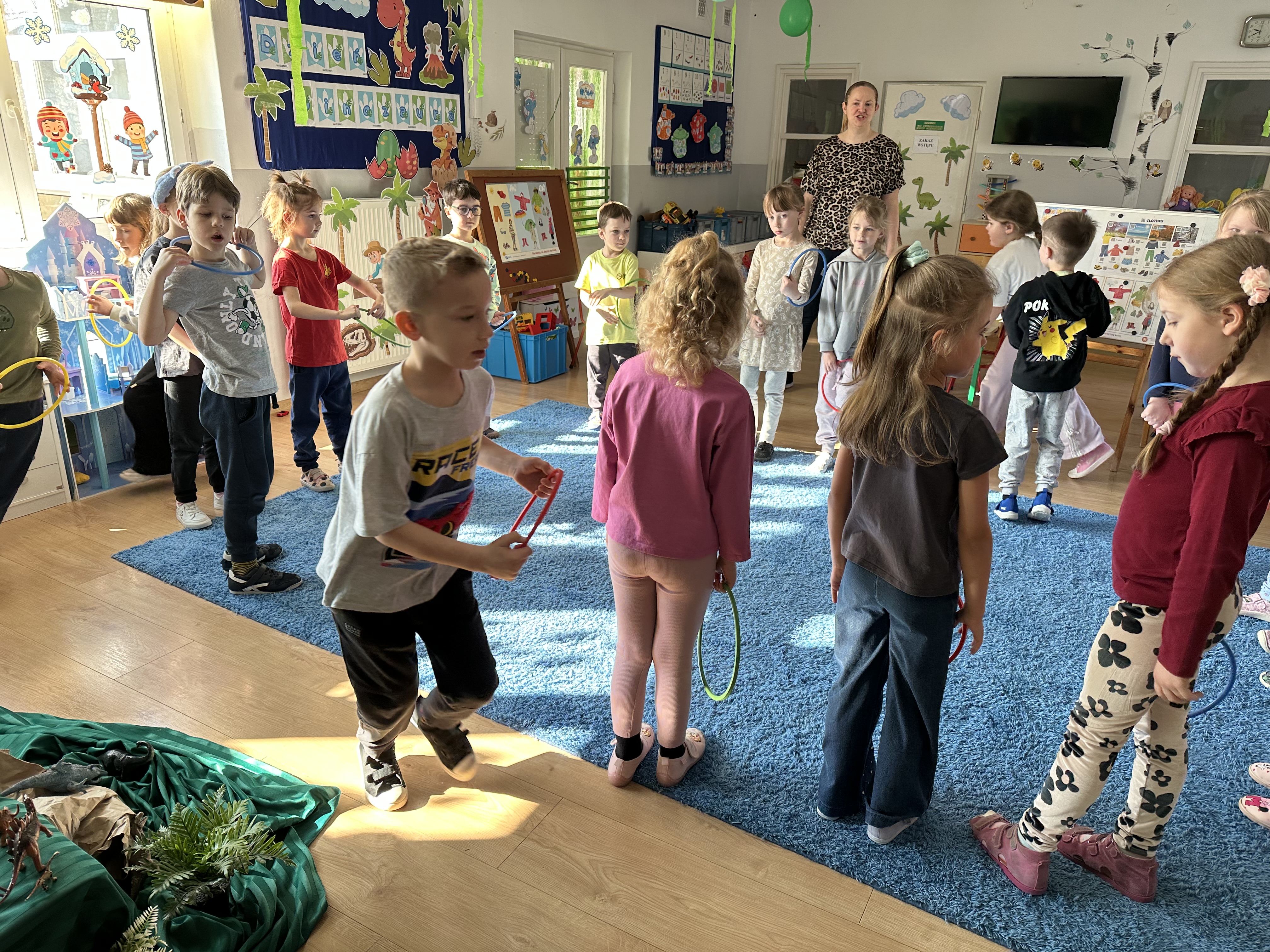 z ciekawostkami na temat budzenia się zwierząt ze snu zimowego. Nauczyły się rymowanki ,,Koncert dzięcioła”, a pod koniec dnia brały udział w „Kwiatowej zakrywajce” – grze matematycznej, podczas której rozwijały umiejętności przeliczania elementów i rozpoznawania obrazu graficznego liczb. W piątek dzieci utrwaliły nazwy i kolejność miesięcy oraz dni tygodnia. Dodatkowo przedszkolaki rozwijały również ekspresję taneczną w trakcie zabawy ,,Taniec Pani Wiosny”, a także doskonaliły analizę głoskową podczas zabawy językowej „Psotny wiatr”. Dzień zakończyły pracą plastyczną, tzn. wykonały witraż według instrukcji.