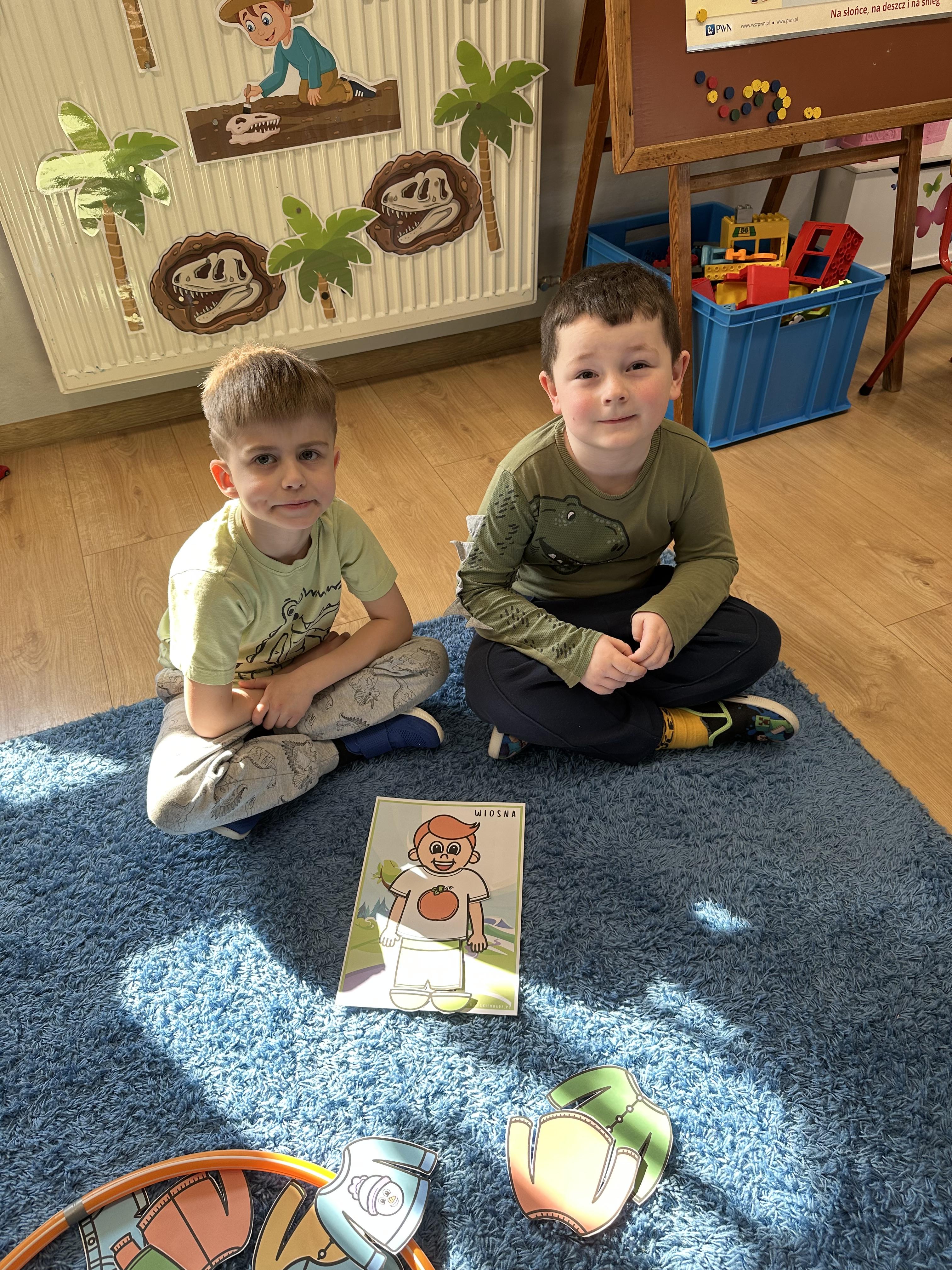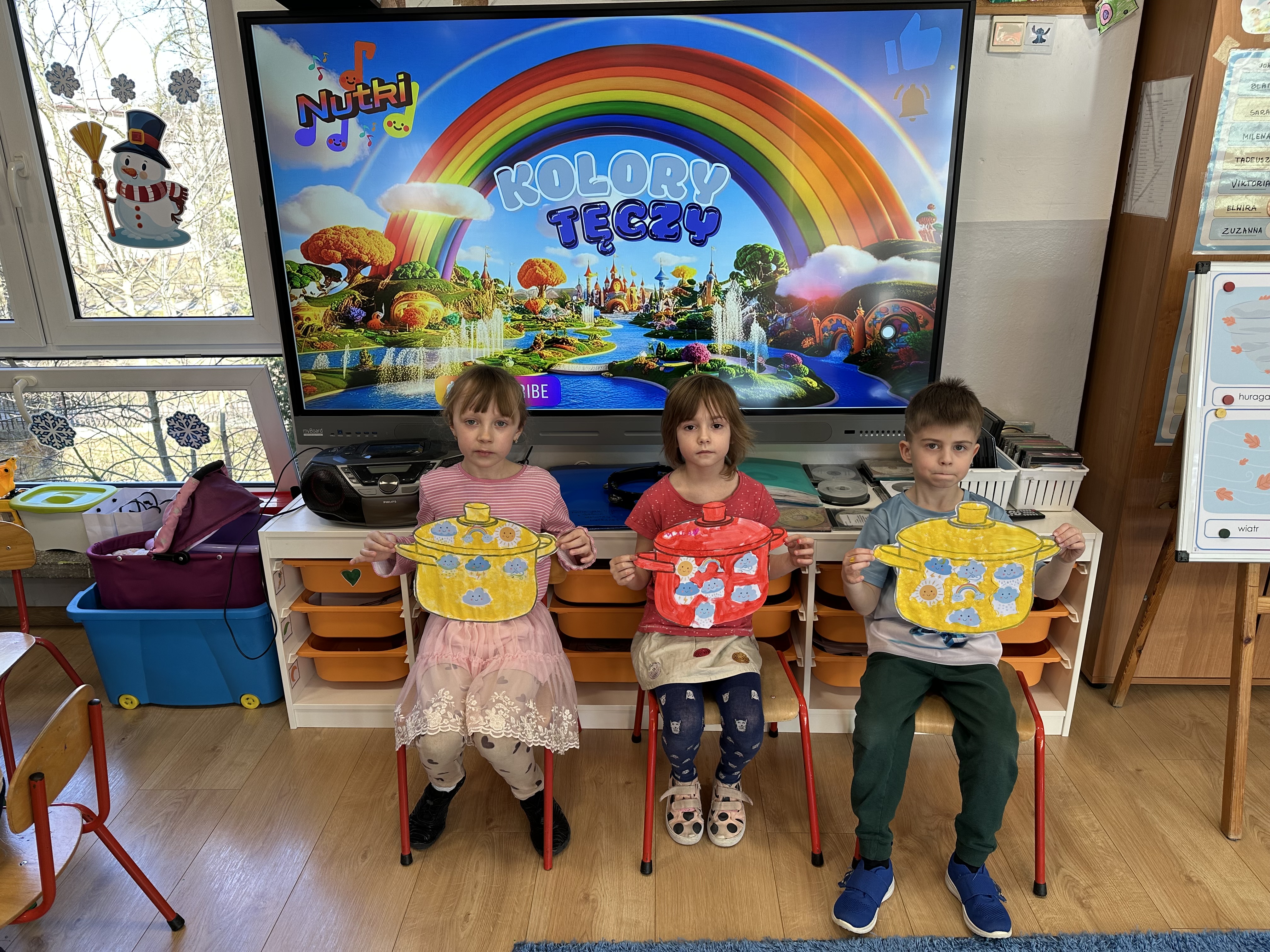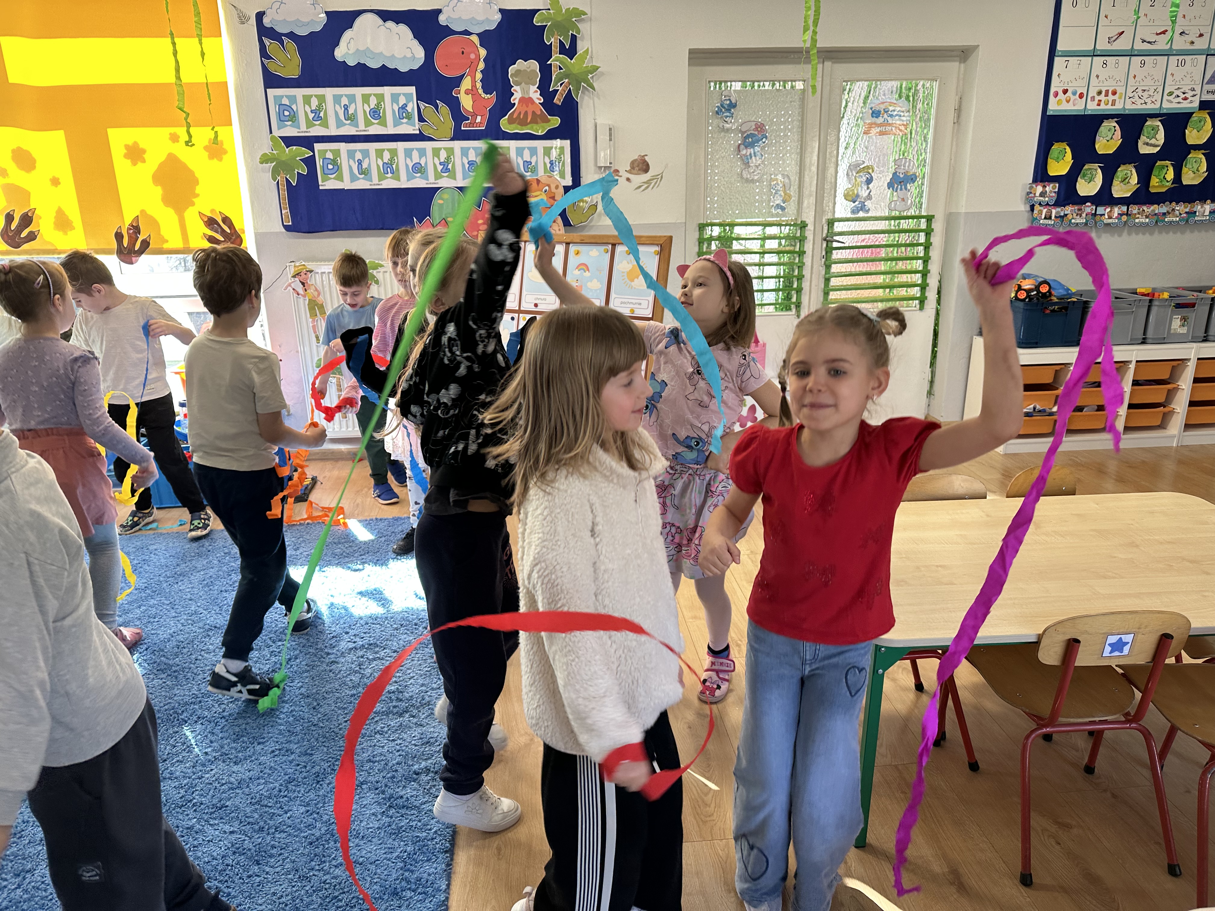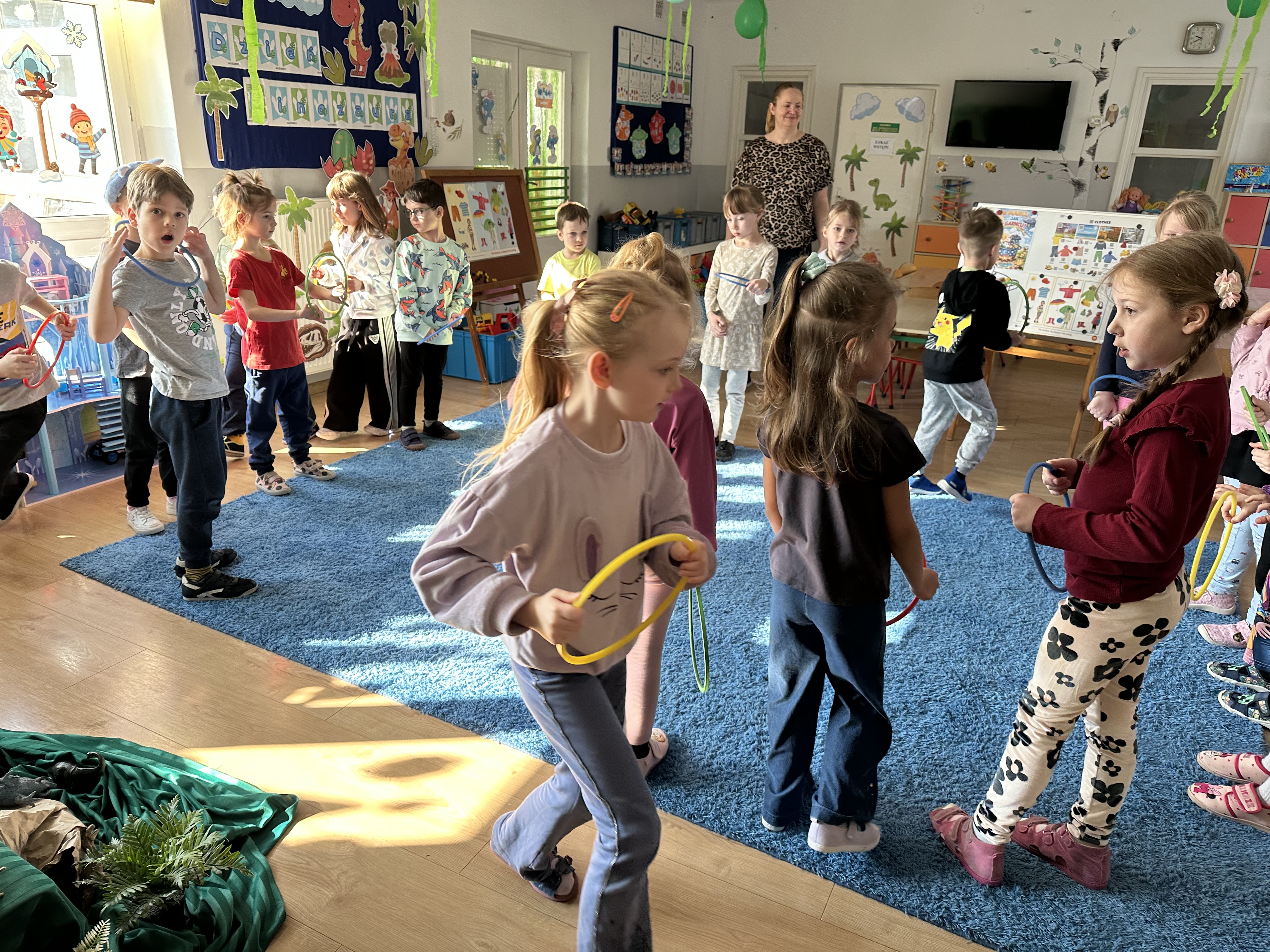 z ciekawostkami na temat budzenia się zwierząt ze snu zimowego. Nauczyły się rymowanki ,,Koncert dzięcioła”, a pod koniec dnia brały udział w „Kwiatowej zakrywajce” – grze matematycznej, podczas której rozwijały umiejętności przeliczania elementów i rozpoznawania obrazu graficznego liczb. W piątek dzieci utrwaliły nazwy i kolejność miesięcy oraz dni tygodnia. Dodatkowo przedszkolaki rozwijały również ekspresję taneczną w trakcie zabawy ,,Taniec Pani Wiosny”, a także doskonaliły analizę głoskową podczas zabawy językowej „Psotny wiatr”. Dzień zakończyły pracą plastyczną, tzn. wykonały witraż według instrukcji.