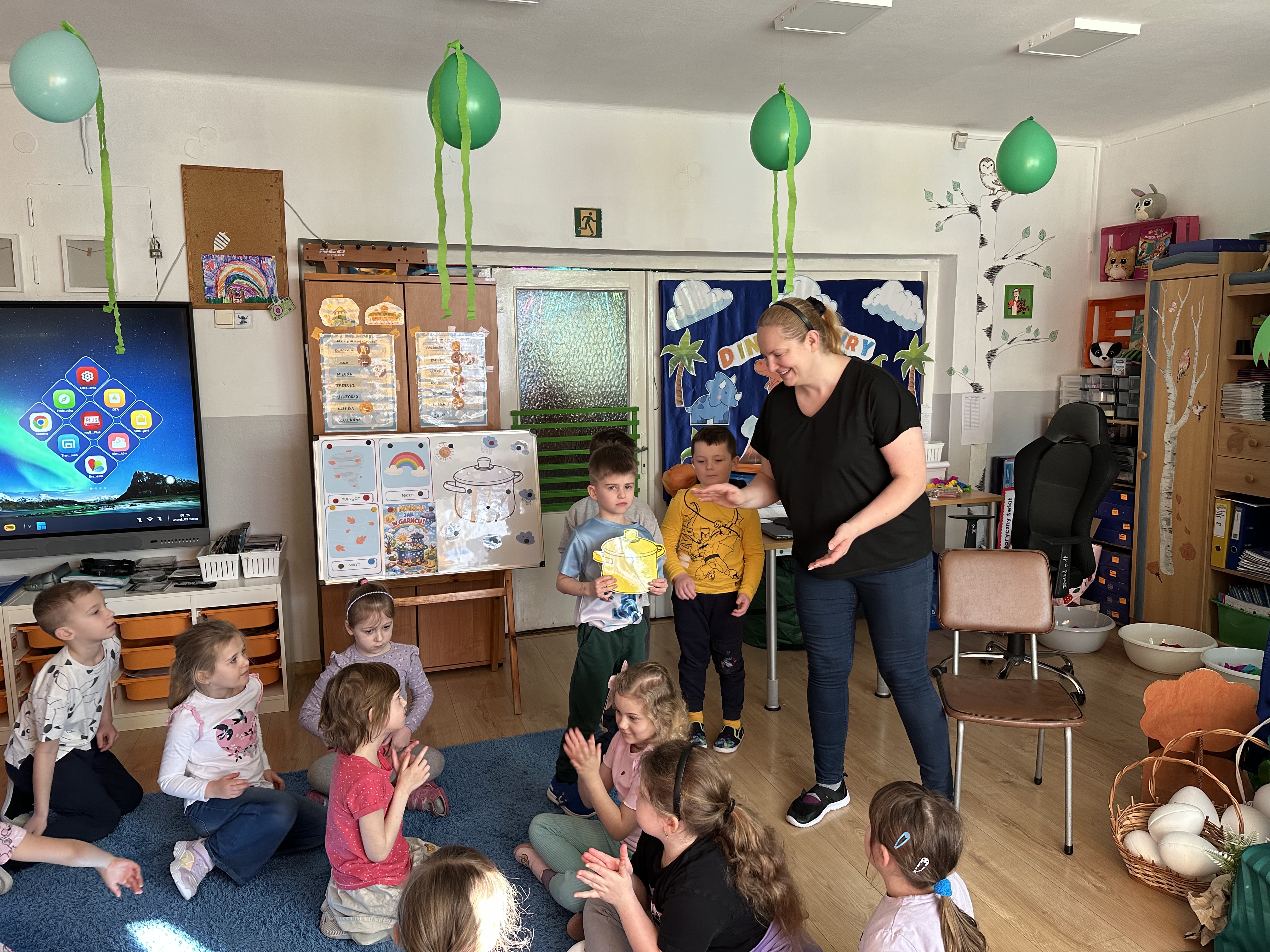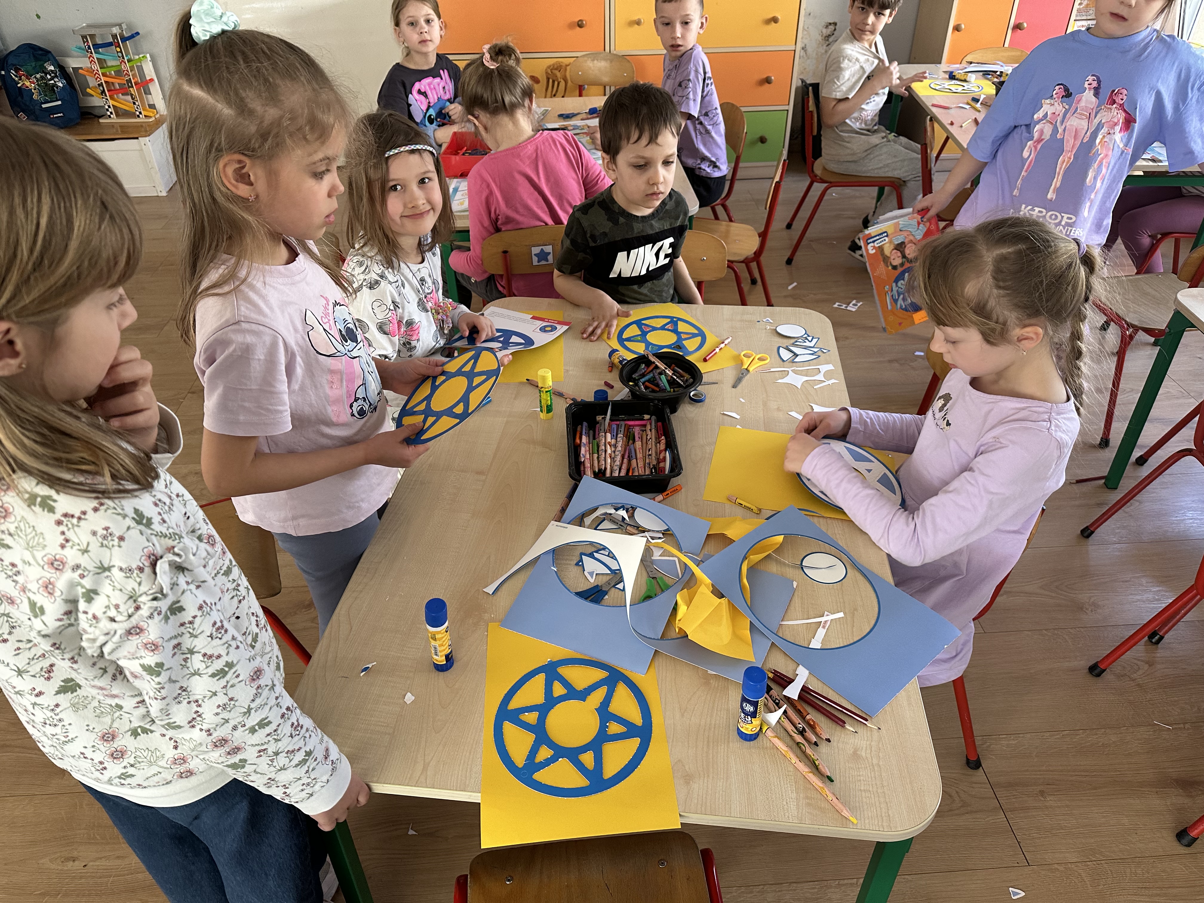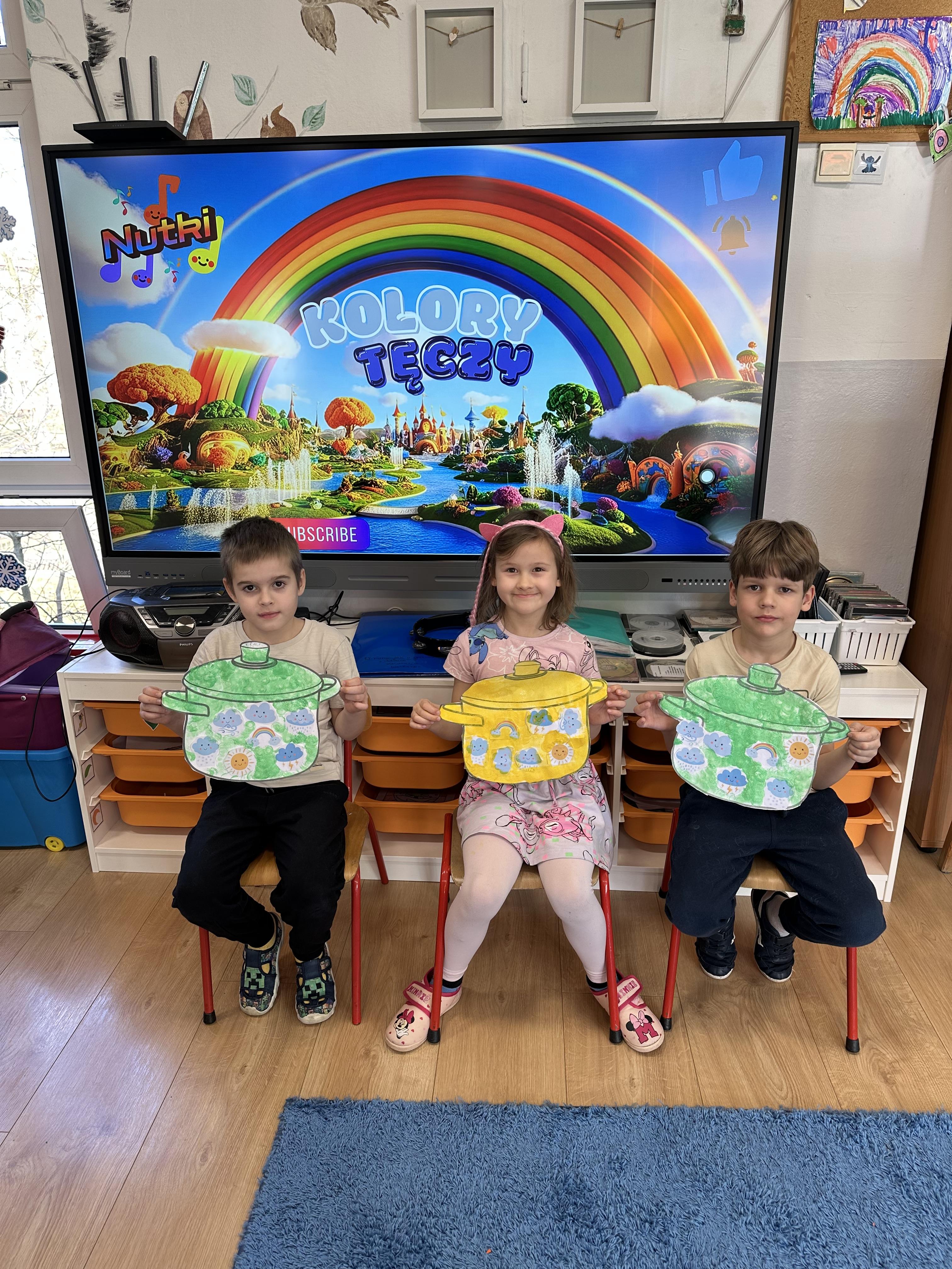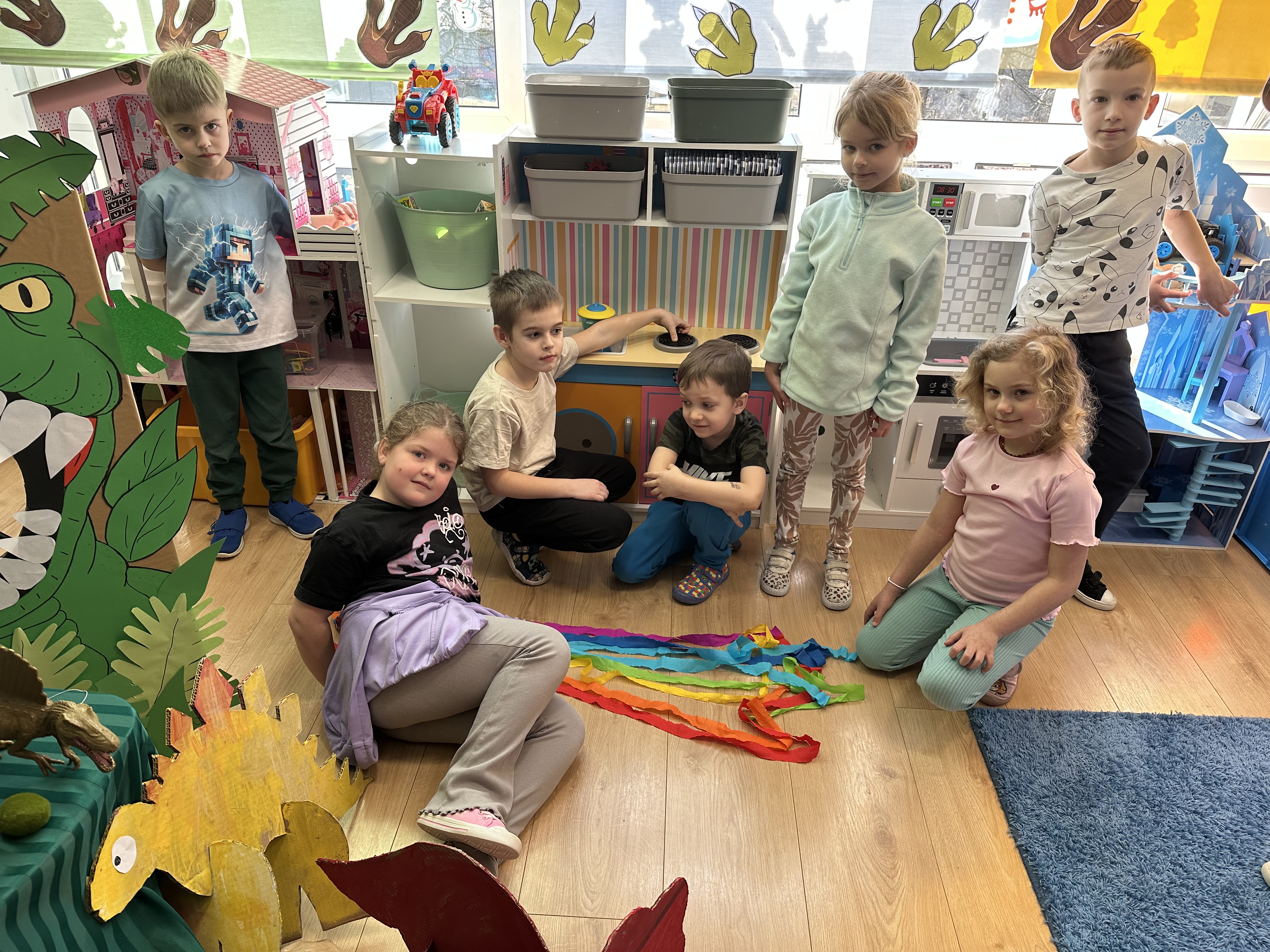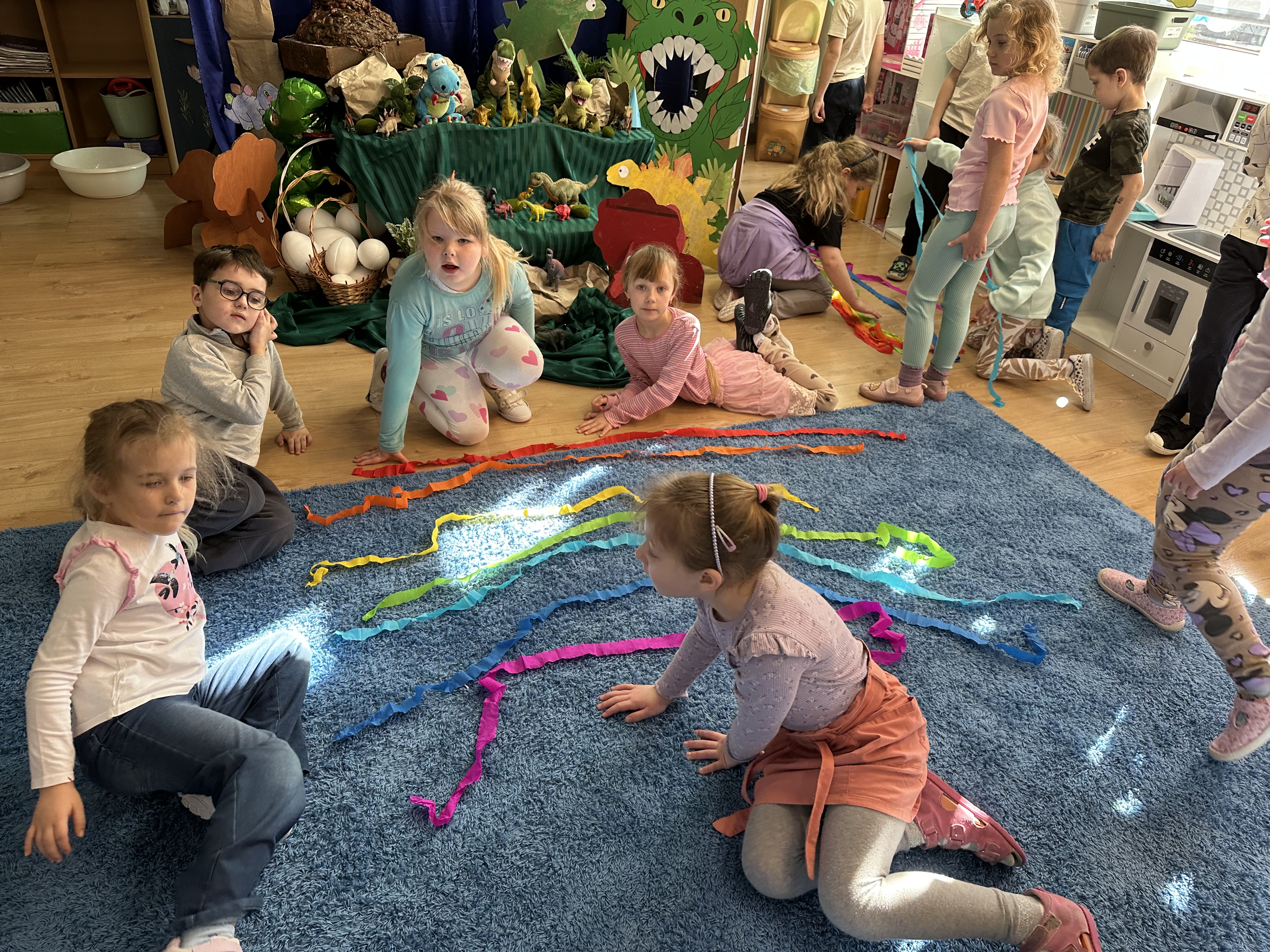 z ciekawostkami na temat budzenia się zwierząt ze snu zimowego. Nauczyły się rymowanki ,,Koncert dzięcioła”, a pod koniec dnia brały udział w „Kwiatowej zakrywajce” – grze matematycznej, podczas której rozwijały umiejętności przeliczania elementów i rozpoznawania obrazu graficznego liczb. W piątek dzieci utrwaliły nazwy i kolejność miesięcy oraz dni tygodnia. Dodatkowo przedszkolaki rozwijały również ekspresję taneczną w trakcie zabawy ,,Taniec Pani Wiosny”, a także doskonaliły analizę głoskową podczas zabawy językowej „Psotny wiatr”. Dzień zakończyły pracą plastyczną, tzn. wykonały witraż według instrukcji.