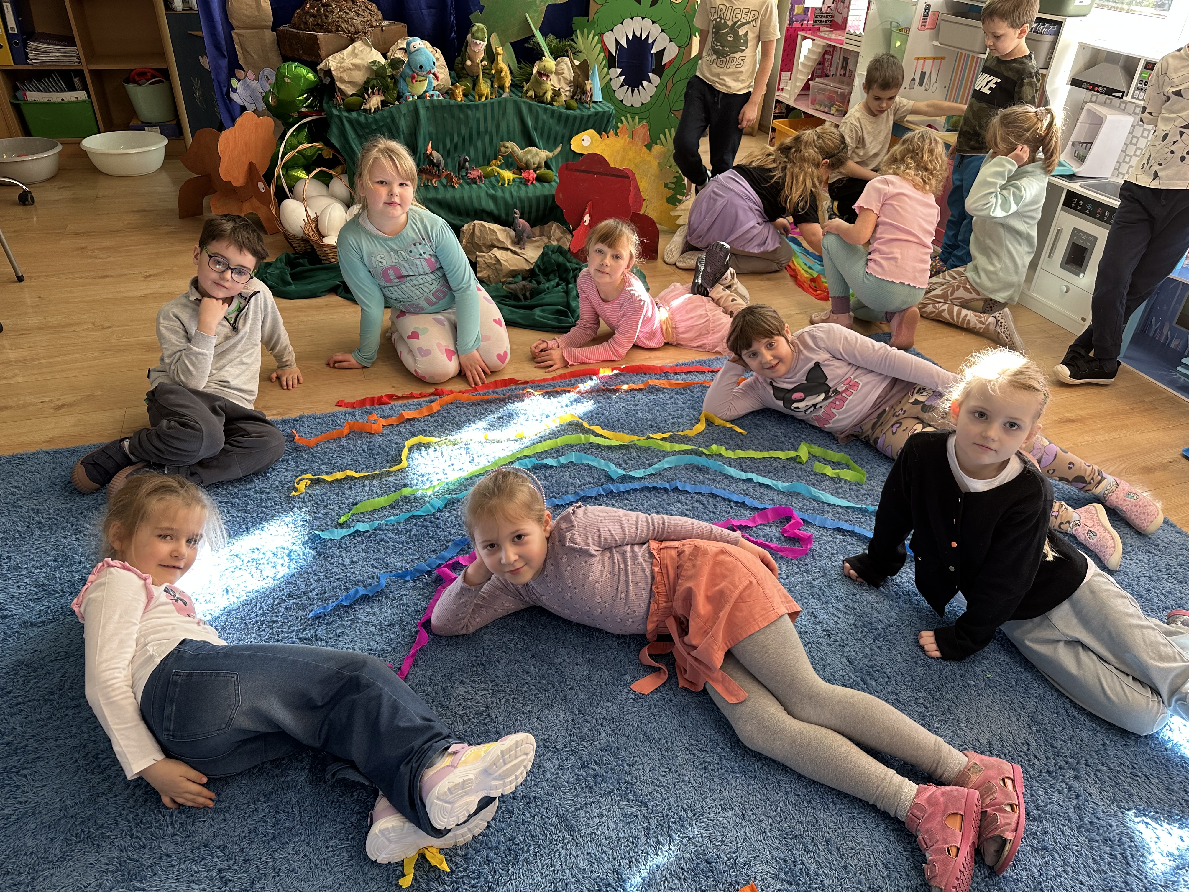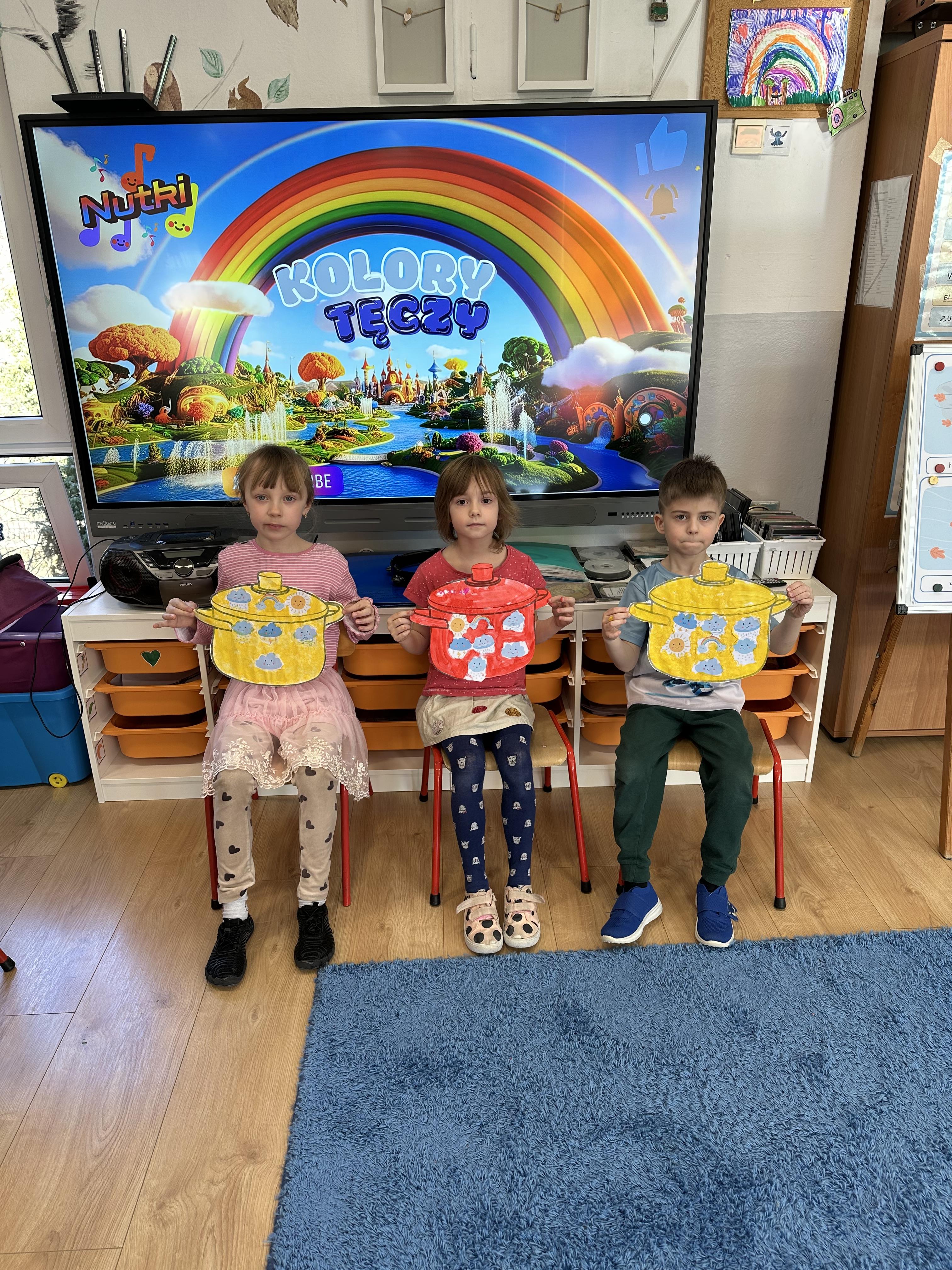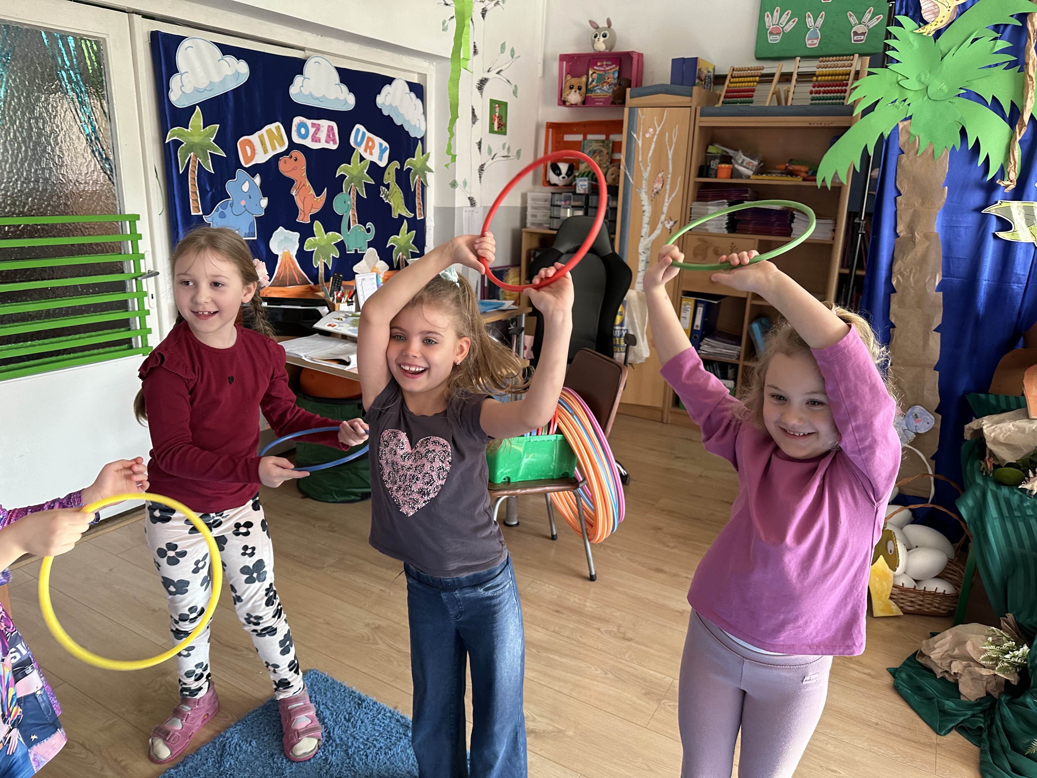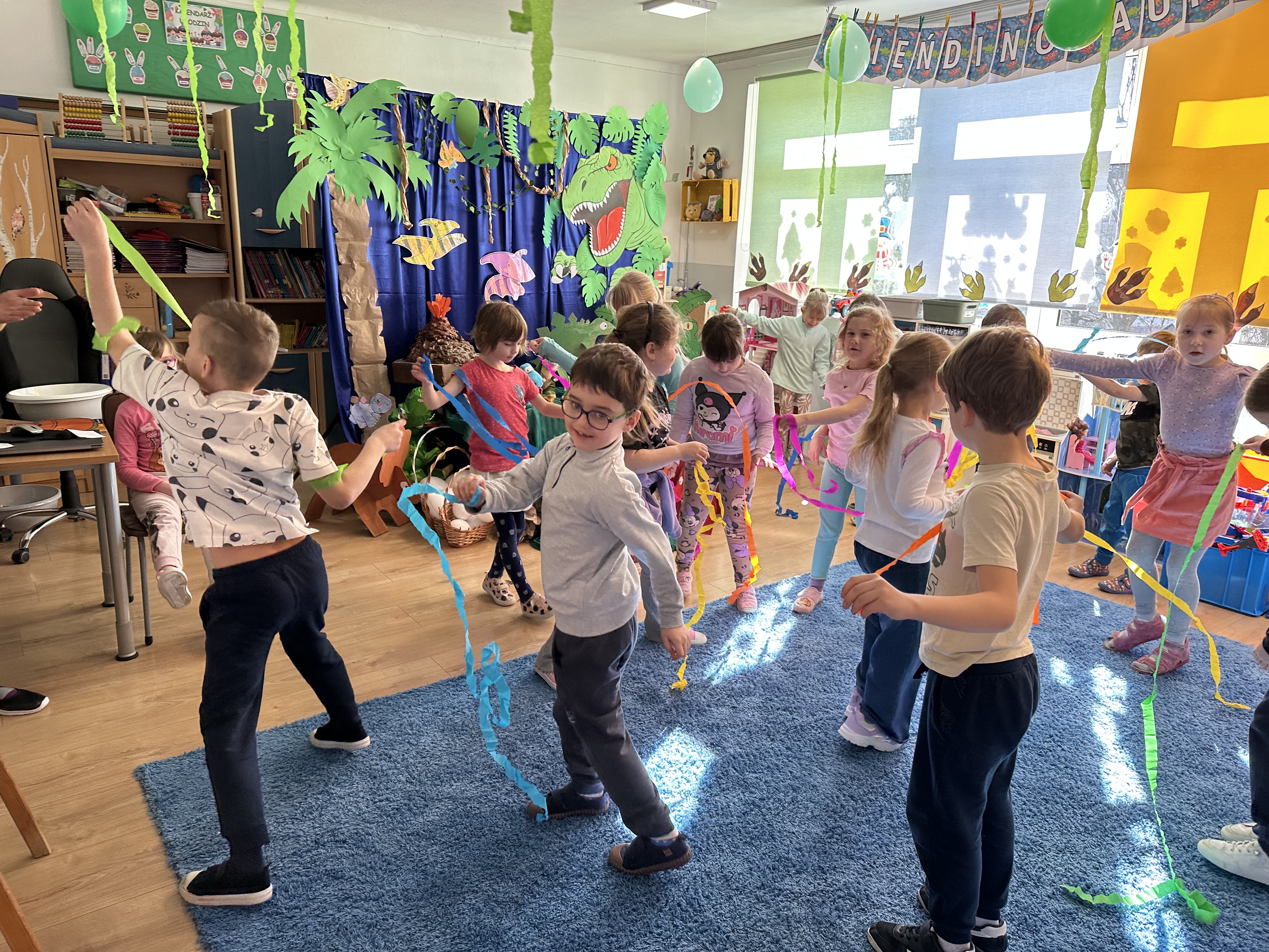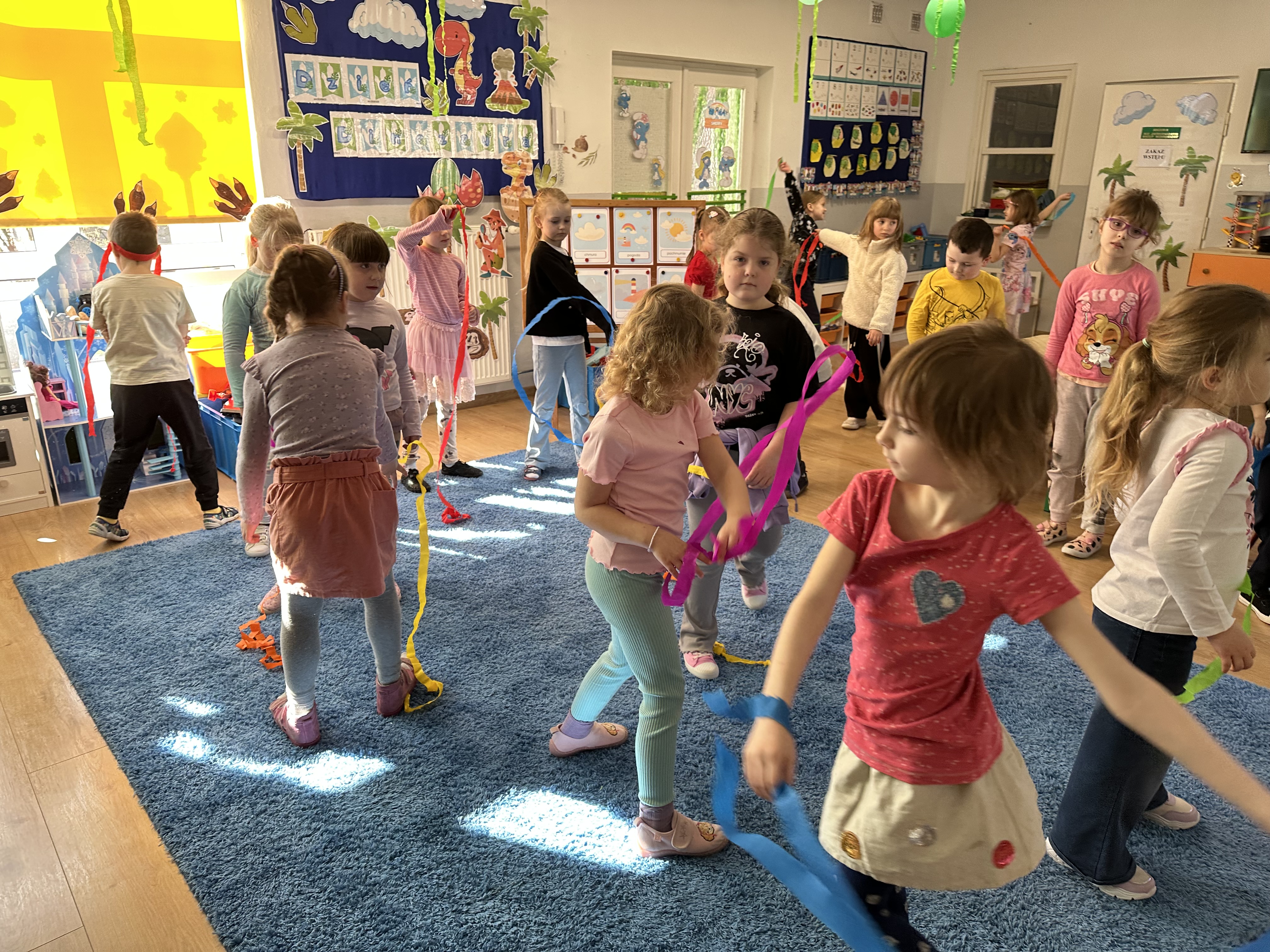 z ciekawostkami na temat budzenia się zwierząt ze snu zimowego. Nauczyły się rymowanki ,,Koncert dzięcioła”, a pod koniec dnia brały udział w „Kwiatowej zakrywajce” – grze matematycznej, podczas której rozwijały umiejętności przeliczania elementów i rozpoznawania obrazu graficznego liczb. W piątek dzieci utrwaliły nazwy i kolejność miesięcy oraz dni tygodnia. Dodatkowo przedszkolaki rozwijały również ekspresję taneczną w trakcie zabawy ,,Taniec Pani Wiosny”, a także doskonaliły analizę głoskową podczas zabawy językowej „Psotny wiatr”. Dzień zakończyły pracą plastyczną, tzn. wykonały witraż według instrukcji.