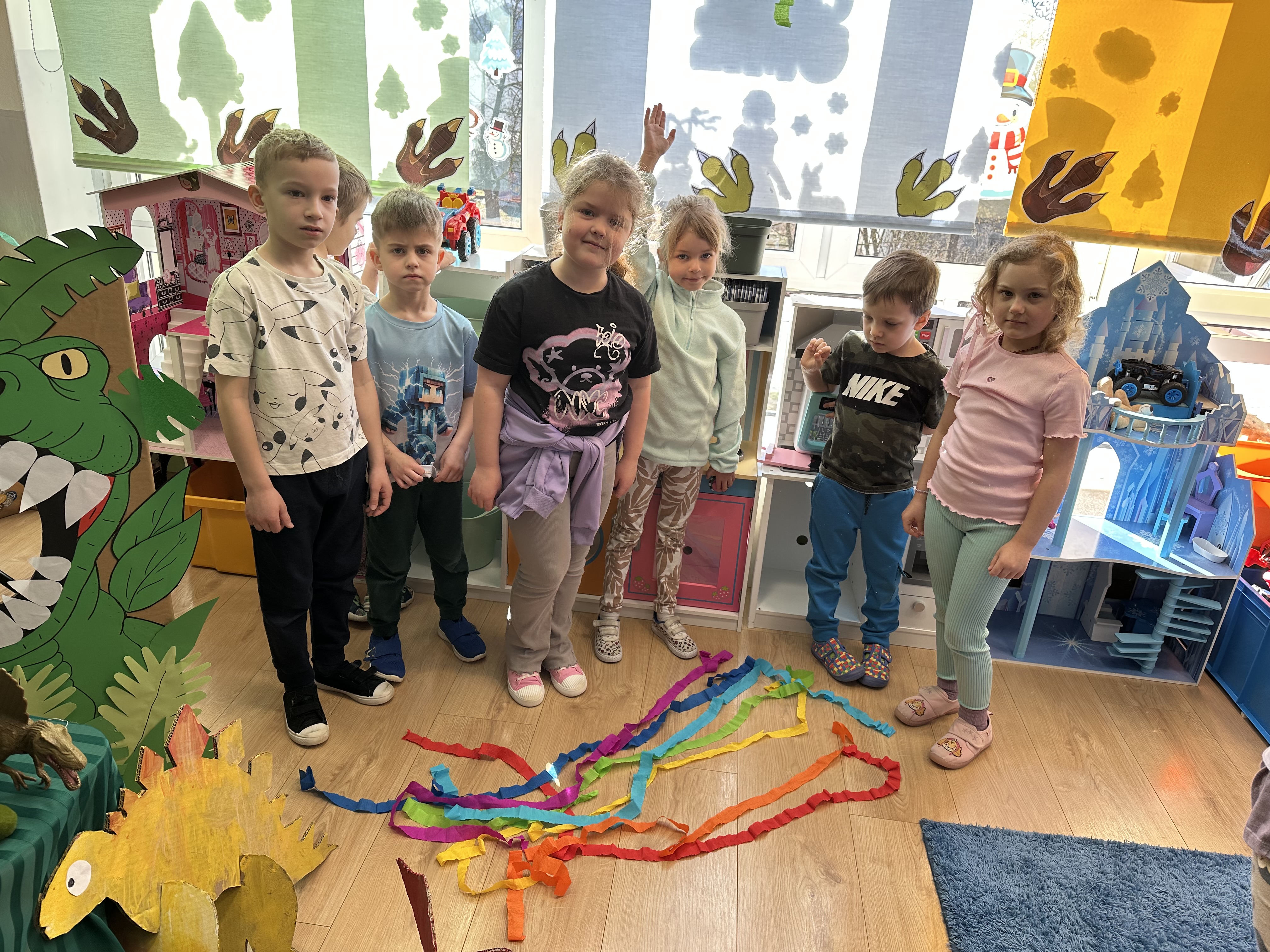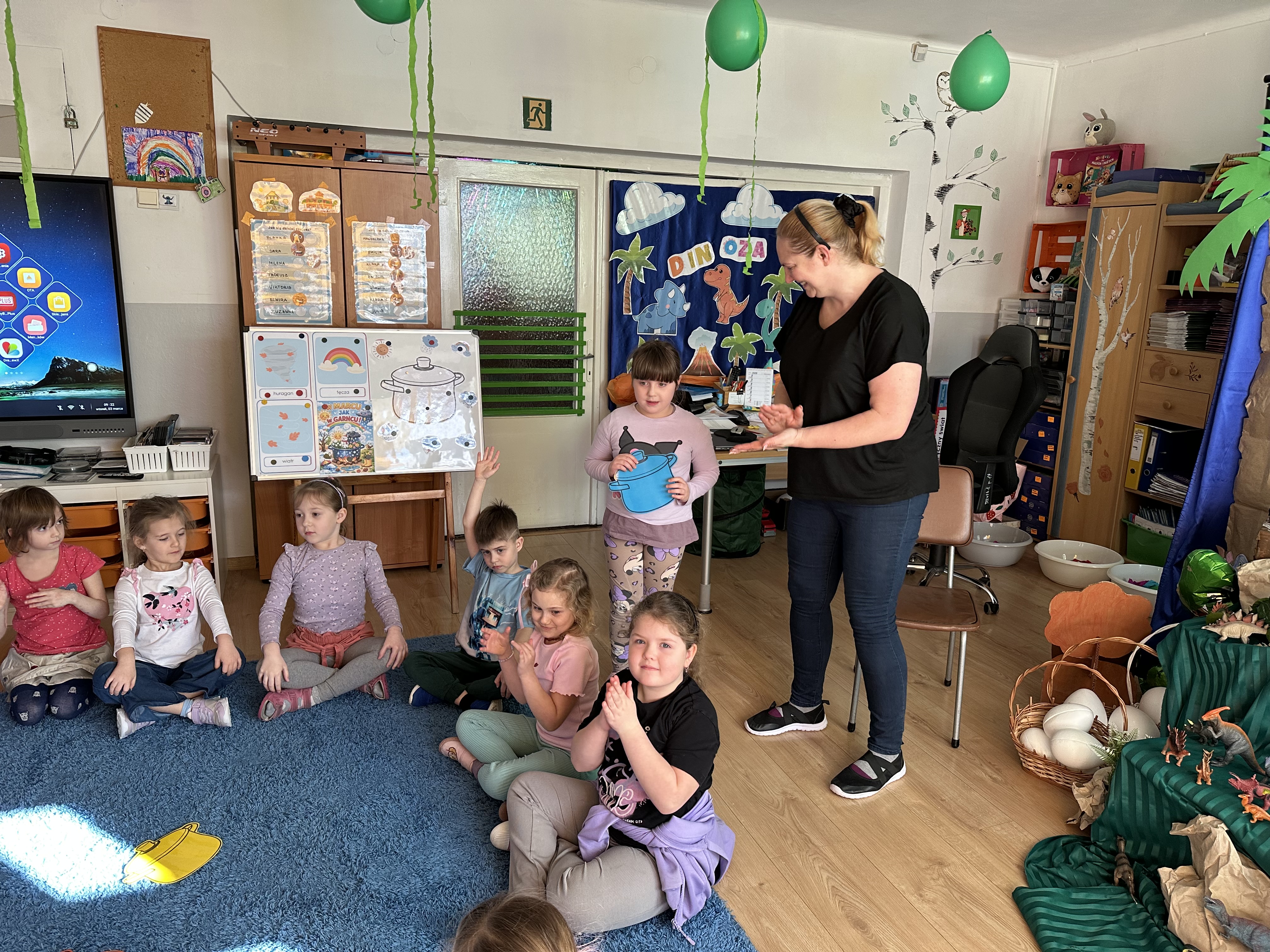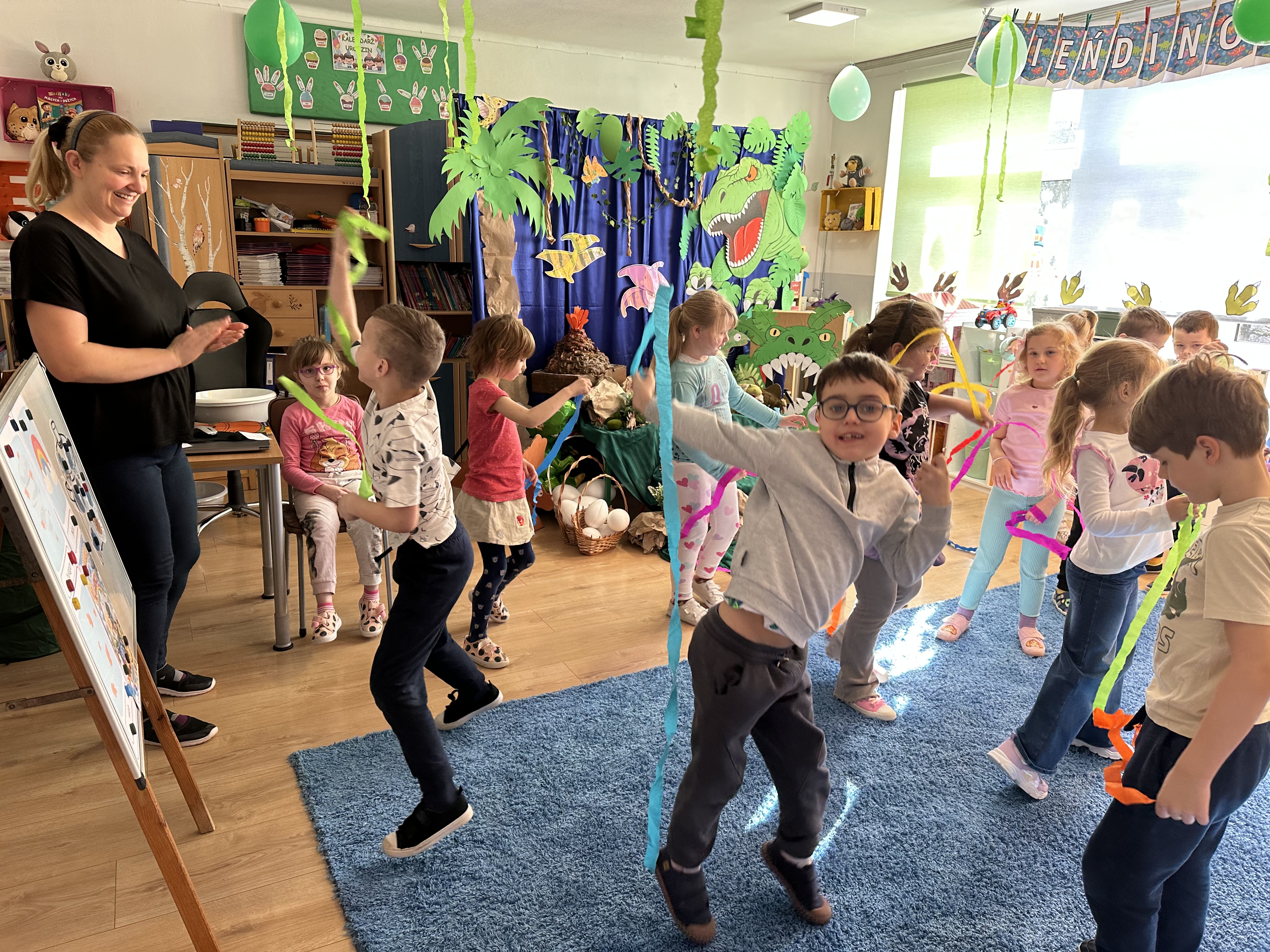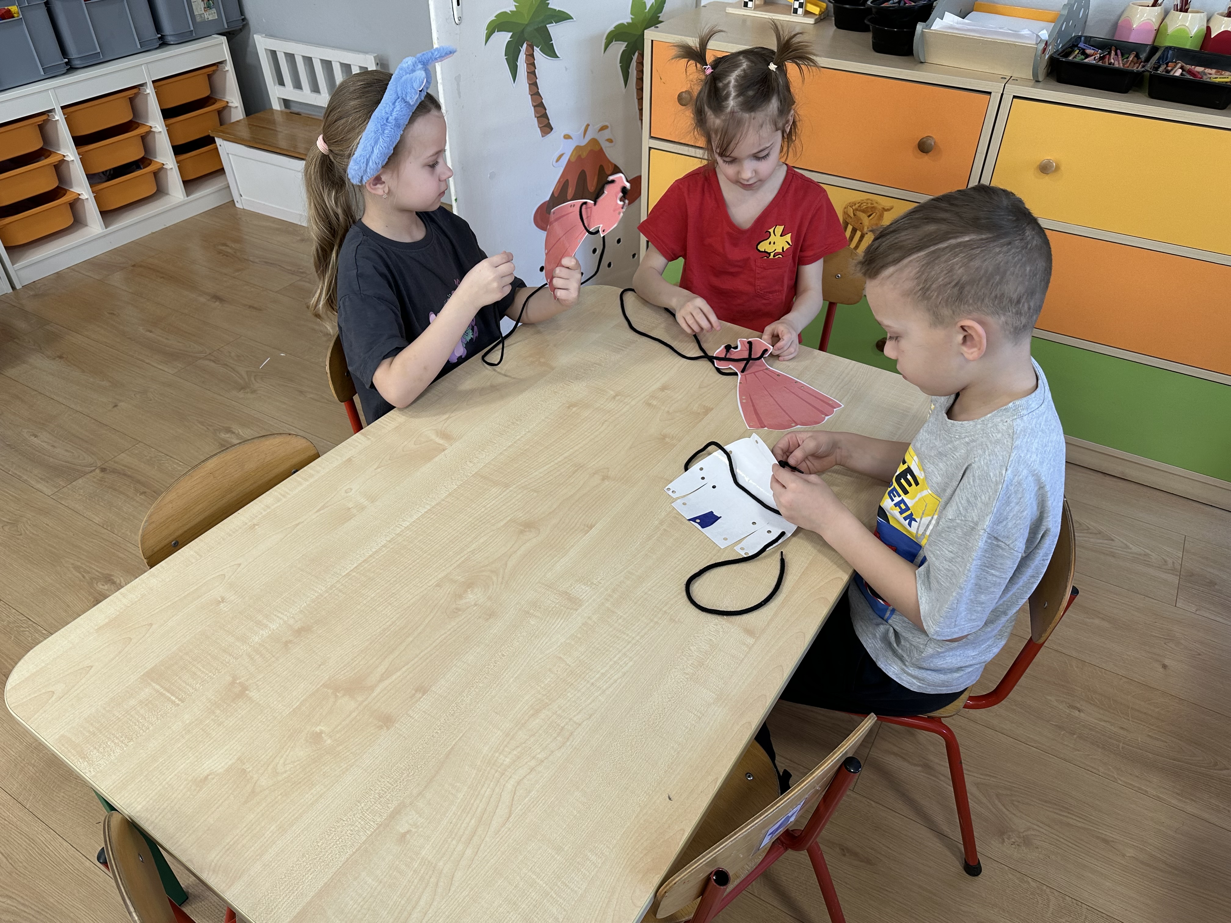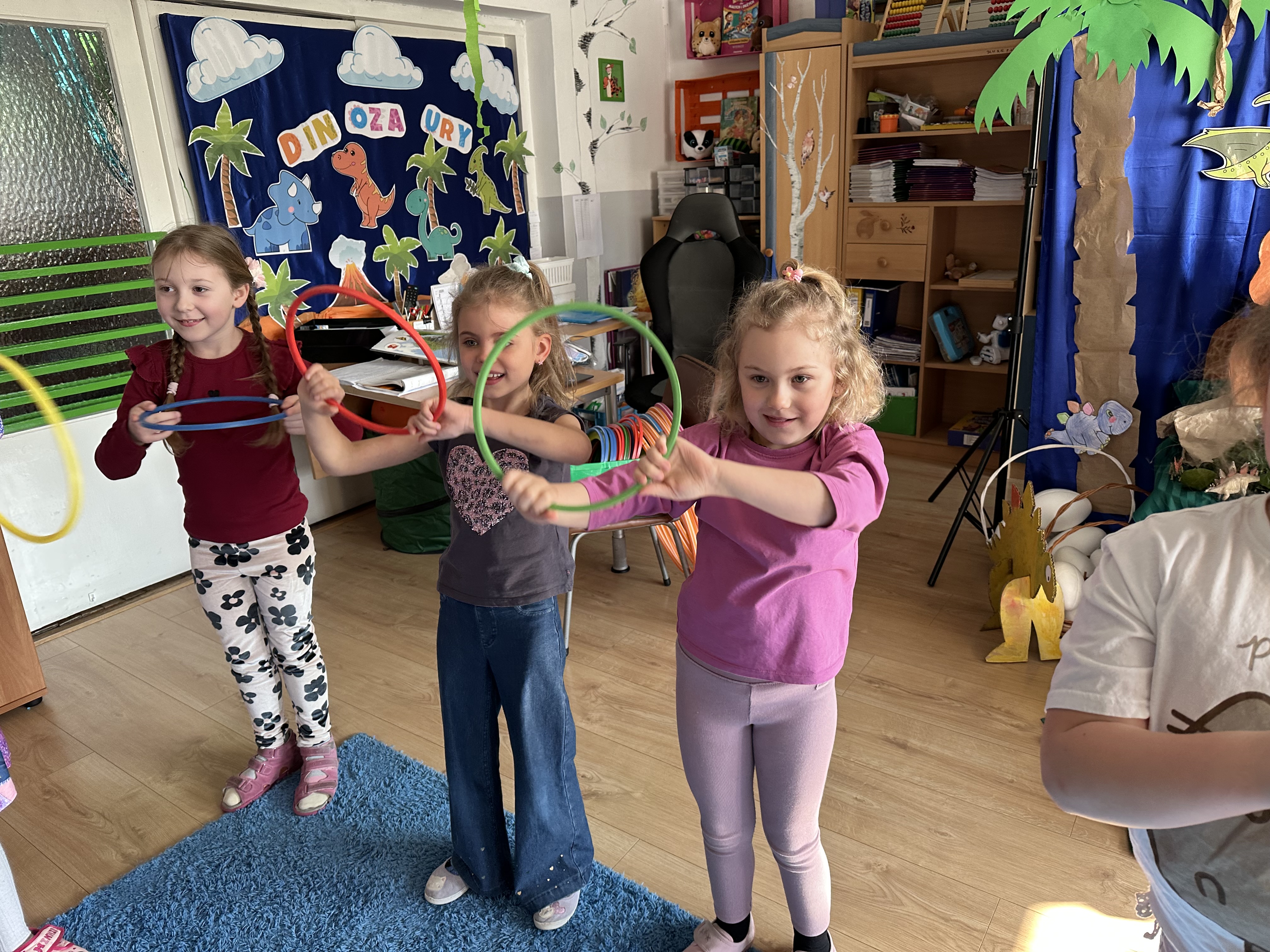 z ciekawostkami na temat budzenia się zwierząt ze snu zimowego. Nauczyły się rymowanki ,,Koncert dzięcioła”, a pod koniec dnia brały udział w „Kwiatowej zakrywajce” – grze matematycznej, podczas której rozwijały umiejętności przeliczania elementów i rozpoznawania obrazu graficznego liczb. W piątek dzieci utrwaliły nazwy i kolejność miesięcy oraz dni tygodnia. Dodatkowo przedszkolaki rozwijały również ekspresję taneczną w trakcie zabawy ,,Taniec Pani Wiosny”, a także doskonaliły analizę głoskową podczas zabawy językowej „Psotny wiatr”. Dzień zakończyły pracą plastyczną, tzn. wykonały witraż według instrukcji.