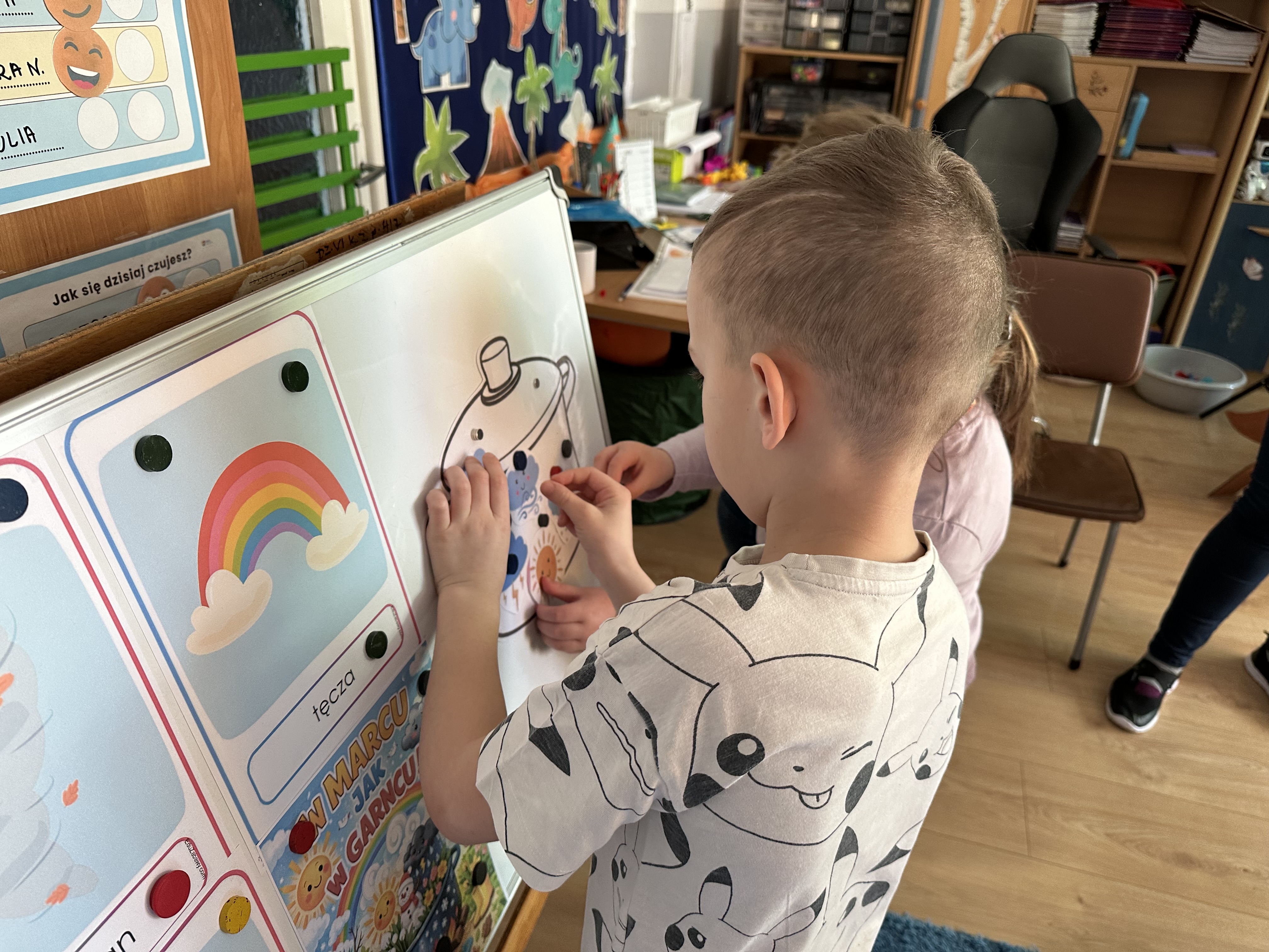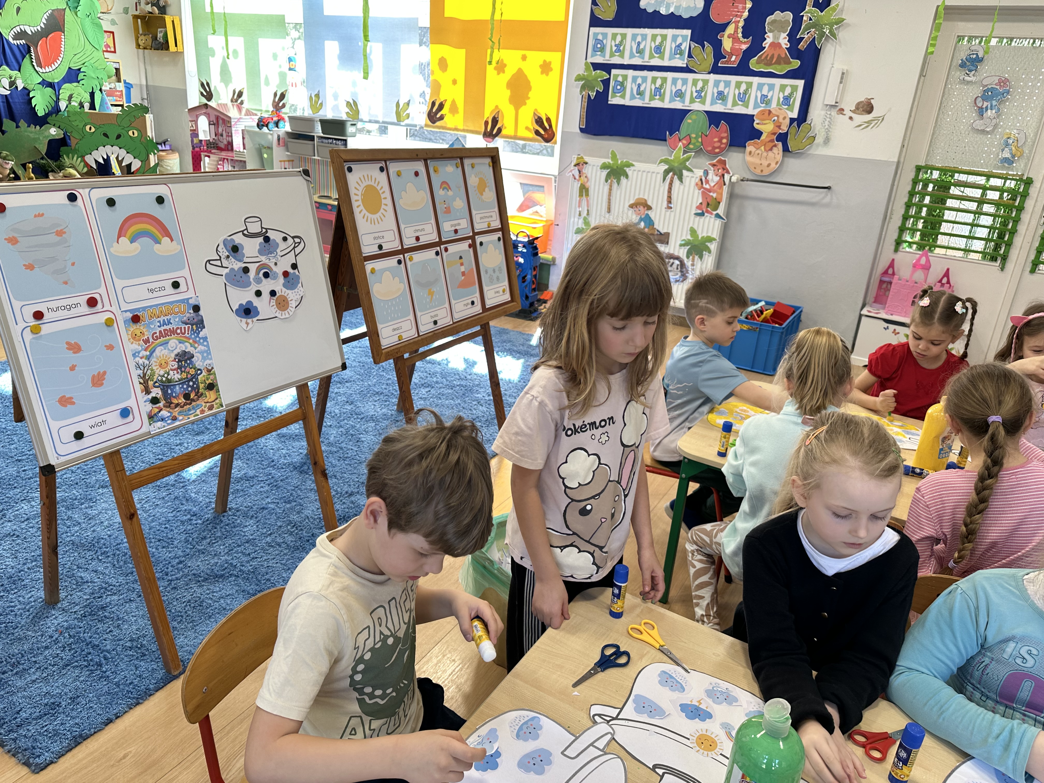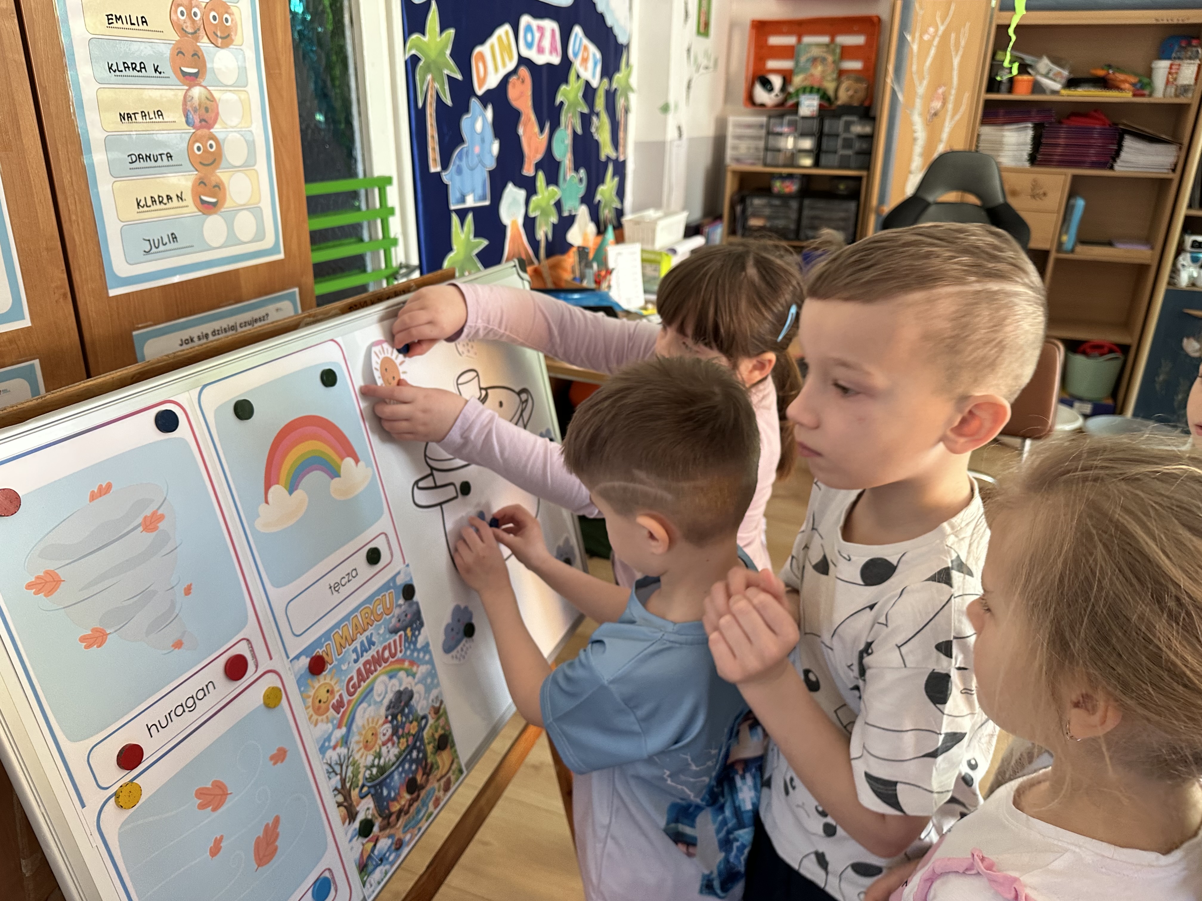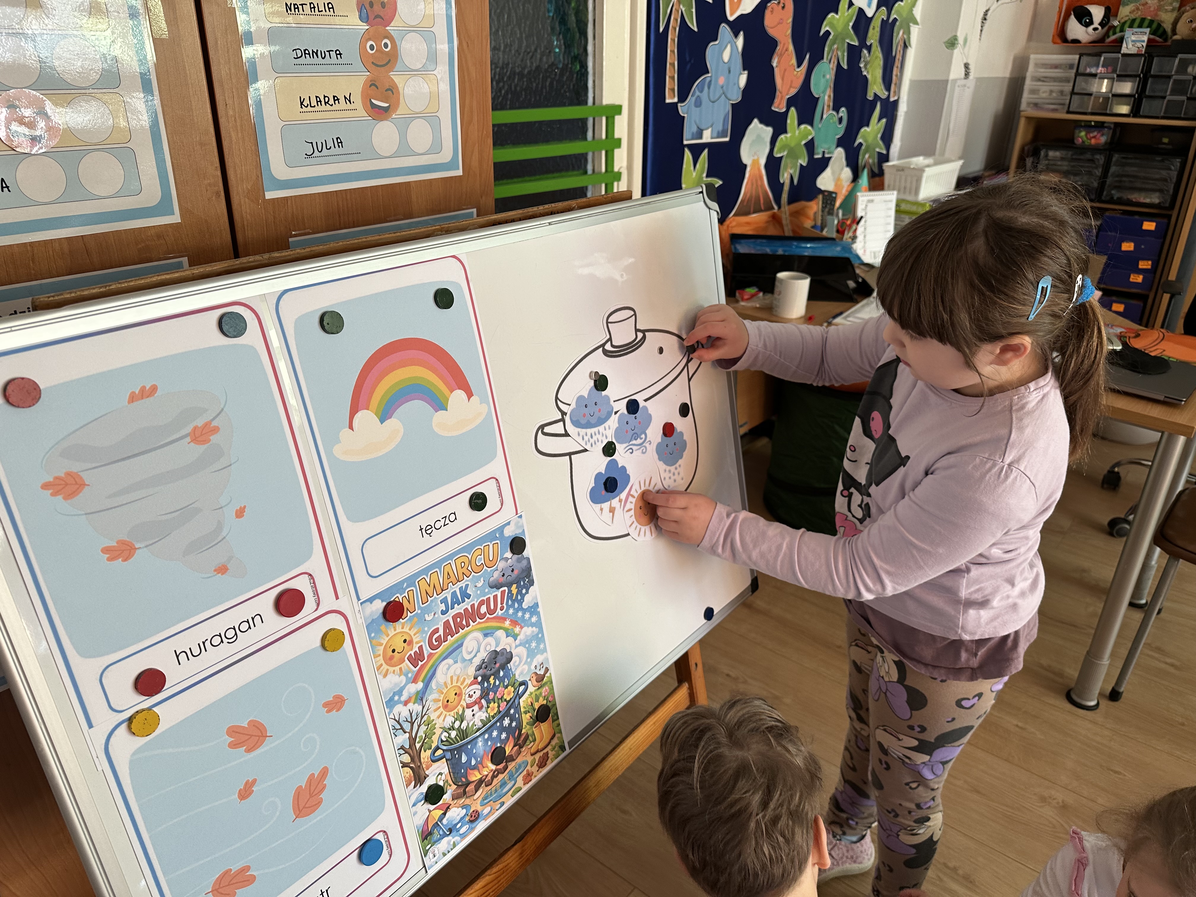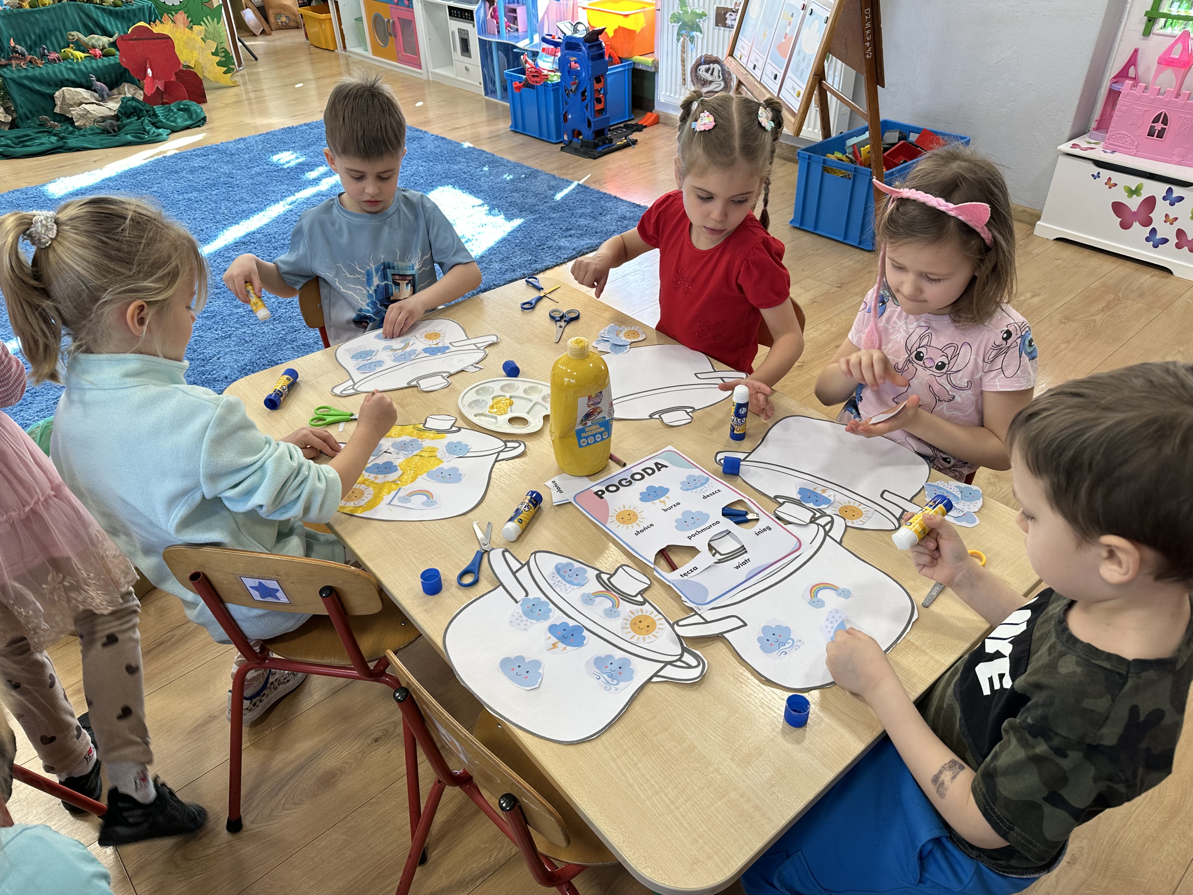 W poniedziałek sześciolatki wyjaśniały, co to jest prognoza pogody. Zastanawiały się, po co ludzie ją oglądają, odczytywały symbole pogodowe i poznały pojęcia związane ze zjawiskami atmosferycznymi. Dodatkowo przedszkolaki zapoznały się z opowiadaniem Marii Pawlisz „W marcu jak w garncu” i omawiały jego treść. Tego dnia dzieci próbowały wyjaśnić własnymi słowami pojęcie ,,nieprzejednana”. Wspólnie dzieliły się pomysłami, jak dbać o swoje zdrowie. Śpiewały i tańczyły do piosenki ,,Mam chusteczkę haftowaną” oraz poznały nowe słowa w języku angielskim: sun „słońce”, rain „deszcz”, wind „wiatr”, storm „burza”, snow „śnieg”, które wykorzystały później do prezentowania pogody w kraju. Co więcej, rysowały płaszcz przeciwdeszczowy i ozdabiały go figurami geometrycznymi zgodnie z instrukcją. Przy stolikach opowiadały, co znajduje się na ilustracjach, samodzielnie lub z pomocą nauczyciela czytały tekst, a także rysowały obrazek, który powinien pasować do przedstawionego kontekstu. Co ciekawe, słuchały utworu literackiego i starały się zapamiętać jak najwięcej szczegółów. We wtorek dzieci poznały przysłowie ,,W marcu, jak w garncu” oraz zapoznały się z literą „g” małą i wielką, drukowaną i pisaną. Rozwijały słuch fonemowy podczas analizy i syntezy głoskowej wyrazu ,,garnek”. Przedszkolaki segregowały różne naczynia kuchenne według cech charakterystycznych, wymieniały nazwy potraw i imion rozpoczynających się głoską g, układały schemat głoskowy z białych kartoników, a także dużą literę „g” z guzików, następnie kreśliły palcem na tacy z kaszą nowo poznaną głoskę. Zdobyte wcześniej umiejętności dzieci wykorzystały podczas zabaw przy stolikach. Wtorkowy dzień sześciolatki zakończyły ćwiczeniami grafomotorycznymi. W środę rozwijały umiejętności logicznego myślenia w trakcie rozwiązywania sudoku. Wysłuchanie wiersza Małgorzaty Strzałkowskiej ,,Wiosenny zawrót głowy” był wprowadzeniem do rozmowy o zwiastunach wiosny. Dodatkowo podczas zabaw ruchowych przypominały sobie nazwy zjawisk atmosferycznych. A w trakcie zabawy „Porządki w szafie” rozwijały umiejętność odczytywania kodu oraz układania przedmiotów w przestrzeni. Przedszkolaki wspólnie odczytywały ceny poszczególnych części garderoby i klasyfikowały, które z nich są tańsze, a które droższe, rozwijały tym samym kompetencje matematyczne. W kolejnej części dnia dzieci brały aktywny udział w zabawie językowej „Szafa pełna ubrań”, w której rozwijały umiejętność czytania i pisania, tj. odczytywały samodzielnie podpisy i próbowały samodzielnie napisać nazwy ubrań na kartce. W czwartek sześciolatki rozwijały wiedzę o oznakach wiosny, usłyszały wiersz Władysława Broniewskiego pt. „Pierwiosnek”. Dodatkowo poznały wszystkie wiosenne kwiaty. Podczas zabawy „Ptaki wracają z ciepłych krajów” poszerzały wiedzę przyrodniczą o ptakach zimujących w Polsce oraz wracających z ciepłych krajów, utrwalały przy okazji nazwy kontynentów i wskazywały je na mapie. W kolejnej części dnia zapoznały się
