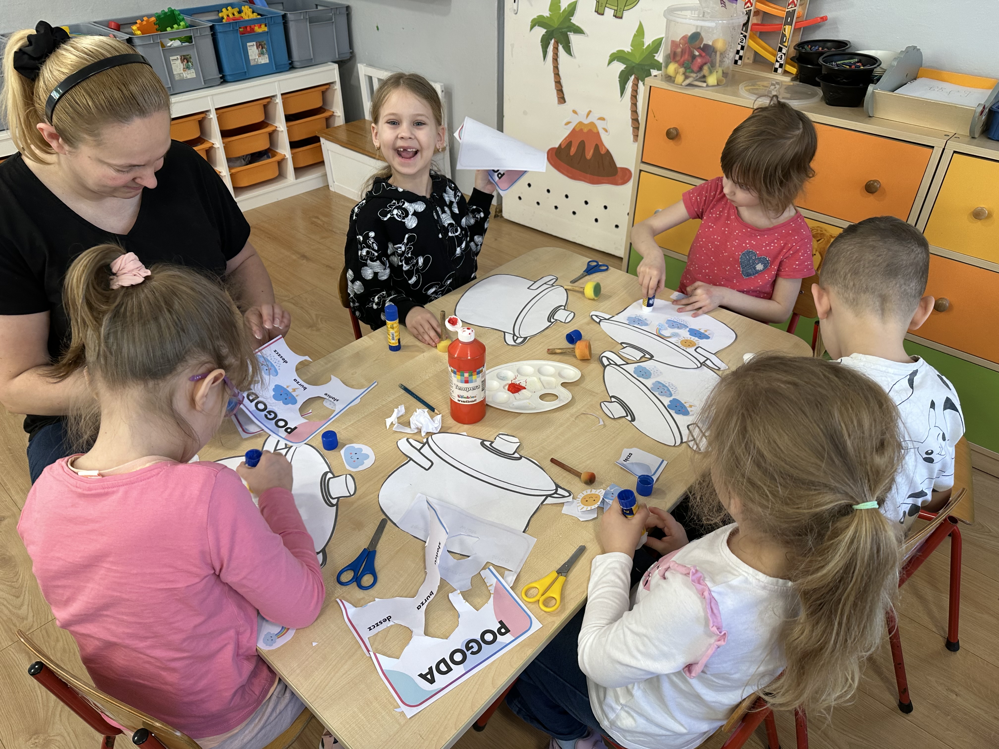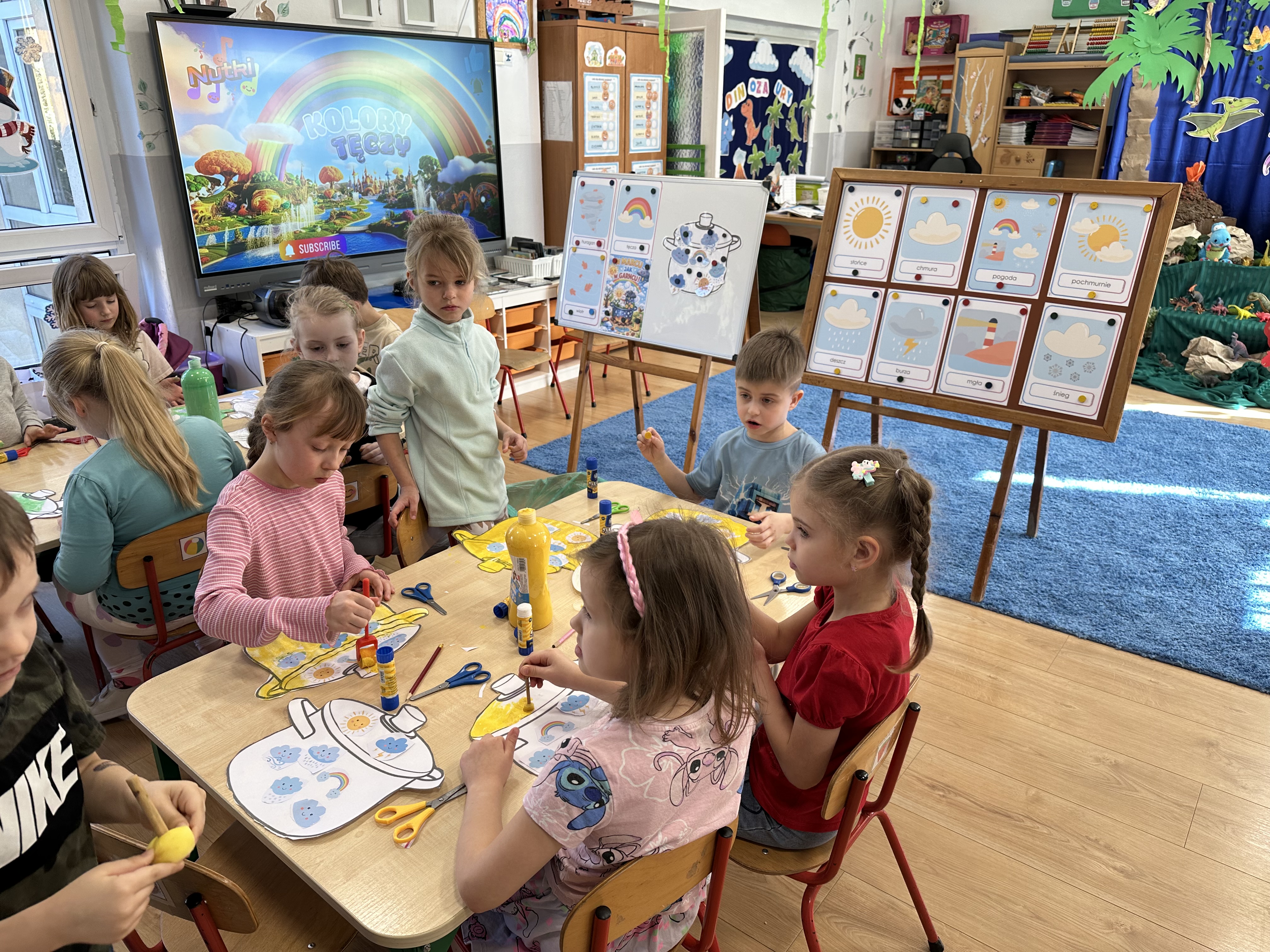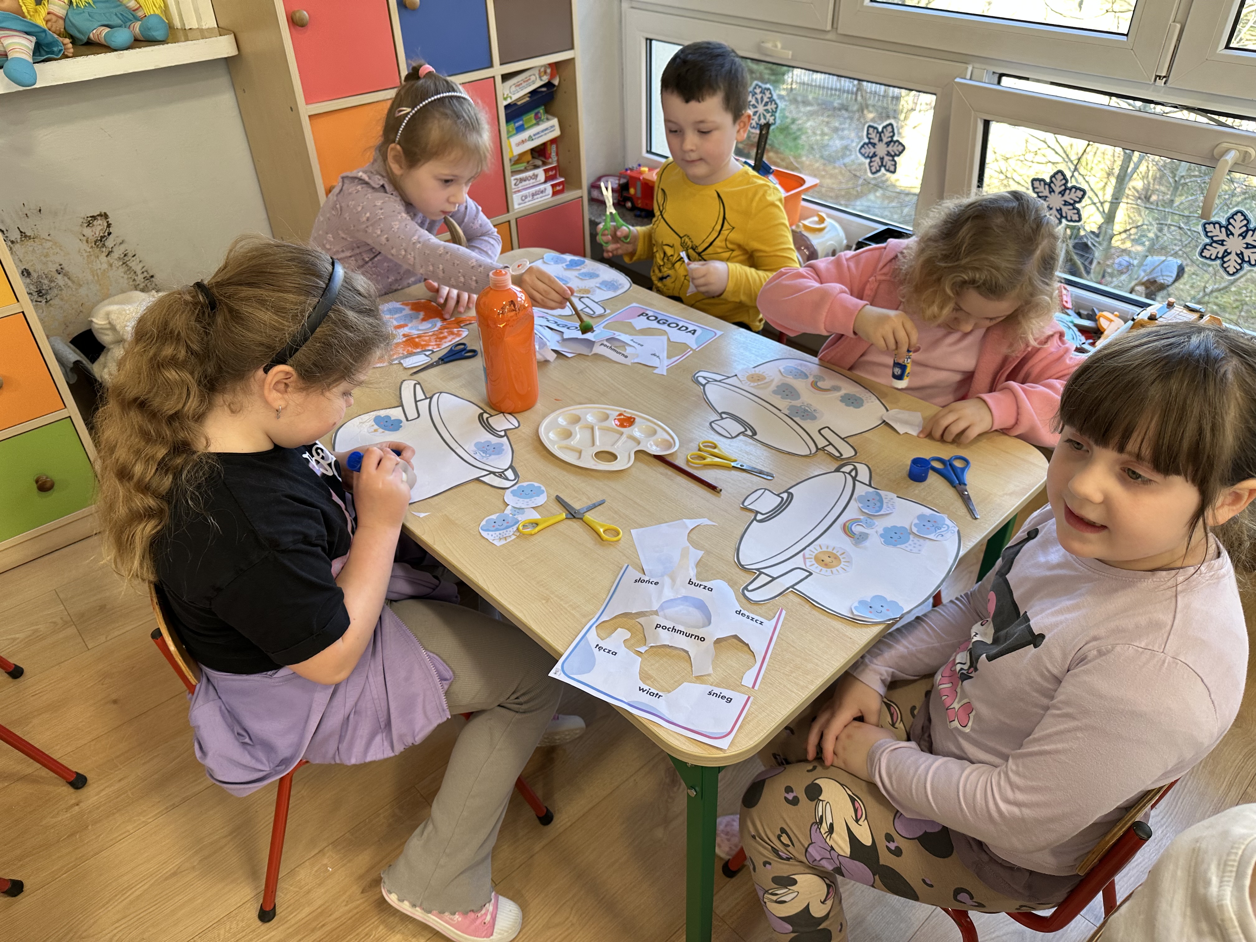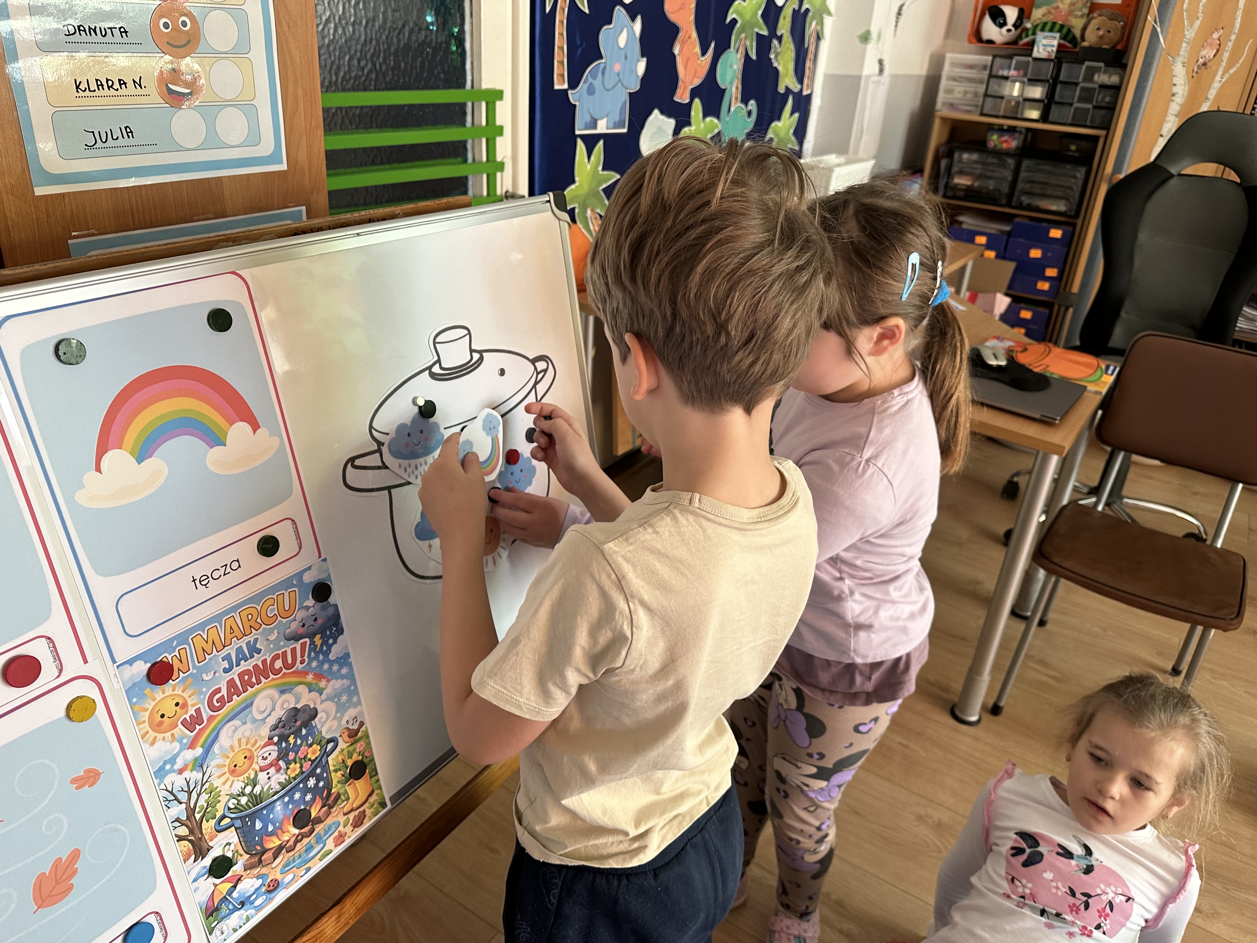 W poniedziałek sześciolatki wyjaśniały, co to jest prognoza pogody. Zastanawiały się, po co ludzie ją oglądają, odczytywały symbole pogodowe i poznały pojęcia związane ze zjawiskami atmosferycznymi. Dodatkowo przedszkolaki zapoznały się z opowiadaniem Marii Pawlisz „W marcu jak w garncu” i omawiały jego treść. Tego dnia dzieci próbowały wyjaśnić własnymi słowami pojęcie ,,nieprzejednana”. Wspólnie dzieliły się pomysłami, jak dbać o swoje zdrowie. Śpiewały i tańczyły do piosenki ,,Mam chusteczkę haftowaną” oraz poznały nowe słowa w języku angielskim: sun „słońce”, rain „deszcz”, wind „wiatr”, storm „burza”, snow „śnieg”, które wykorzystały później do prezentowania pogody w kraju. Co więcej, rysowały płaszcz przeciwdeszczowy i ozdabiały go figurami geometrycznymi zgodnie z instrukcją. Przy stolikach opowiadały, co znajduje się na ilustracjach, samodzielnie lub z pomocą nauczyciela czytały tekst, a także rysowały obrazek, który powinien pasować do przedstawionego kontekstu. Co ciekawe, słuchały utworu literackiego i starały się zapamiętać jak najwięcej szczegółów. We wtorek dzieci poznały przysłowie ,,W marcu, jak w garncu” oraz zapoznały się z literą „g” małą i wielką, drukowaną i pisaną. Rozwijały słuch fonemowy podczas analizy i syntezy głoskowej wyrazu ,,garnek”. Przedszkolaki segregowały różne naczynia kuchenne według cech charakterystycznych, wymieniały nazwy potraw i imion rozpoczynających się głoską g, układały schemat głoskowy z białych kartoników, a także dużą literę „g” z guzików, następnie kreśliły palcem na tacy z kaszą nowo poznaną głoskę. Zdobyte wcześniej umiejętności dzieci wykorzystały podczas zabaw przy stolikach. Wtorkowy dzień sześciolatki zakończyły ćwiczeniami grafomotorycznymi. W środę rozwijały umiejętności logicznego myślenia w trakcie rozwiązywania sudoku. Wysłuchanie wiersza Małgorzaty Strzałkowskiej ,,Wiosenny zawrót głowy” był wprowadzeniem do rozmowy o zwiastunach wiosny. Dodatkowo podczas zabaw ruchowych przypominały sobie nazwy zjawisk atmosferycznych. A w trakcie zabawy „Porządki w szafie” rozwijały umiejętność odczytywania kodu oraz układania przedmiotów w przestrzeni. Przedszkolaki wspólnie odczytywały ceny poszczególnych części garderoby i klasyfikowały, które z nich są tańsze, a które droższe, rozwijały tym samym kompetencje matematyczne. W kolejnej części dnia dzieci brały aktywny udział w zabawie językowej „Szafa pełna ubrań”, w której rozwijały umiejętność czytania i pisania, tj. odczytywały samodzielnie podpisy i próbowały samodzielnie napisać nazwy ubrań na kartce. W czwartek sześciolatki rozwijały wiedzę o oznakach wiosny, usłyszały wiersz Władysława Broniewskiego pt. „Pierwiosnek”. Dodatkowo poznały wszystkie wiosenne kwiaty. Podczas zabawy „Ptaki wracają z ciepłych krajów” poszerzały wiedzę przyrodniczą o ptakach zimujących w Polsce oraz wracających z ciepłych krajów, utrwalały przy okazji nazwy kontynentów i wskazywały je na mapie. W kolejnej części dnia zapoznały się