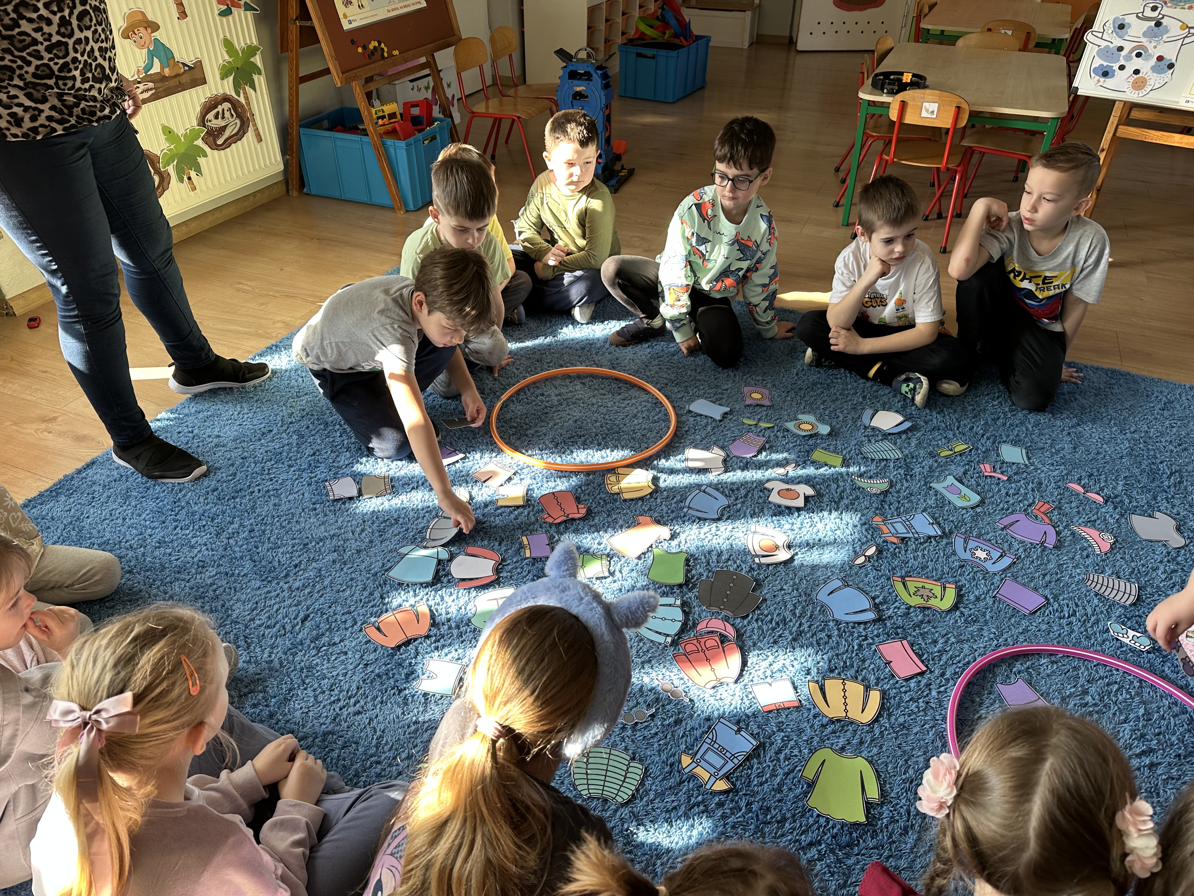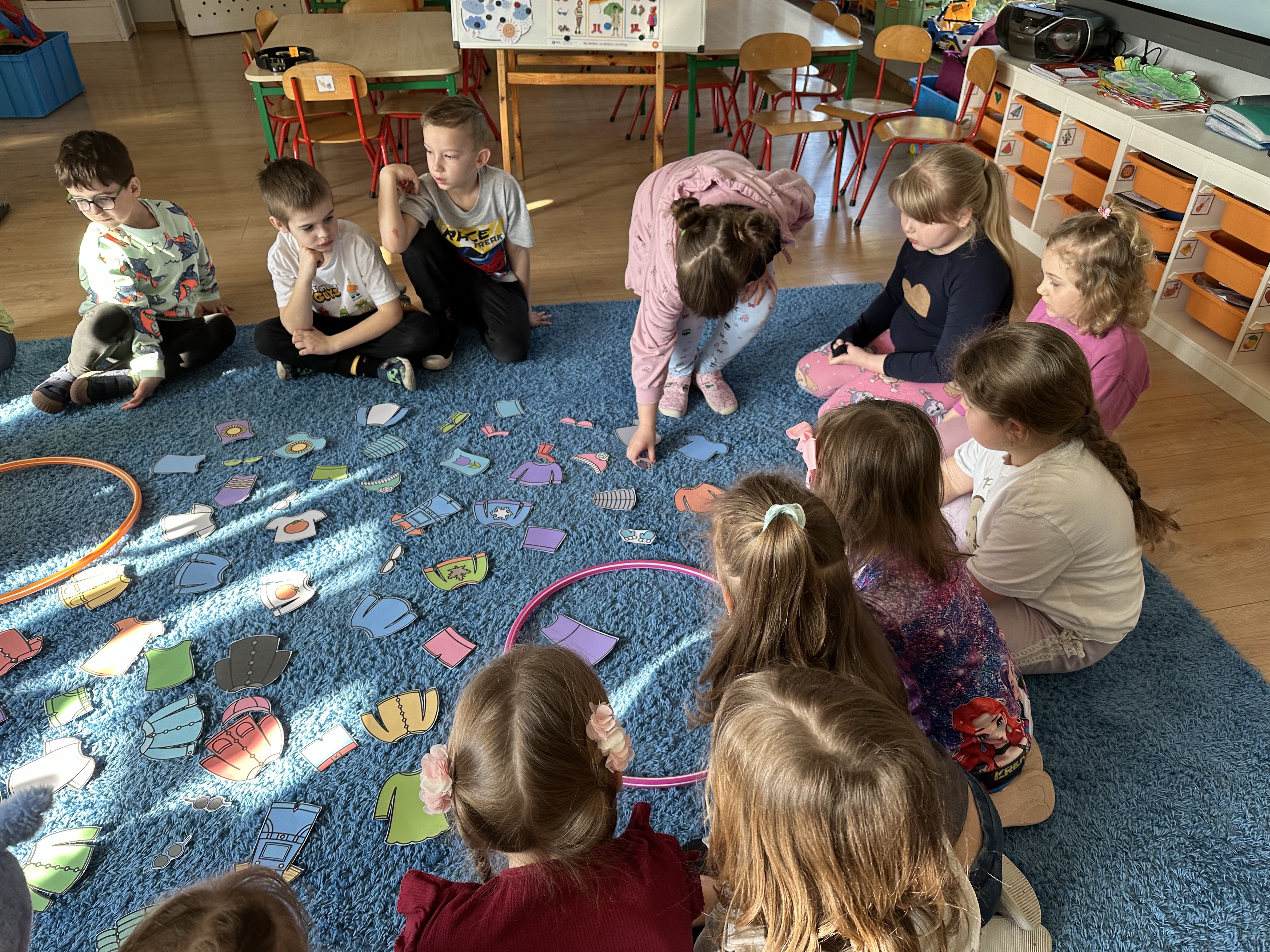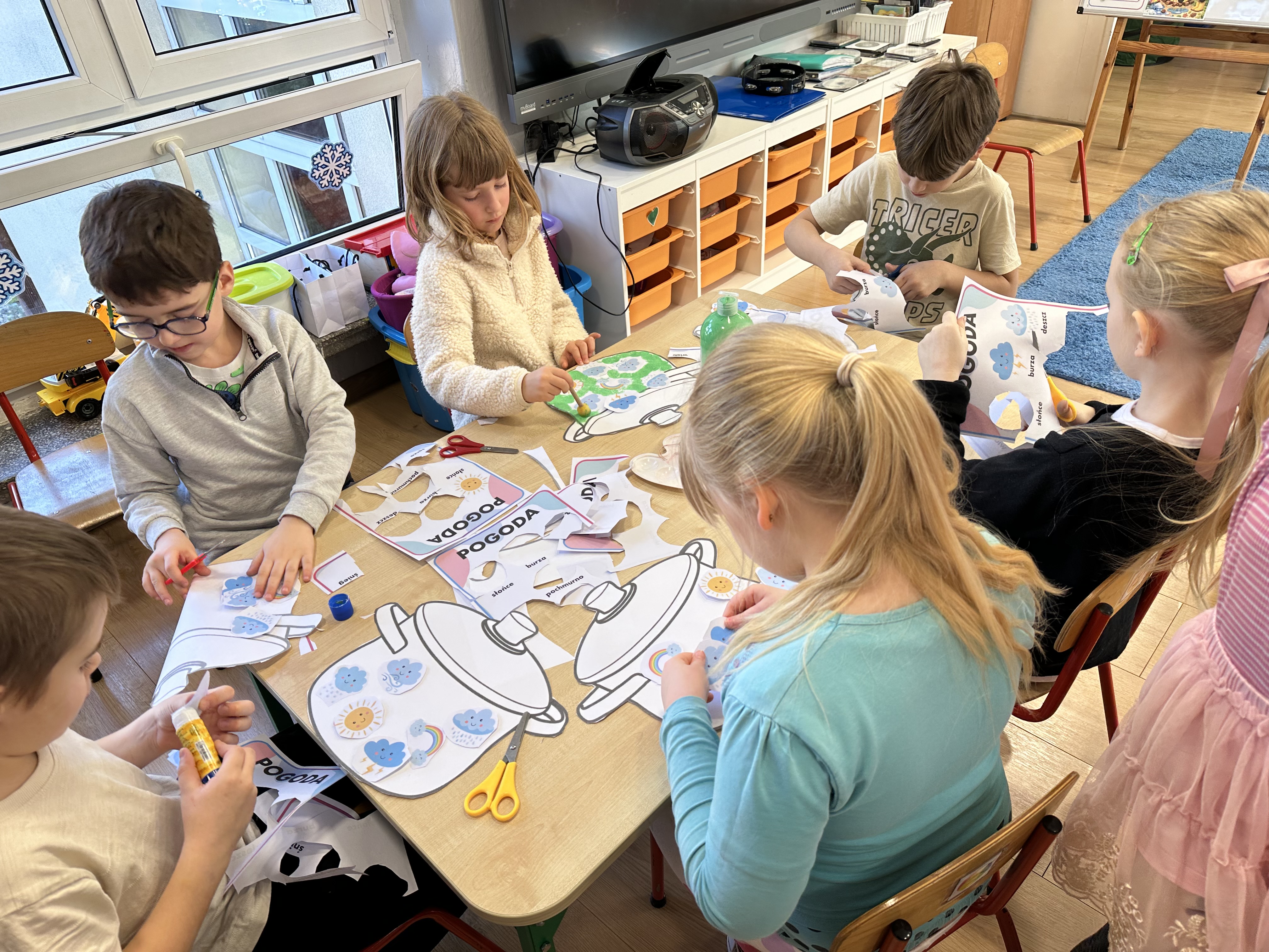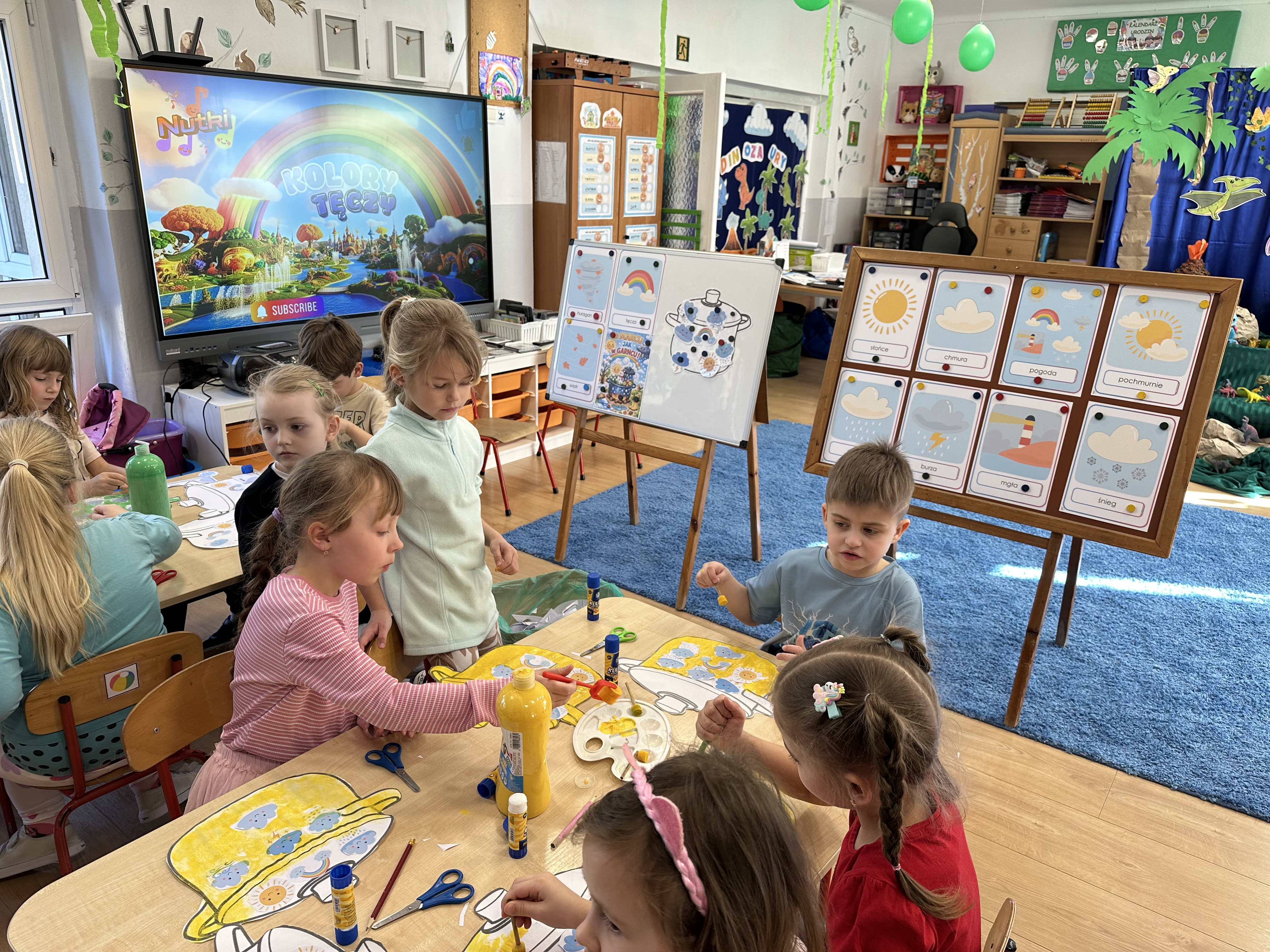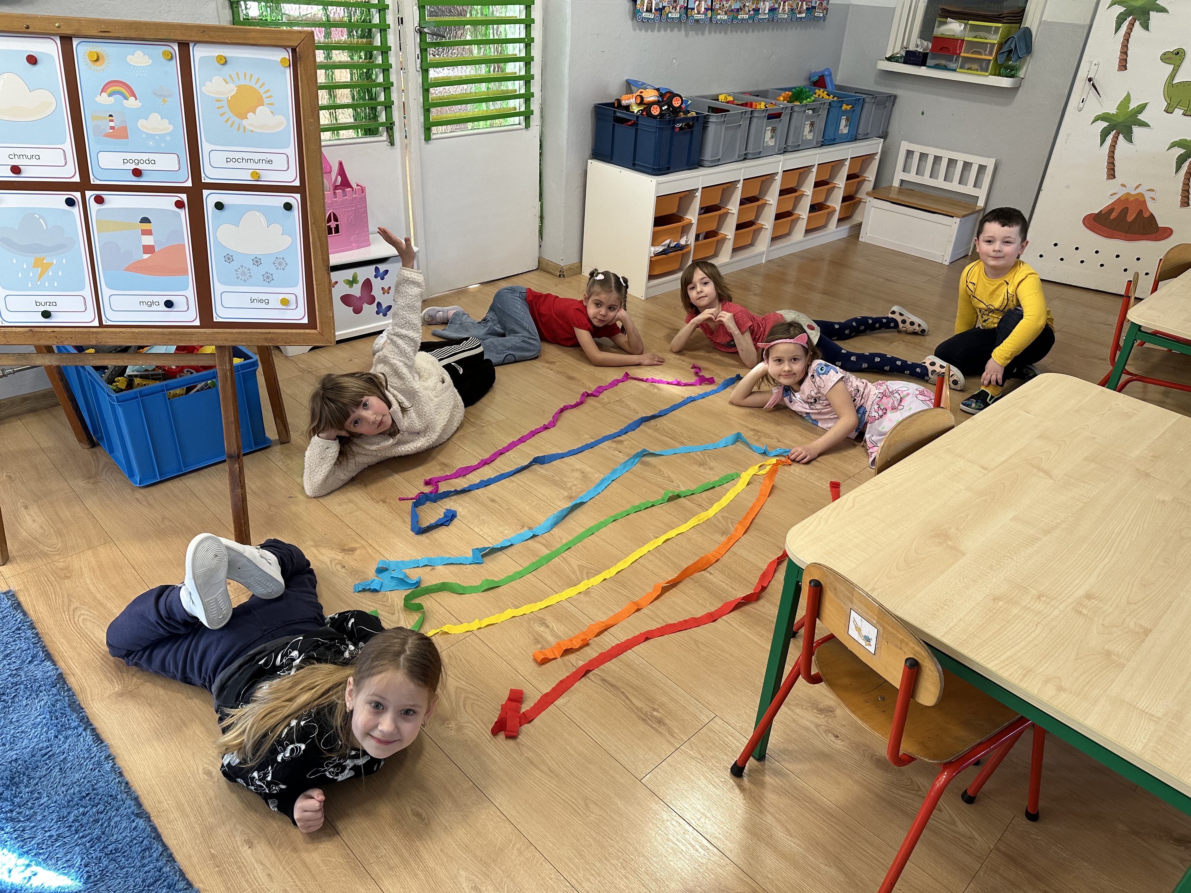 W poniedziałek sześciolatki wyjaśniały, co to jest prognoza pogody. Zastanawiały się, po co ludzie ją oglądają, odczytywały symbole pogodowe i poznały pojęcia związane ze zjawiskami atmosferycznymi. Dodatkowo przedszkolaki zapoznały się z opowiadaniem Marii Pawlisz „W marcu jak w garncu” i omawiały jego treść. Tego dnia dzieci próbowały wyjaśnić własnymi słowami pojęcie ,,nieprzejednana”. Wspólnie dzieliły się pomysłami, jak dbać o swoje zdrowie. Śpiewały i tańczyły do piosenki ,,Mam chusteczkę haftowaną” oraz poznały nowe słowa w języku angielskim: sun „słońce”, rain „deszcz”, wind „wiatr”, storm „burza”, snow „śnieg”, które wykorzystały później do prezentowania pogody w kraju. Co więcej, rysowały płaszcz przeciwdeszczowy i ozdabiały go figurami geometrycznymi zgodnie z instrukcją. Przy stolikach opowiadały, co znajduje się na ilustracjach, samodzielnie lub z pomocą nauczyciela czytały tekst, a także rysowały obrazek, który powinien pasować do przedstawionego kontekstu. Co ciekawe, słuchały utworu literackiego i starały się zapamiętać jak najwięcej szczegółów. We wtorek dzieci poznały przysłowie ,,W marcu, jak w garncu” oraz zapoznały się z literą „g” małą i wielką, drukowaną i pisaną. Rozwijały słuch fonemowy podczas analizy i syntezy głoskowej wyrazu ,,garnek”. Przedszkolaki segregowały różne naczynia kuchenne według cech charakterystycznych, wymieniały nazwy potraw i imion rozpoczynających się głoską g, układały schemat głoskowy z białych kartoników, a także dużą literę „g” z guzików, następnie kreśliły palcem na tacy z kaszą nowo poznaną głoskę. Zdobyte wcześniej umiejętności dzieci wykorzystały podczas zabaw przy stolikach. Wtorkowy dzień sześciolatki zakończyły ćwiczeniami grafomotorycznymi. W środę rozwijały umiejętności logicznego myślenia w trakcie rozwiązywania sudoku. Wysłuchanie wiersza Małgorzaty Strzałkowskiej ,,Wiosenny zawrót głowy” był wprowadzeniem do rozmowy o zwiastunach wiosny. Dodatkowo podczas zabaw ruchowych przypominały sobie nazwy zjawisk atmosferycznych. A w trakcie zabawy „Porządki w szafie” rozwijały umiejętność odczytywania kodu oraz układania przedmiotów w przestrzeni. Przedszkolaki wspólnie odczytywały ceny poszczególnych części garderoby i klasyfikowały, które z nich są tańsze, a które droższe, rozwijały tym samym kompetencje matematyczne. W kolejnej części dnia dzieci brały aktywny udział w zabawie językowej „Szafa pełna ubrań”, w której rozwijały umiejętność czytania i pisania, tj. odczytywały samodzielnie podpisy i próbowały samodzielnie napisać nazwy ubrań na kartce. W czwartek sześciolatki rozwijały wiedzę o oznakach wiosny, usłyszały wiersz Władysława Broniewskiego pt. „Pierwiosnek”. Dodatkowo poznały wszystkie wiosenne kwiaty. Podczas zabawy „Ptaki wracają z ciepłych krajów” poszerzały wiedzę przyrodniczą o ptakach zimujących w Polsce oraz wracających z ciepłych krajów, utrwalały przy okazji nazwy kontynentów i wskazywały je na mapie. W kolejnej części dnia zapoznały się