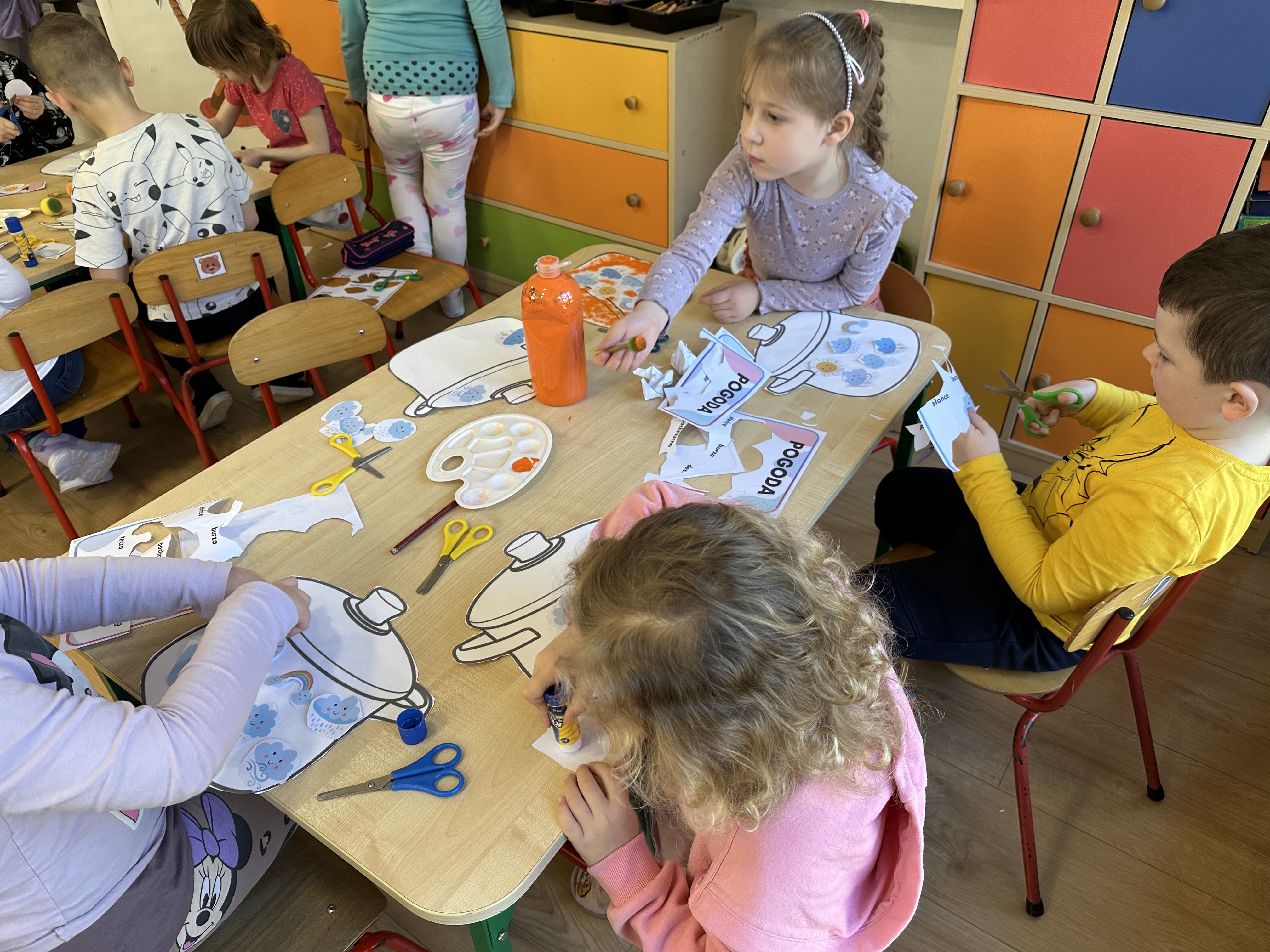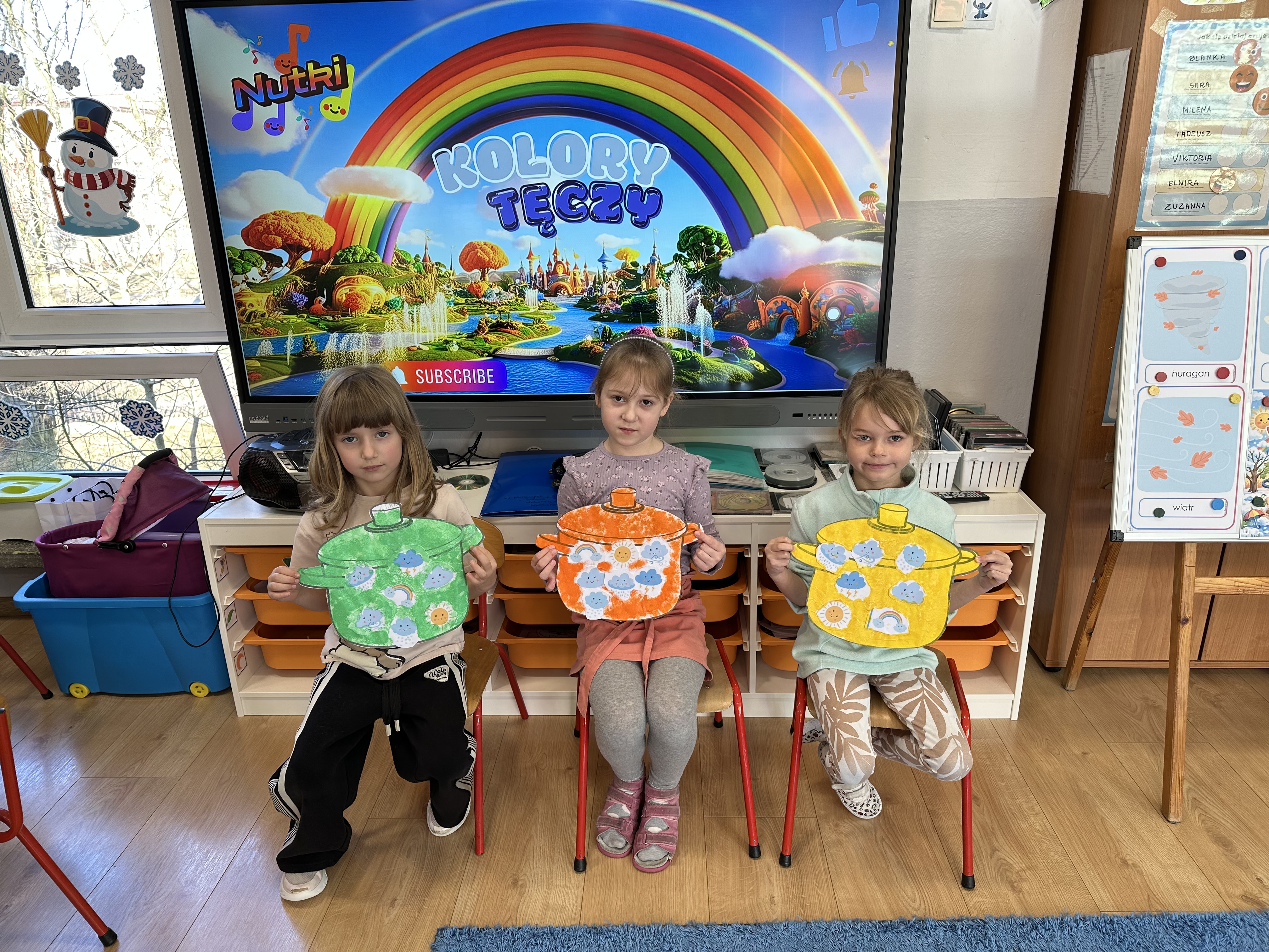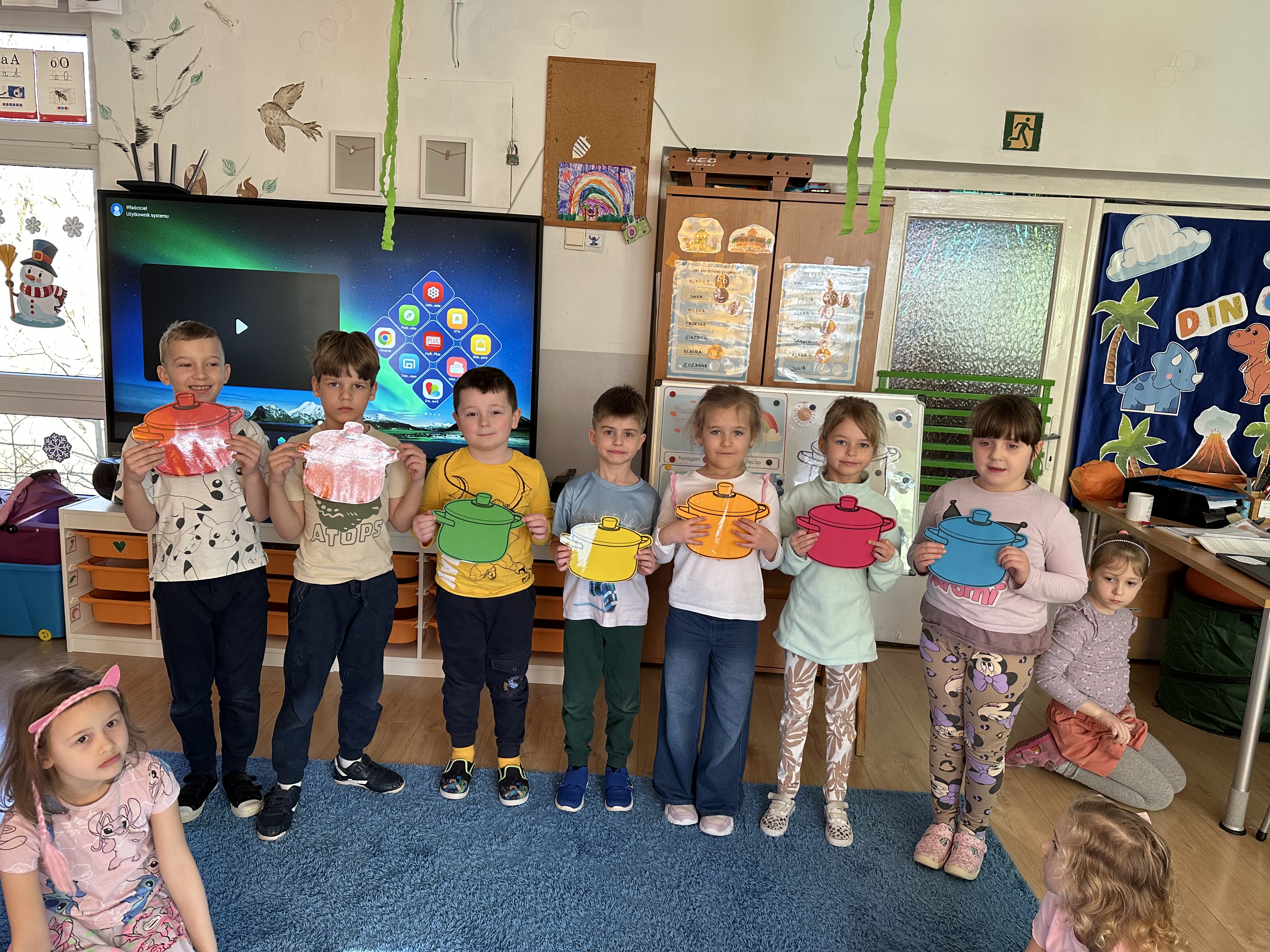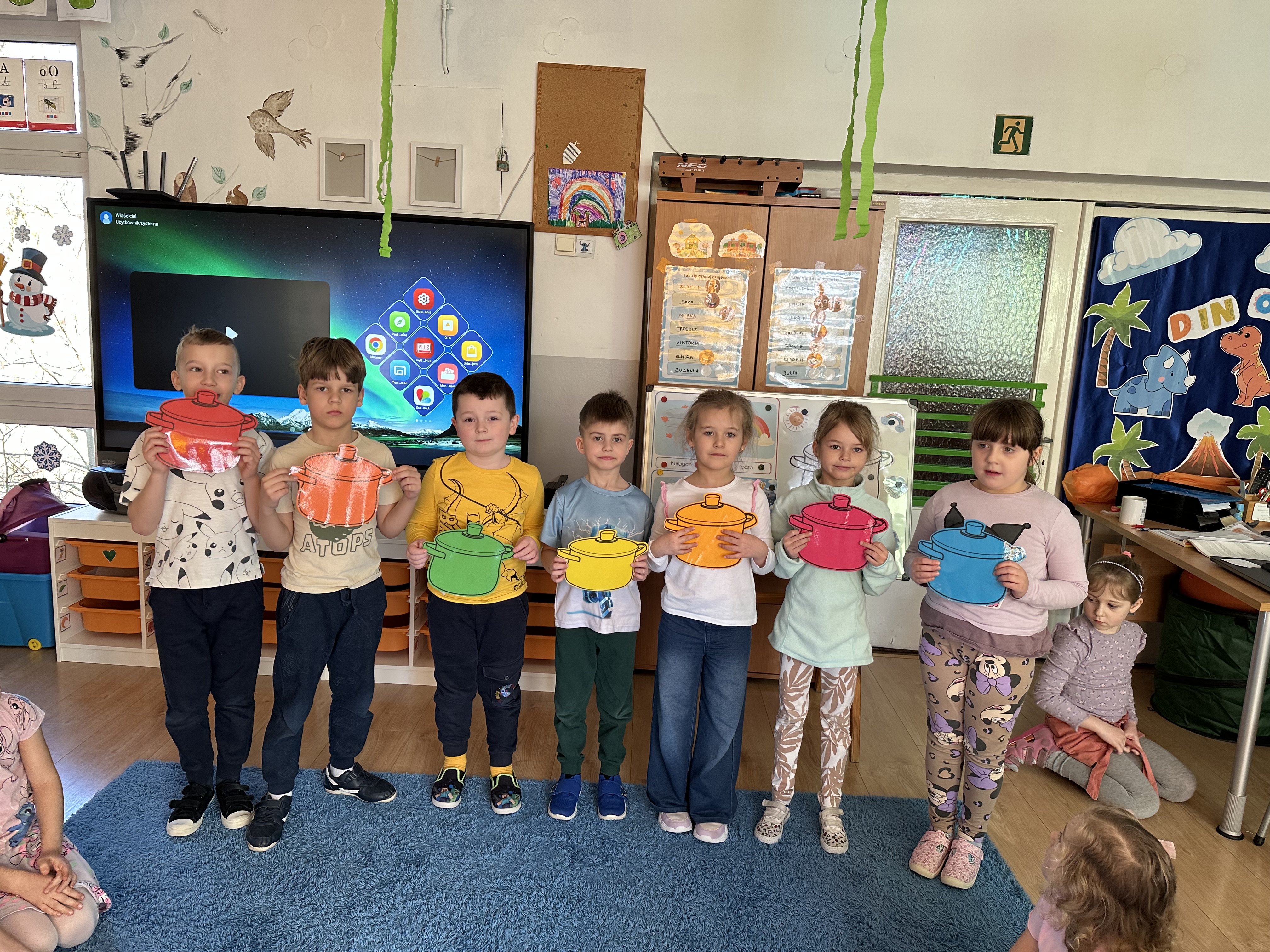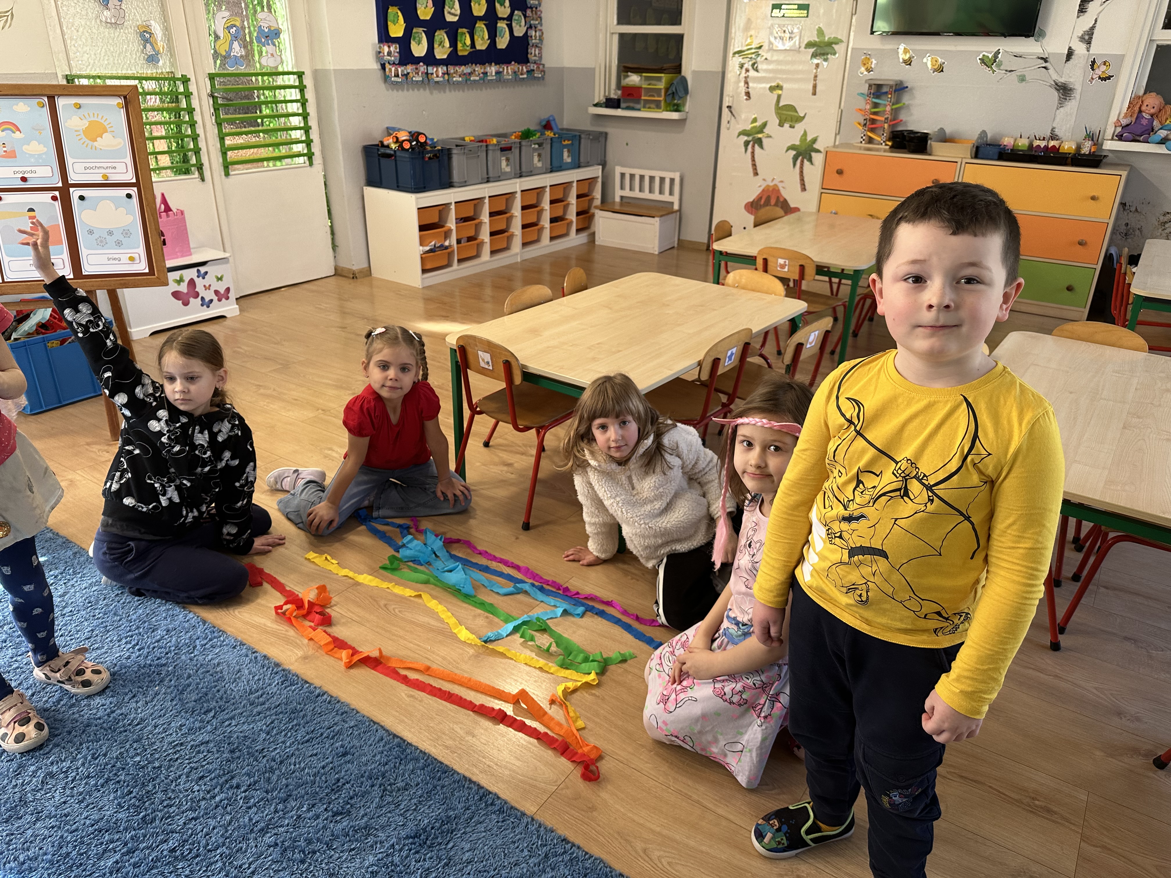 W poniedziałek sześciolatki wyjaśniały, co to jest prognoza pogody. Zastanawiały się, po co ludzie ją oglądają, odczytywały symbole pogodowe i poznały pojęcia związane ze zjawiskami atmosferycznymi. Dodatkowo przedszkolaki zapoznały się z opowiadaniem Marii Pawlisz „W marcu jak w garncu” i omawiały jego treść. Tego dnia dzieci próbowały wyjaśnić własnymi słowami pojęcie ,,nieprzejednana”. Wspólnie dzieliły się pomysłami, jak dbać o swoje zdrowie. Śpiewały i tańczyły do piosenki ,,Mam chusteczkę haftowaną” oraz poznały nowe słowa w języku angielskim: sun „słońce”, rain „deszcz”, wind „wiatr”, storm „burza”, snow „śnieg”, które wykorzystały później do prezentowania pogody w kraju. Co więcej, rysowały płaszcz przeciwdeszczowy i ozdabiały go figurami geometrycznymi zgodnie z instrukcją. Przy stolikach opowiadały, co znajduje się na ilustracjach, samodzielnie lub z pomocą nauczyciela czytały tekst, a także rysowały obrazek, który powinien pasować do przedstawionego kontekstu. Co ciekawe, słuchały utworu literackiego i starały się zapamiętać jak najwięcej szczegółów. We wtorek dzieci poznały przysłowie ,,W marcu, jak w garncu” oraz zapoznały się z literą „g” małą i wielką, drukowaną i pisaną. Rozwijały słuch fonemowy podczas analizy i syntezy głoskowej wyrazu ,,garnek”. Przedszkolaki segregowały różne naczynia kuchenne według cech charakterystycznych, wymieniały nazwy potraw i imion rozpoczynających się głoską g, układały schemat głoskowy z białych kartoników, a także dużą literę „g” z guzików, następnie kreśliły palcem na tacy z kaszą nowo poznaną głoskę. Zdobyte wcześniej umiejętności dzieci wykorzystały podczas zabaw przy stolikach. Wtorkowy dzień sześciolatki zakończyły ćwiczeniami grafomotorycznymi. W środę rozwijały umiejętności logicznego myślenia w trakcie rozwiązywania sudoku. Wysłuchanie wiersza Małgorzaty Strzałkowskiej ,,Wiosenny zawrót głowy” był wprowadzeniem do rozmowy o zwiastunach wiosny. Dodatkowo podczas zabaw ruchowych przypominały sobie nazwy zjawisk atmosferycznych. A w trakcie zabawy „Porządki w szafie” rozwijały umiejętność odczytywania kodu oraz układania przedmiotów w przestrzeni. Przedszkolaki wspólnie odczytywały ceny poszczególnych części garderoby i klasyfikowały, które z nich są tańsze, a które droższe, rozwijały tym samym kompetencje matematyczne. W kolejnej części dnia dzieci brały aktywny udział w zabawie językowej „Szafa pełna ubrań”, w której rozwijały umiejętność czytania i pisania, tj. odczytywały samodzielnie podpisy i próbowały samodzielnie napisać nazwy ubrań na kartce. W czwartek sześciolatki rozwijały wiedzę o oznakach wiosny, usłyszały wiersz Władysława Broniewskiego pt. „Pierwiosnek”. Dodatkowo poznały wszystkie wiosenne kwiaty. Podczas zabawy „Ptaki wracają z ciepłych krajów” poszerzały wiedzę przyrodniczą o ptakach zimujących w Polsce oraz wracających z ciepłych krajów, utrwalały przy okazji nazwy kontynentów i wskazywały je na mapie. W kolejnej części dnia zapoznały się