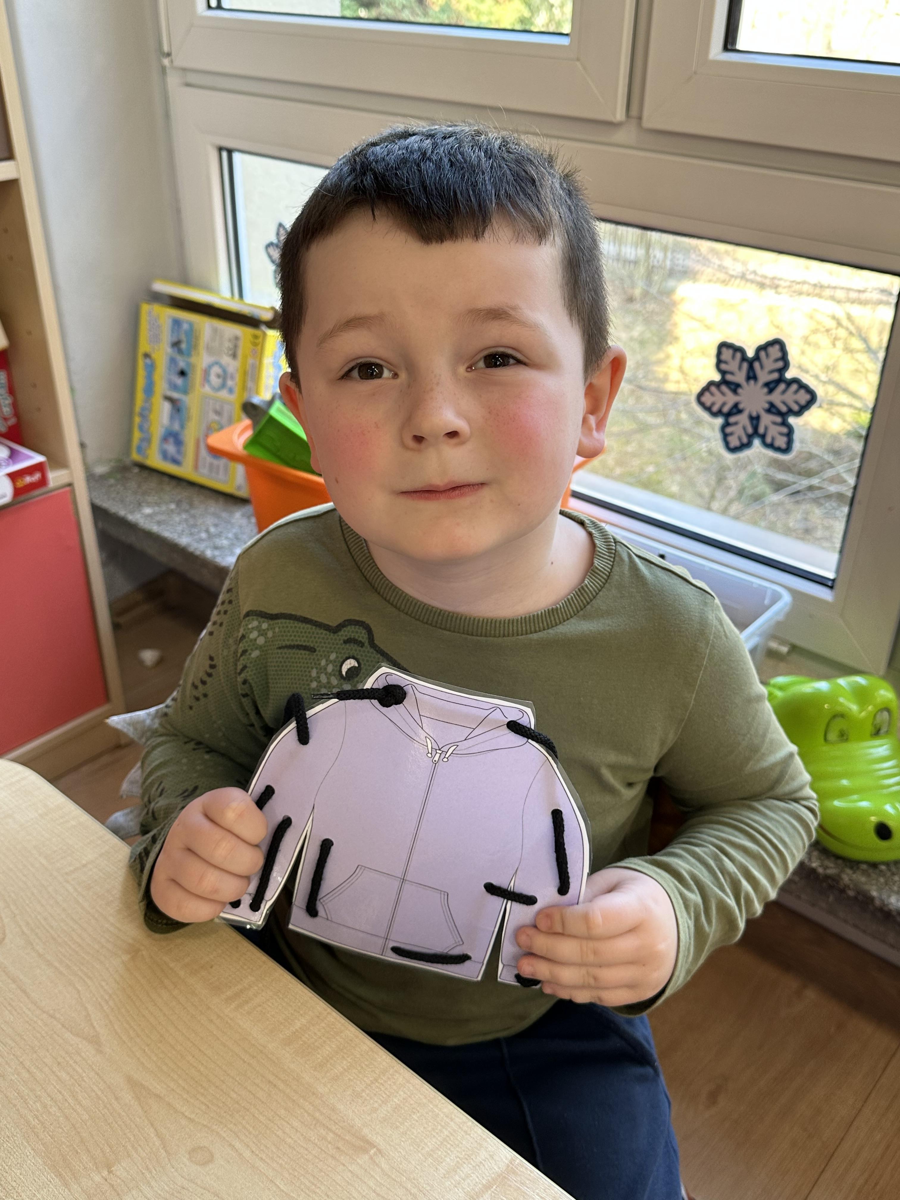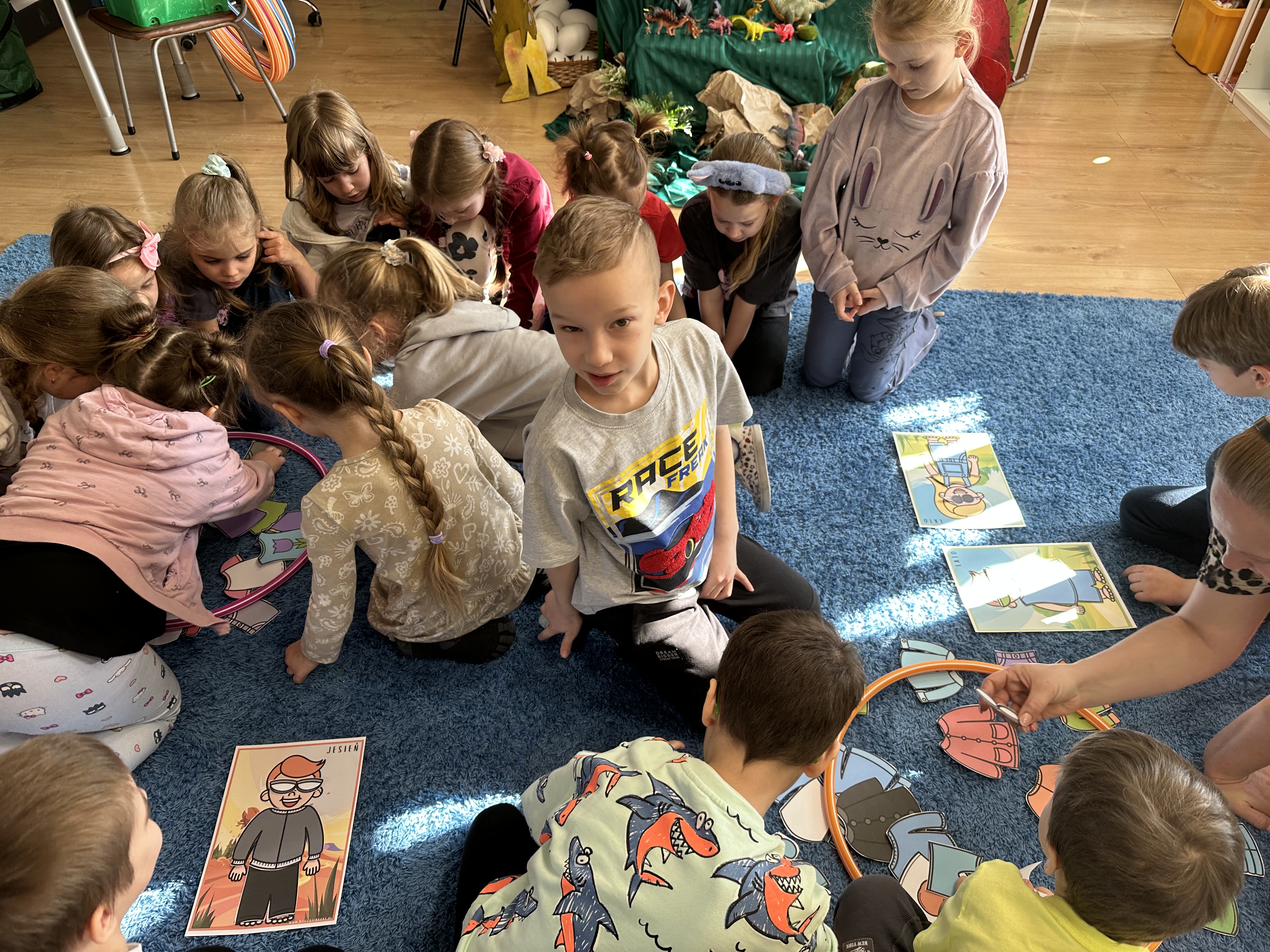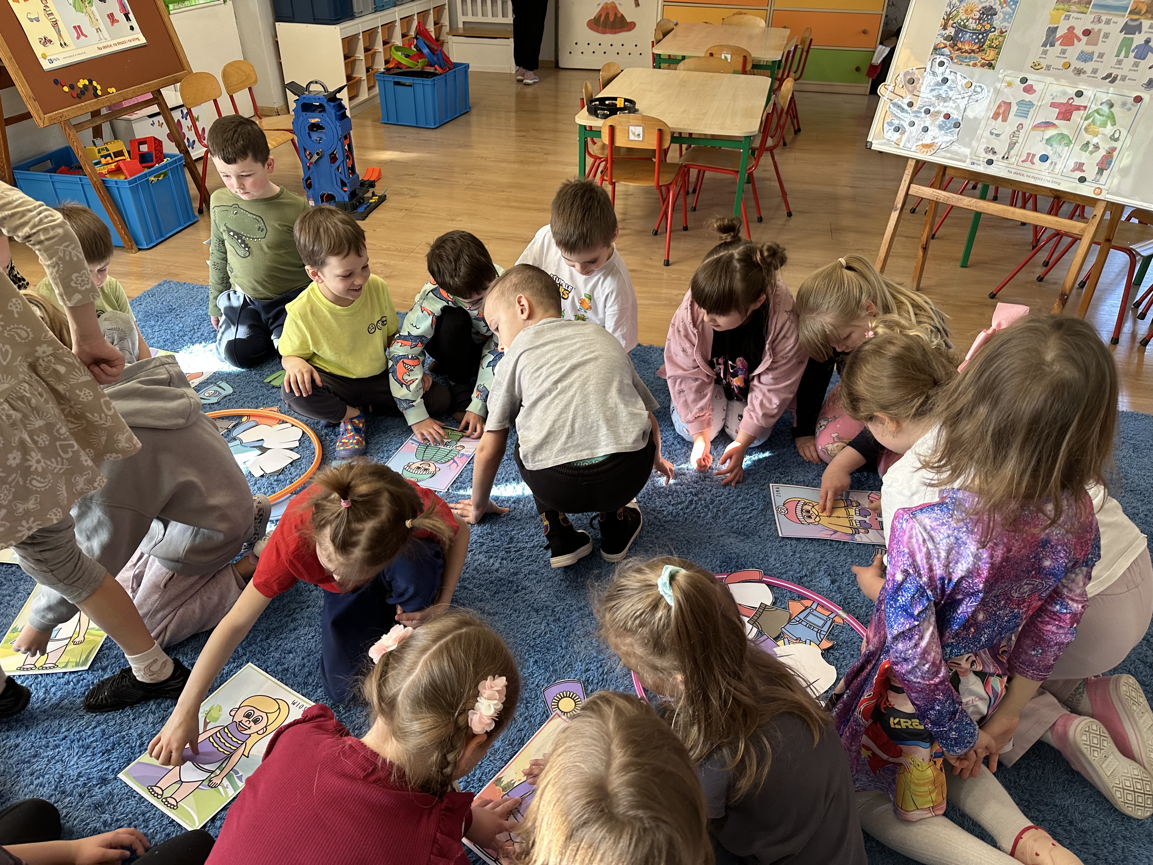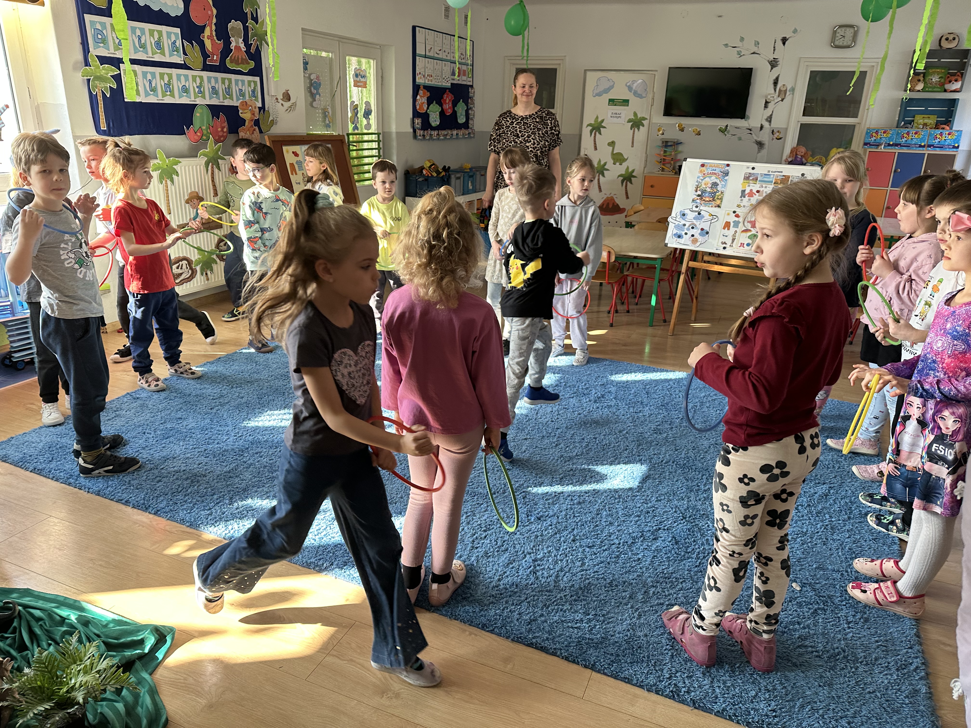 W poniedziałek sześciolatki wyjaśniały, co to jest prognoza pogody. Zastanawiały się, po co ludzie ją oglądają, odczytywały symbole pogodowe i poznały pojęcia związane ze zjawiskami atmosferycznymi. Dodatkowo przedszkolaki zapoznały się z opowiadaniem Marii Pawlisz „W marcu jak w garncu” i omawiały jego treść. Tego dnia dzieci próbowały wyjaśnić własnymi słowami pojęcie ,,nieprzejednana”. Wspólnie dzieliły się pomysłami, jak dbać o swoje zdrowie. Śpiewały i tańczyły do piosenki ,,Mam chusteczkę haftowaną” oraz poznały nowe słowa w języku angielskim: sun „słońce”, rain „deszcz”, wind „wiatr”, storm „burza”, snow „śnieg”, które wykorzystały później do prezentowania pogody w kraju. Co więcej, rysowały płaszcz przeciwdeszczowy i ozdabiały go figurami geometrycznymi zgodnie z instrukcją. Przy stolikach opowiadały, co znajduje się na ilustracjach, samodzielnie lub z pomocą nauczyciela czytały tekst, a także rysowały obrazek, który powinien pasować do przedstawionego kontekstu. Co ciekawe, słuchały utworu literackiego i starały się zapamiętać jak najwięcej szczegółów. We wtorek dzieci poznały przysłowie ,,W marcu, jak w garncu” oraz zapoznały się z literą „g” małą i wielką, drukowaną i pisaną. Rozwijały słuch fonemowy podczas analizy i syntezy głoskowej wyrazu ,,garnek”. Przedszkolaki segregowały różne naczynia kuchenne według cech charakterystycznych, wymieniały nazwy potraw i imion rozpoczynających się głoską g, układały schemat głoskowy z białych kartoników, a także dużą literę „g” z guzików, następnie kreśliły palcem na tacy z kaszą nowo poznaną głoskę. Zdobyte wcześniej umiejętności dzieci wykorzystały podczas zabaw przy stolikach. Wtorkowy dzień sześciolatki zakończyły ćwiczeniami grafomotorycznymi. W środę rozwijały umiejętności logicznego myślenia w trakcie rozwiązywania sudoku. Wysłuchanie wiersza Małgorzaty Strzałkowskiej ,,Wiosenny zawrót głowy” był wprowadzeniem do rozmowy o zwiastunach wiosny. Dodatkowo podczas zabaw ruchowych przypominały sobie nazwy zjawisk atmosferycznych. A w trakcie zabawy „Porządki w szafie” rozwijały umiejętność odczytywania kodu oraz układania przedmiotów w przestrzeni. Przedszkolaki wspólnie odczytywały ceny poszczególnych części garderoby i klasyfikowały, które z nich są tańsze, a które droższe, rozwijały tym samym kompetencje matematyczne. W kolejnej części dnia dzieci brały aktywny udział w zabawie językowej „Szafa pełna ubrań”, w której rozwijały umiejętność czytania i pisania, tj. odczytywały samodzielnie podpisy i próbowały samodzielnie napisać nazwy ubrań na kartce. W czwartek sześciolatki rozwijały wiedzę o oznakach wiosny, usłyszały wiersz Władysława Broniewskiego pt. „Pierwiosnek”. Dodatkowo poznały wszystkie wiosenne kwiaty. Podczas zabawy „Ptaki wracają z ciepłych krajów” poszerzały wiedzę przyrodniczą o ptakach zimujących w Polsce oraz wracających z ciepłych krajów, utrwalały przy okazji nazwy kontynentów i wskazywały je na mapie. W kolejnej części dnia zapoznały się
