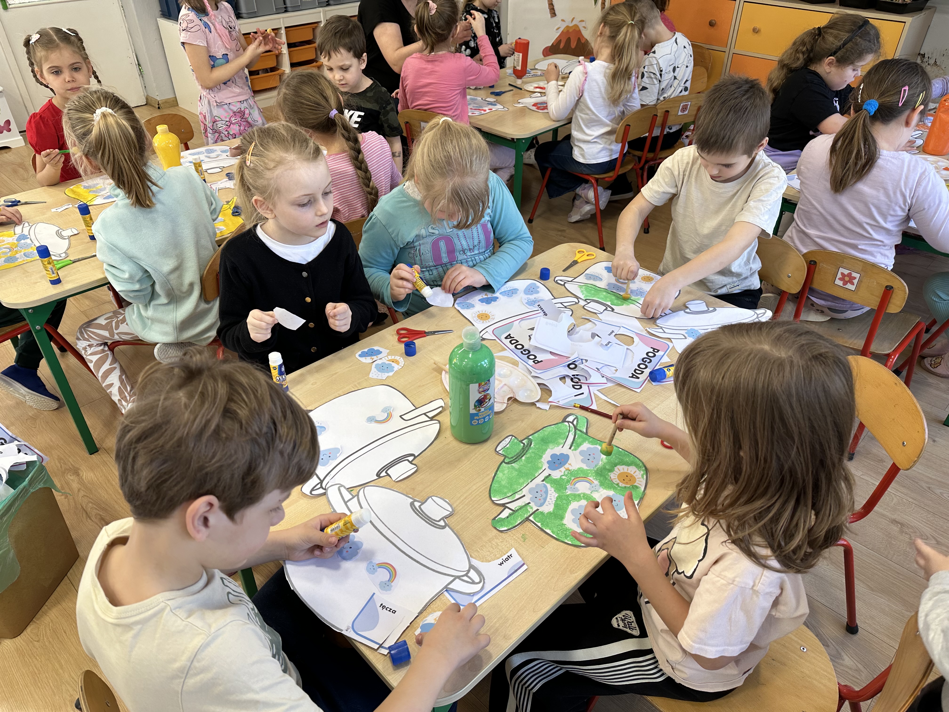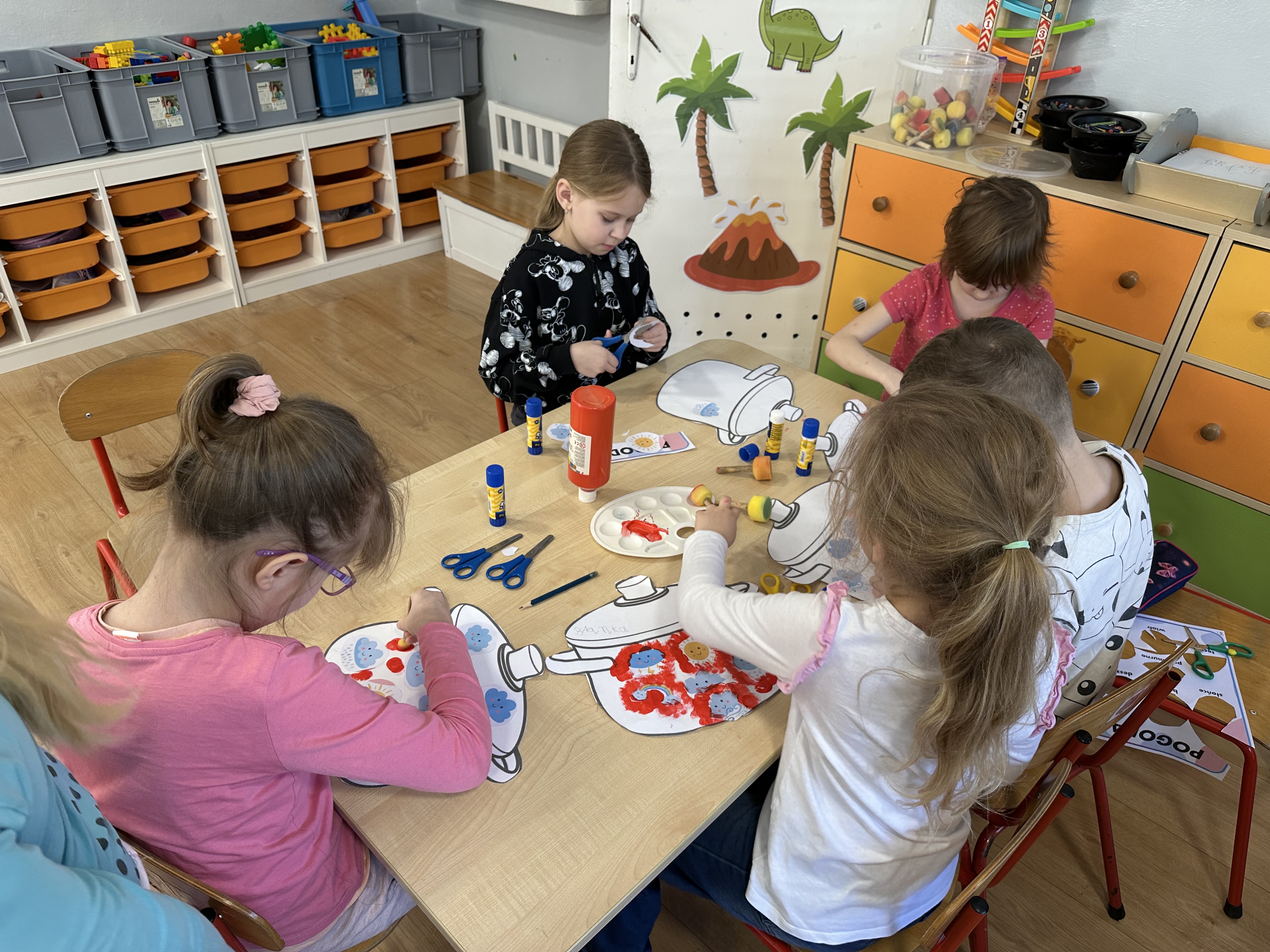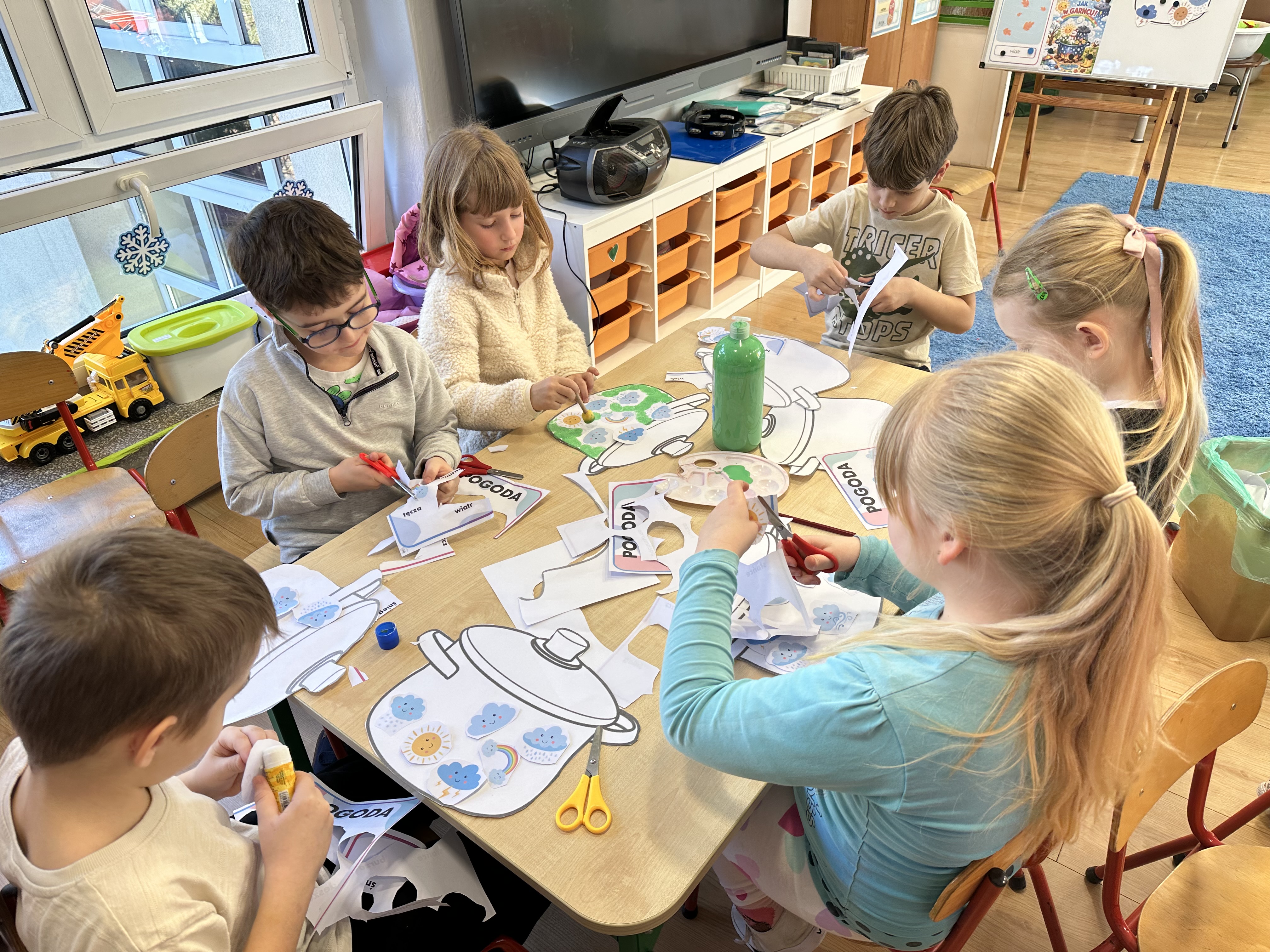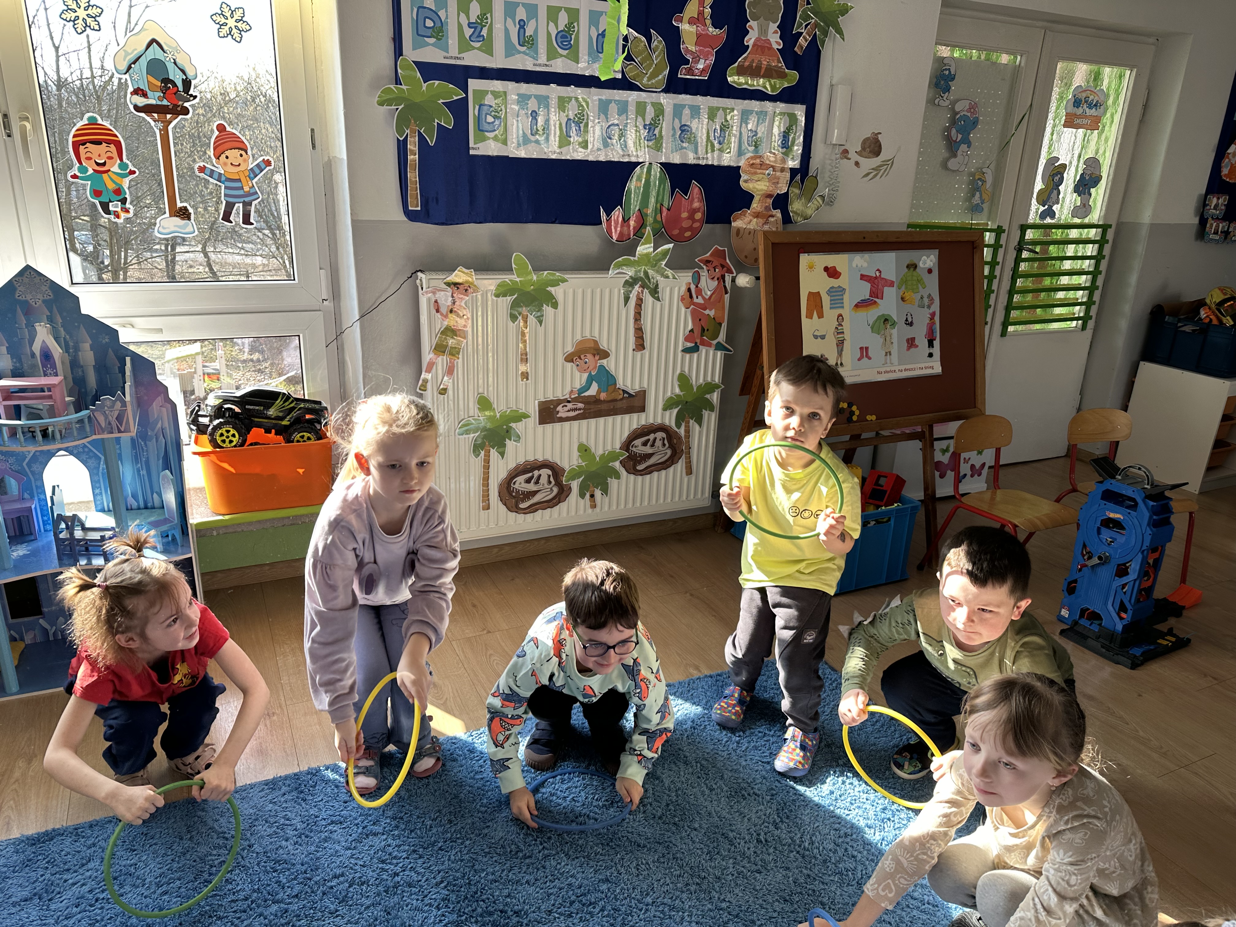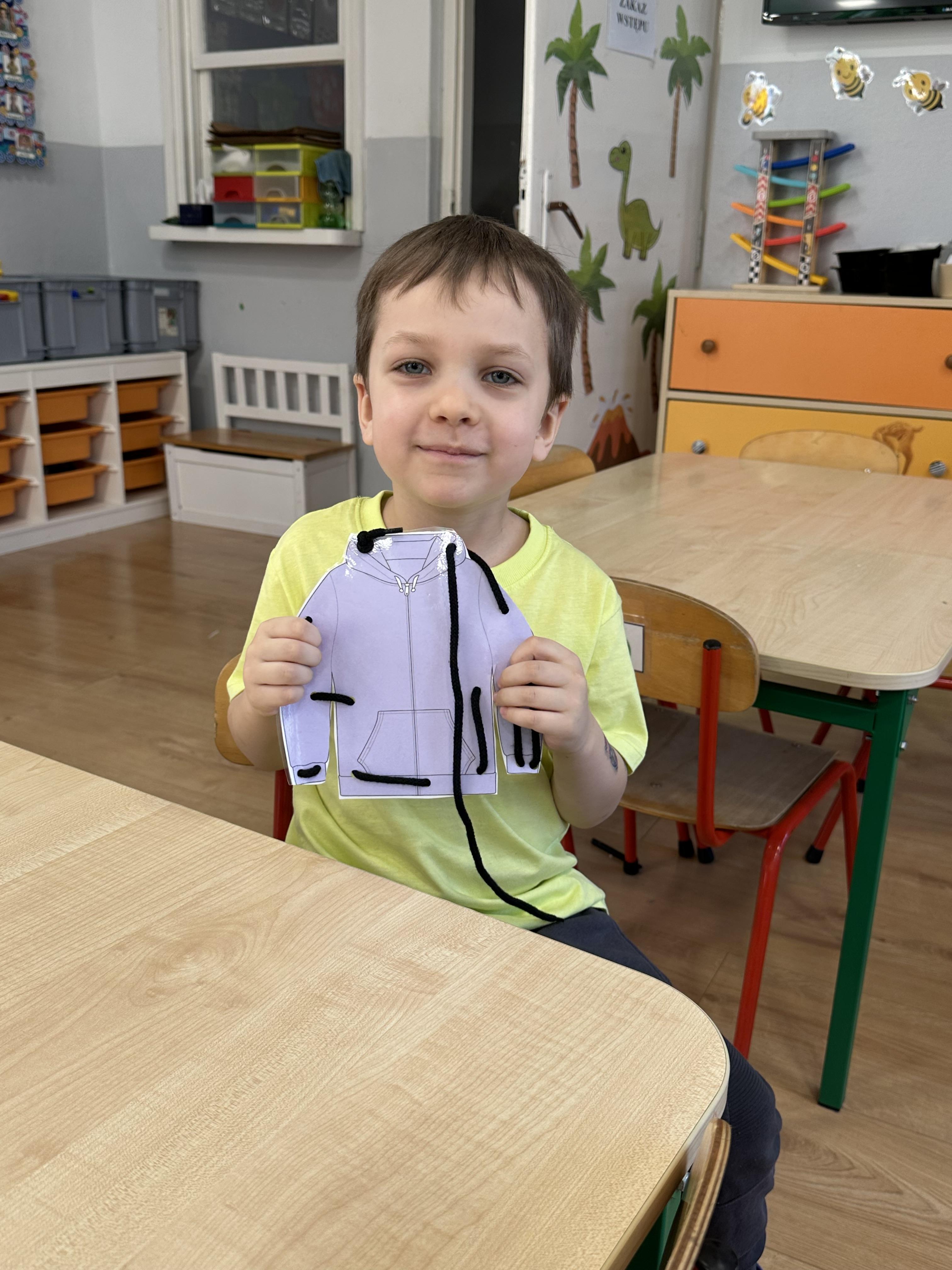 W poniedziałek sześciolatki wyjaśniały, co to jest prognoza pogody. Zastanawiały się, po co ludzie ją oglądają, odczytywały symbole pogodowe i poznały pojęcia związane ze zjawiskami atmosferycznymi. Dodatkowo przedszkolaki zapoznały się z opowiadaniem Marii Pawlisz „W marcu jak w garncu” i omawiały jego treść. Tego dnia dzieci próbowały wyjaśnić własnymi słowami pojęcie ,,nieprzejednana”. Wspólnie dzieliły się pomysłami, jak dbać o swoje zdrowie. Śpiewały i tańczyły do piosenki ,,Mam chusteczkę haftowaną” oraz poznały nowe słowa w języku angielskim: sun „słońce”, rain „deszcz”, wind „wiatr”, storm „burza”, snow „śnieg”, które wykorzystały później do prezentowania pogody w kraju. Co więcej, rysowały płaszcz przeciwdeszczowy i ozdabiały go figurami geometrycznymi zgodnie z instrukcją. Przy stolikach opowiadały, co znajduje się na ilustracjach, samodzielnie lub z pomocą nauczyciela czytały tekst, a także rysowały obrazek, który powinien pasować do przedstawionego kontekstu. Co ciekawe, słuchały utworu literackiego i starały się zapamiętać jak najwięcej szczegółów. We wtorek dzieci poznały przysłowie ,,W marcu, jak w garncu” oraz zapoznały się z literą „g” małą i wielką, drukowaną i pisaną. Rozwijały słuch fonemowy podczas analizy i syntezy głoskowej wyrazu ,,garnek”. Przedszkolaki segregowały różne naczynia kuchenne według cech charakterystycznych, wymieniały nazwy potraw i imion rozpoczynających się głoską g, układały schemat głoskowy z białych kartoników, a także dużą literę „g” z guzików, następnie kreśliły palcem na tacy z kaszą nowo poznaną głoskę. Zdobyte wcześniej umiejętności dzieci wykorzystały podczas zabaw przy stolikach. Wtorkowy dzień sześciolatki zakończyły ćwiczeniami grafomotorycznymi. W środę rozwijały umiejętności logicznego myślenia w trakcie rozwiązywania sudoku. Wysłuchanie wiersza Małgorzaty Strzałkowskiej ,,Wiosenny zawrót głowy” był wprowadzeniem do rozmowy o zwiastunach wiosny. Dodatkowo podczas zabaw ruchowych przypominały sobie nazwy zjawisk atmosferycznych. A w trakcie zabawy „Porządki w szafie” rozwijały umiejętność odczytywania kodu oraz układania przedmiotów w przestrzeni. Przedszkolaki wspólnie odczytywały ceny poszczególnych części garderoby i klasyfikowały, które z nich są tańsze, a które droższe, rozwijały tym samym kompetencje matematyczne. W kolejnej części dnia dzieci brały aktywny udział w zabawie językowej „Szafa pełna ubrań”, w której rozwijały umiejętność czytania i pisania, tj. odczytywały samodzielnie podpisy i próbowały samodzielnie napisać nazwy ubrań na kartce. W czwartek sześciolatki rozwijały wiedzę o oznakach wiosny, usłyszały wiersz Władysława Broniewskiego pt. „Pierwiosnek”. Dodatkowo poznały wszystkie wiosenne kwiaty. Podczas zabawy „Ptaki wracają z ciepłych krajów” poszerzały wiedzę przyrodniczą o ptakach zimujących w Polsce oraz wracających z ciepłych krajów, utrwalały przy okazji nazwy kontynentów i wskazywały je na mapie. W kolejnej części dnia zapoznały się