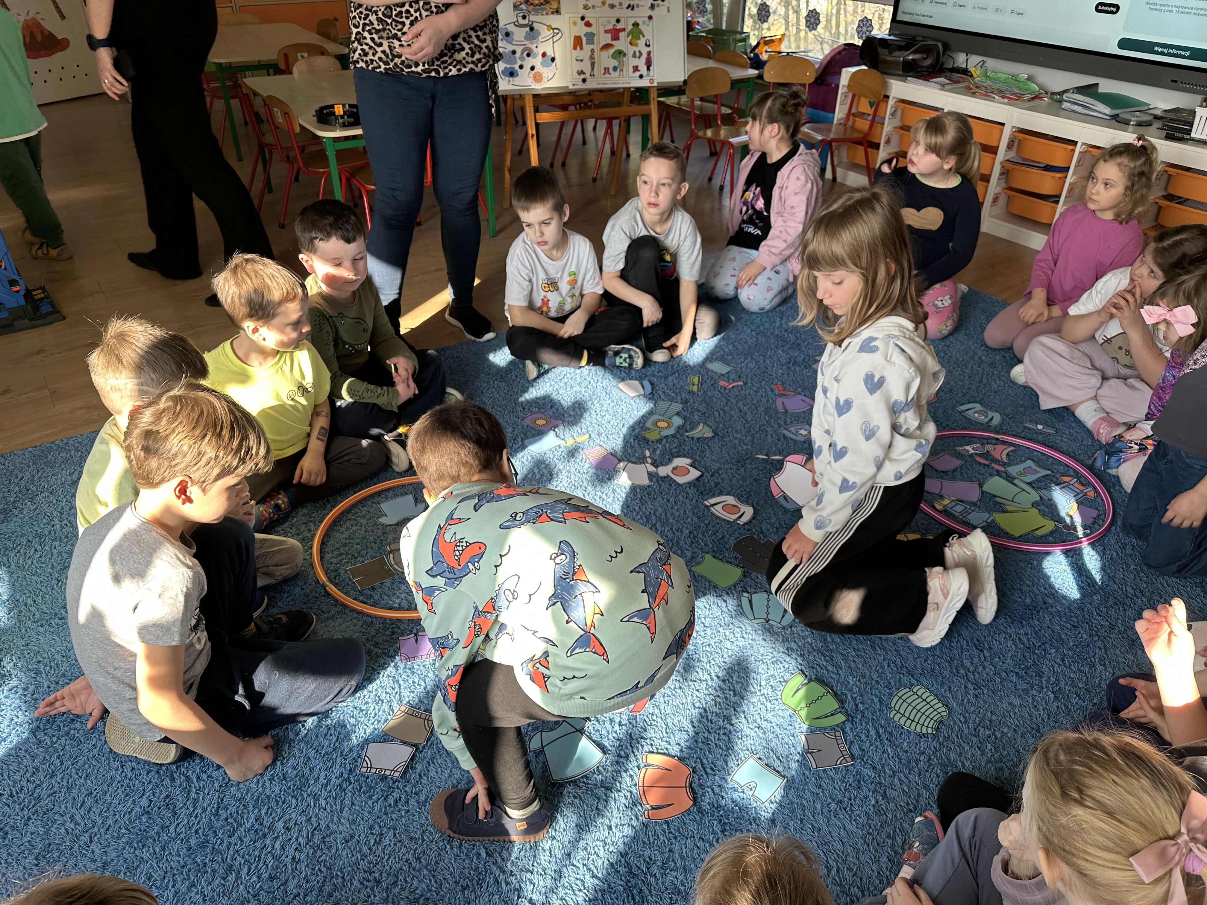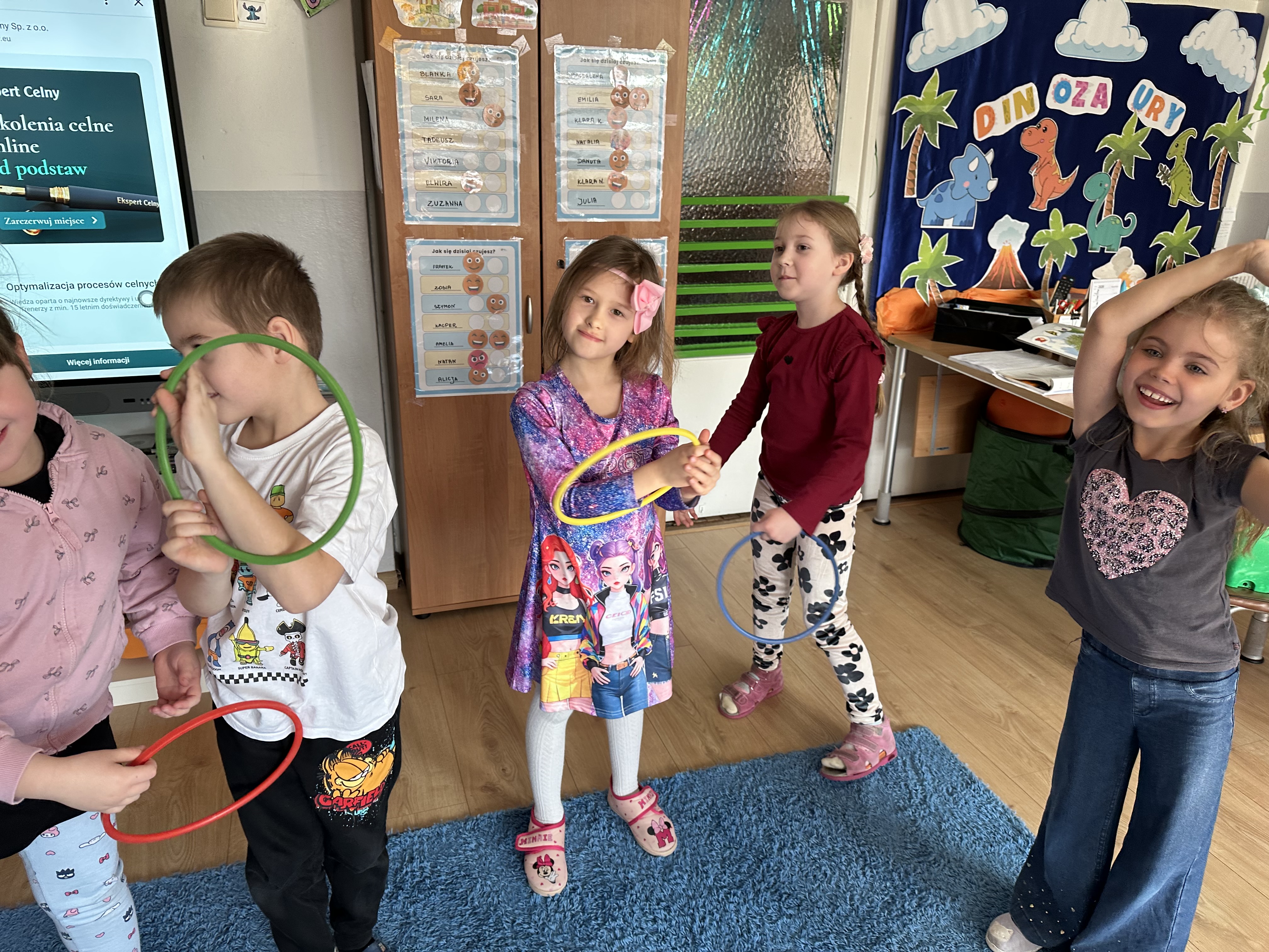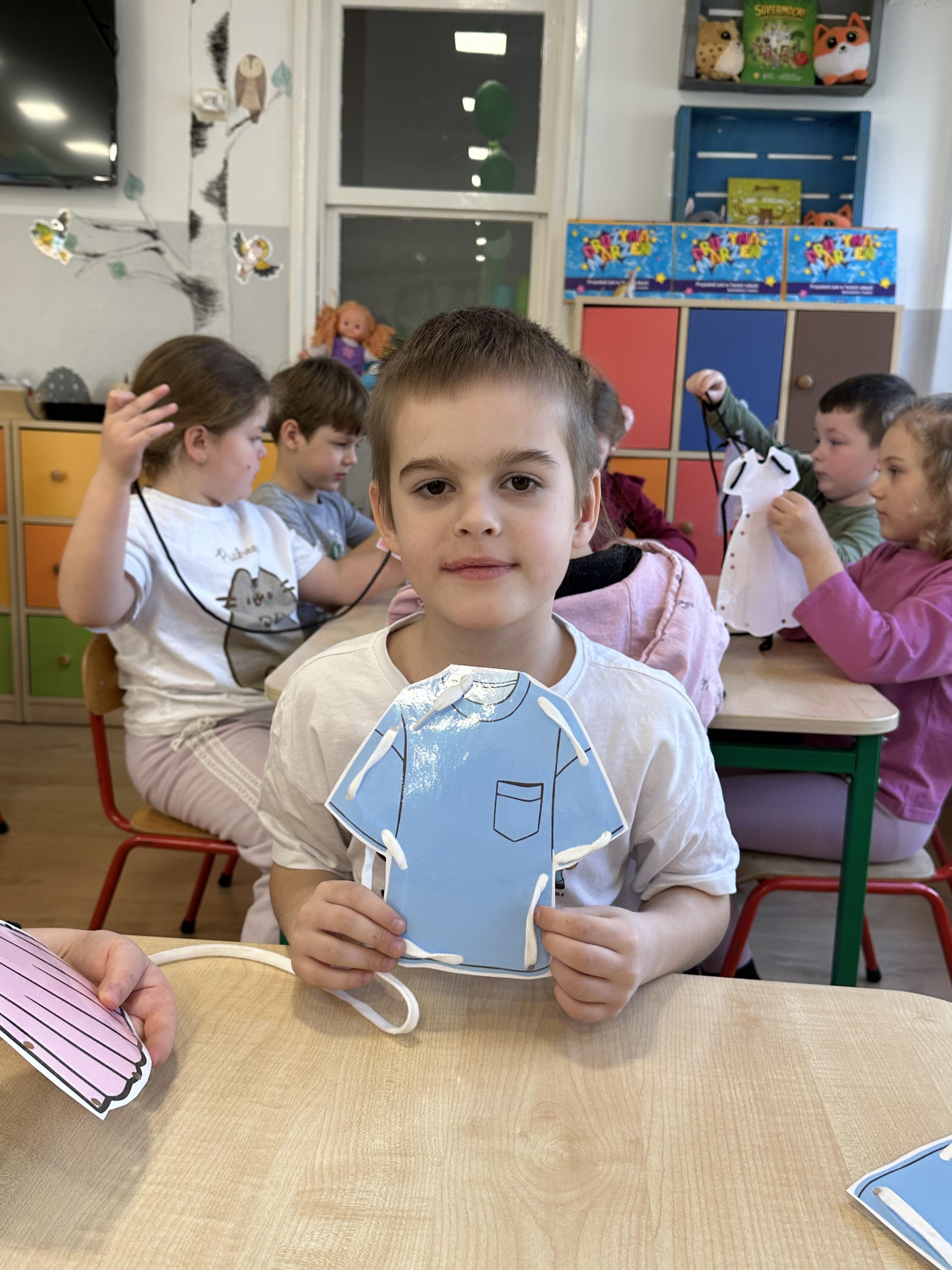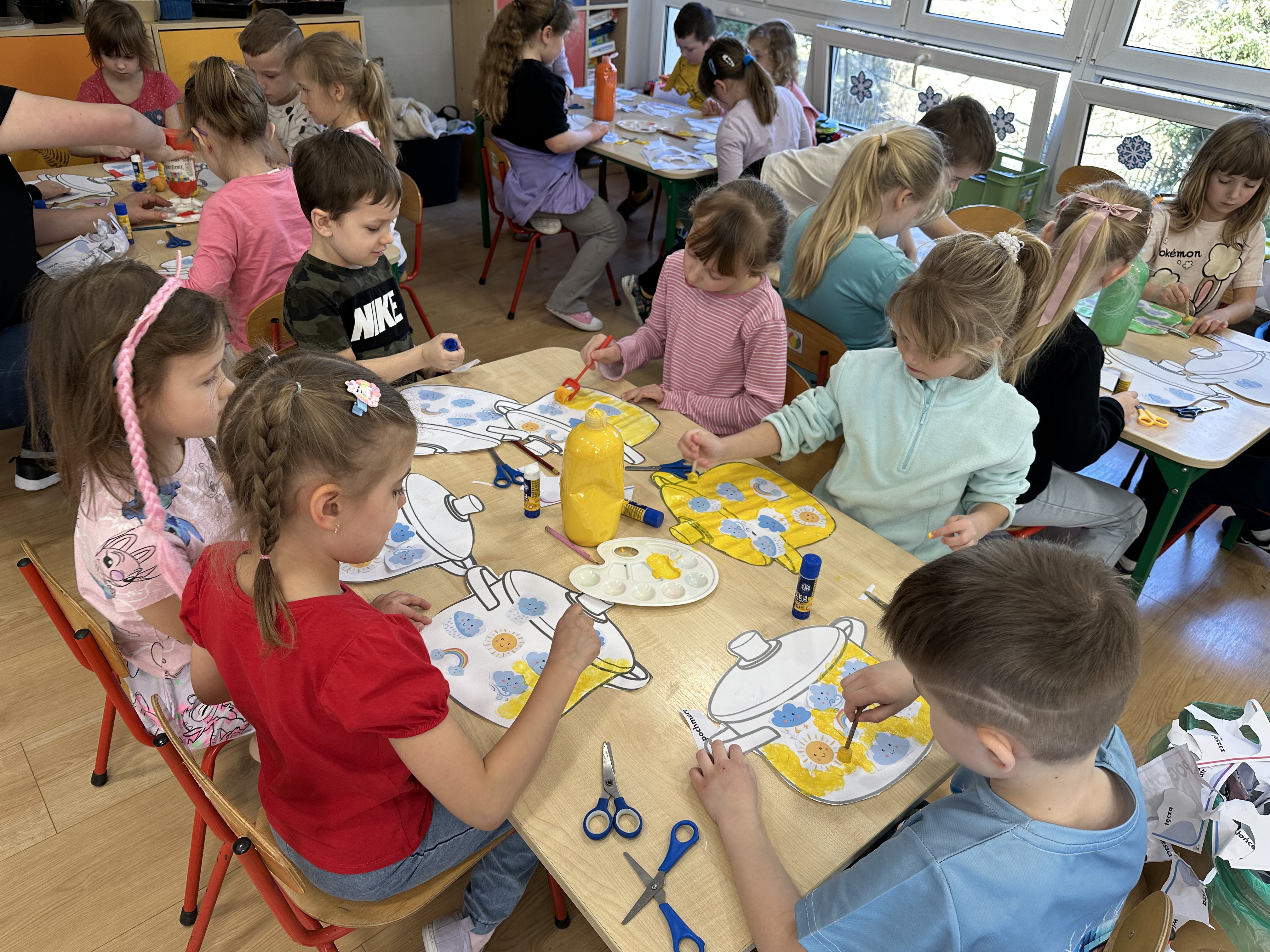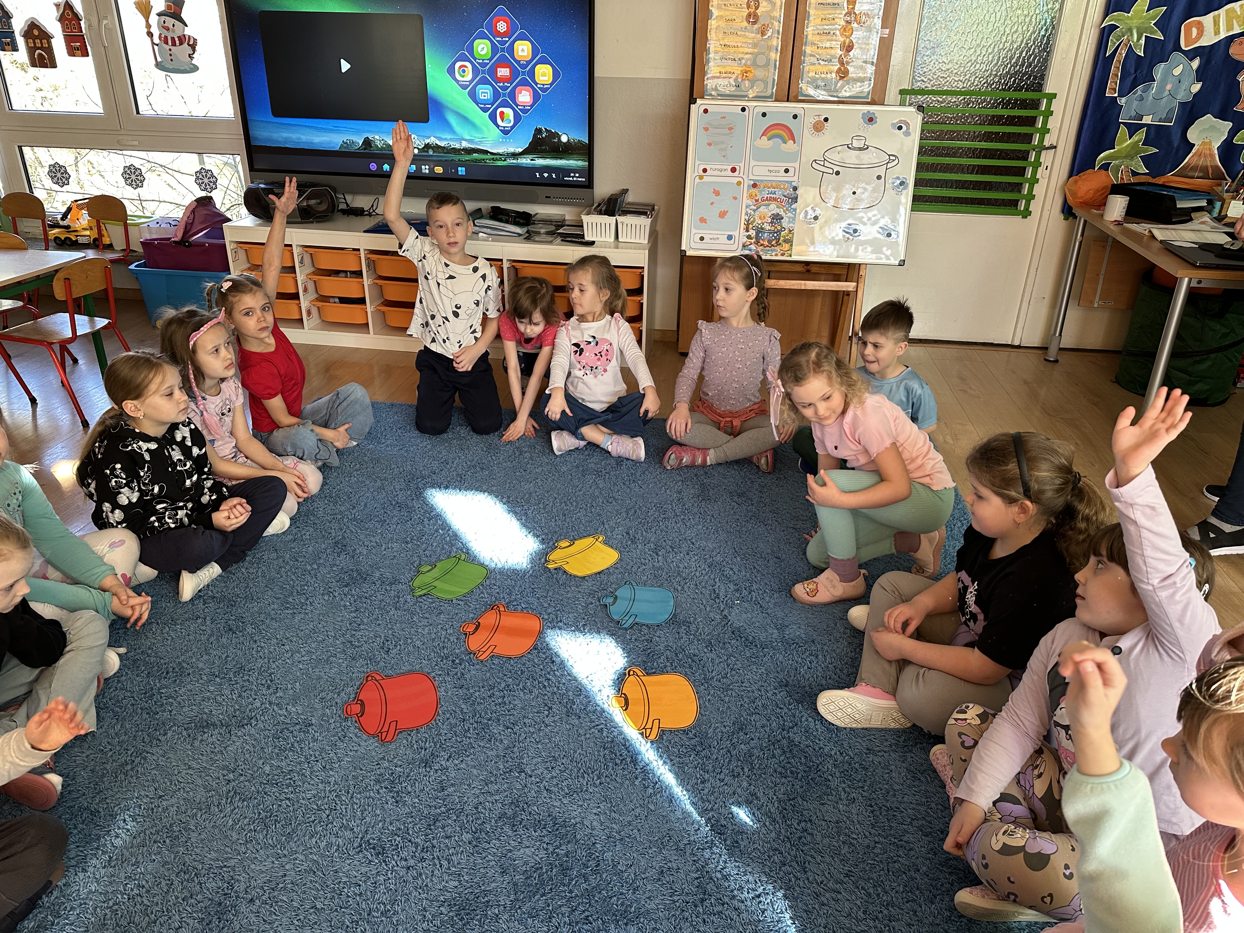 W poniedziałek sześciolatki wyjaśniały, co to jest prognoza pogody. Zastanawiały się, po co ludzie ją oglądają, odczytywały symbole pogodowe i poznały pojęcia związane ze zjawiskami atmosferycznymi. Dodatkowo przedszkolaki zapoznały się z opowiadaniem Marii Pawlisz „W marcu jak w garncu” i omawiały jego treść. Tego dnia dzieci próbowały wyjaśnić własnymi słowami pojęcie ,,nieprzejednana”. Wspólnie dzieliły się pomysłami, jak dbać o swoje zdrowie. Śpiewały i tańczyły do piosenki ,,Mam chusteczkę haftowaną” oraz poznały nowe słowa w języku angielskim: sun „słońce”, rain „deszcz”, wind „wiatr”, storm „burza”, snow „śnieg”, które wykorzystały później do prezentowania pogody w kraju. Co więcej, rysowały płaszcz przeciwdeszczowy i ozdabiały go figurami geometrycznymi zgodnie z instrukcją. Przy stolikach opowiadały, co znajduje się na ilustracjach, samodzielnie lub z pomocą nauczyciela czytały tekst, a także rysowały obrazek, który powinien pasować do przedstawionego kontekstu. Co ciekawe, słuchały utworu literackiego i starały się zapamiętać jak najwięcej szczegółów. We wtorek dzieci poznały przysłowie ,,W marcu, jak w garncu” oraz zapoznały się z literą „g” małą i wielką, drukowaną i pisaną. Rozwijały słuch fonemowy podczas analizy i syntezy głoskowej wyrazu ,,garnek”. Przedszkolaki segregowały różne naczynia kuchenne według cech charakterystycznych, wymieniały nazwy potraw i imion rozpoczynających się głoską g, układały schemat głoskowy z białych kartoników, a także dużą literę „g” z guzików, następnie kreśliły palcem na tacy z kaszą nowo poznaną głoskę. Zdobyte wcześniej umiejętności dzieci wykorzystały podczas zabaw przy stolikach. Wtorkowy dzień sześciolatki zakończyły ćwiczeniami grafomotorycznymi. W środę rozwijały umiejętności logicznego myślenia w trakcie rozwiązywania sudoku. Wysłuchanie wiersza Małgorzaty Strzałkowskiej ,,Wiosenny zawrót głowy” był wprowadzeniem do rozmowy o zwiastunach wiosny. Dodatkowo podczas zabaw ruchowych przypominały sobie nazwy zjawisk atmosferycznych. A w trakcie zabawy „Porządki w szafie” rozwijały umiejętność odczytywania kodu oraz układania przedmiotów w przestrzeni. Przedszkolaki wspólnie odczytywały ceny poszczególnych części garderoby i klasyfikowały, które z nich są tańsze, a które droższe, rozwijały tym samym kompetencje matematyczne. W kolejnej części dnia dzieci brały aktywny udział w zabawie językowej „Szafa pełna ubrań”, w której rozwijały umiejętność czytania i pisania, tj. odczytywały samodzielnie podpisy i próbowały samodzielnie napisać nazwy ubrań na kartce. W czwartek sześciolatki rozwijały wiedzę o oznakach wiosny, usłyszały wiersz Władysława Broniewskiego pt. „Pierwiosnek”. Dodatkowo poznały wszystkie wiosenne kwiaty. Podczas zabawy „Ptaki wracają z ciepłych krajów” poszerzały wiedzę przyrodniczą o ptakach zimujących w Polsce oraz wracających z ciepłych krajów, utrwalały przy okazji nazwy kontynentów i wskazywały je na mapie. W kolejnej części dnia zapoznały się