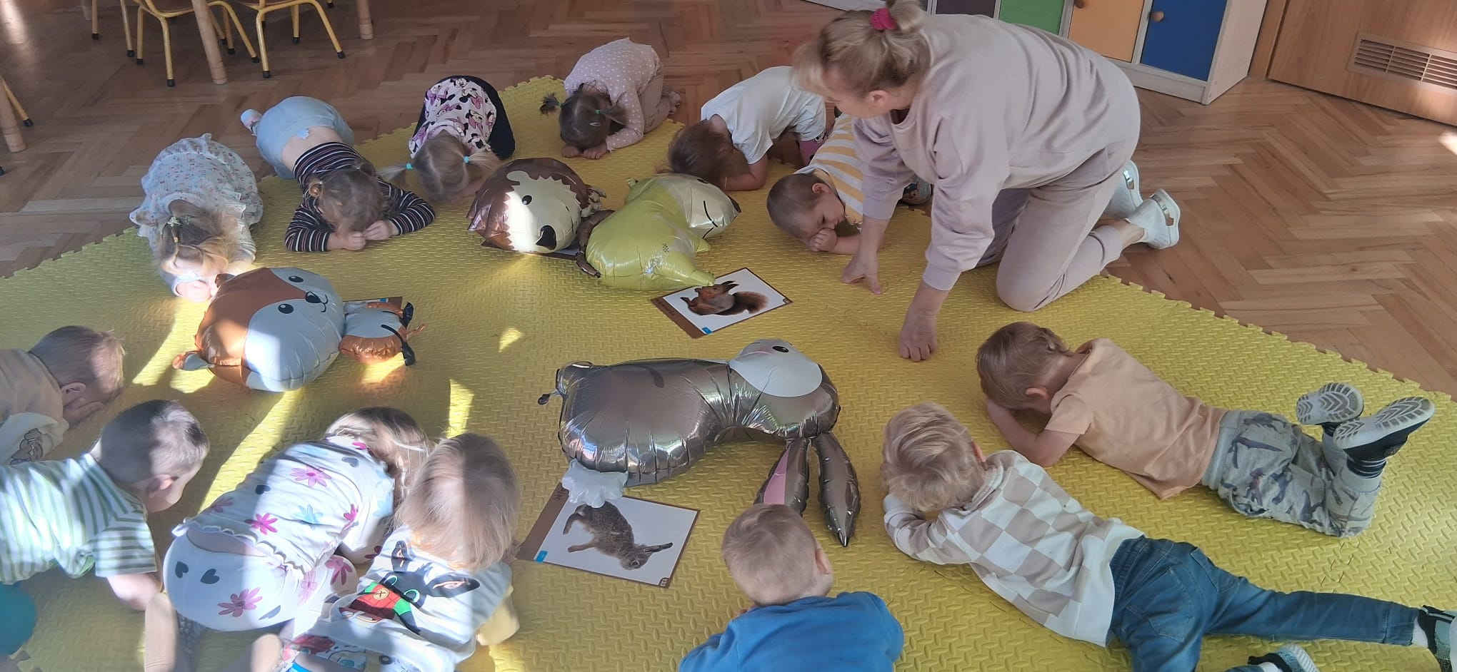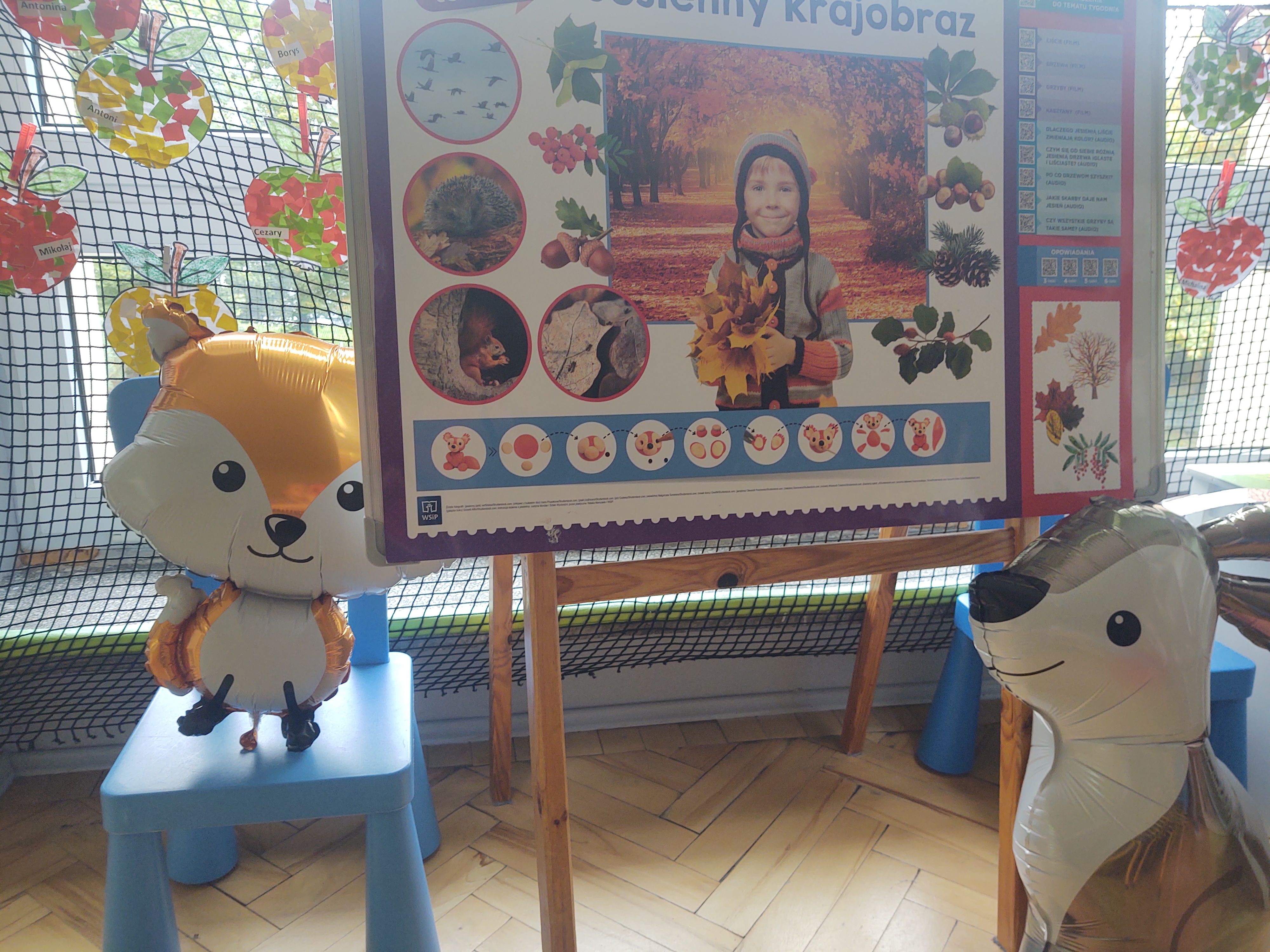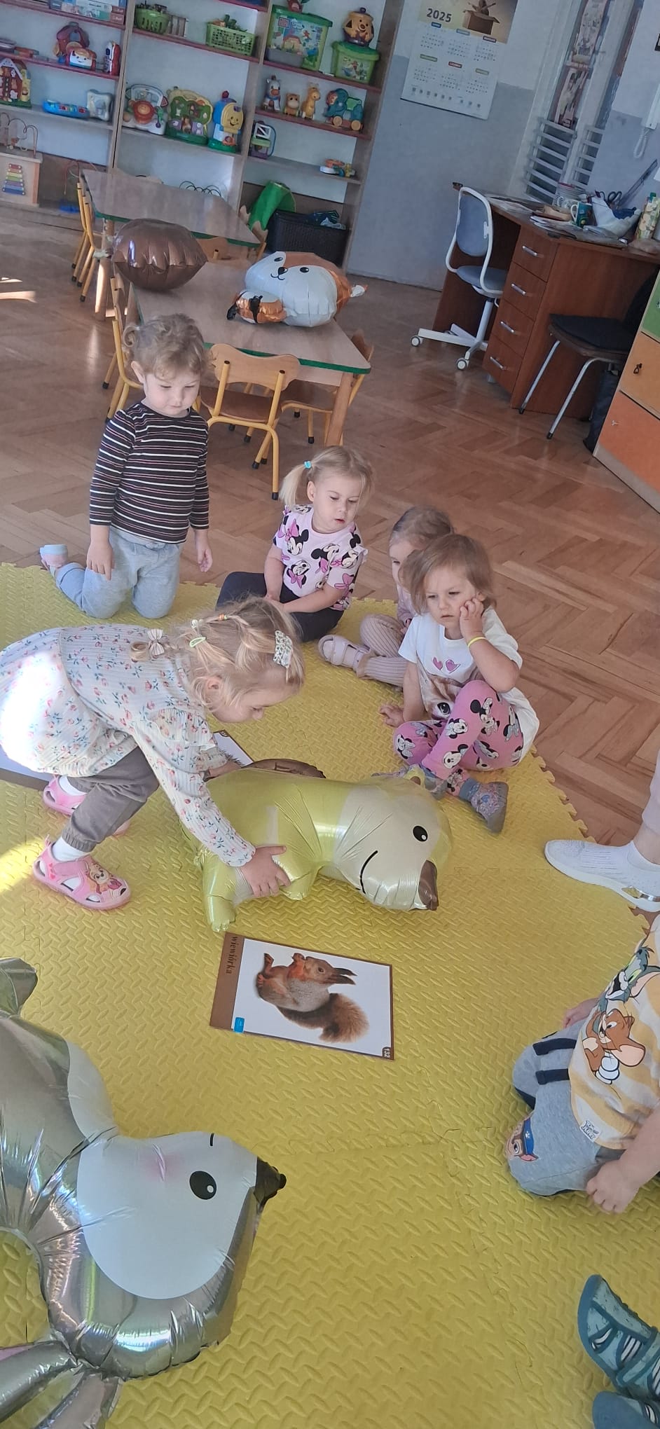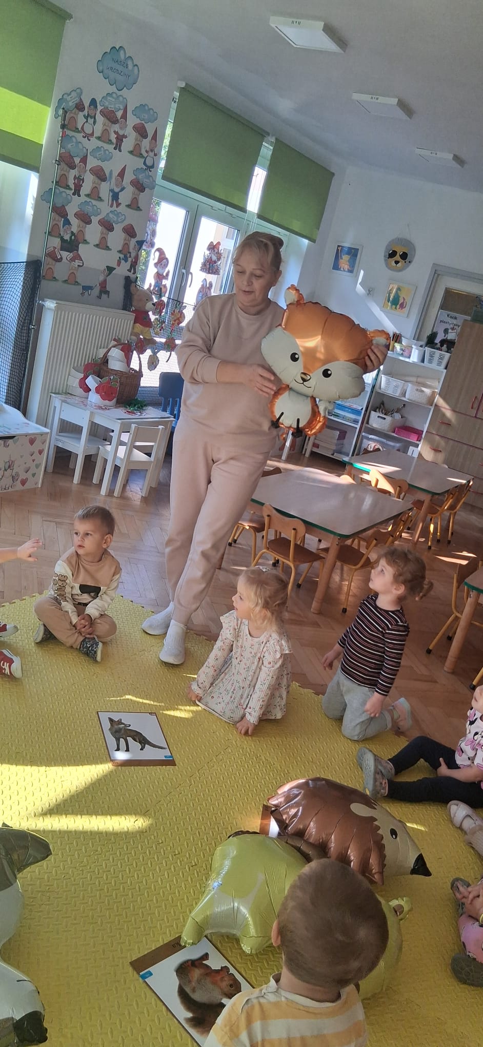 Za nami kolejny jesienny tydzień poświęcony przyrodzie. Tym razem rozmawialiśmy o zwierzętach mieszkających w lasach i parkach – dzieci zdobyły wiedzę na temat środowiska życia jeży, poznały ciekawostki na temat wyglądu, życia i odżywiania się dzików, słuchały ich głosów, oglądały ilustracje przedstawiające sarnę, wiewiórkę, lisa, jelenia, niedźwiedzia, wilka. Cały tydzień towarzyszyła nam wesoła piosenka „Kto mieszka w lesie”, której tekst dzieci ilustrowały ruchem.
