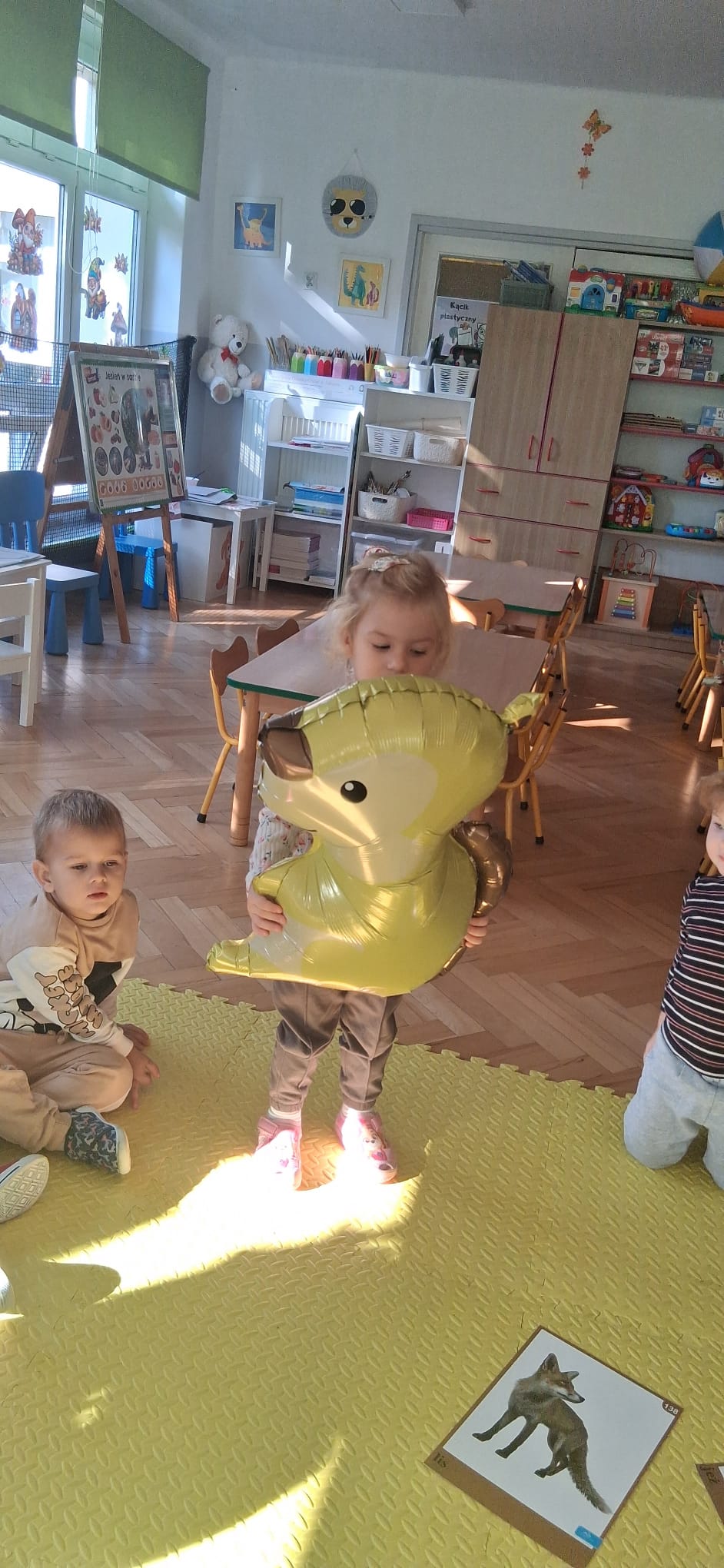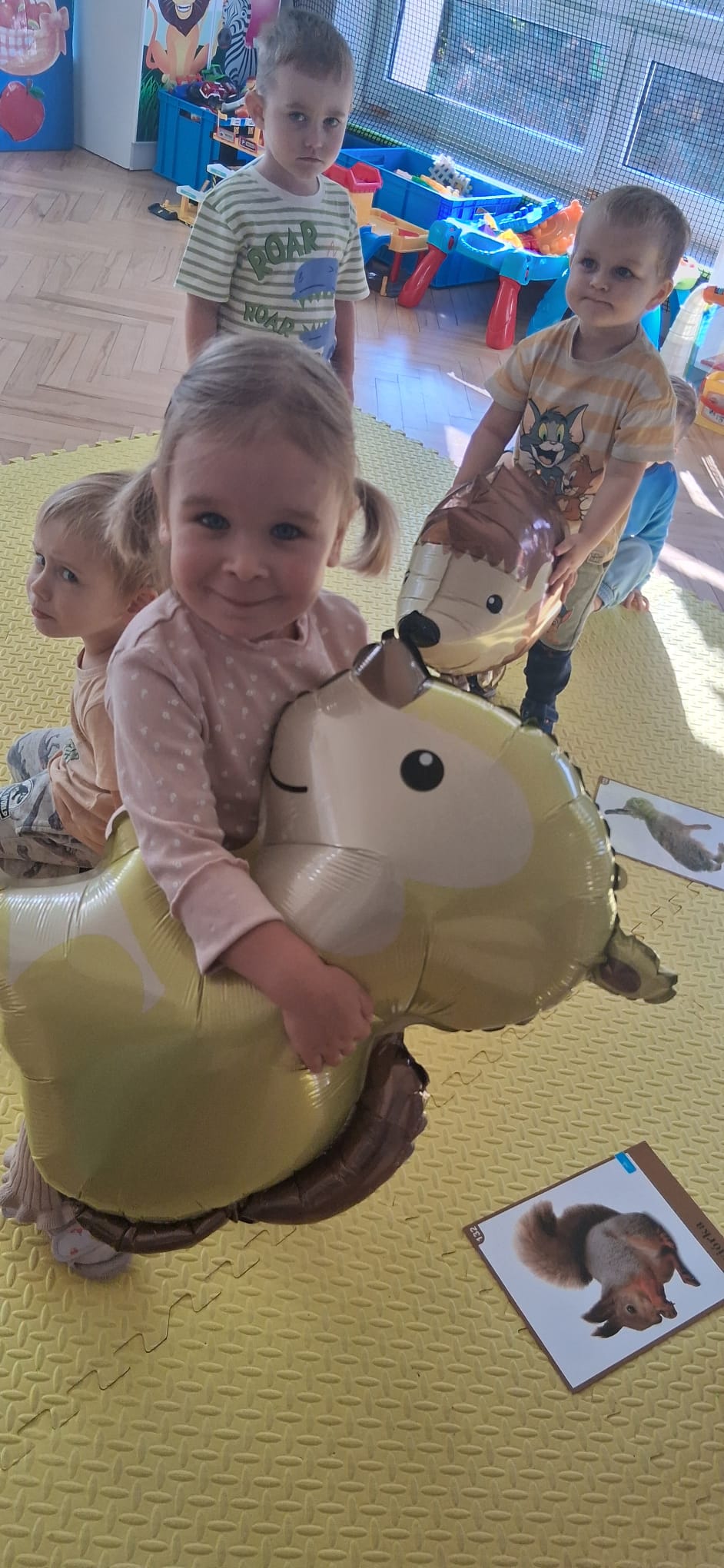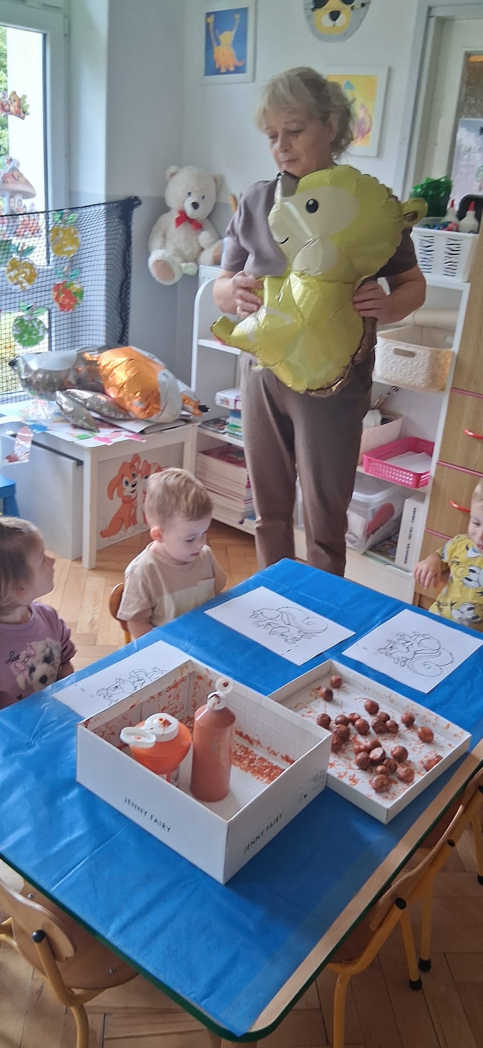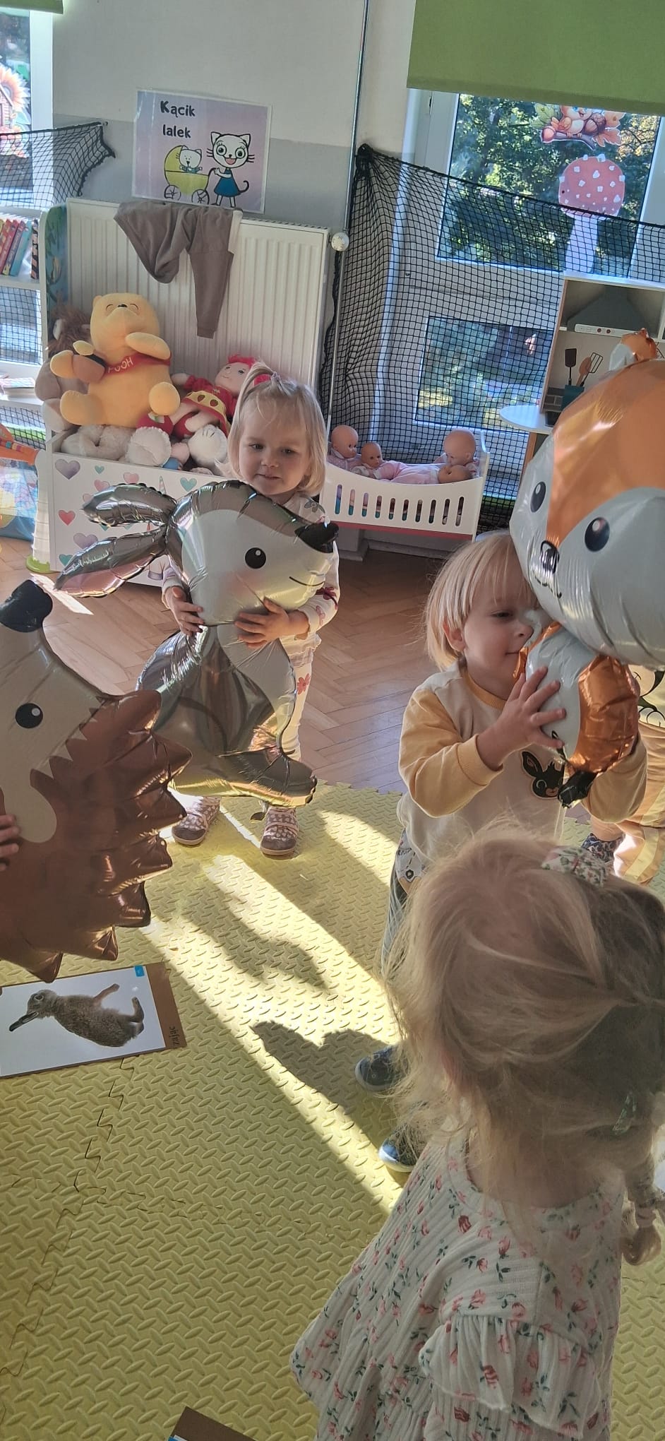 Za nami kolejny jesienny tydzień poświęcony przyrodzie. Tym razem rozmawialiśmy o zwierzętach mieszkających w lasach i parkach – dzieci zdobyły wiedzę na temat środowiska życia jeży, poznały ciekawostki na temat wyglądu, życia i odżywiania się dzików, słuchały ich głosów, oglądały ilustracje przedstawiające sarnę, wiewiórkę, lisa, jelenia, niedźwiedzia, wilka. Cały tydzień towarzyszyła nam wesoła piosenka „Kto mieszka w lesie”, której tekst dzieci ilustrowały ruchem.
