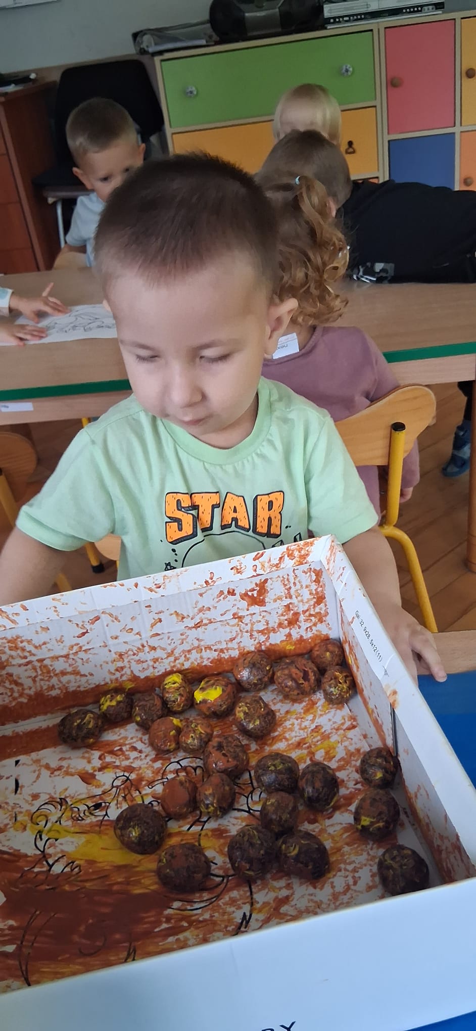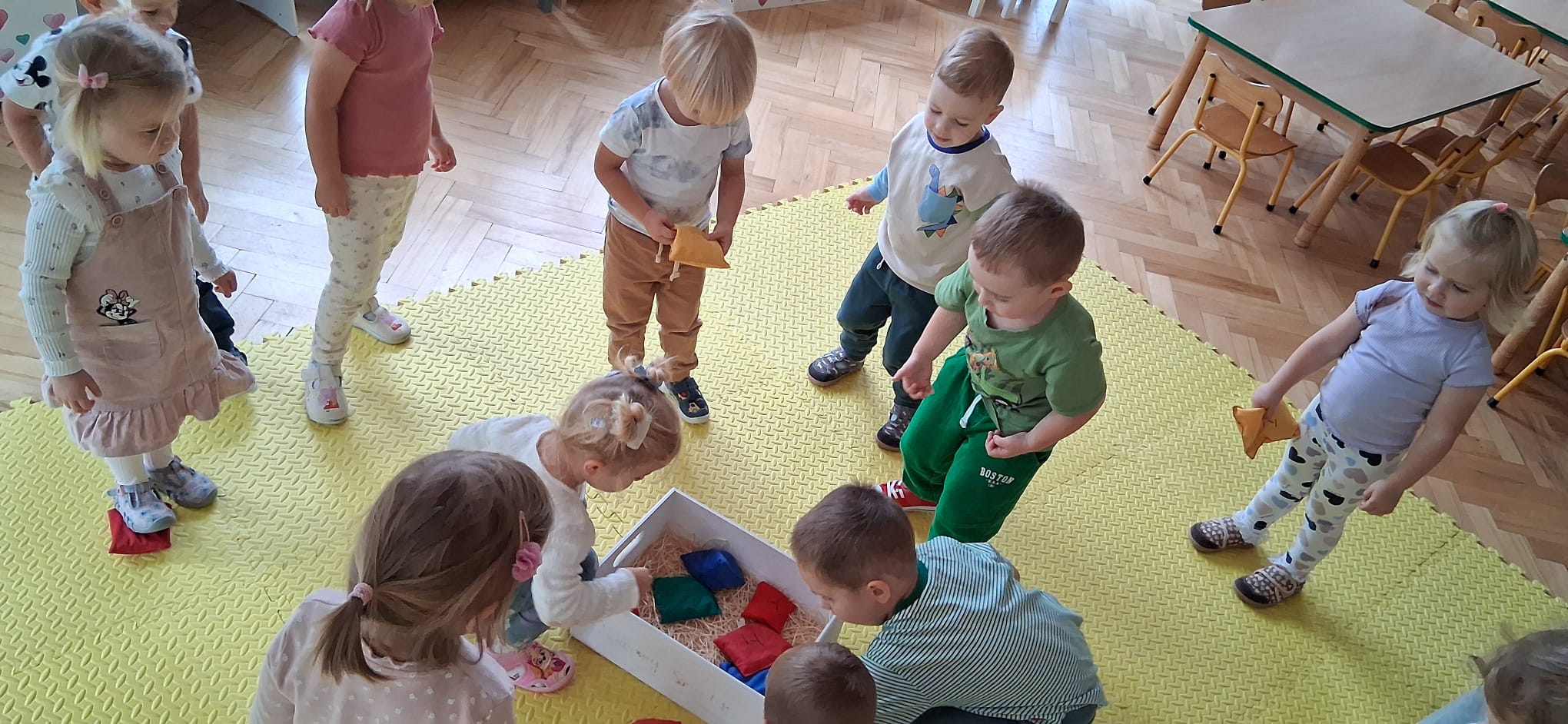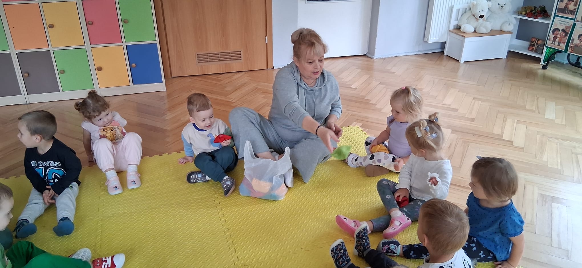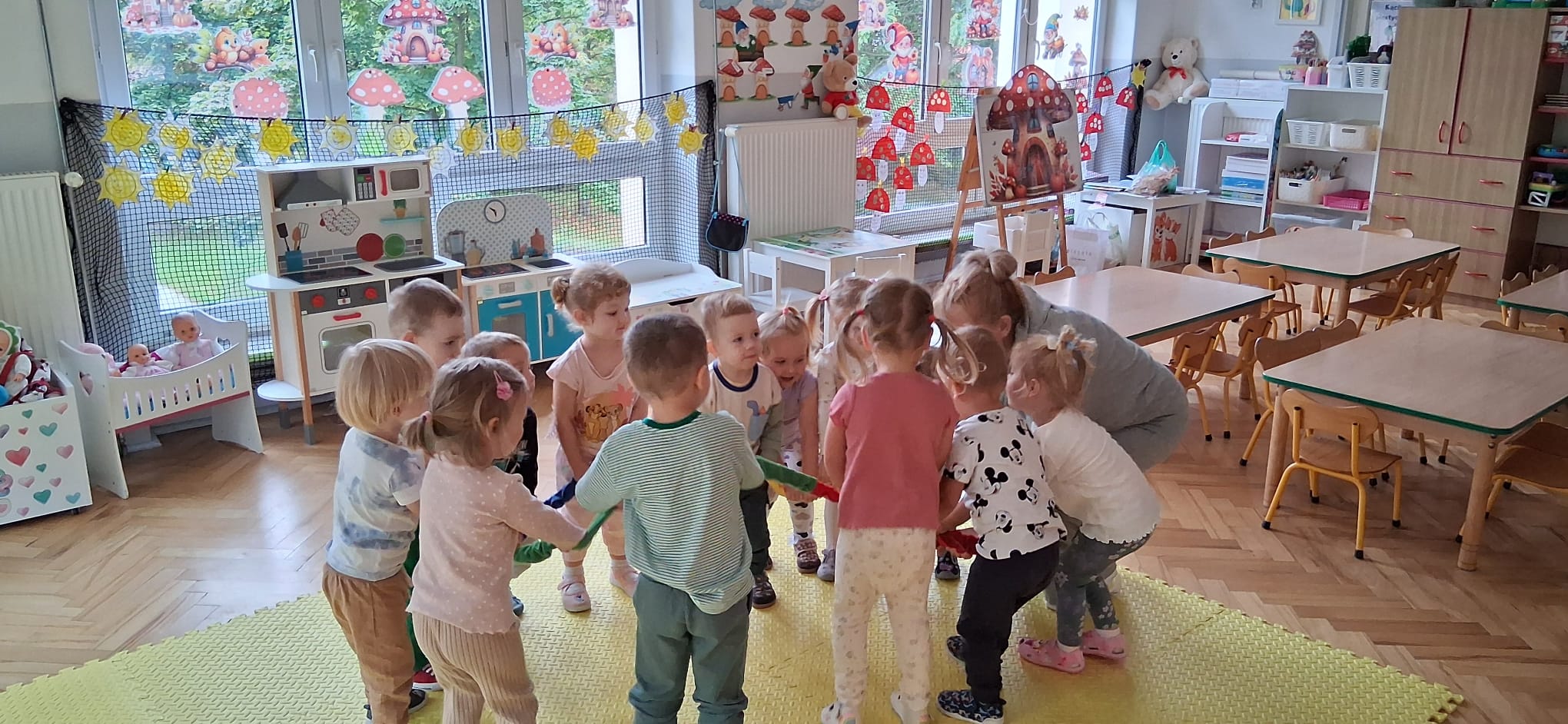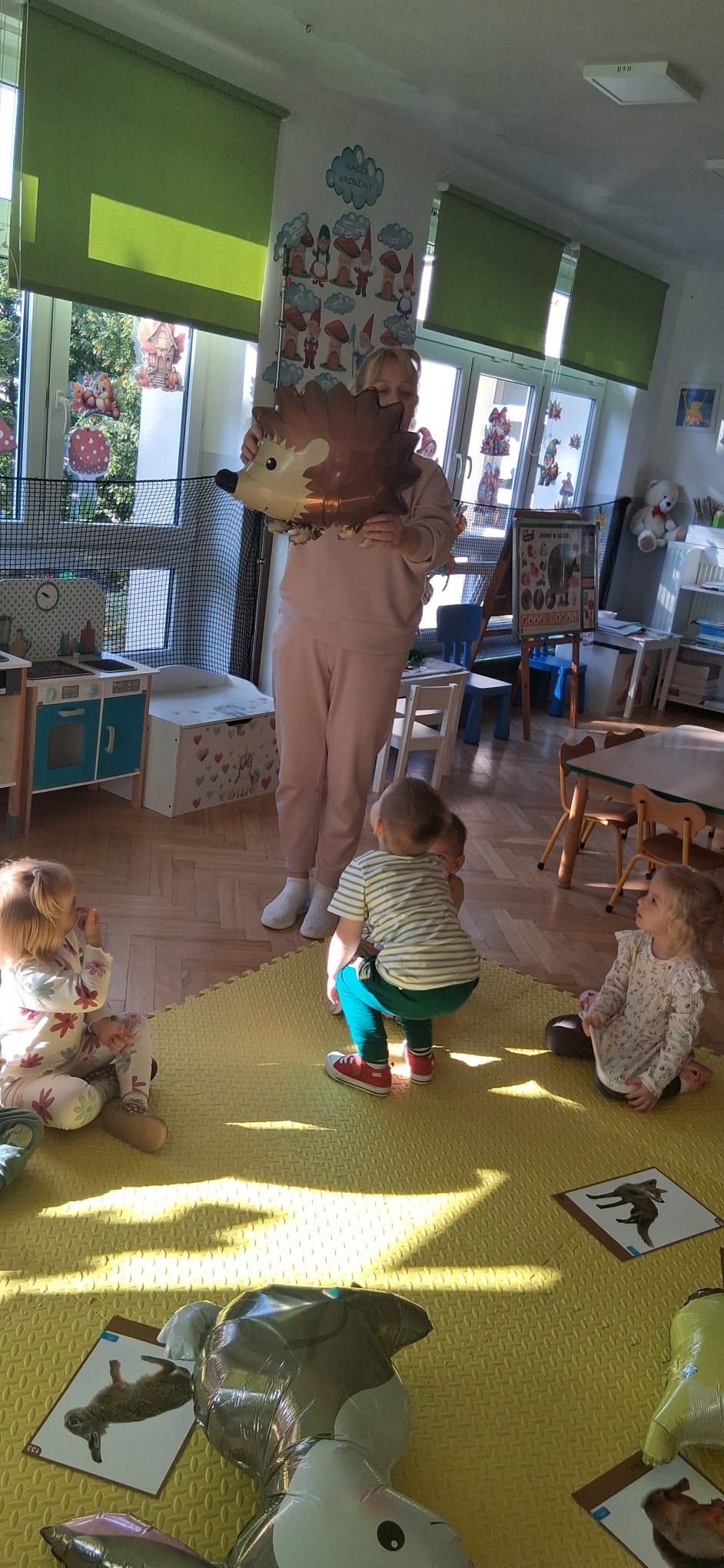 Nowy tydzień rozpoczęliśmy od opowiadania Wojciecha Widłaka „Spotkanie” z książki „Pan Kuleczka” i rozmowy na temat jeży – tego, jak wyglądają, gdzie lubią się chować, co jedzą. Dzieci poszerzały swoją wiedzę przyrodniczą podczas zabawy klasyfikacyjnej „Kto mieszka w naszym lesie?”, zabawy ruchowej „Jeże pod liśćmi”, zagadek obrazkowych „Kto ukrył się w liściach?”, zdobywały umiejętności matematyczne (zabawa „Ile nóg mają te zwierzęta?’, „W którym stosiku liści zagrzebał się jeż?’, „Ile zwierząt jest przy paśniku?”), uczyły się rymowanek „Jesień, jesień” oraz „Berek z Panią Jesienią”.