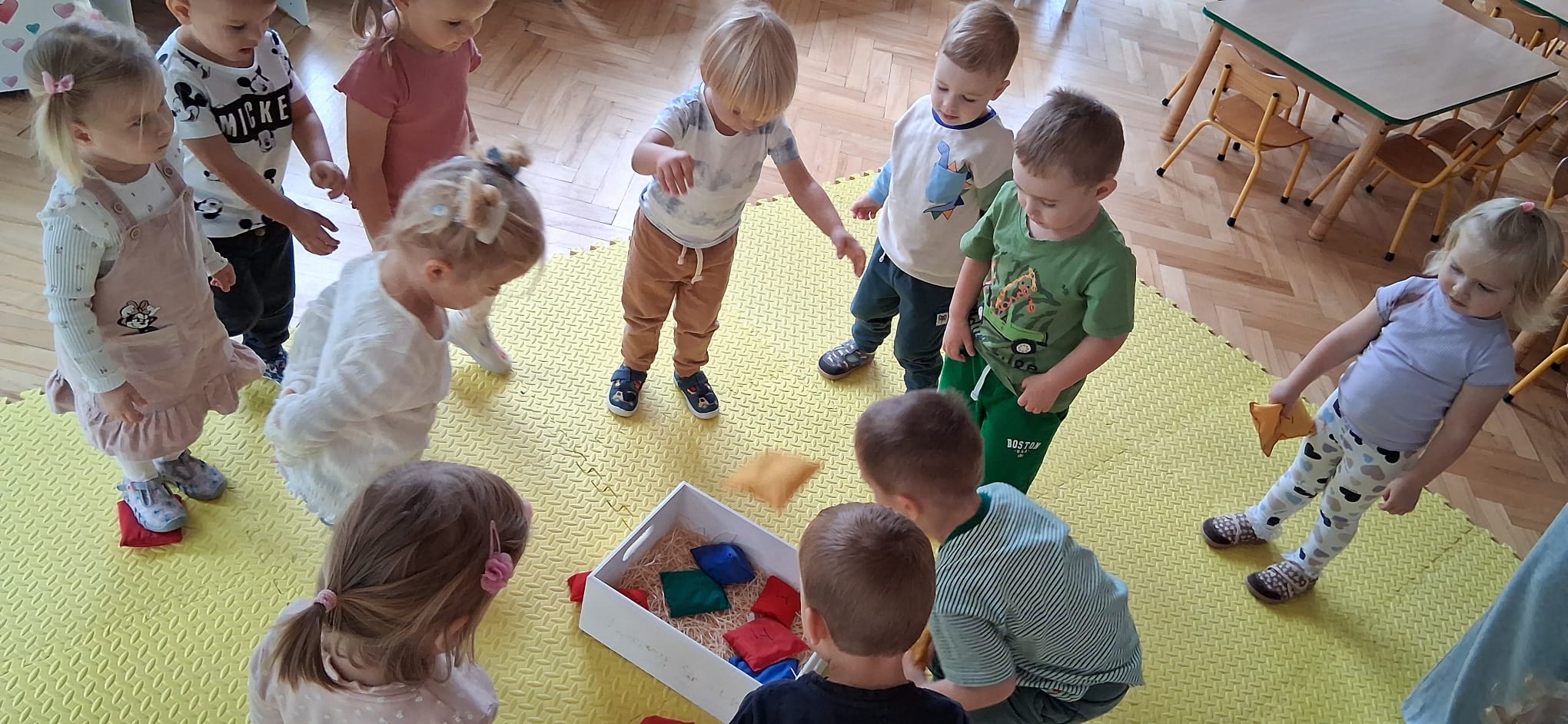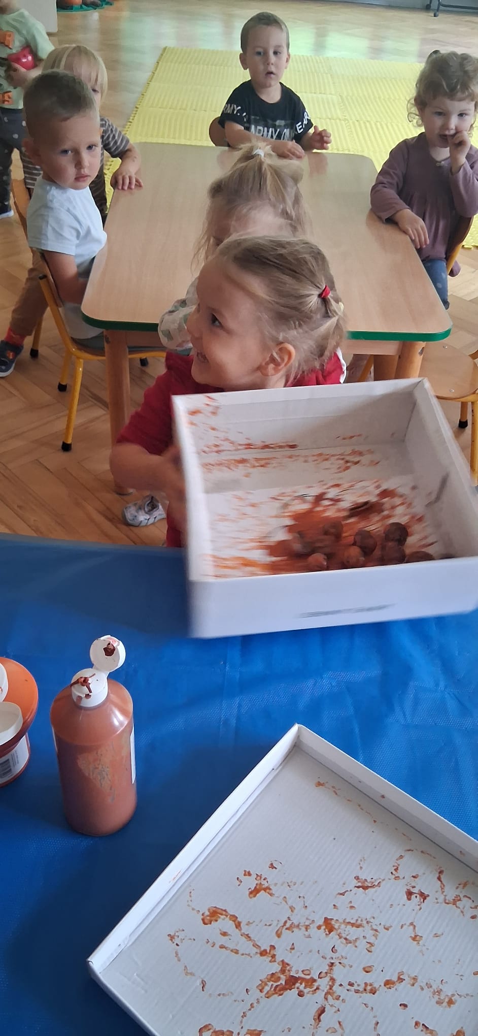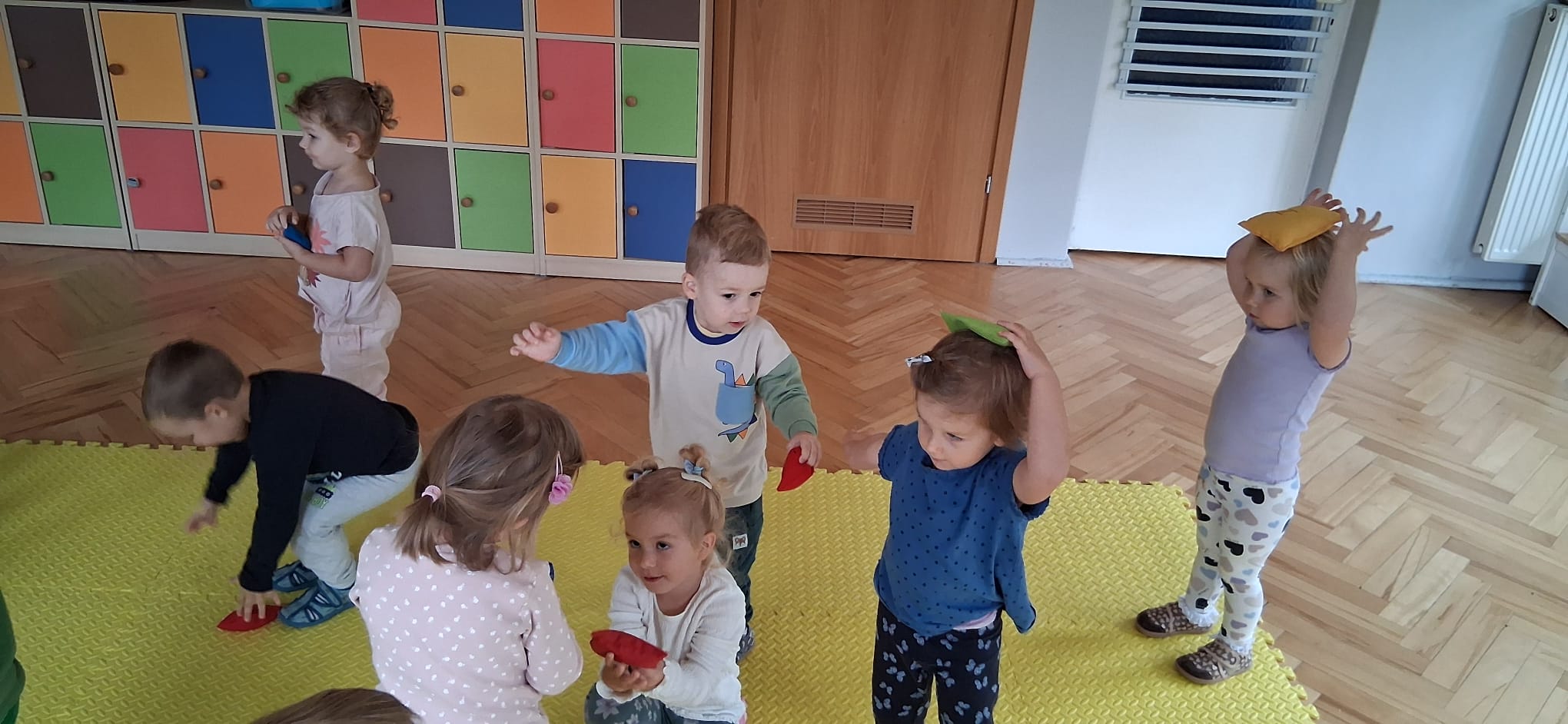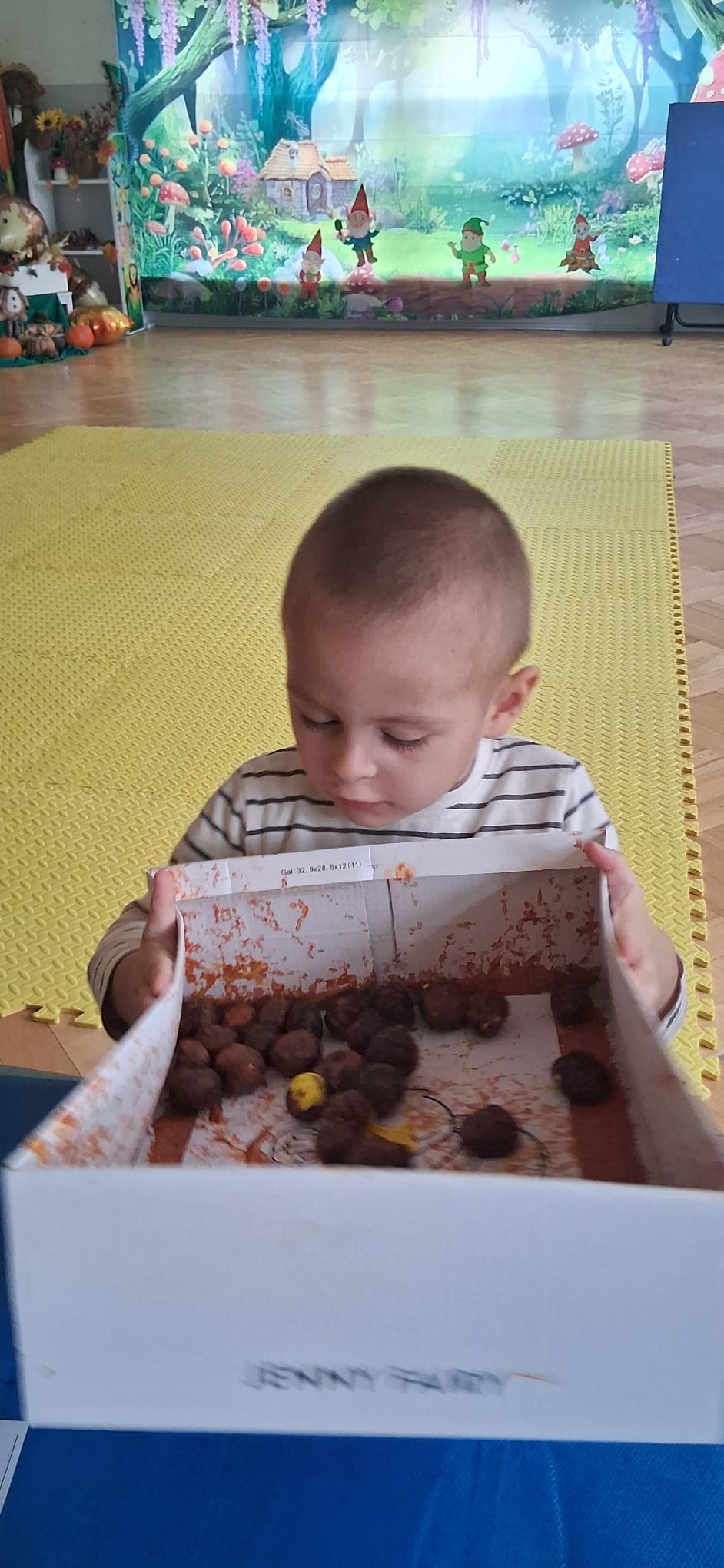 Nowy tydzień rozpoczęliśmy od opowiadania Wojciecha Widłaka „Spotkanie” z książki „Pan Kuleczka” i rozmowy na temat jeży – tego, jak wyglądają, gdzie lubią się chować, co jedzą. Dzieci poszerzały swoją wiedzę przyrodniczą podczas zabawy klasyfikacyjnej „Kto mieszka w naszym lesie?”, zabawy ruchowej „Jeże pod liśćmi”, zagadek obrazkowych „Kto ukrył się w liściach?”, zdobywały umiejętności matematyczne (zabawa „Ile nóg mają te zwierzęta?’, „W którym stosiku liści zagrzebał się jeż?’, „Ile zwierząt jest przy paśniku?”), uczyły się rymowanek „Jesień, jesień” oraz „Berek z Panią Jesienią”.