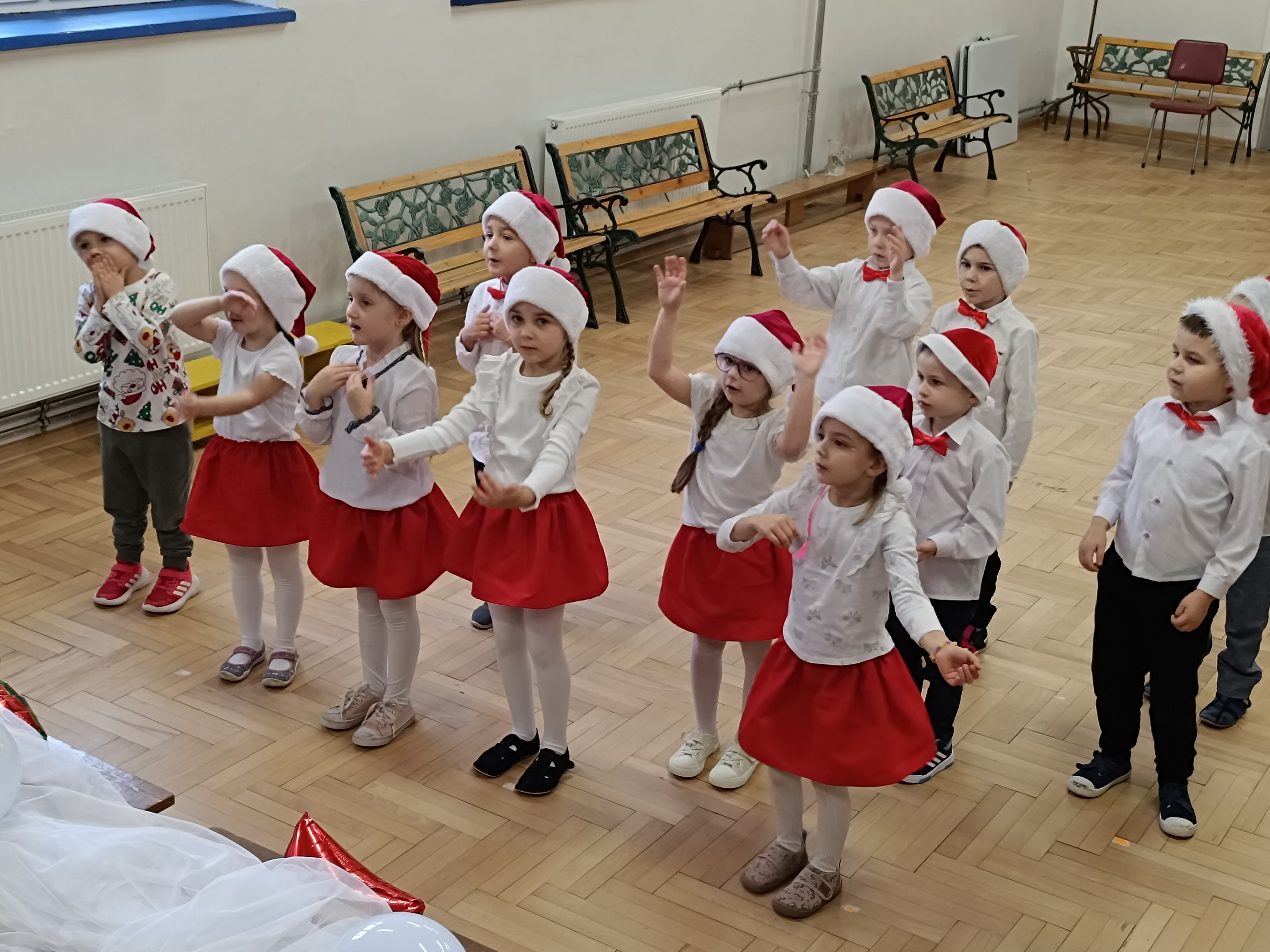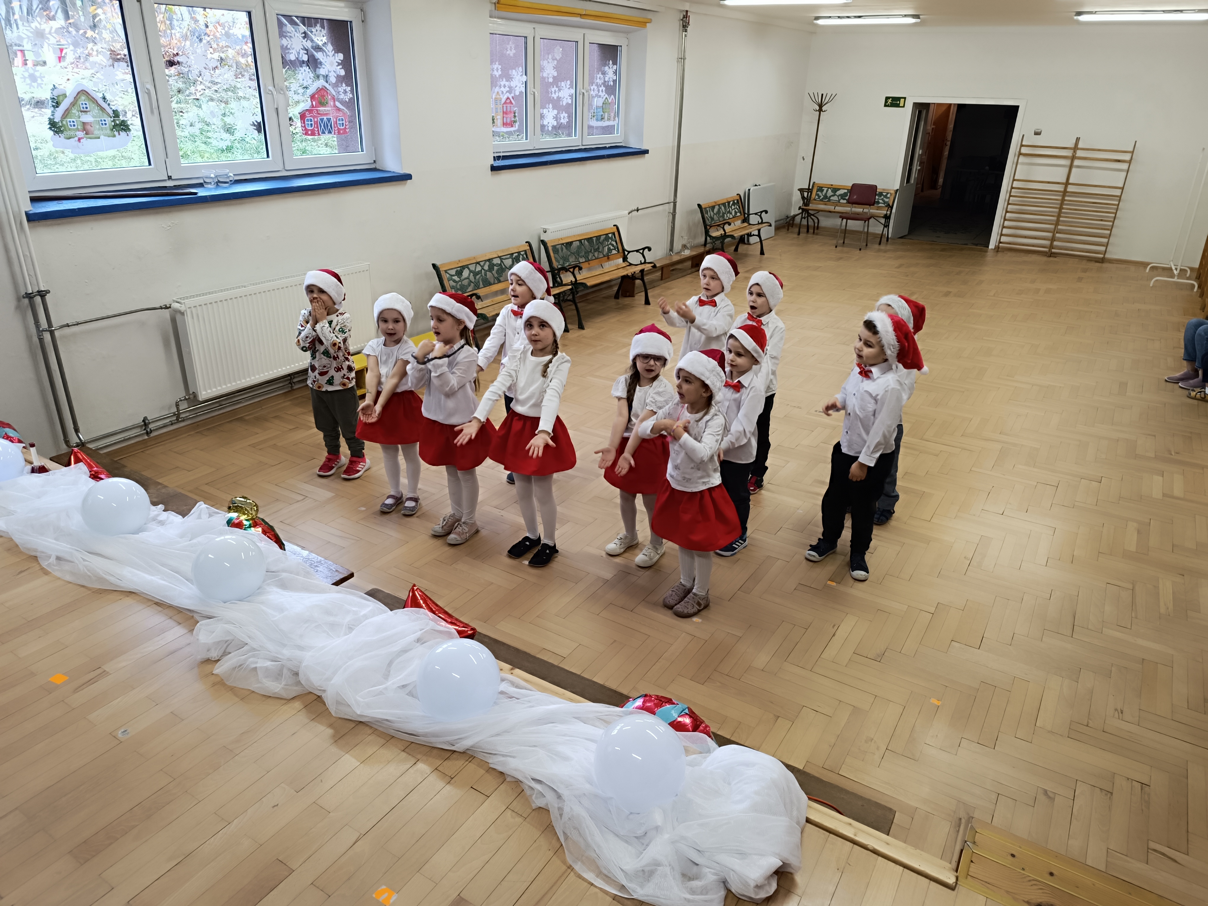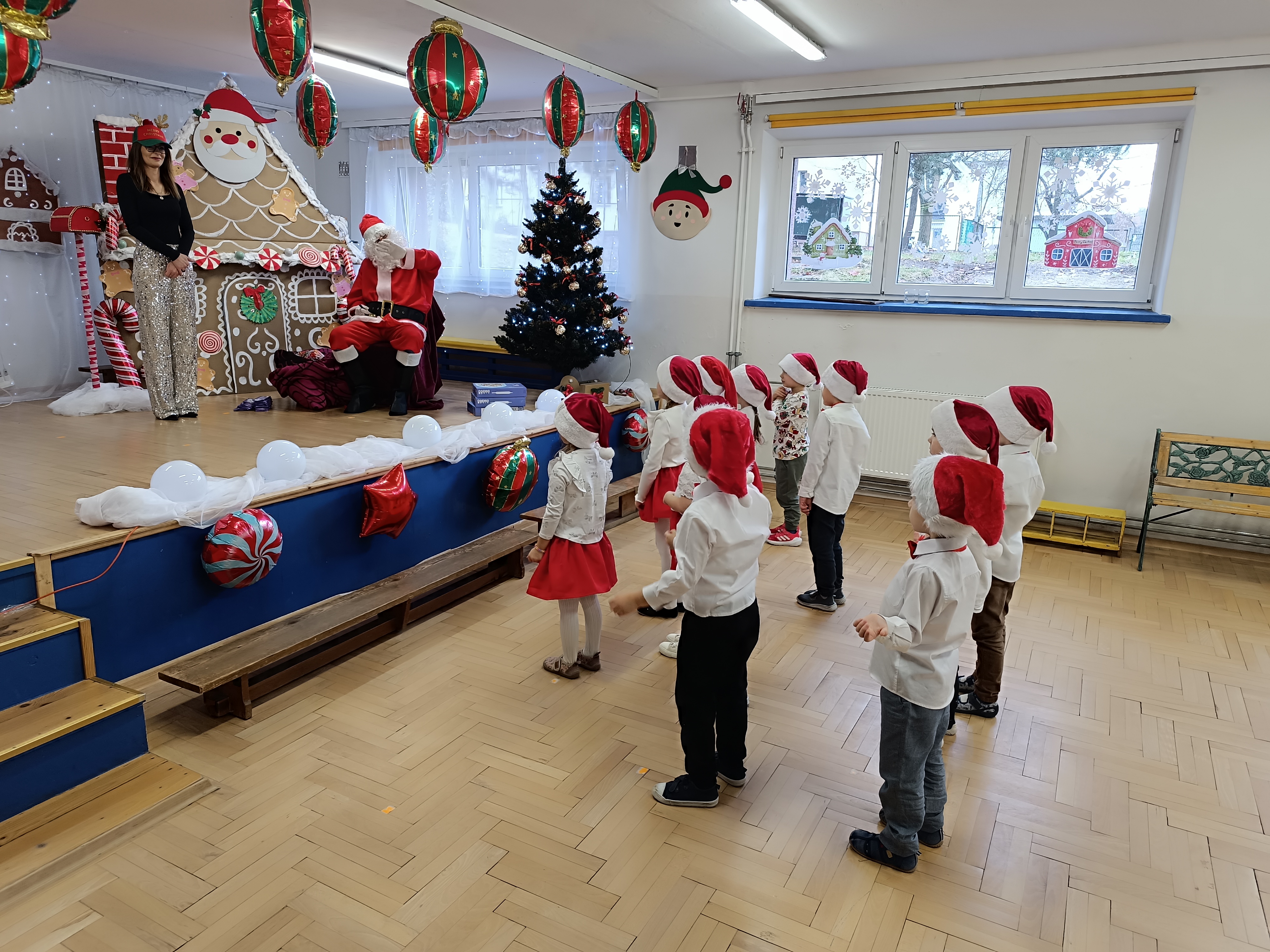 Smerfy wystąpiły przed Mikołajem z przygotowaną wcześniej przez nich piosenką wraz z pokazywaniem " Czerwona czapkę na głowie swojej nosi".