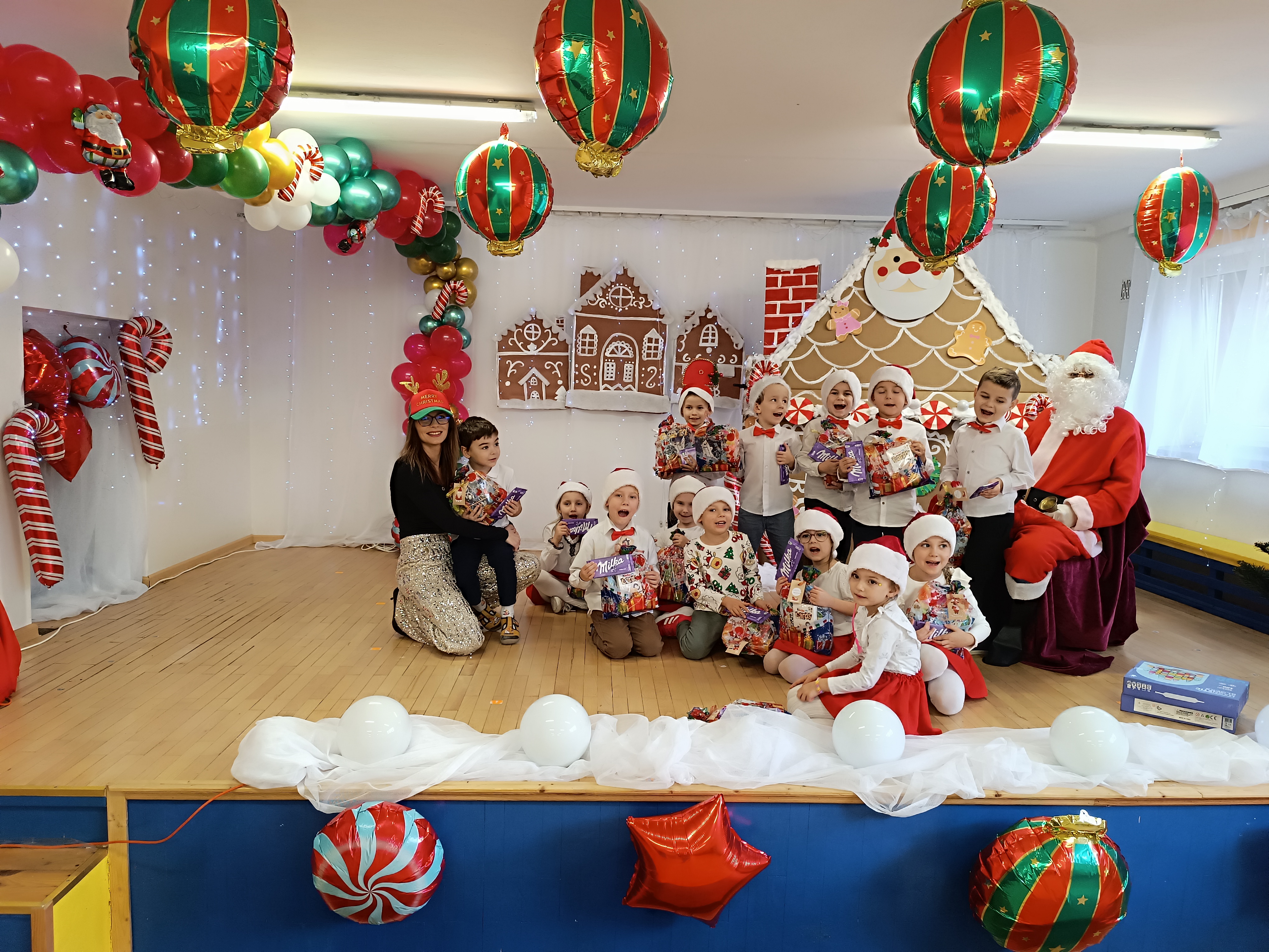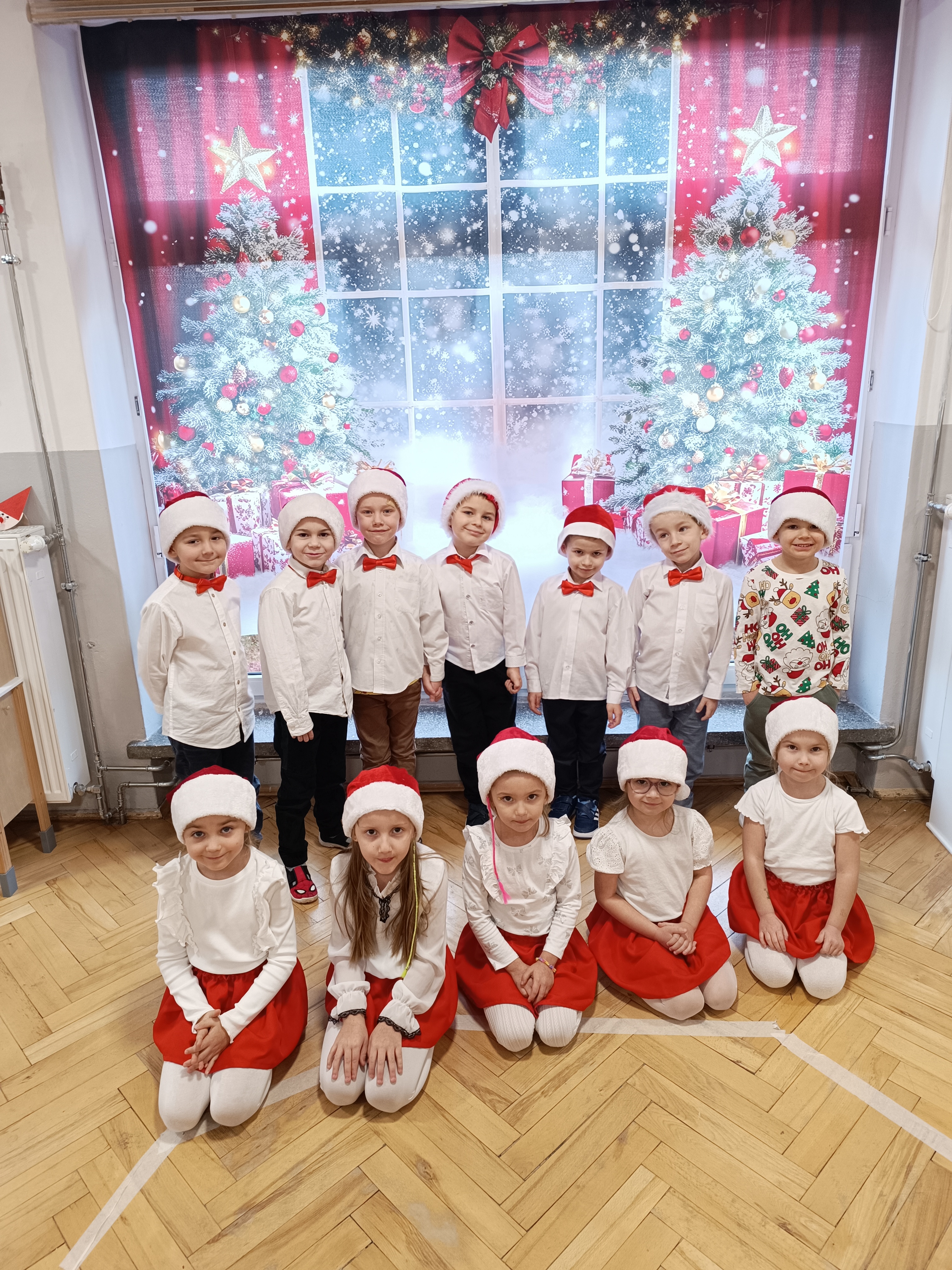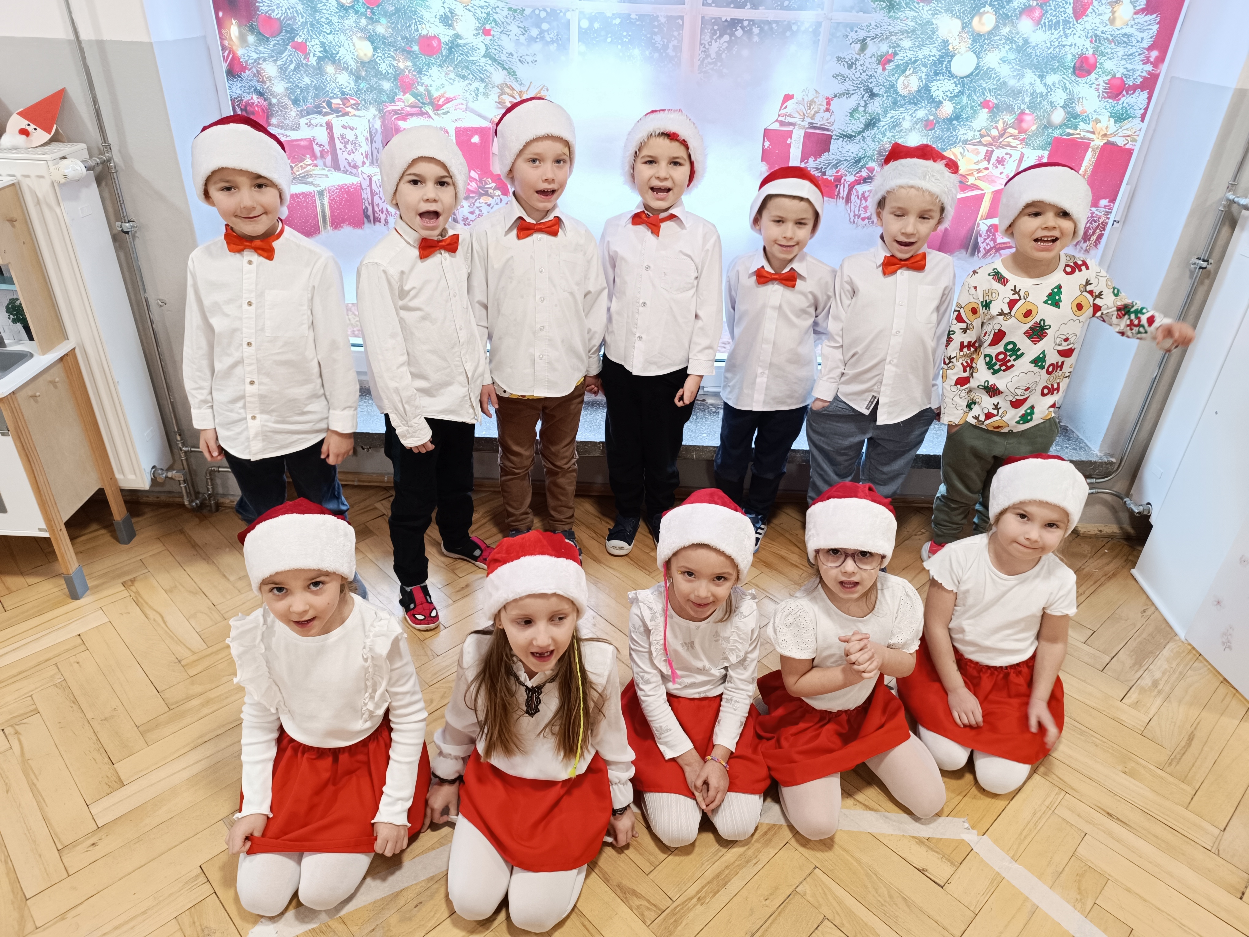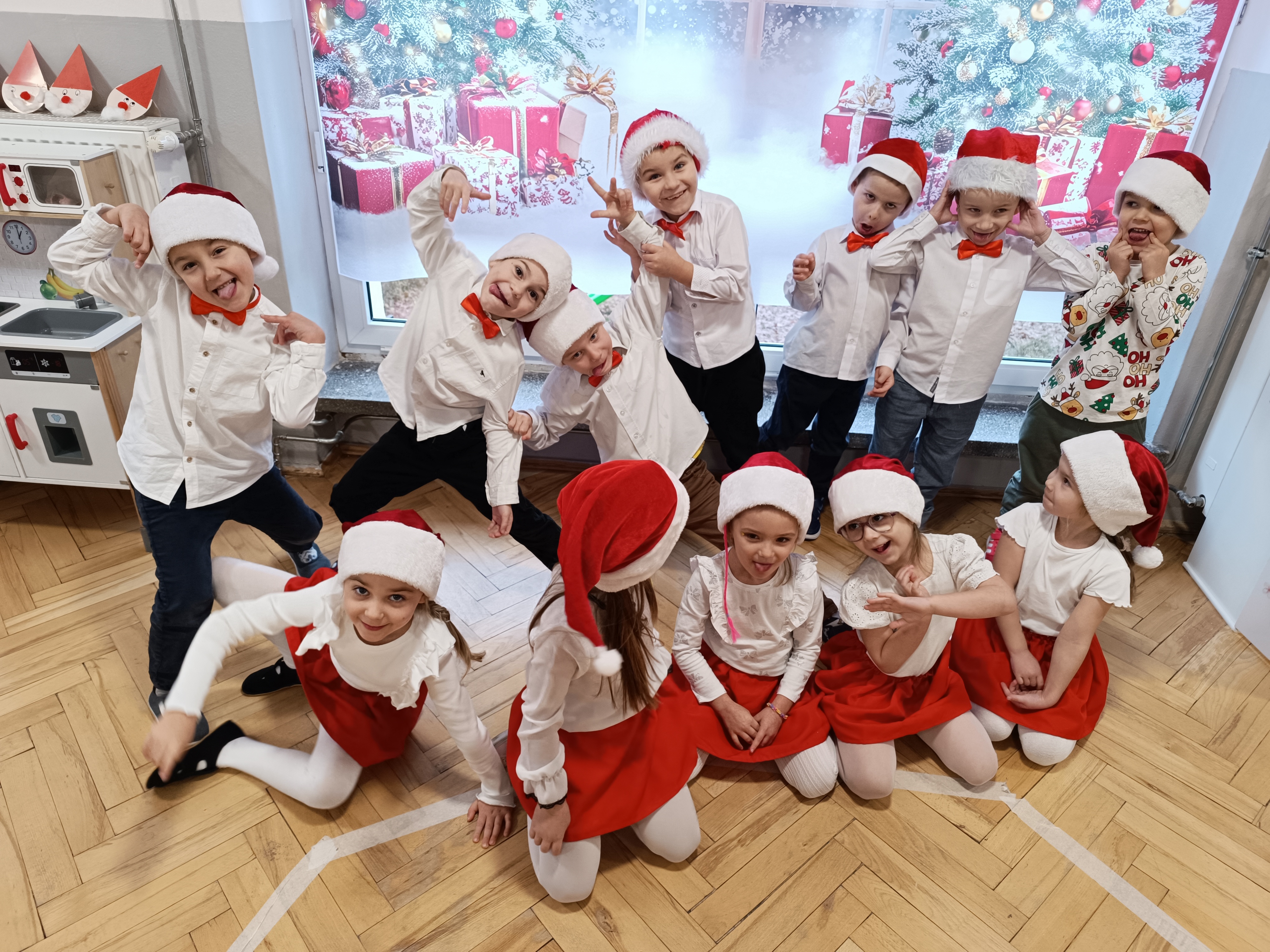 Smerfy wystąpiły przed Mikołajem z przygotowaną wcześniej przez nich piosenką wraz z pokazywaniem " Czerwona czapkę na głowie swojej nosi".
