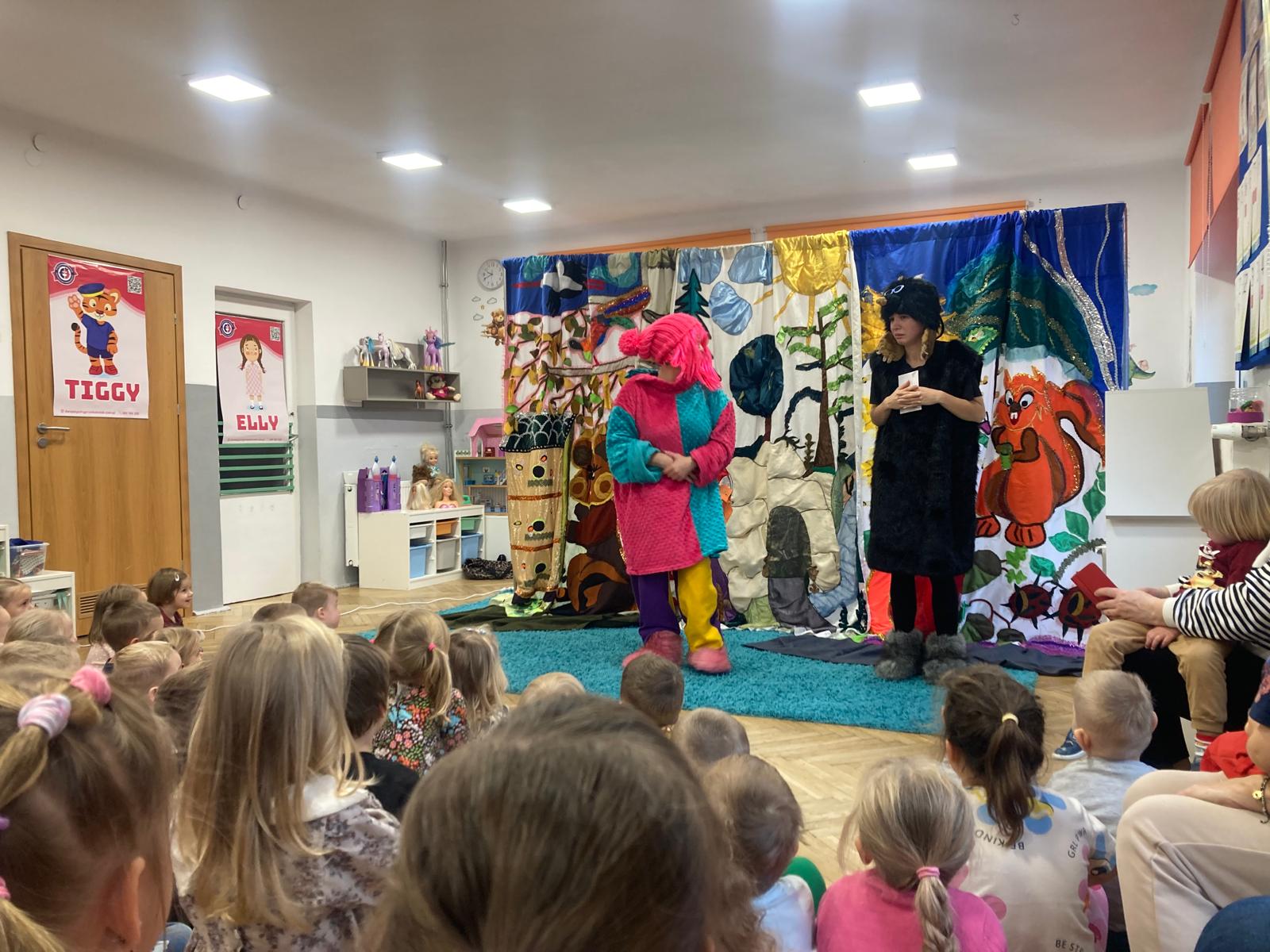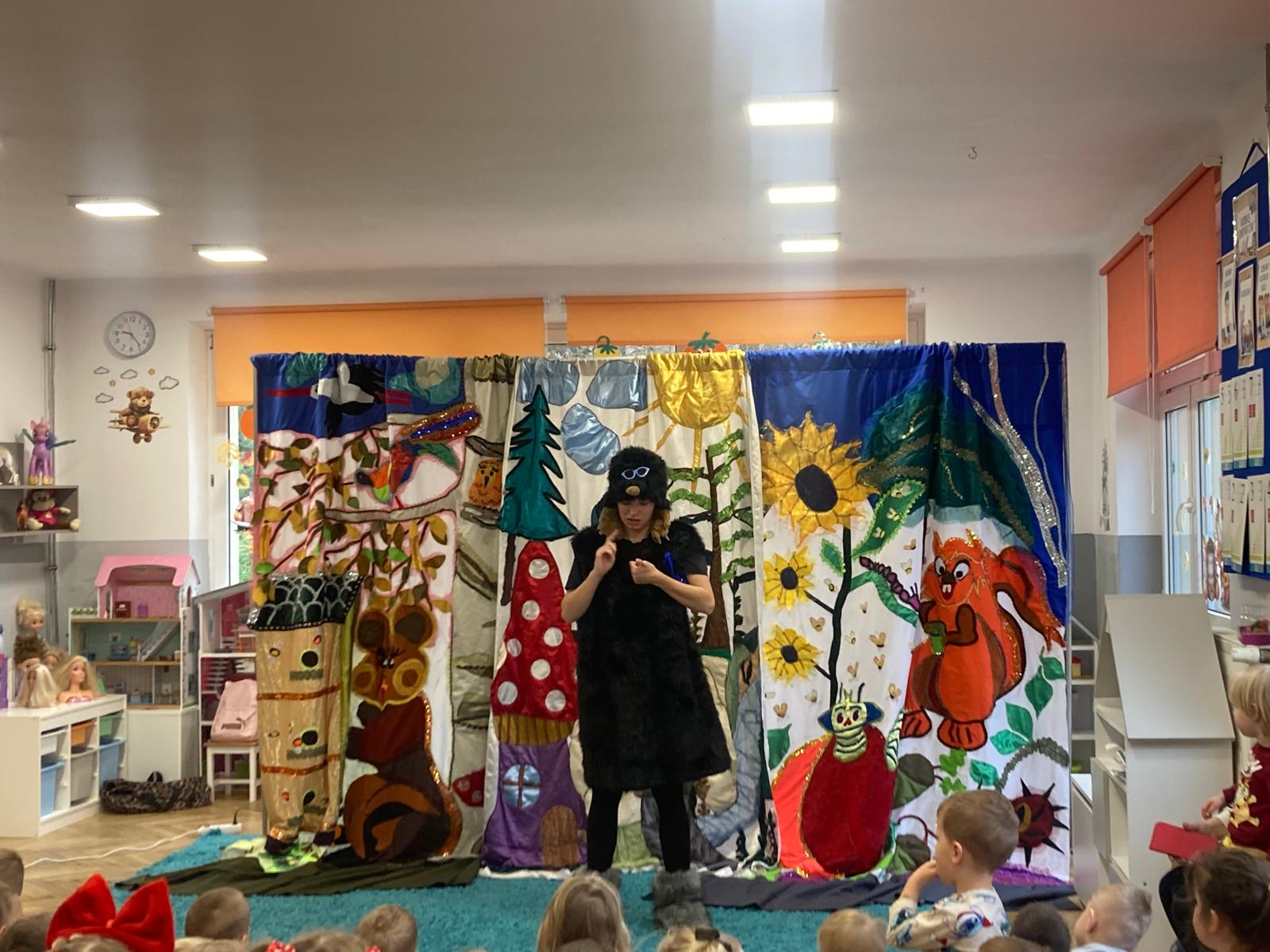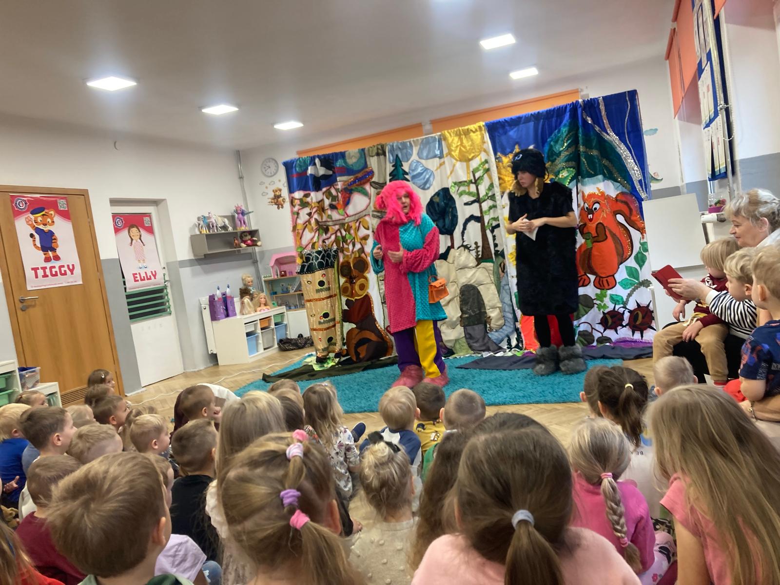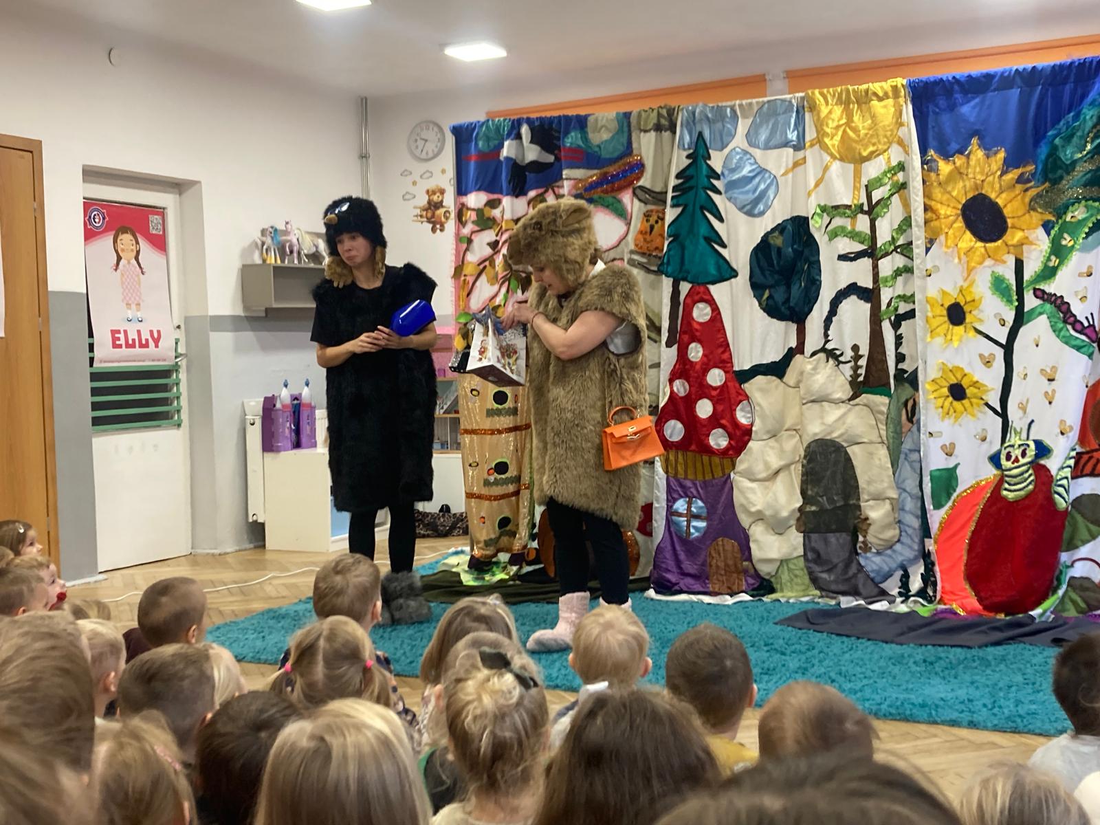 Dzieciaki obejrzały bajeczkę o bardzo edukacyjnym wymiarze.O tym jak nie należy się zachowywać wobec innych w sposób bardzo obrazowy przedstawili aktorzy wcielajac się w role zwierząt z leśnej polany,sarenki ,krecika.Dzieci zaangażowane emocjonalnie w wydarzenia na polanie potrafily doskonale ocenić zachowanie bohaterów te dobre i te złe.Zgodnie wybrały te, które należy naśladować