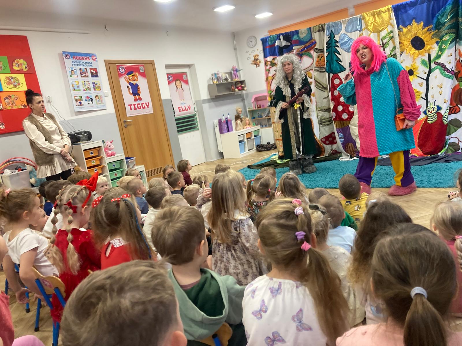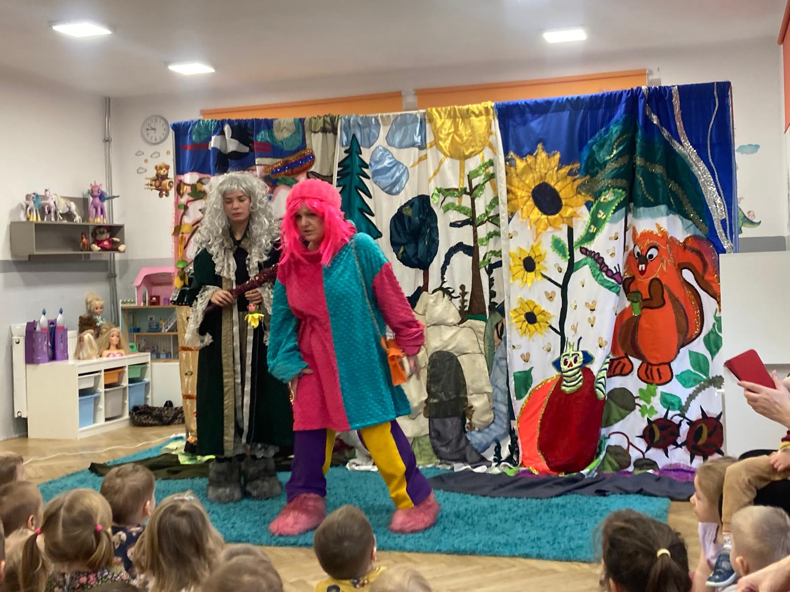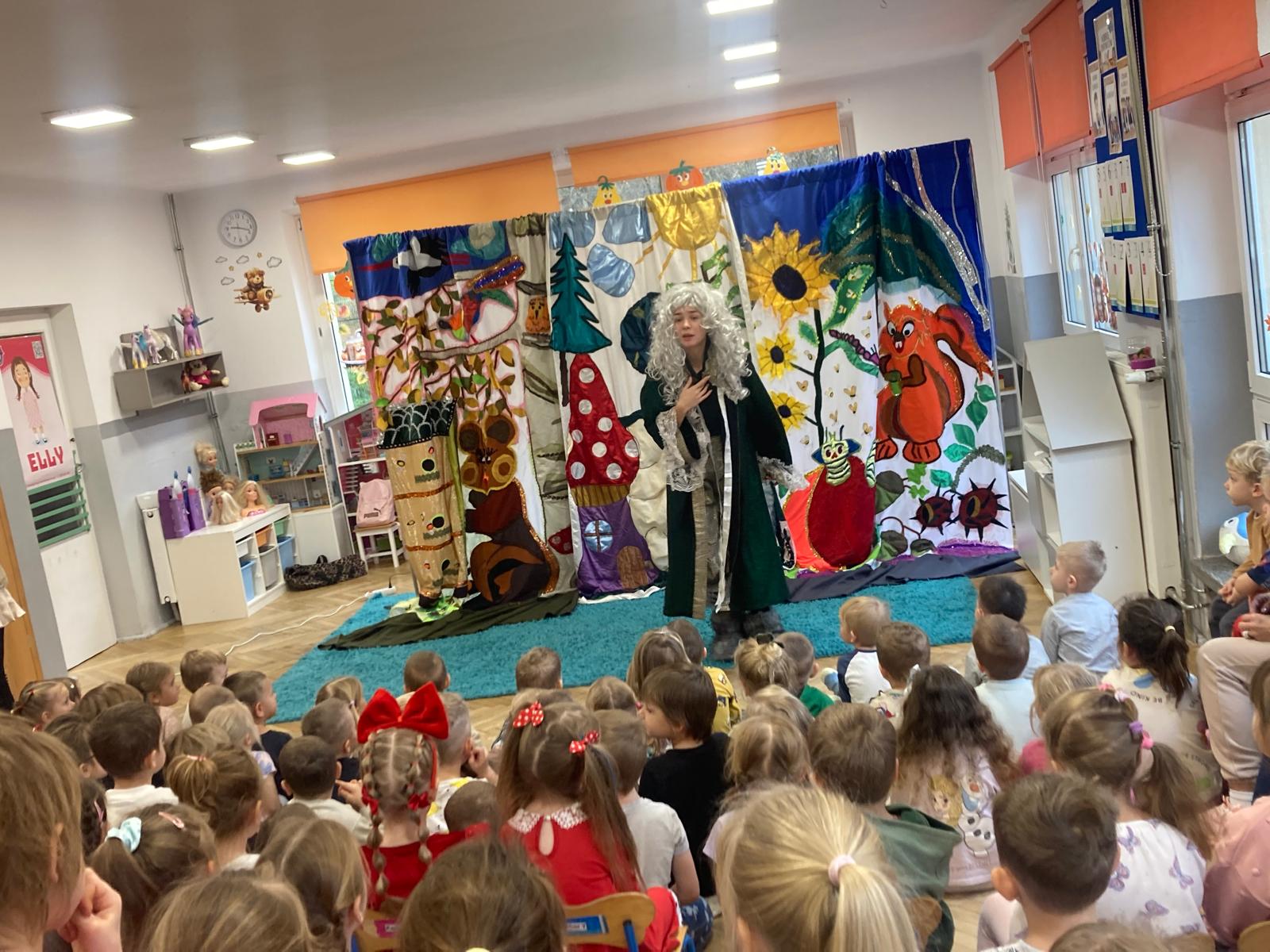 Dzieciaki obejrzały bajeczkę o bardzo edukacyjnym wymiarze.O tym jak nie należy się zachowywać wobec innych w sposób bardzo obrazowy przedstawili aktorzy wcielajac się w role zwierząt z leśnej polany,sarenki ,krecika.Dzieci zaangażowane emocjonalnie w wydarzenia na polanie potrafily doskonale ocenić zachowanie bohaterów te dobre i te złe.Zgodnie wybrały te, które należy naśladować
