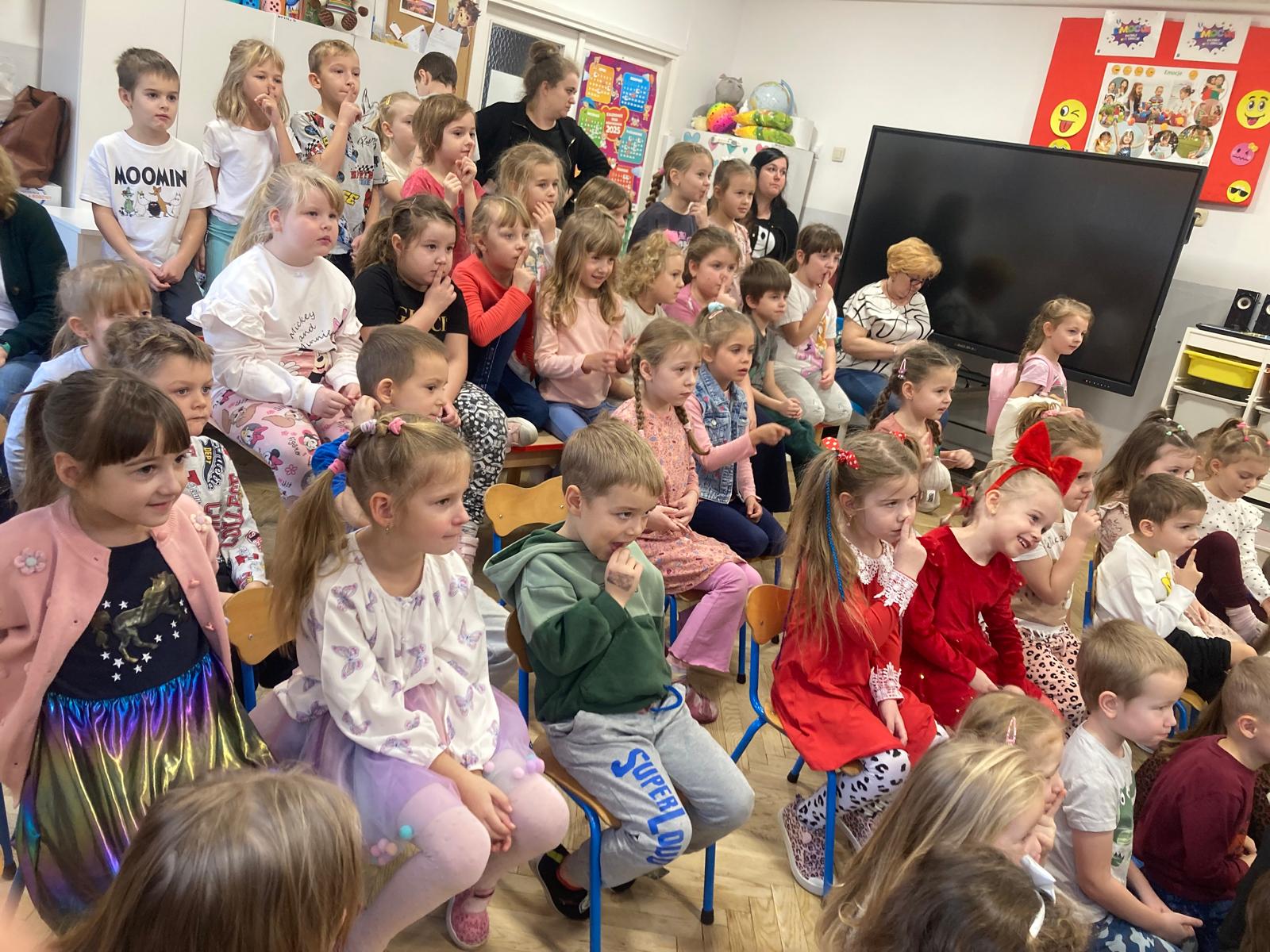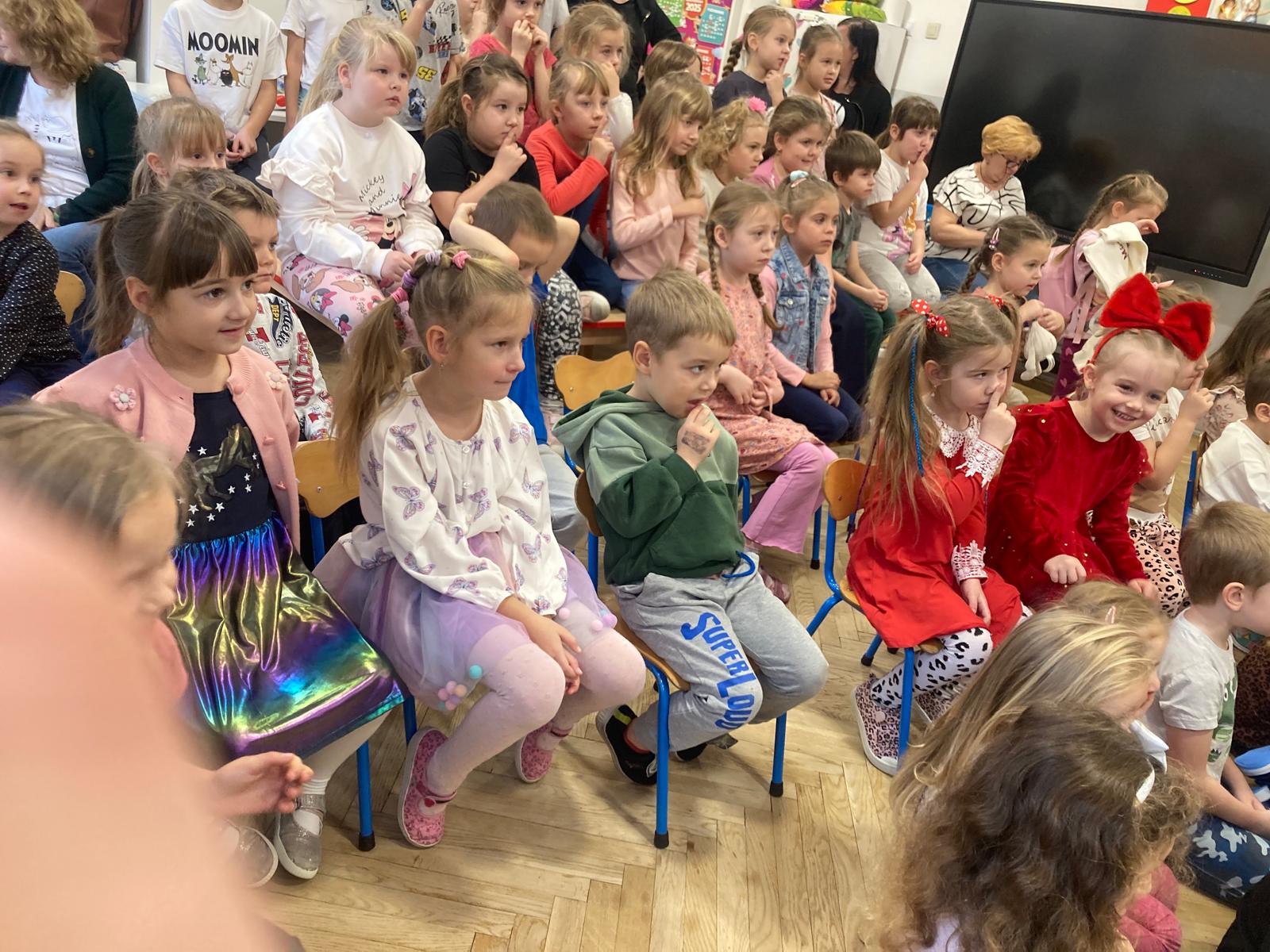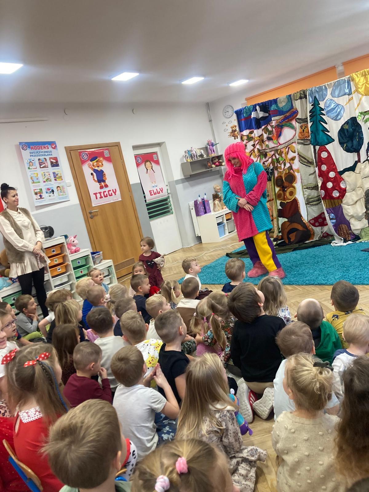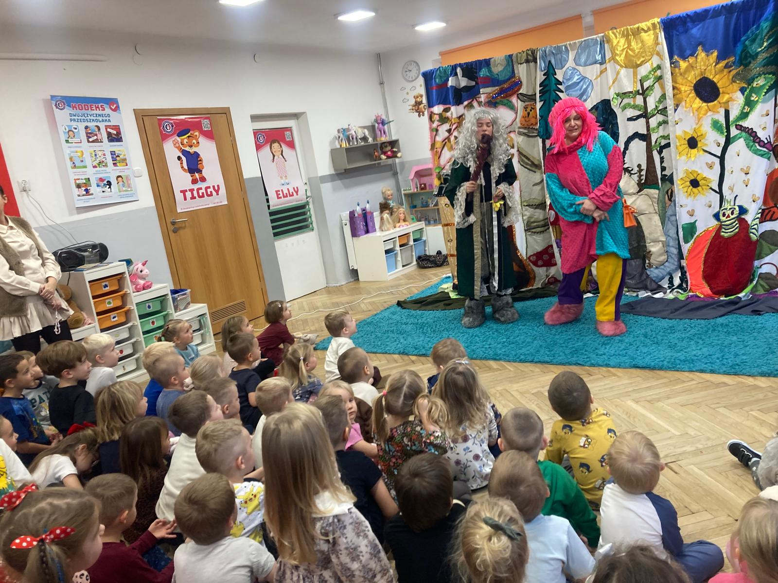 Dzieciaki obejrzały bajeczkę o bardzo edukacyjnym wymiarze.O tym jak nie należy się zachowywać wobec innych w sposób bardzo obrazowy przedstawili aktorzy wcielajac się w role zwierząt z leśnej polany,sarenki ,krecika.Dzieci zaangażowane emocjonalnie w wydarzenia na polanie potrafily doskonale ocenić zachowanie bohaterów te dobre i te złe.Zgodnie wybrały te, które należy naśladować