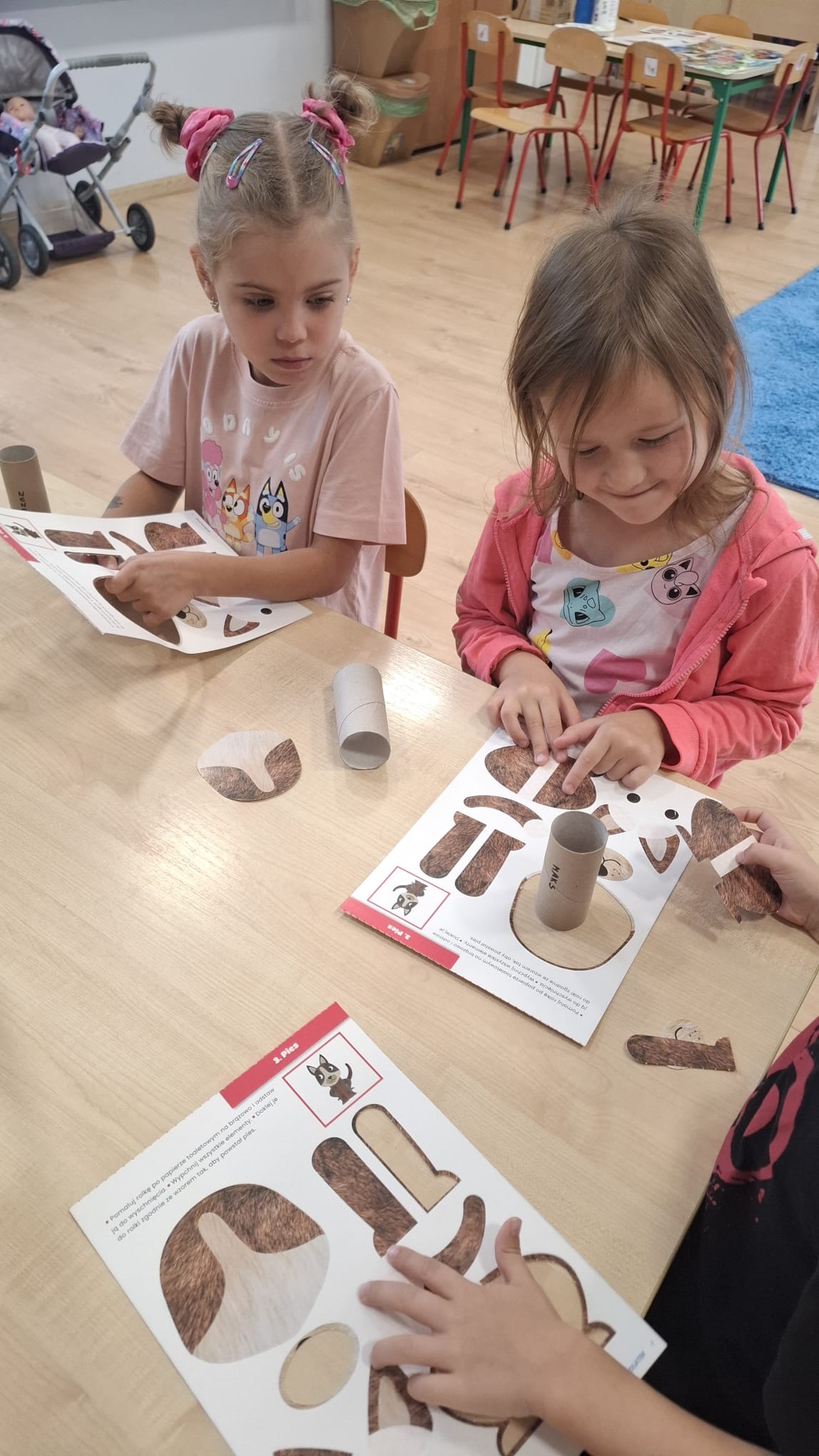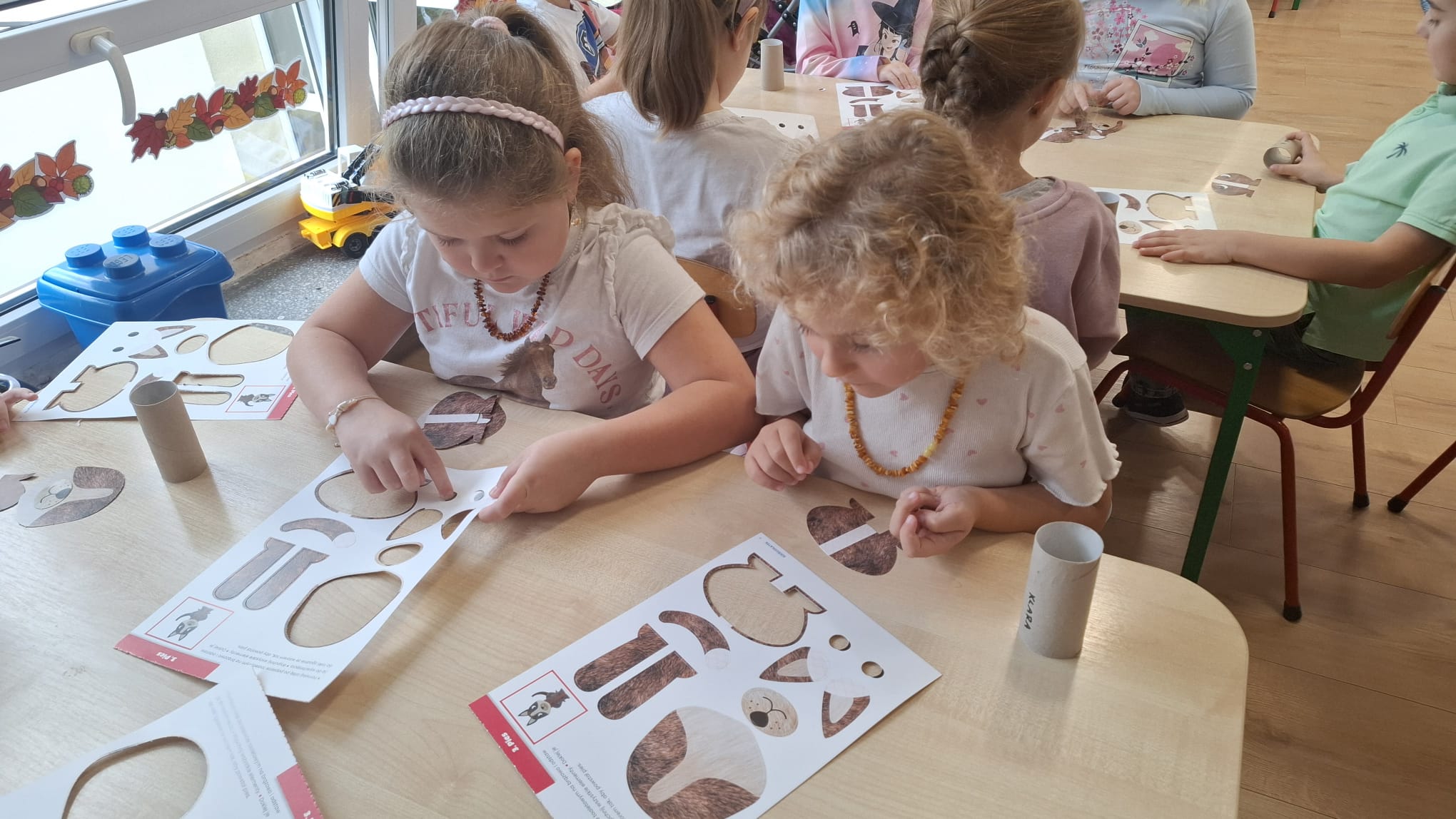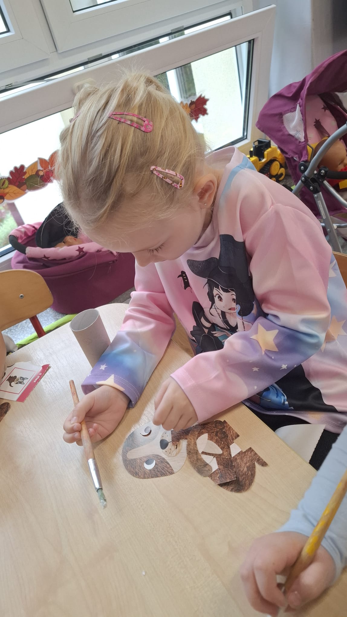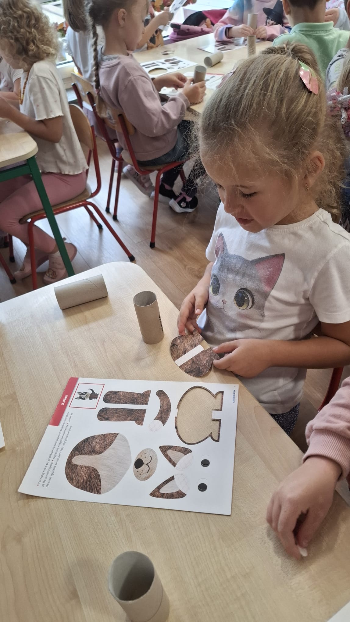 Każdy dzień zaczynały wspólnym odśpiewaniem powitanki ,,Nasze pasje, nasze bziki”. W poniedziałek starszaki uczyły się koncentracji i pracy w ciszy, ilustrowały ruchem słowa nauczyciela. Podczas porannej gimnastyki kształtowały sprawność fizyczną i wykonywały ćwiczenia wpływające na zachowanie prawidłowej postawy ciała. Następnie wysłuchały opowiadania Marii Pawlisz i rozmawiały o swoich zainteresowaniach oraz sposobach na spędzanie wolnego czasu. Opowiadały o swoich pupilach i dzieliły się spostrzeżeniami dotyczącymi opieki nad nimi. Podczas zabaw ,,Przeżyjmy to razem” i ,,Poznajmy się” przełamywały swoją nieśmiałość, wypowiadając się na forum grupy, oraz integrowały się podczas wspólnego tańca do muzyki. Na dworze uczyły się współpracy w zespole w czasie zabaw ruchowych i zręcznościowych. W środę tworzyły konstrukcję z klocków według różnych kryteriów, pobudzając tym samym logiczne myślenie. Piątek był skupiony na temacie zwierząt domowych. Dzieci wysłuchały wiersza Anny Edyk ,,Przywiązanie” oraz rozmawiały o odpowiedzialności w stosunku do zwierząt oraz o tym, jak ważna jest empatia. Wypowiadały się na temat porzucania zwierząt i zamykania ich w schroniskach, kształtowały w sobie prawidłową postawę emocjonalną. Podczas zabaw przy stolikach łączyły zwierzęta z przedmiotami, które można wykorzystać do dbania o nie lub zabawy z nimi.