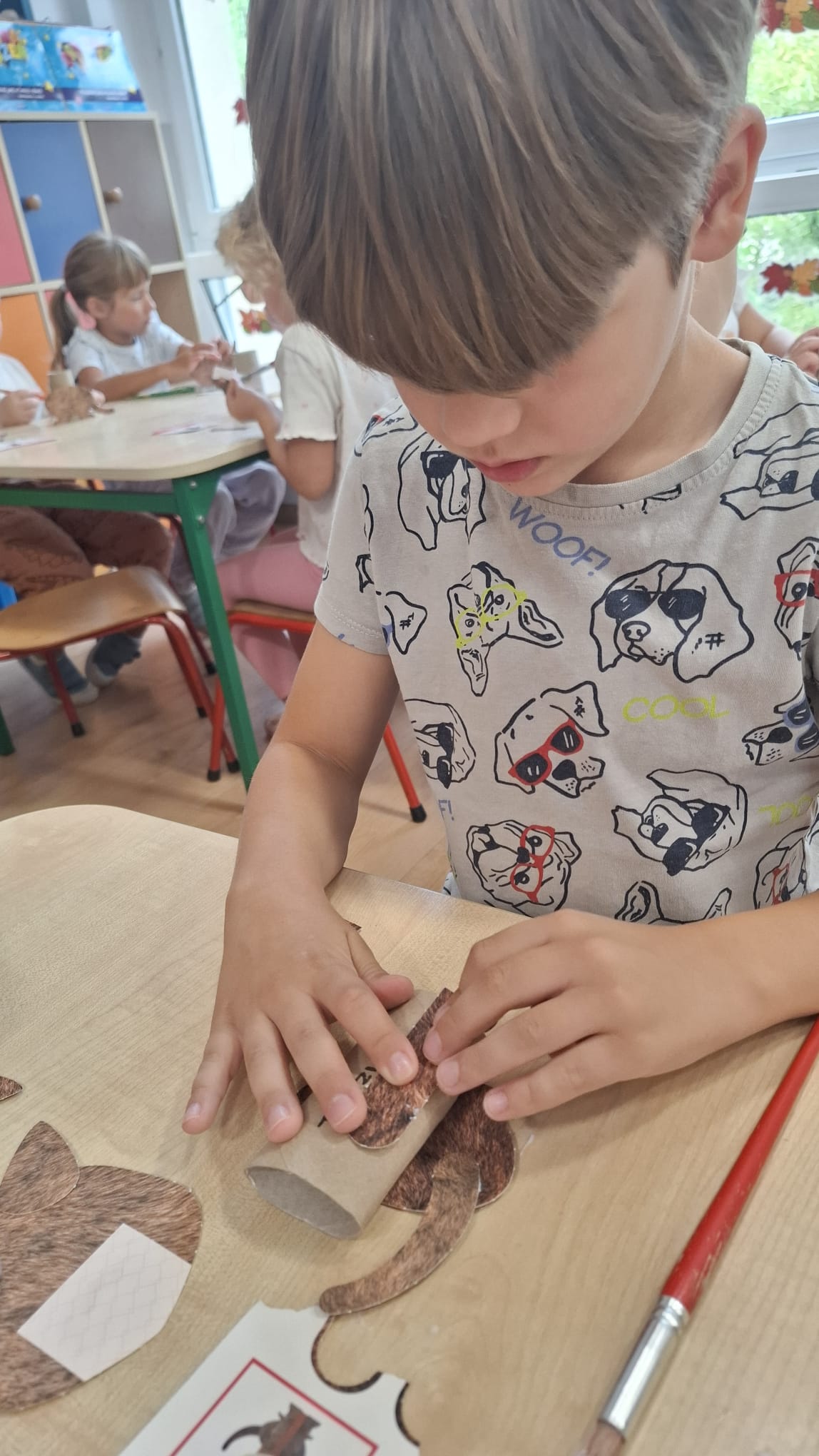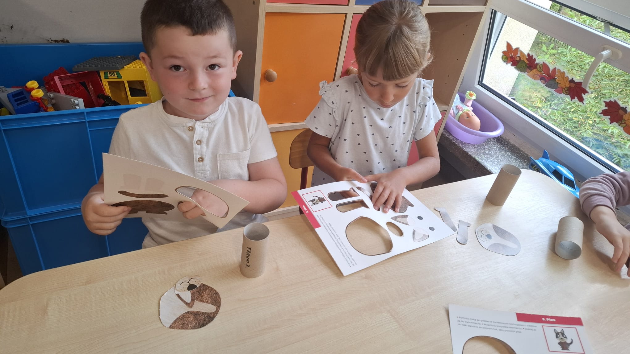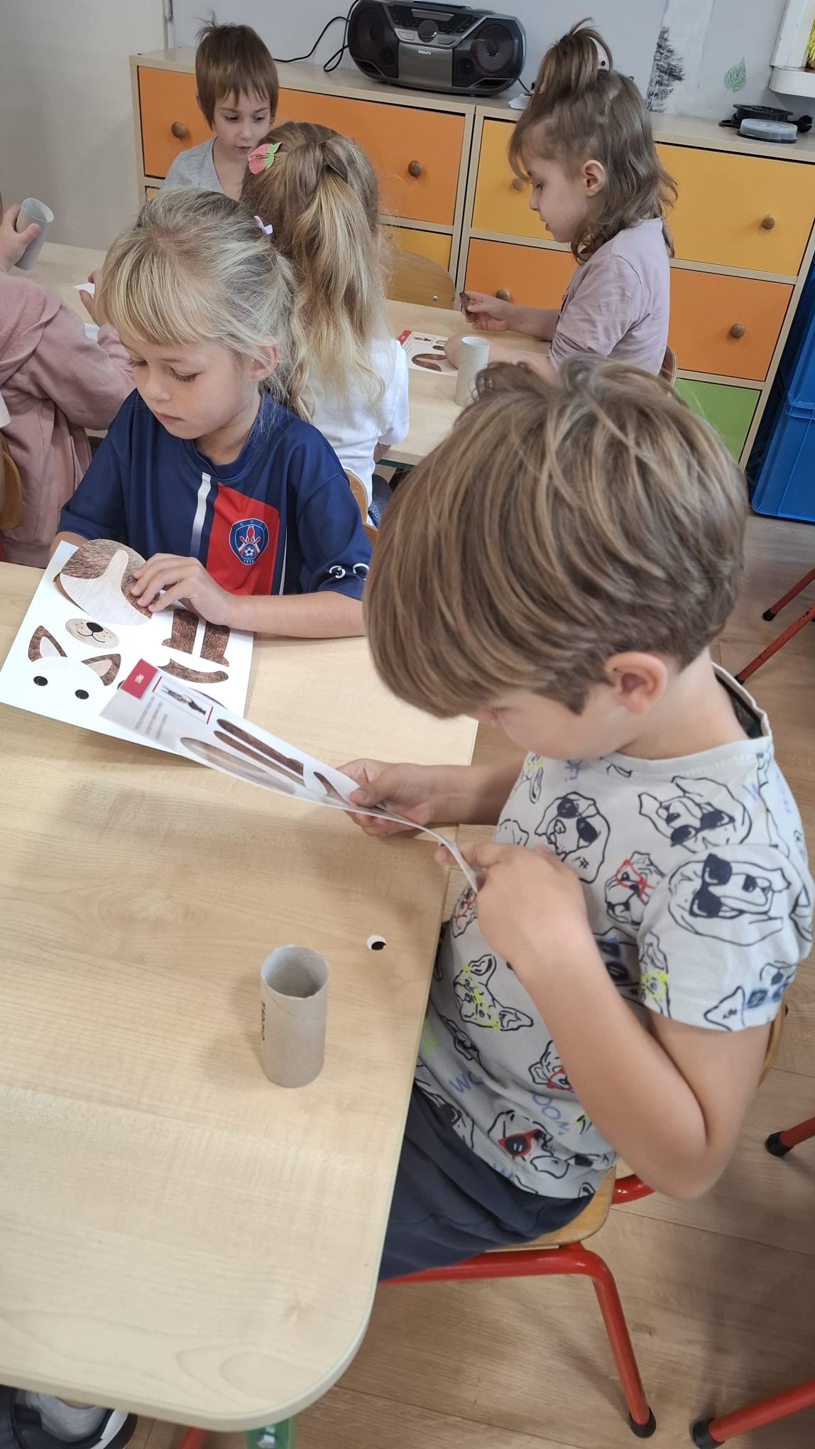 Każdy dzień zaczynały wspólnym odśpiewaniem powitanki ,,Nasze pasje, nasze bziki”. W poniedziałek starszaki uczyły się koncentracji i pracy w ciszy, ilustrowały ruchem słowa nauczyciela. Podczas porannej gimnastyki kształtowały sprawność fizyczną i wykonywały ćwiczenia wpływające na zachowanie prawidłowej postawy ciała. Następnie wysłuchały opowiadania Marii Pawlisz i rozmawiały o swoich zainteresowaniach oraz sposobach na spędzanie wolnego czasu. Opowiadały o swoich pupilach i dzieliły się spostrzeżeniami dotyczącymi opieki nad nimi. Podczas zabaw ,,Przeżyjmy to razem” i ,,Poznajmy się” przełamywały swoją nieśmiałość, wypowiadając się na forum grupy, oraz integrowały się podczas wspólnego tańca do muzyki. Na dworze uczyły się współpracy w zespole w czasie zabaw ruchowych i zręcznościowych. W środę tworzyły konstrukcję z klocków według różnych kryteriów, pobudzając tym samym logiczne myślenie. Piątek był skupiony na temacie zwierząt domowych. Dzieci wysłuchały wiersza Anny Edyk ,,Przywiązanie” oraz rozmawiały o odpowiedzialności w stosunku do zwierząt oraz o tym, jak ważna jest empatia. Wypowiadały się na temat porzucania zwierząt i zamykania ich w schroniskach, kształtowały w sobie prawidłową postawę emocjonalną. Podczas zabaw przy stolikach łączyły zwierzęta z przedmiotami, które można wykorzystać do dbania o nie lub zabawy z nimi.