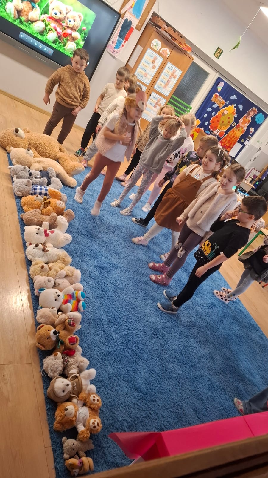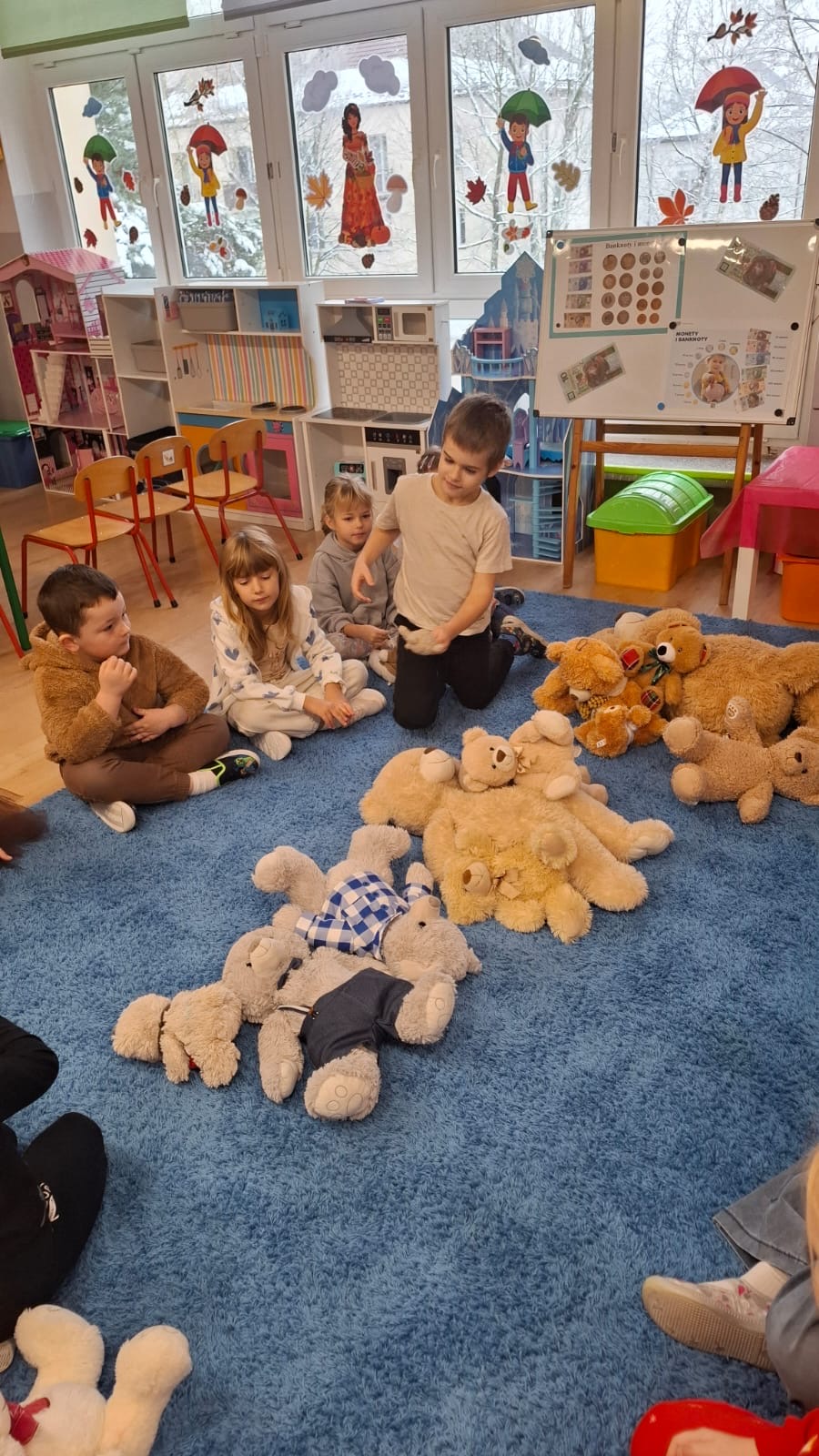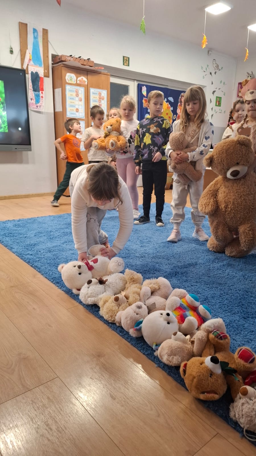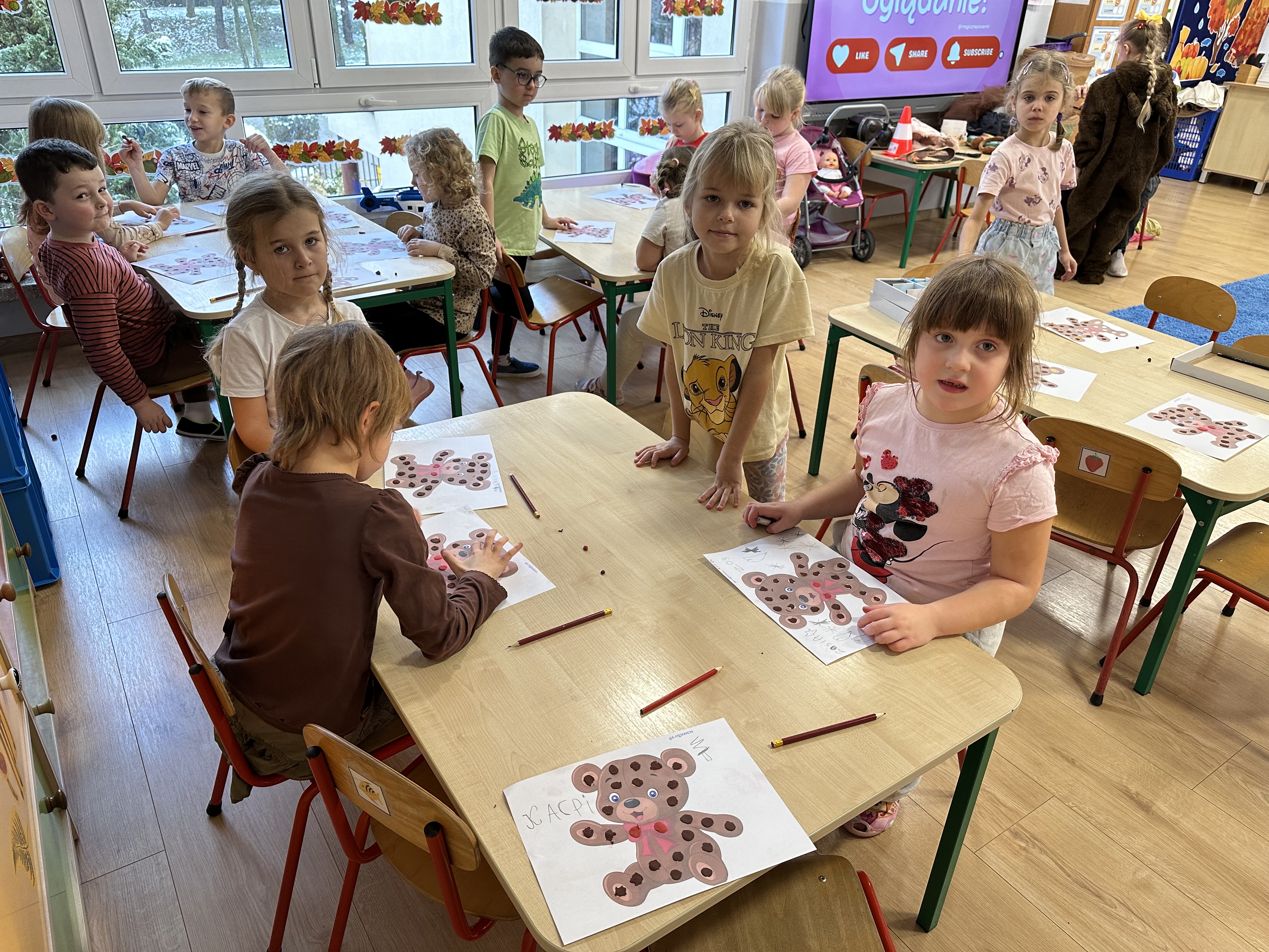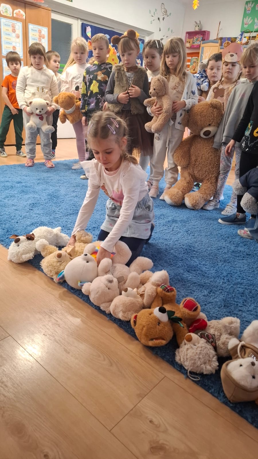W piątek w naszej grupie świętowaliśmy Dzień Pluszowego Misia. Dzieci przyszły do przedszkola ze swoimi ulubionymi maskotkami, które towarzyszyły im podczas całego dnia zajęć i zabaw. Po śniadaniu przedszkolaki obejrzały film edukacyjny wprowadzający w tematykę święta. Następnie brały udział w zabawach kołowych, takich jak „Stary niedźwiedź” oraz „Jedna łapka, druga łapka”. Podczas zajęć dydaktycznych dzieci doskonaliły również umiejętności matematyczne – klasyfikowały misie według kolorów, układały je od największego do najmniejszego, a także grały w gry edukacyjne „Misiowe memory” oraz „Misiowy quiz”. Kolejnym punktem programu była zabawa muzyczna „Kto przytuli misia”, która dostarczyła dzieciom wiele radości. Po obiedzie przedszkolaki wybierały teksty literackie o misiach, które następnie czytał nauczyciel. Oglądały również ilustracje misiów znanych z bajek i starały się odgadnąć, z jakich tytułów pochodzą. Nie zabrakło także aktywności ruchowych – dzieci uczestniczyły w zabawach „Podaj misia” i „Przenieś misia”, które zawierały elementy rywalizacji. Dużo radości przyniósł również „Taniec z misiem” wykonywany według wylosowanych wcześniej wskazówek. Na zakończenie dnia każde dziecko wykonało pracę plastyczną „Miś”. Dzień upłynął w atmosferze radości, przytulnych wspomnień i wspólnej zabawy, a pluszowi towarzysze byli tego dnia najważniejszymi gośćmi w przedszkolu.