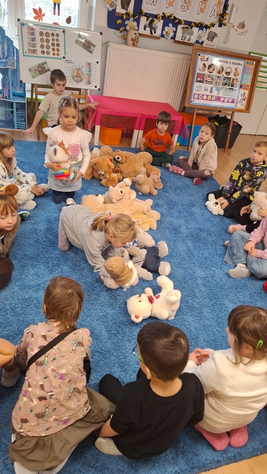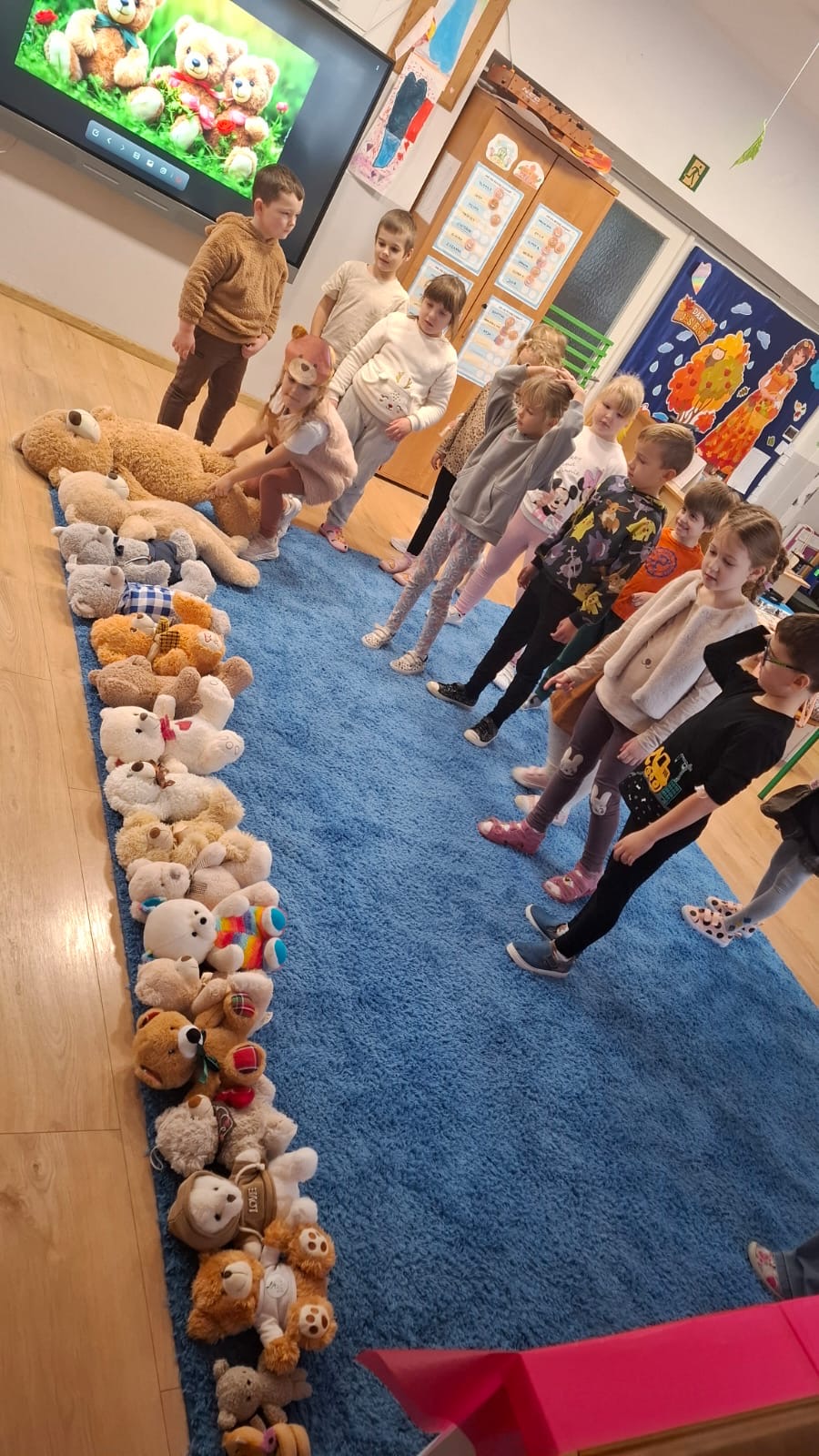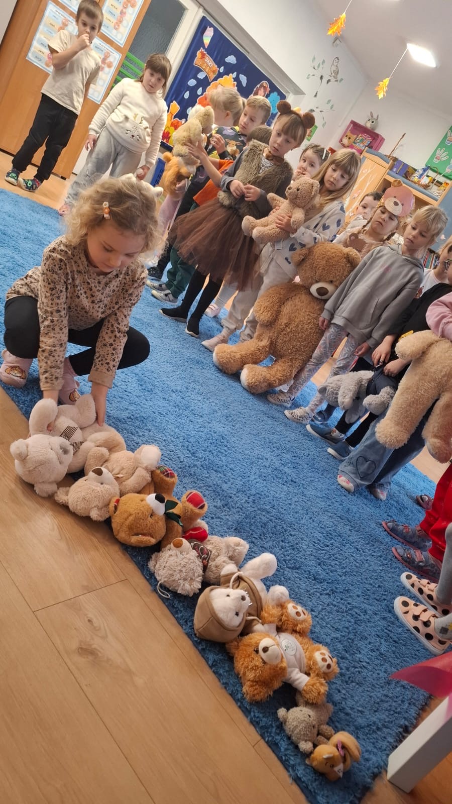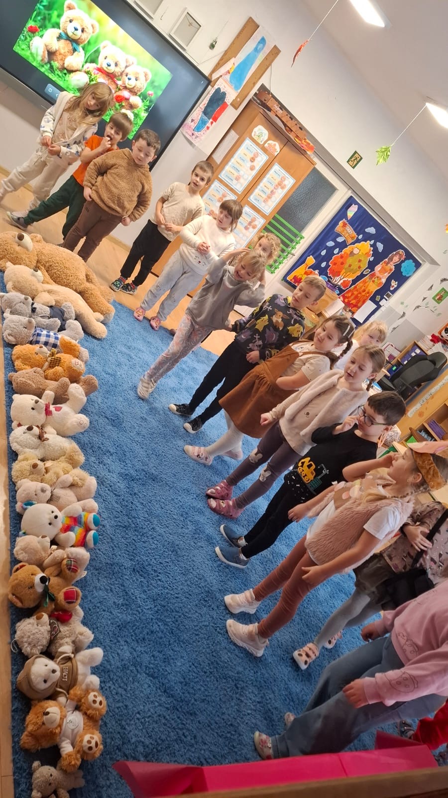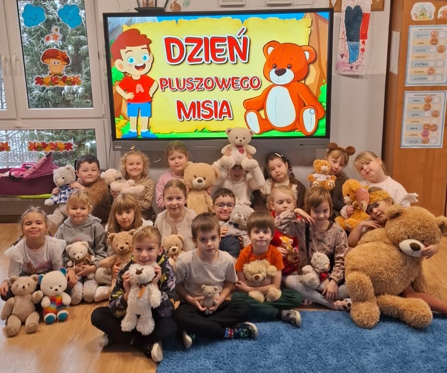 W piątek w naszej grupie świętowaliśmy Dzień Pluszowego Misia. Dzieci przyszły do przedszkola ze swoimi ulubionymi maskotkami, które towarzyszyły im podczas całego dnia zajęć i zabaw. Po śniadaniu przedszkolaki obejrzały film edukacyjny wprowadzający w tematykę święta. Następnie brały udział w zabawach kołowych, takich jak „Stary niedźwiedź” oraz „Jedna łapka, druga łapka”. Podczas zajęć dydaktycznych dzieci doskonaliły również umiejętności matematyczne – klasyfikowały misie według kolorów, układały je od największego do najmniejszego, a także grały w gry edukacyjne „Misiowe memory” oraz „Misiowy quiz”. Kolejnym punktem programu była zabawa muzyczna „Kto przytuli misia”, która dostarczyła dzieciom wiele radości. Po obiedzie przedszkolaki wybierały teksty literackie o misiach, które następnie czytał nauczyciel. Oglądały również ilustracje misiów znanych z bajek i starały się odgadnąć, z jakich tytułów pochodzą. Nie zabrakło także aktywności ruchowych – dzieci uczestniczyły w zabawach „Podaj misia” i „Przenieś misia”, które zawierały elementy rywalizacji. Dużo radości przyniósł również „Taniec z misiem” wykonywany według wylosowanych wcześniej wskazówek. Na zakończenie dnia każde dziecko wykonało pracę plastyczną „Miś”. Dzień upłynął w atmosferze radości, przytulnych wspomnień i wspólnej zabawy, a pluszowi towarzysze byli tego dnia najważniejszymi gośćmi w przedszkolu.