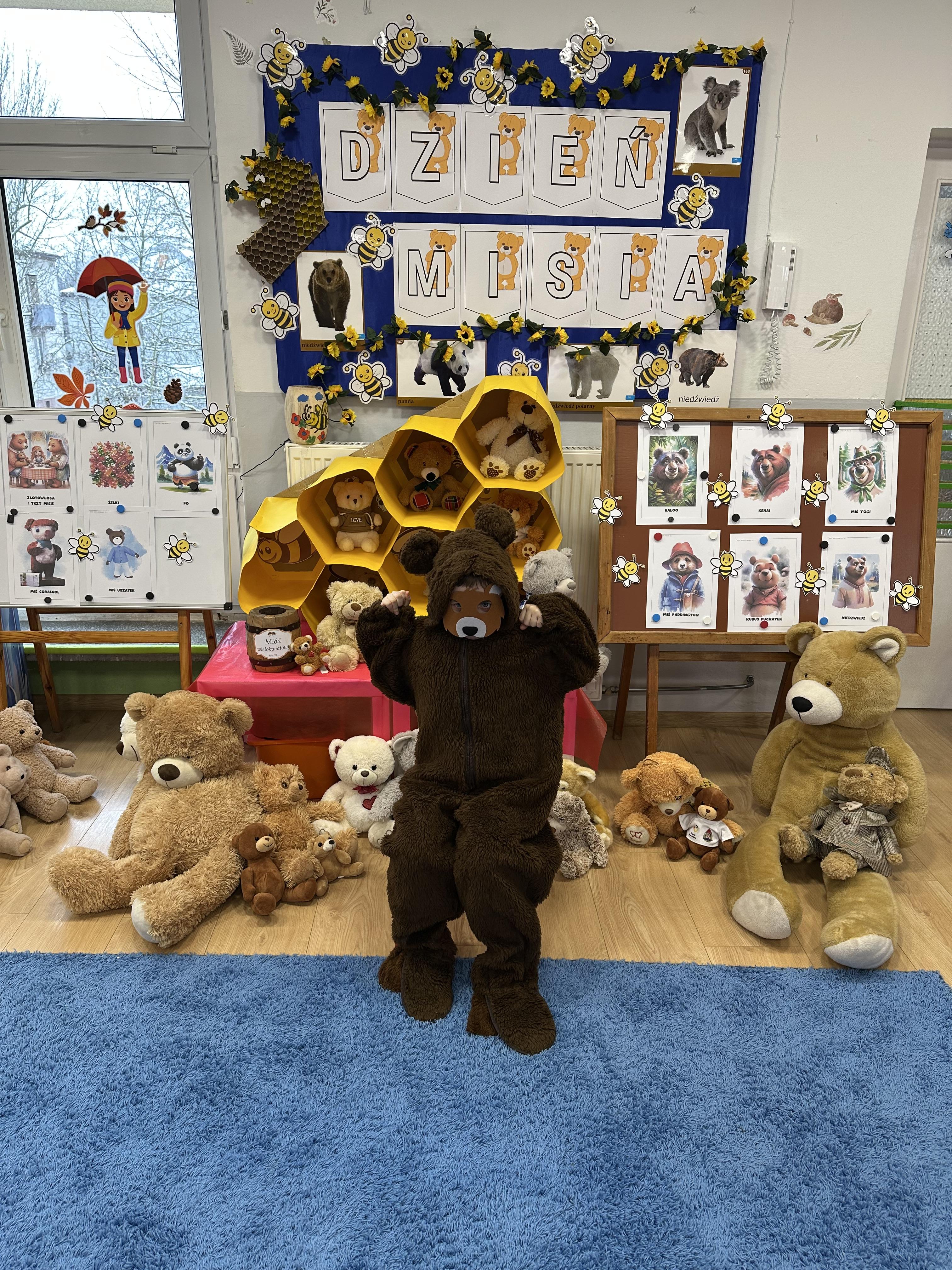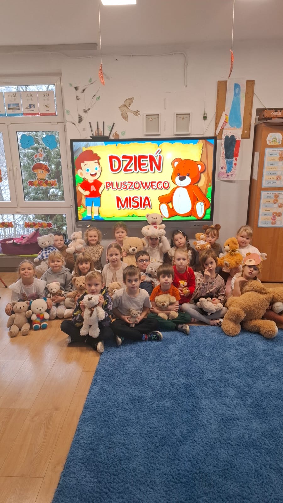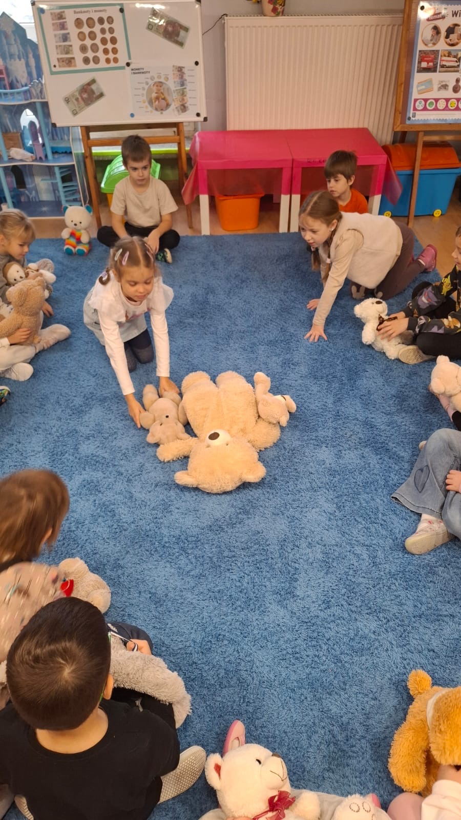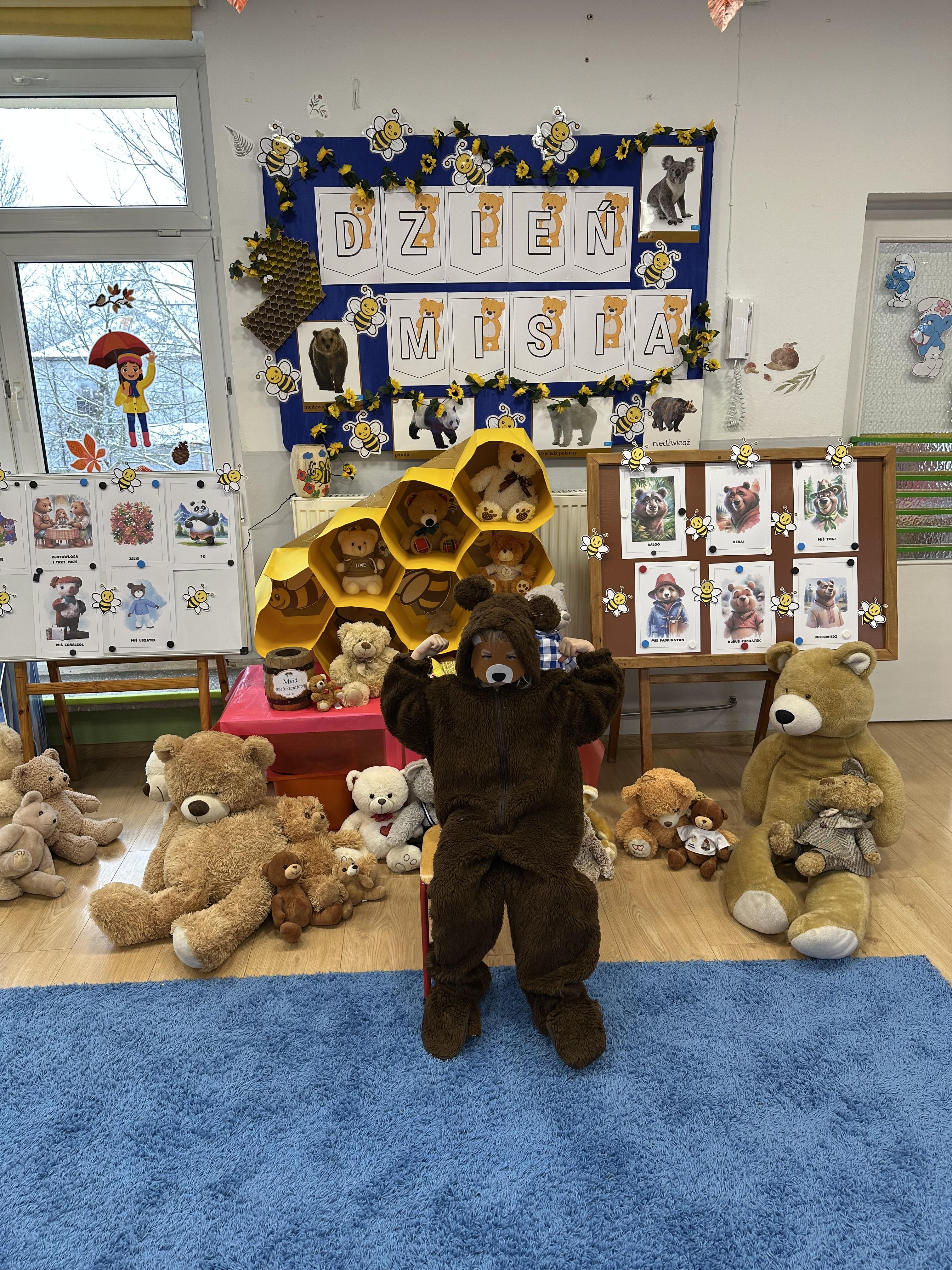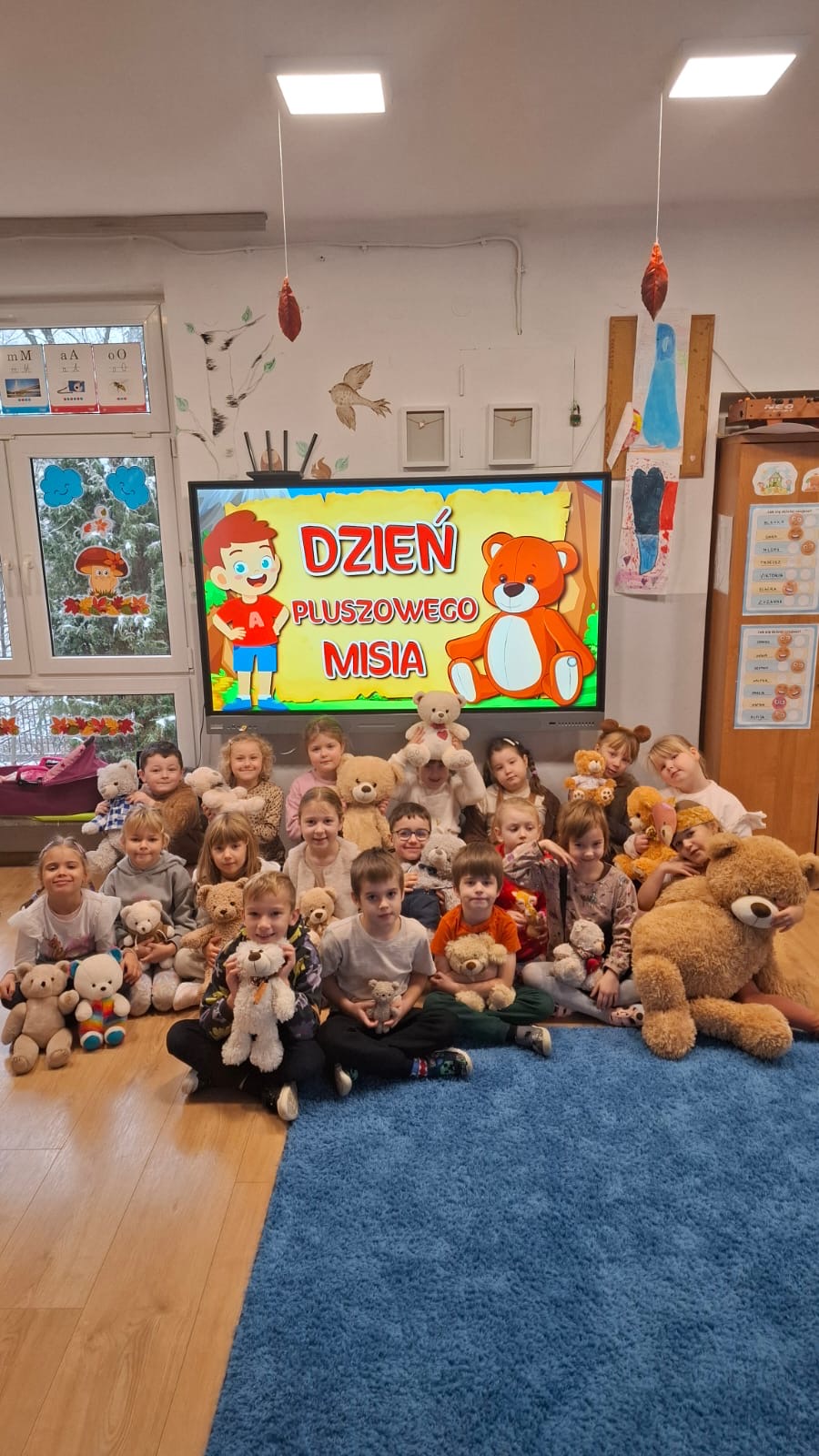 W piątek w naszej grupie świętowaliśmy Dzień Pluszowego Misia. Dzieci przyszły do przedszkola ze swoimi ulubionymi maskotkami, które towarzyszyły im podczas całego dnia zajęć i zabaw. Po śniadaniu przedszkolaki obejrzały film edukacyjny wprowadzający w tematykę święta. Następnie brały udział w zabawach kołowych, takich jak „Stary niedźwiedź” oraz „Jedna łapka, druga łapka”. Podczas zajęć dydaktycznych dzieci doskonaliły również umiejętności matematyczne – klasyfikowały misie według kolorów, układały je od największego do najmniejszego, a także grały w gry edukacyjne „Misiowe memory” oraz „Misiowy quiz”. Kolejnym punktem programu była zabawa muzyczna „Kto przytuli misia”, która dostarczyła dzieciom wiele radości. Po obiedzie przedszkolaki wybierały teksty literackie o misiach, które następnie czytał nauczyciel. Oglądały również ilustracje misiów znanych z bajek i starały się odgadnąć, z jakich tytułów pochodzą. Nie zabrakło także aktywności ruchowych – dzieci uczestniczyły w zabawach „Podaj misia” i „Przenieś misia”, które zawierały elementy rywalizacji. Dużo radości przyniósł również „Taniec z misiem” wykonywany według wylosowanych wcześniej wskazówek. Na zakończenie dnia każde dziecko wykonało pracę plastyczną „Miś”. Dzień upłynął w atmosferze radości, przytulnych wspomnień i wspólnej zabawy, a pluszowi towarzysze byli tego dnia najważniejszymi gośćmi w przedszkolu.