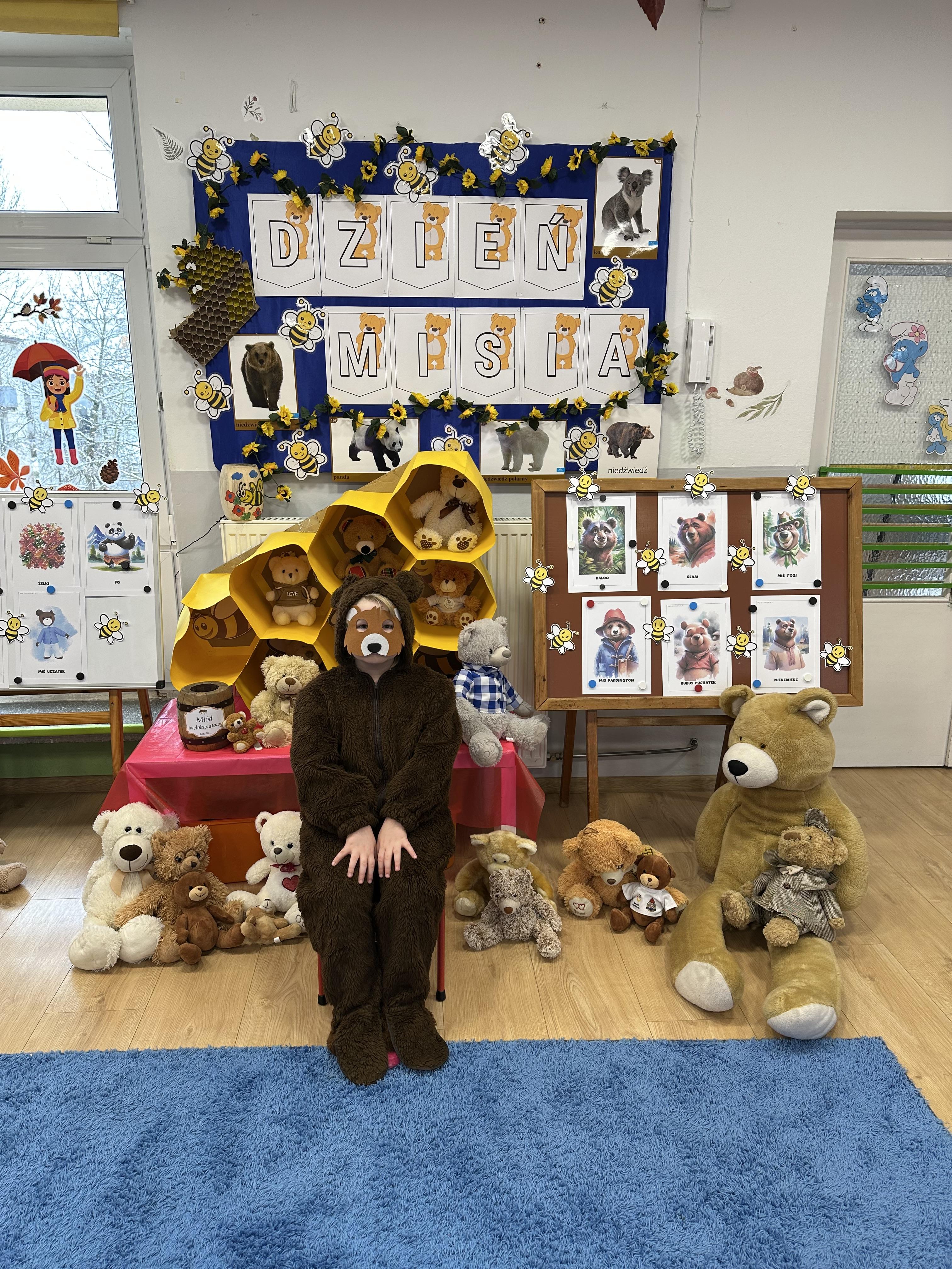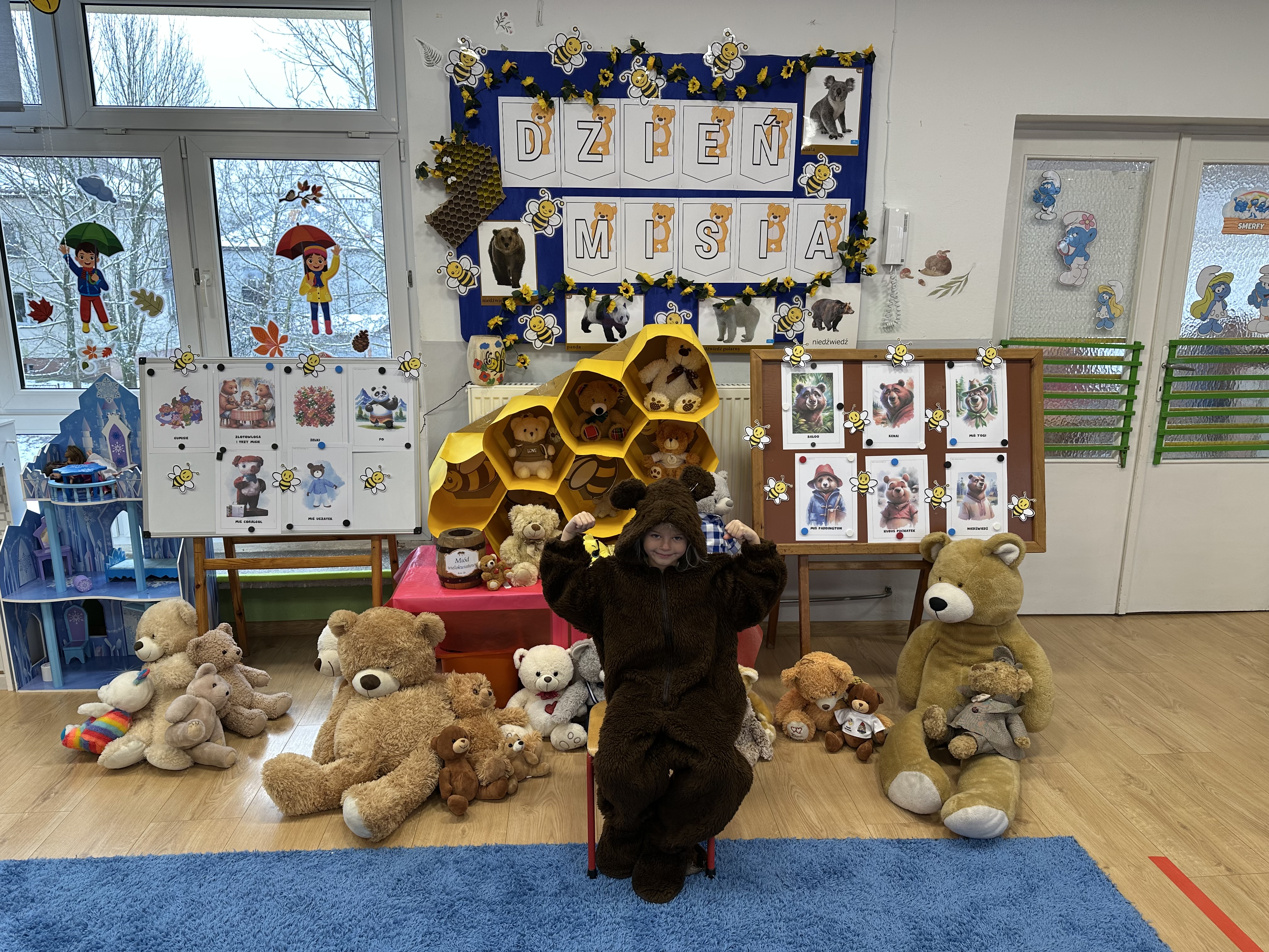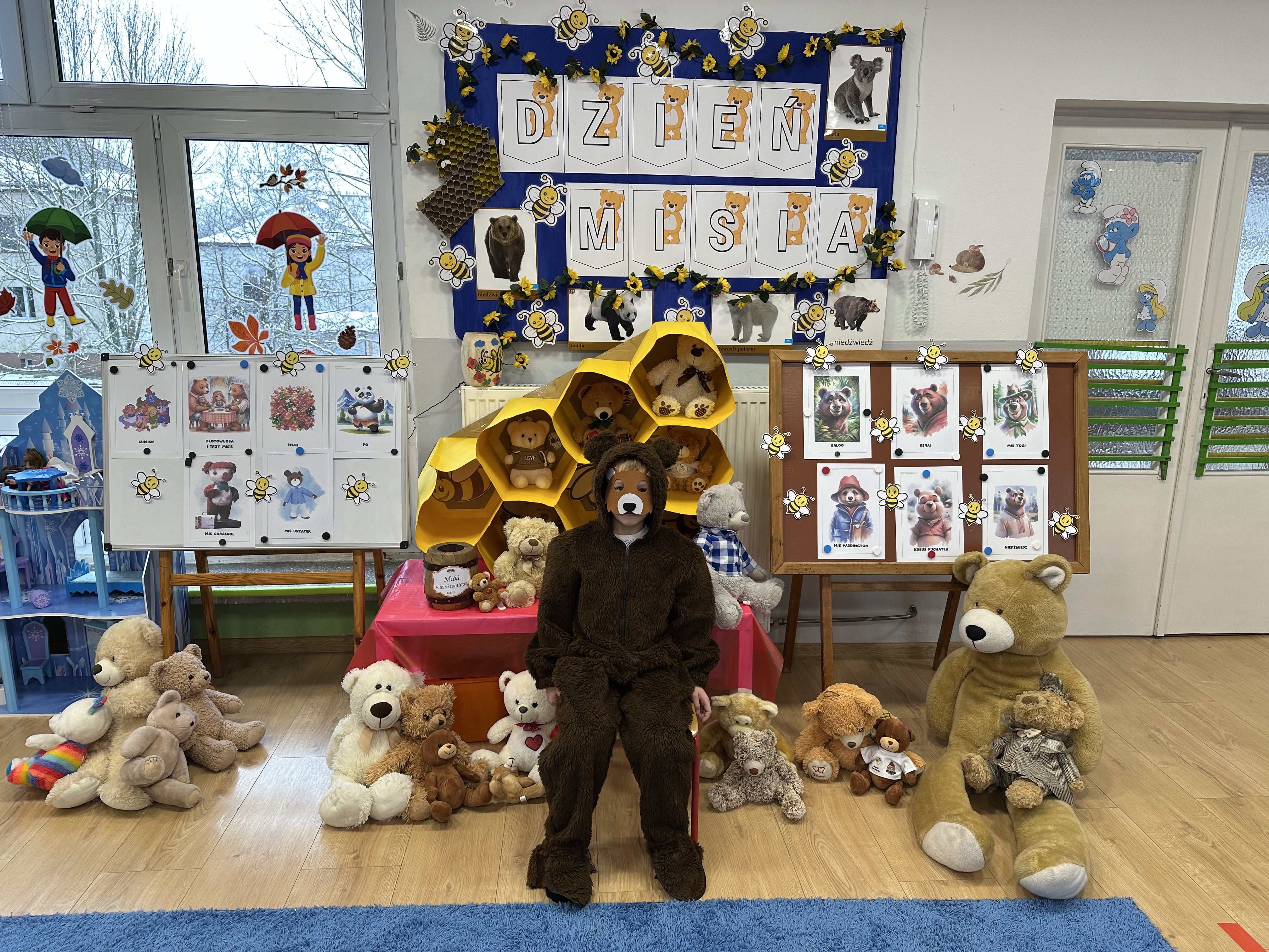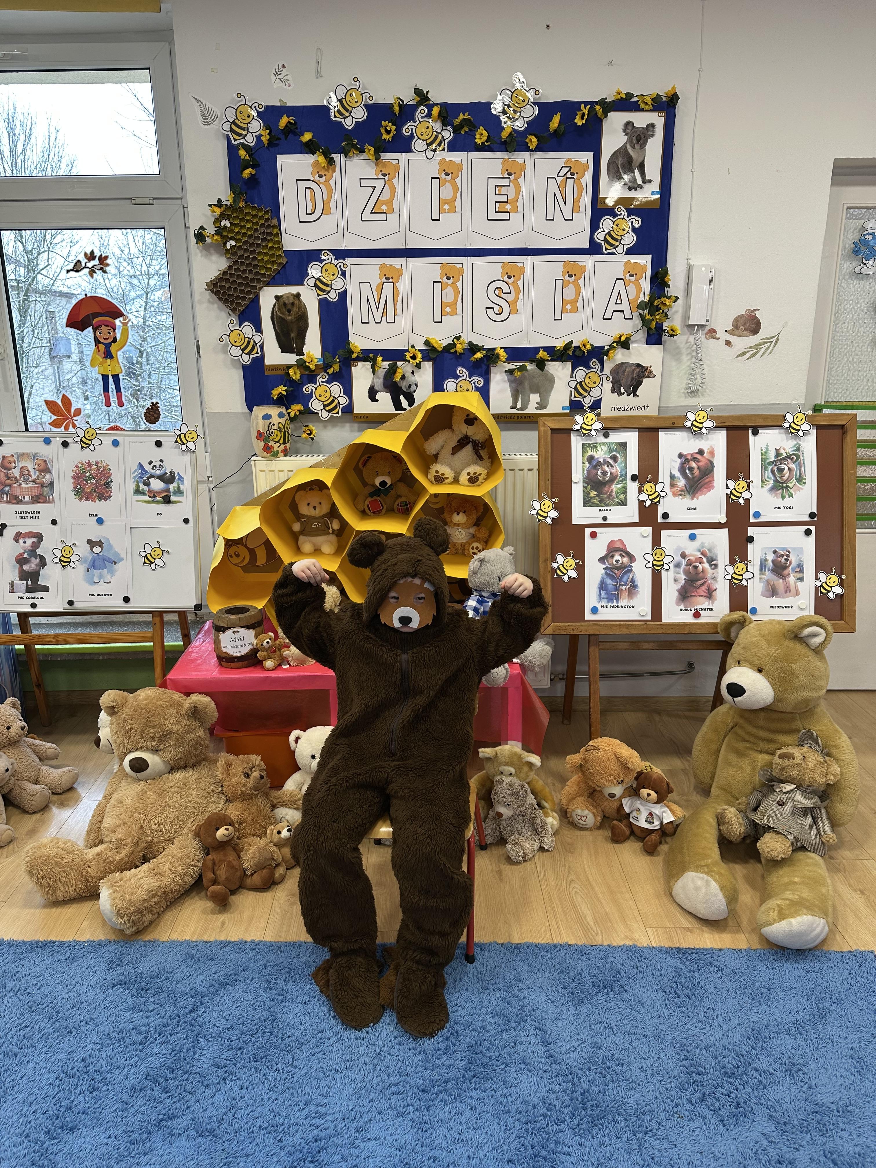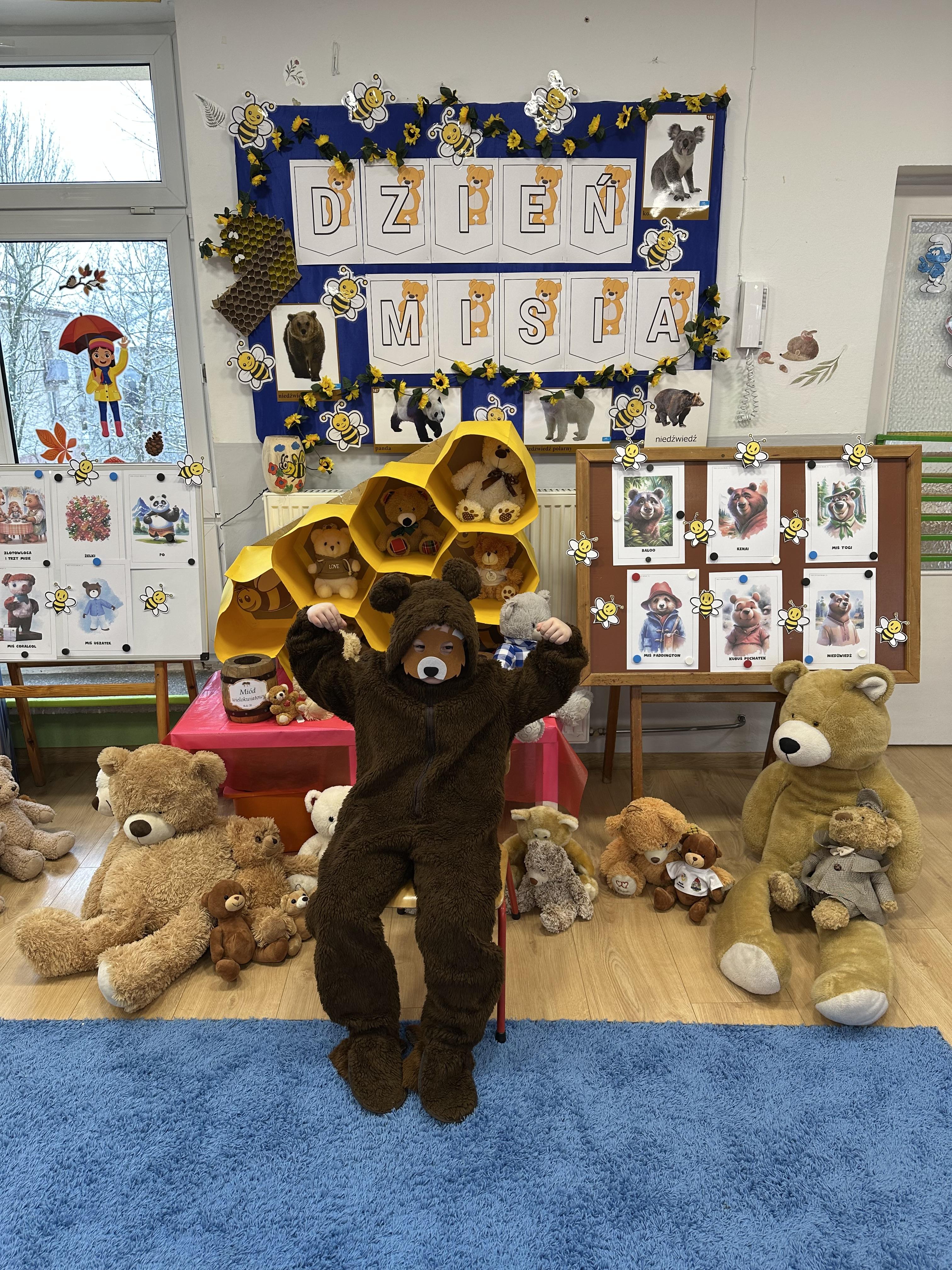 W piątek w naszej grupie świętowaliśmy Dzień Pluszowego Misia. Dzieci przyszły do przedszkola ze swoimi ulubionymi maskotkami, które towarzyszyły im podczas całego dnia zajęć i zabaw. Po śniadaniu przedszkolaki obejrzały film edukacyjny wprowadzający w tematykę święta. Następnie brały udział w zabawach kołowych, takich jak „Stary niedźwiedź” oraz „Jedna łapka, druga łapka”. Podczas zajęć dydaktycznych dzieci doskonaliły również umiejętności matematyczne – klasyfikowały misie według kolorów, układały je od największego do najmniejszego, a także grały w gry edukacyjne „Misiowe memory” oraz „Misiowy quiz”. Kolejnym punktem programu była zabawa muzyczna „Kto przytuli misia”, która dostarczyła dzieciom wiele radości. Po obiedzie przedszkolaki wybierały teksty literackie o misiach, które następnie czytał nauczyciel. Oglądały również ilustracje misiów znanych z bajek i starały się odgadnąć, z jakich tytułów pochodzą. Nie zabrakło także aktywności ruchowych – dzieci uczestniczyły w zabawach „Podaj misia” i „Przenieś misia”, które zawierały elementy rywalizacji. Dużo radości przyniósł również „Taniec z misiem” wykonywany według wylosowanych wcześniej wskazówek. Na zakończenie dnia każde dziecko wykonało pracę plastyczną „Miś”. Dzień upłynął w atmosferze radości, przytulnych wspomnień i wspólnej zabawy, a pluszowi towarzysze byli tego dnia najważniejszymi gośćmi w przedszkolu.