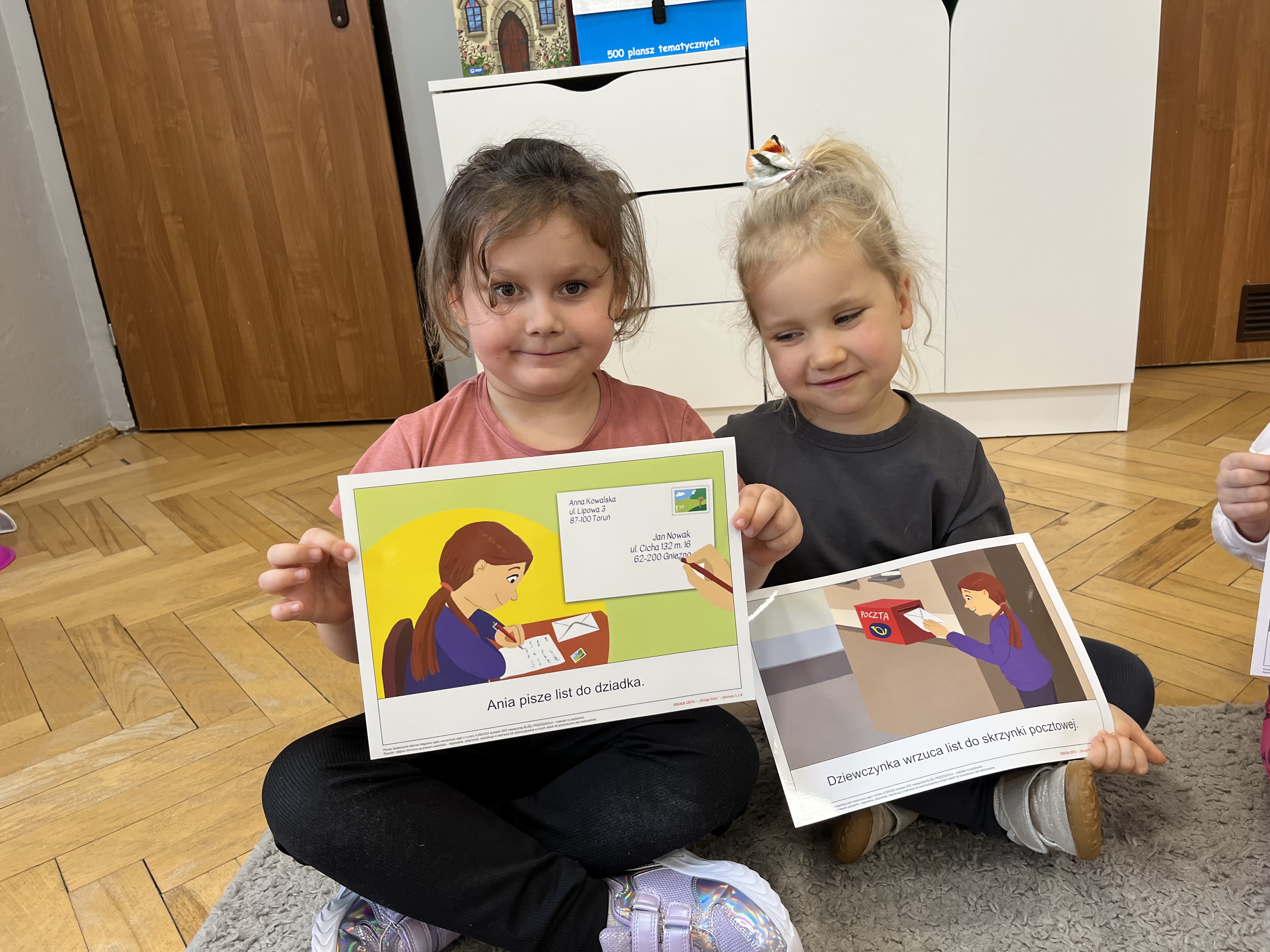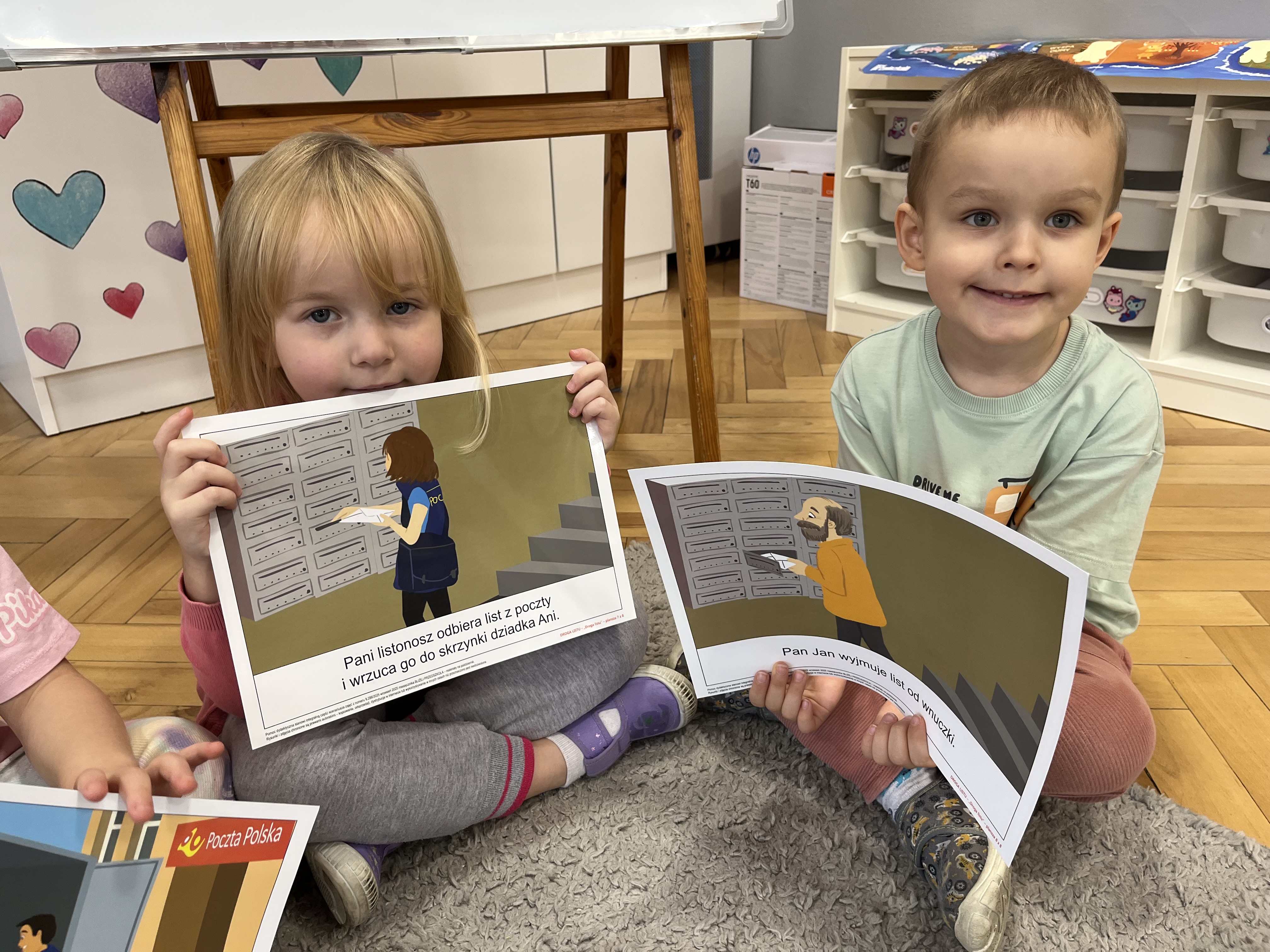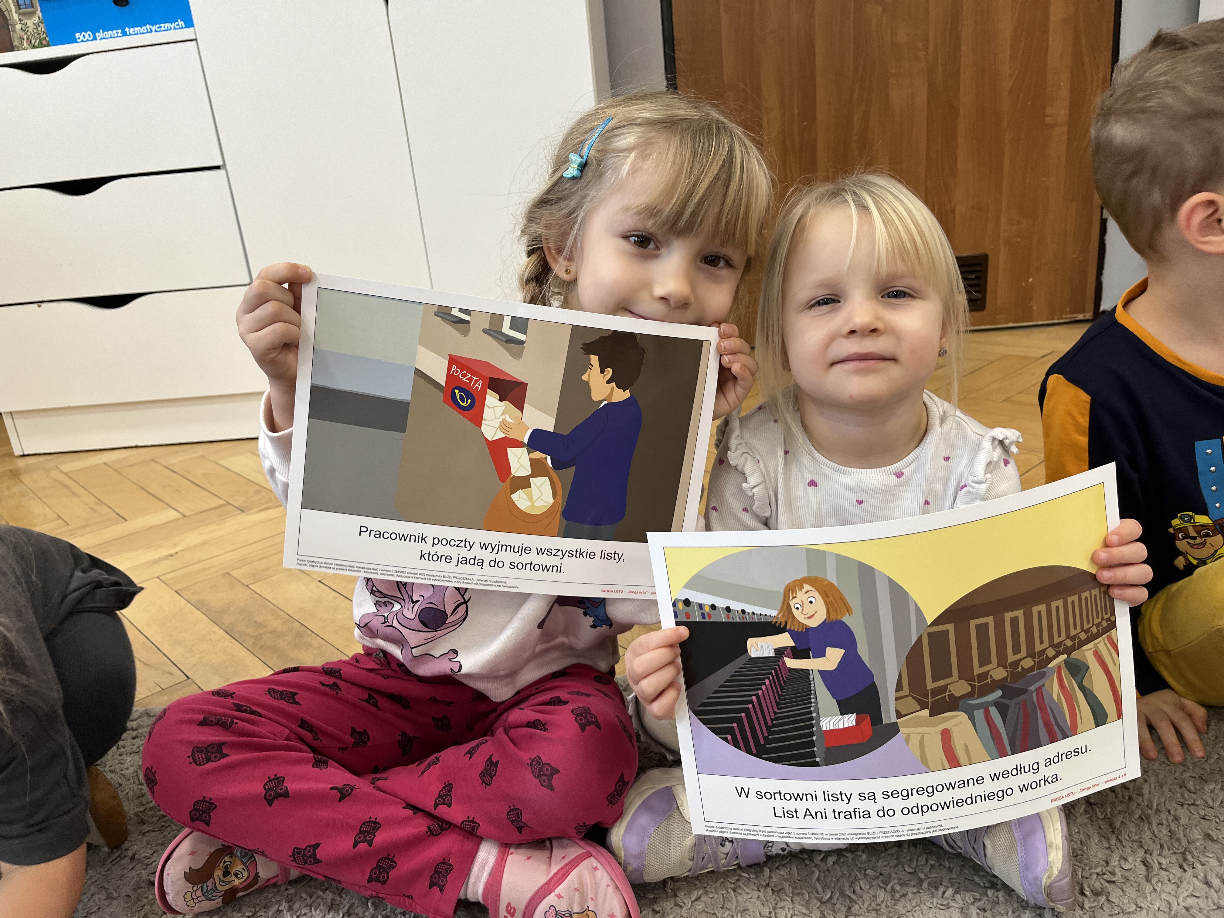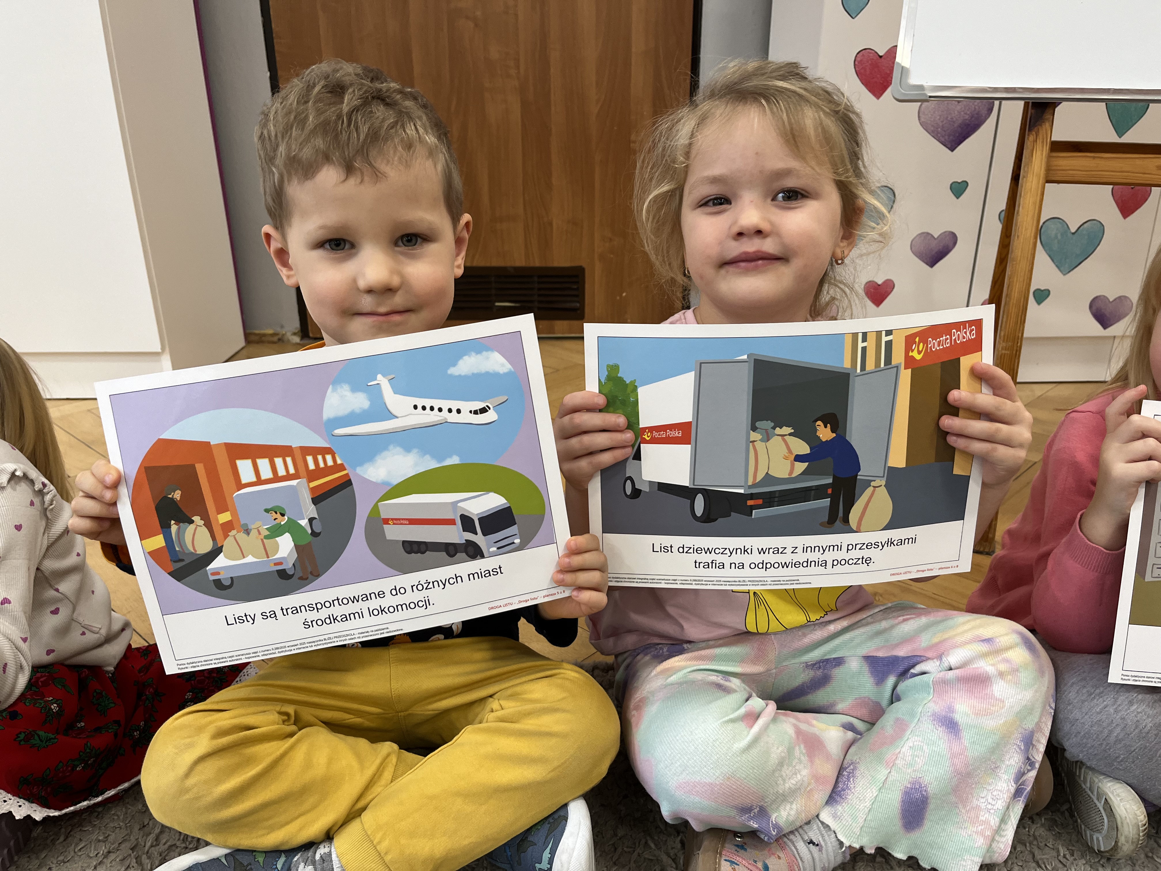 W czasie zajęć dzieci poznawały drogę, jaką pokonuje tradycyjny list, zanim trafi do adresata. Dowiedziały się, że pocztówka musi najpierw zostać napisana i odpowiednio zaadresowana, następnie trafia do skrzynki pocztowej, skąd odbiera ją listonosz. Później list jest sortowany w urzędzie pocztowym i dopiero wtedy wędruje dalej – aż do domu osoby, do której został wysłany.