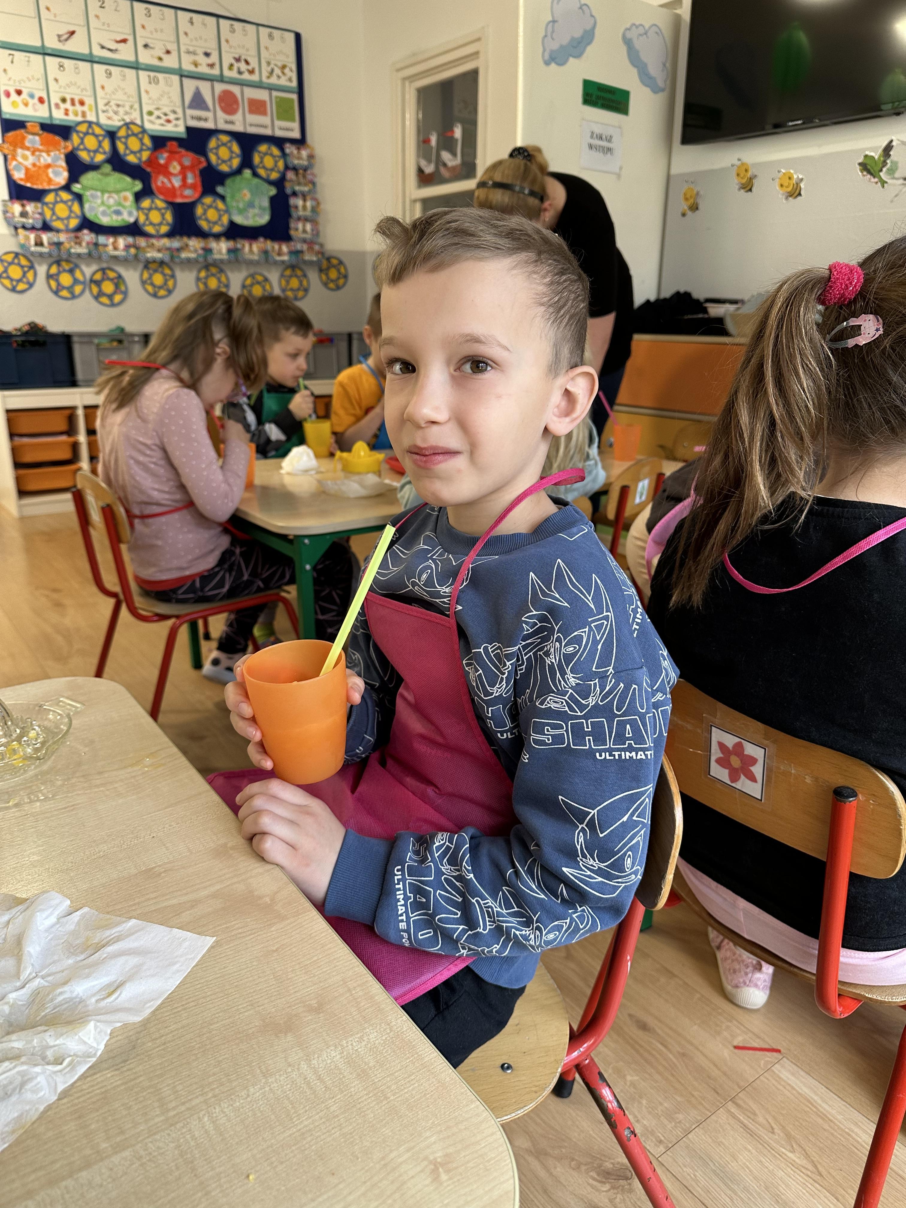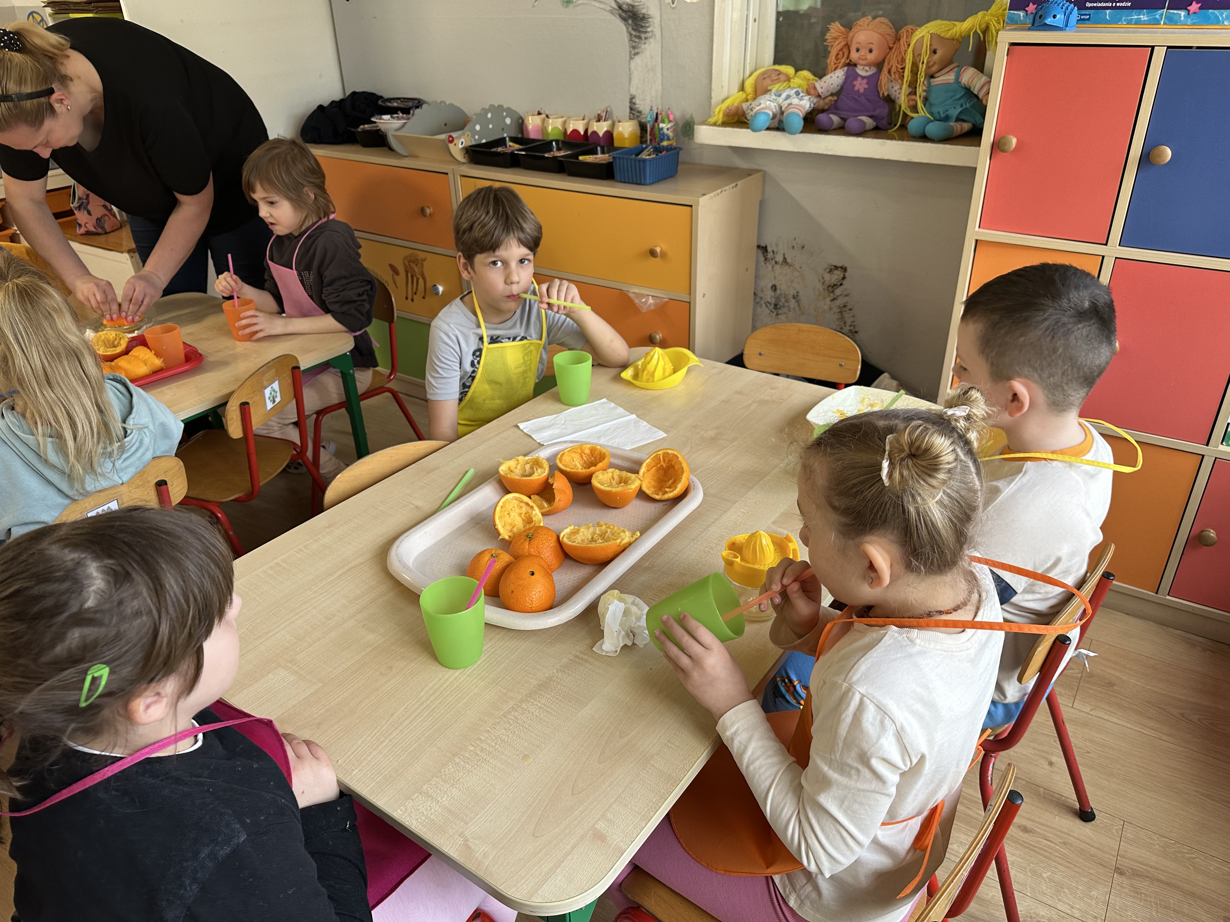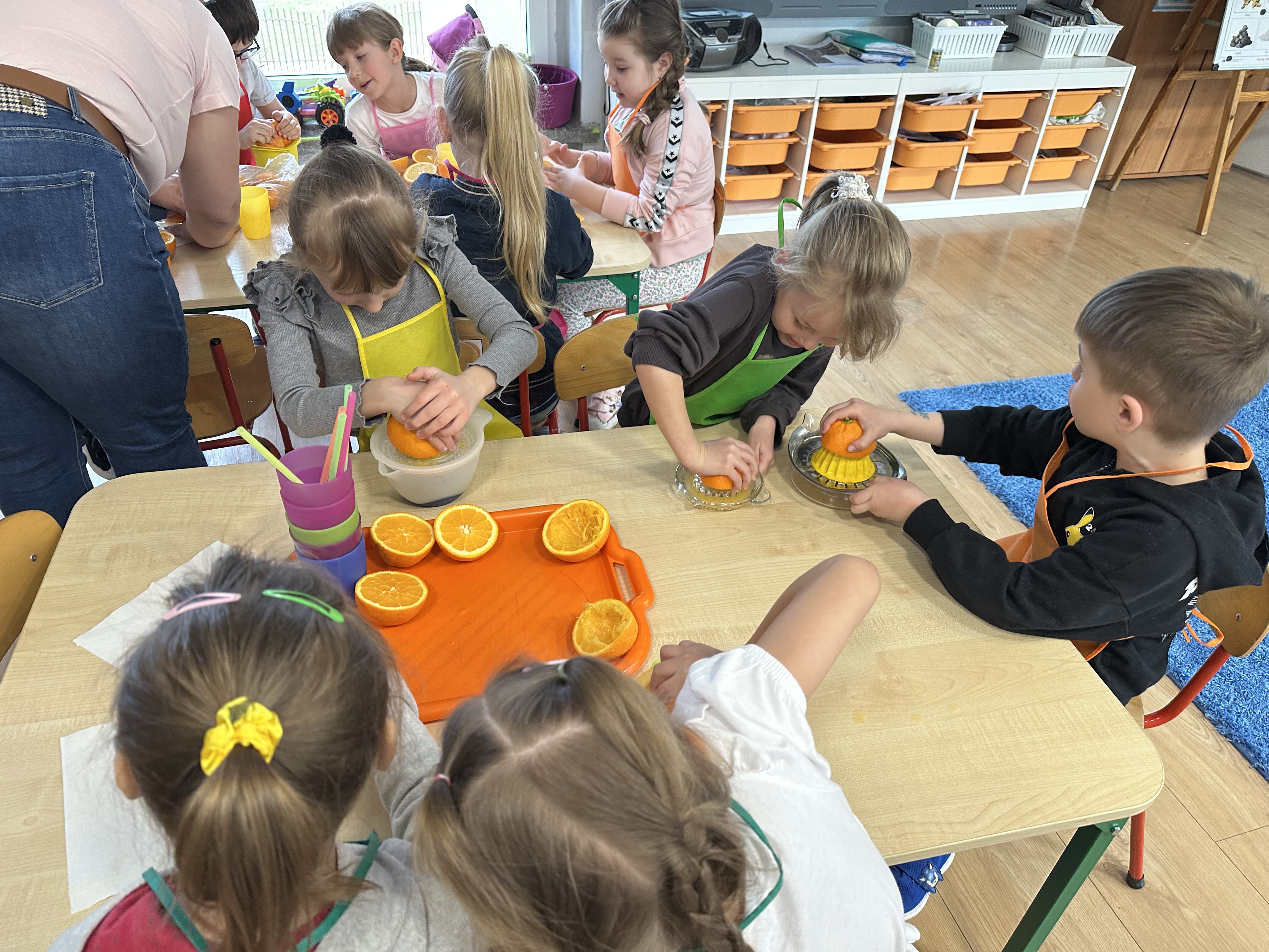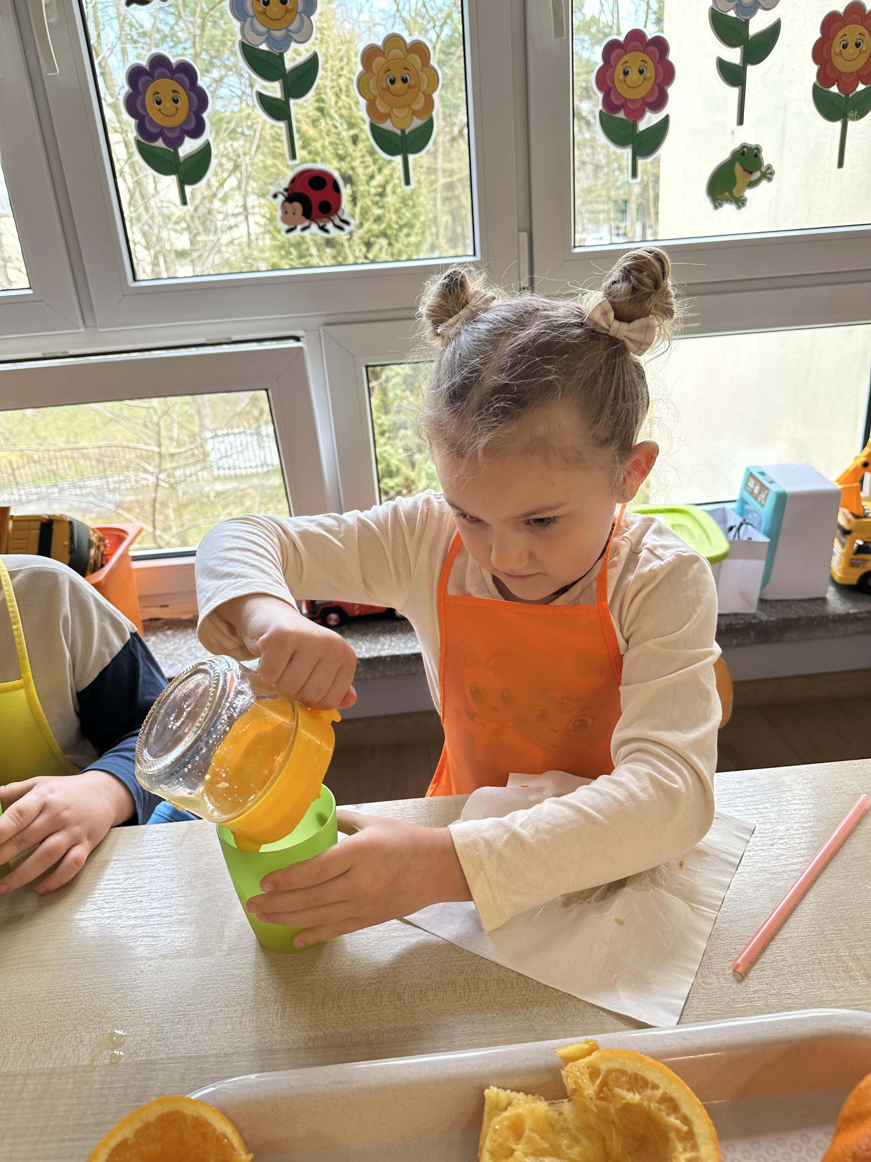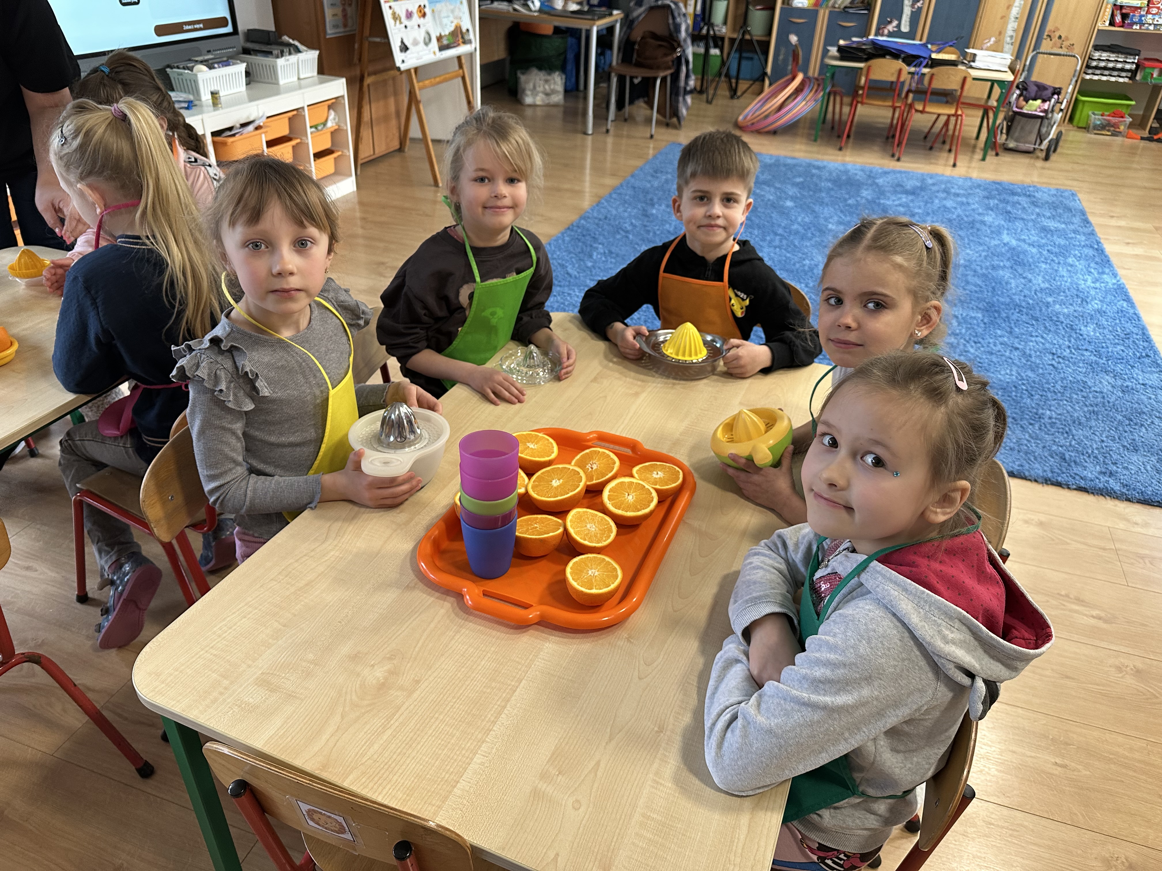Zajęcia rozpoczęły się od otrzymania listu od profesora Animka, który wprowadził dzieci w temat kolejnej przygody. Na podstawie wskazówek zawartych w liście dzieci odgadły, że bohaterką zajęć będzie pomarańcza - owoc kojarzący się z energią i charakterystycznym kolorem. Następnie dzieci wysłuchały opowiadania pt. „Energetyczna pomarańcza” autorstwa K. Michoń. Po wysłuchaniu tekstu odbyła się rozmowa na temat jego treści. Dzieci miały możliwość poznania pomarańczy wszystkimi zmysłami - dotykały jej, wąchały oraz smakowały. Zapoznały się również z informacjami dotyczącymi uprawy pomarańczy na podstawie ilustracji. Podczas zajęć ruchowych dzieci rozwijały umiejętność reagowania na zmianę rytmu i tempa muzyki poprzez zabawy z balonem. Wykonały także pracę plastyczną przedstawiającą pomarańczę, rozwijając swoją kreatywność i zdolności manualne. W trakcie zabaw dydaktycznych dzieci doskonaliły umiejętności matematyczne, uczestnicząc w aktywności „Pomarańczowa matematyka”, polegającej między innymi na przyporządkowywaniu cyfr do odpowiedniej liczby pomarańczy. Starszaki brały również udział w eksperymencie „Czy pomarańcza pływa, czy tonie w wodzie?”, wyciągając własne wnioski i rozwijając umiejętność obserwacji. Dodatkowo dzieci ćwiczyły sprawność manualną podczas zajęć grafomotorycznych „Pomarańczowa grafomotoryka ”. Ważnym elementem zajęć było również rozwijanie samodzielności - dzieci samodzielnie przygotowały sok z pomarańczy. Na zakończenie dzieci poznały wartości odżywcze pomarańczy oraz umieściły ten owoc w „Skarbcu zaginionych składników odżywczych”, wzbogacając swoją wiedzę na temat zdrowego odżywiania.