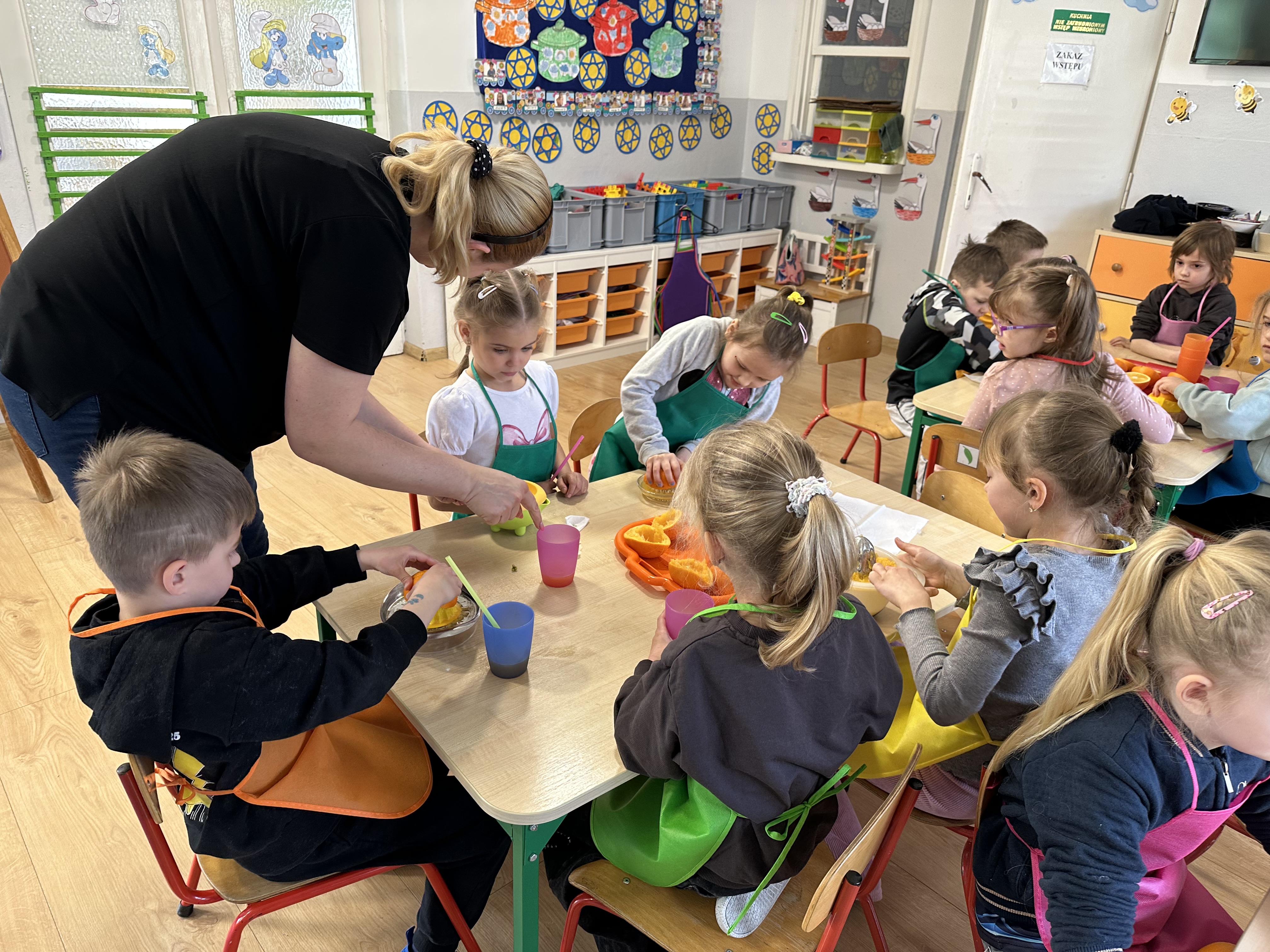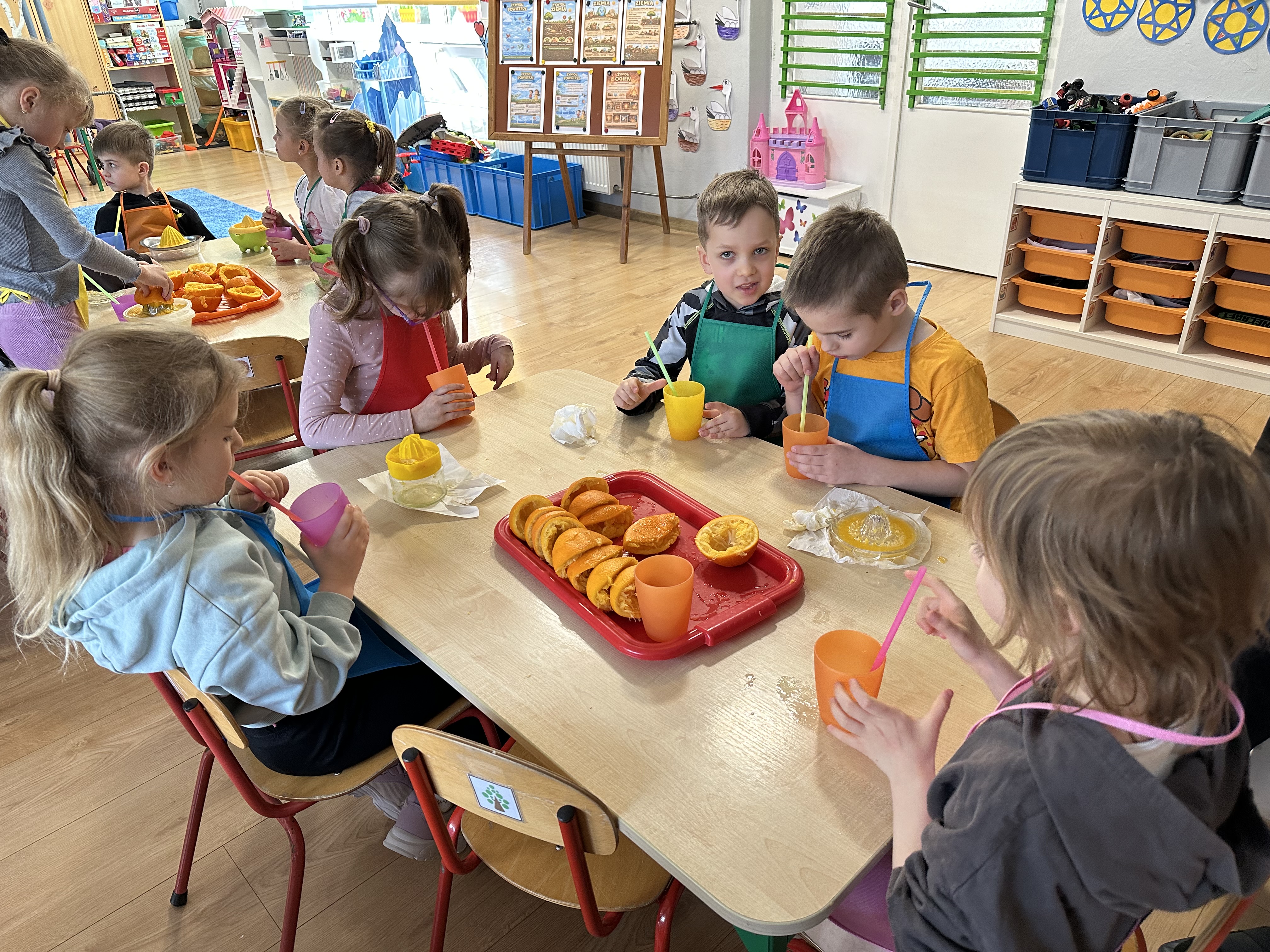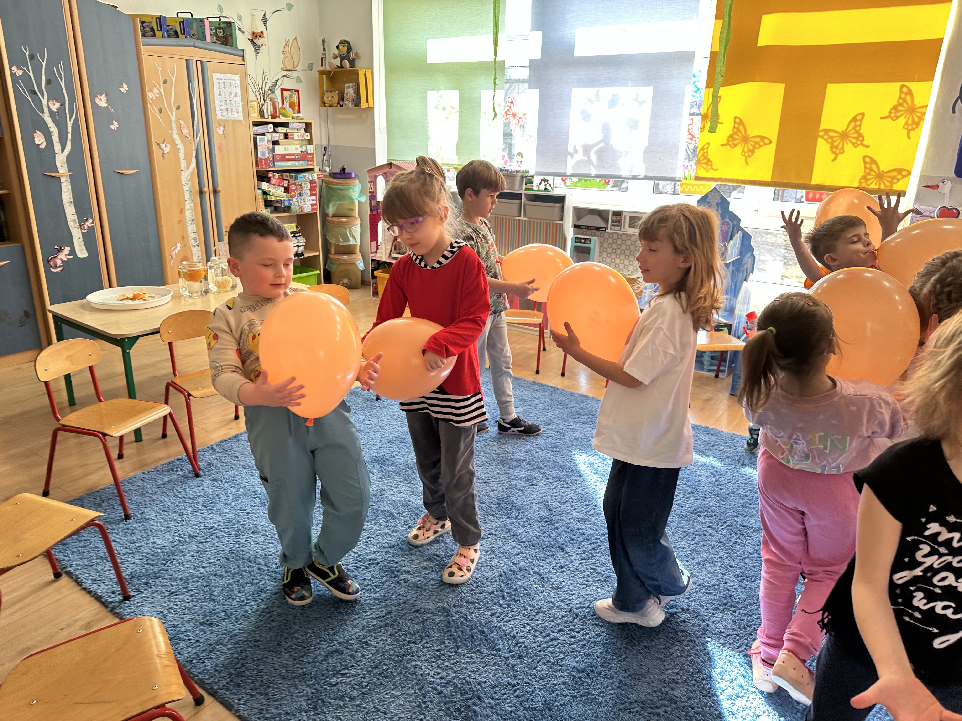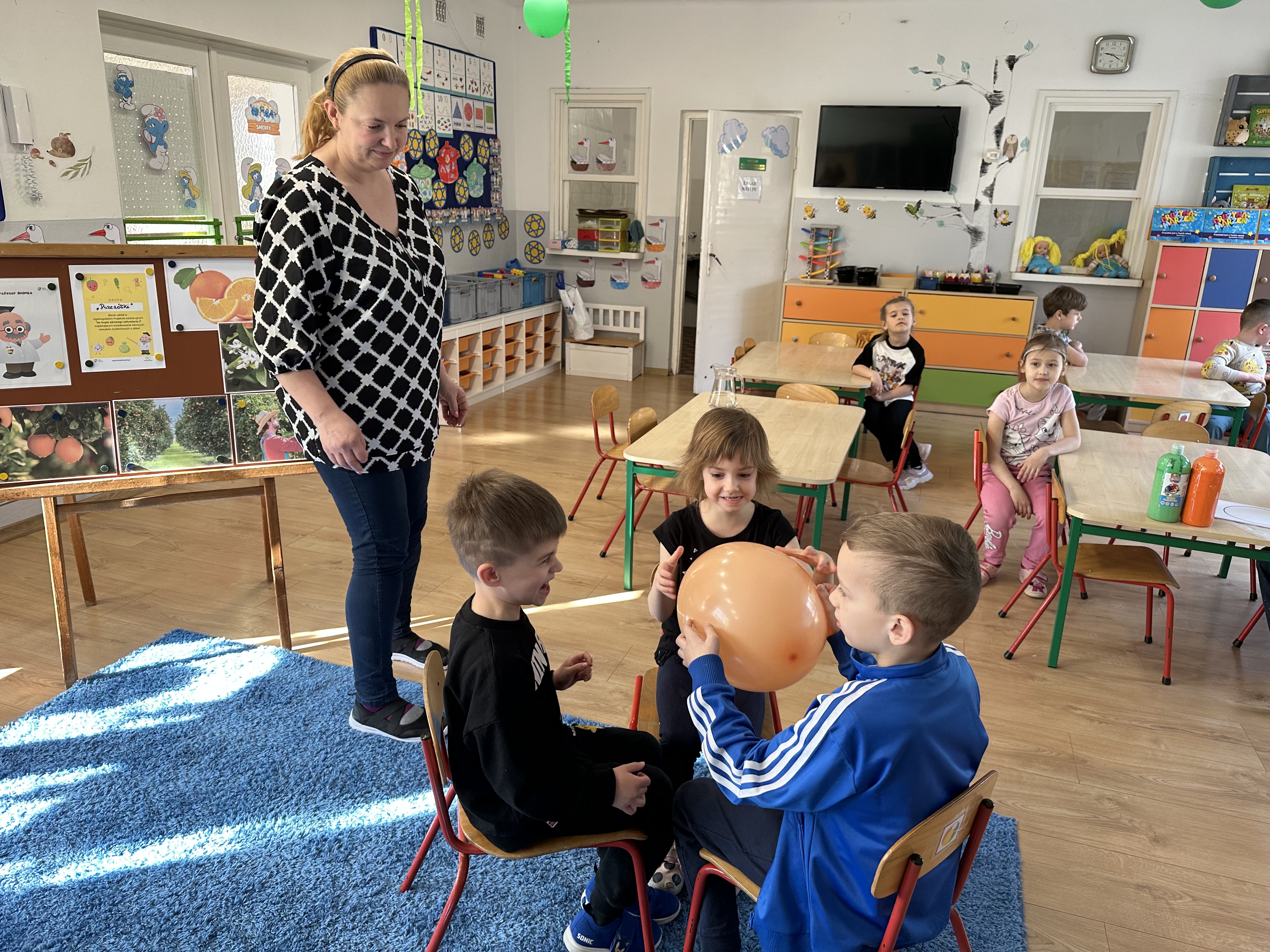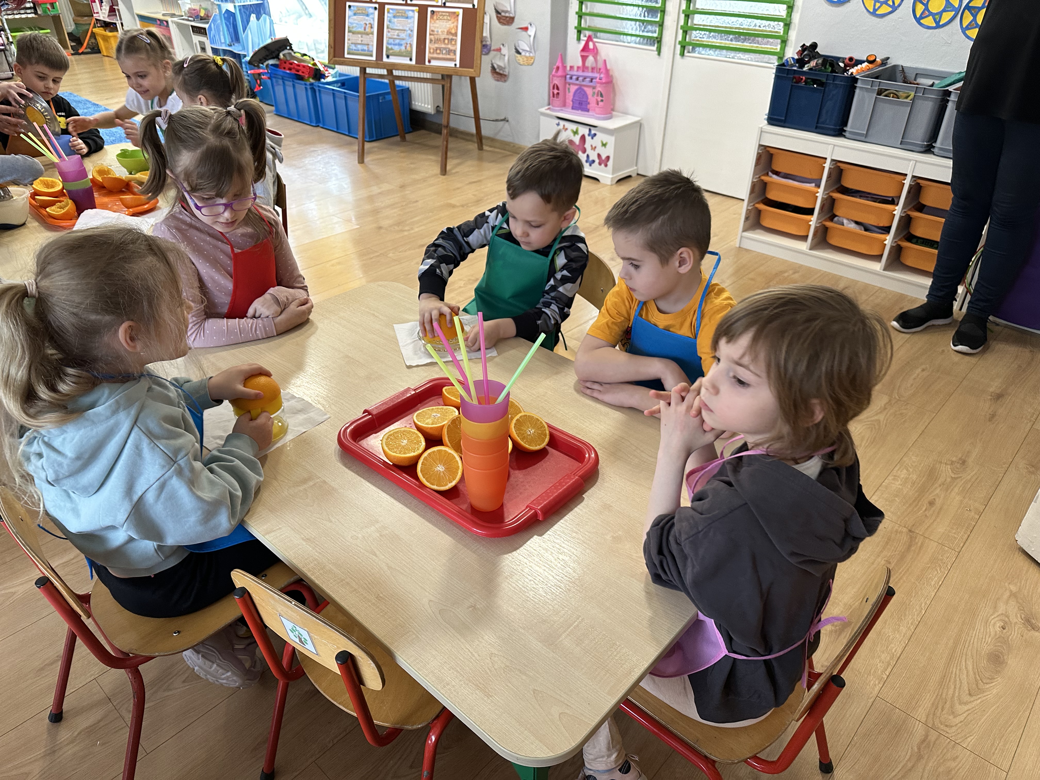 Zajęcia rozpoczęły się od otrzymania listu od profesora Animka, który wprowadził dzieci w temat kolejnej przygody. Na podstawie wskazówek zawartych w liście dzieci odgadły, że bohaterką zajęć będzie pomarańcza - owoc kojarzący się z energią i charakterystycznym kolorem. Następnie dzieci wysłuchały opowiadania pt. „Energetyczna pomarańcza” autorstwa K. Michoń. Po wysłuchaniu tekstu odbyła się rozmowa na temat jego treści. Dzieci miały możliwość poznania pomarańczy wszystkimi zmysłami - dotykały jej, wąchały oraz smakowały. Zapoznały się również z informacjami dotyczącymi uprawy pomarańczy na podstawie ilustracji. Podczas zajęć ruchowych dzieci rozwijały umiejętność reagowania na zmianę rytmu i tempa muzyki poprzez zabawy z balonem. Wykonały także pracę plastyczną przedstawiającą pomarańczę, rozwijając swoją kreatywność i zdolności manualne. W trakcie zabaw dydaktycznych dzieci doskonaliły umiejętności matematyczne, uczestnicząc w aktywności „Pomarańczowa matematyka”, polegającej między innymi na przyporządkowywaniu cyfr do odpowiedniej liczby pomarańczy. Starszaki brały również udział w eksperymencie „Czy pomarańcza pływa, czy tonie w wodzie?”, wyciągając własne wnioski i rozwijając umiejętność obserwacji. Dodatkowo dzieci ćwiczyły sprawność manualną podczas zajęć grafomotorycznych „Pomarańczowa grafomotoryka ”. Ważnym elementem zajęć było również rozwijanie samodzielności - dzieci samodzielnie przygotowały sok z pomarańczy. Na zakończenie dzieci poznały wartości odżywcze pomarańczy oraz umieściły ten owoc w „Skarbcu zaginionych składników odżywczych”, wzbogacając swoją wiedzę na temat zdrowego odżywiania.