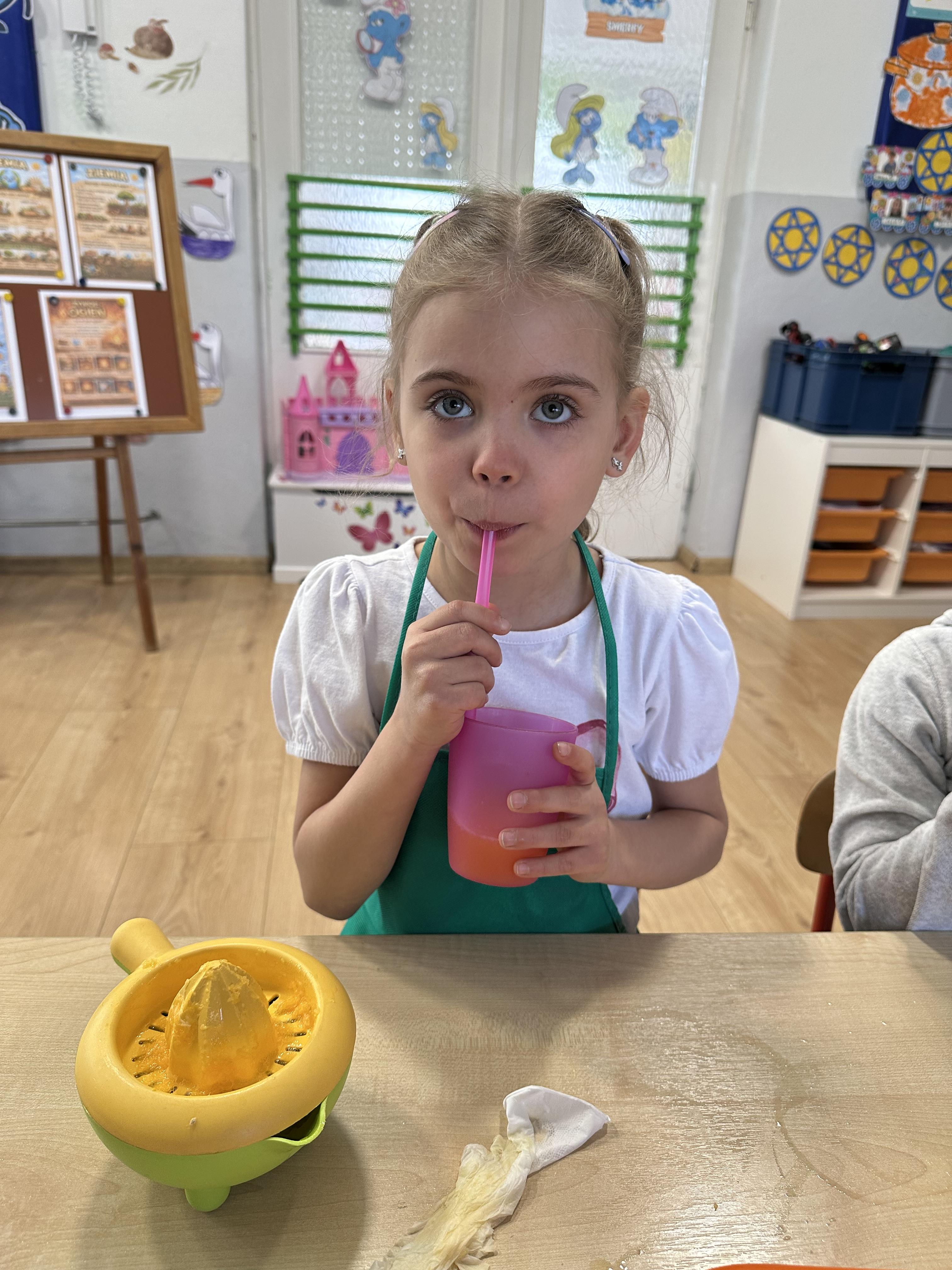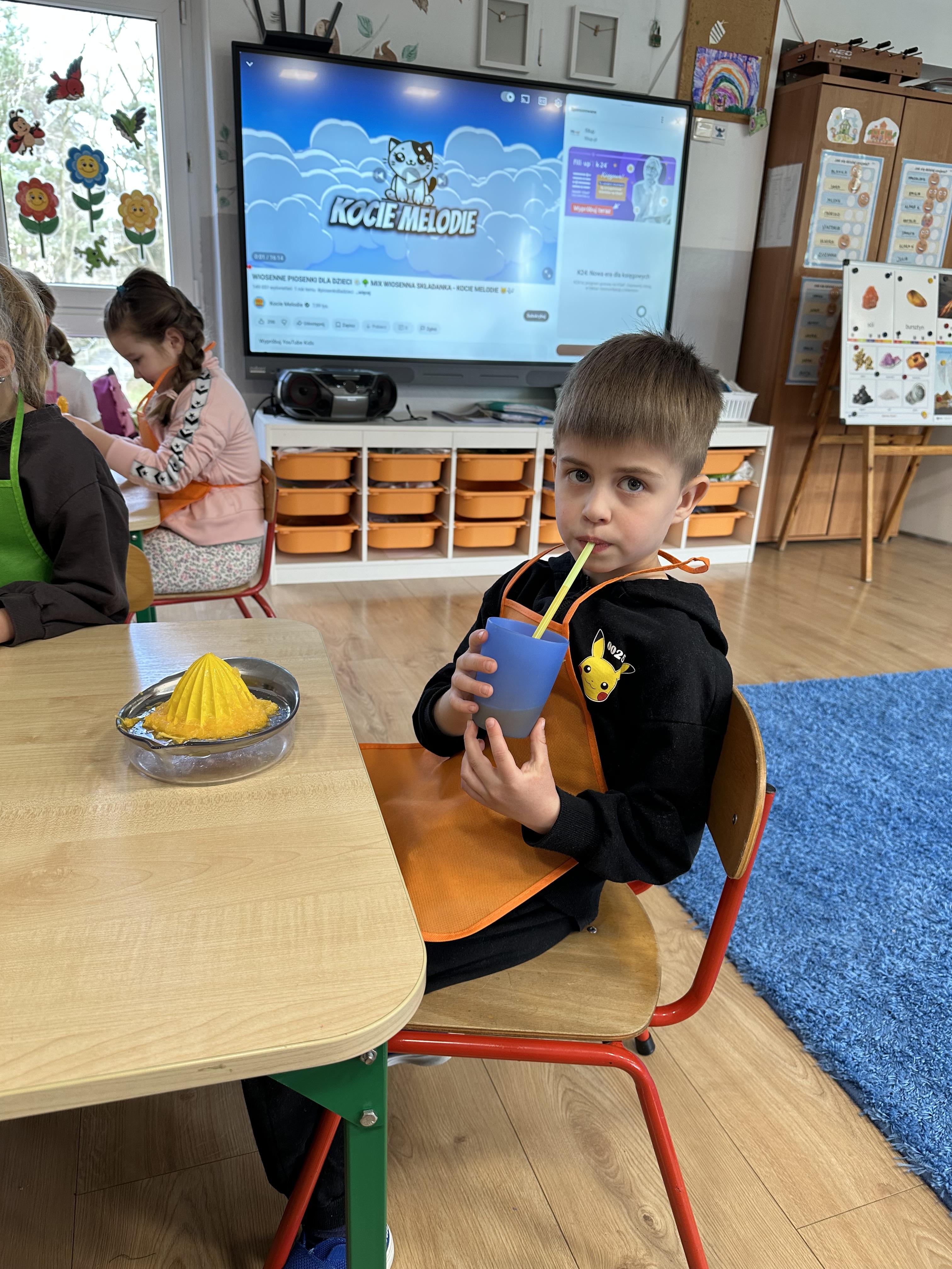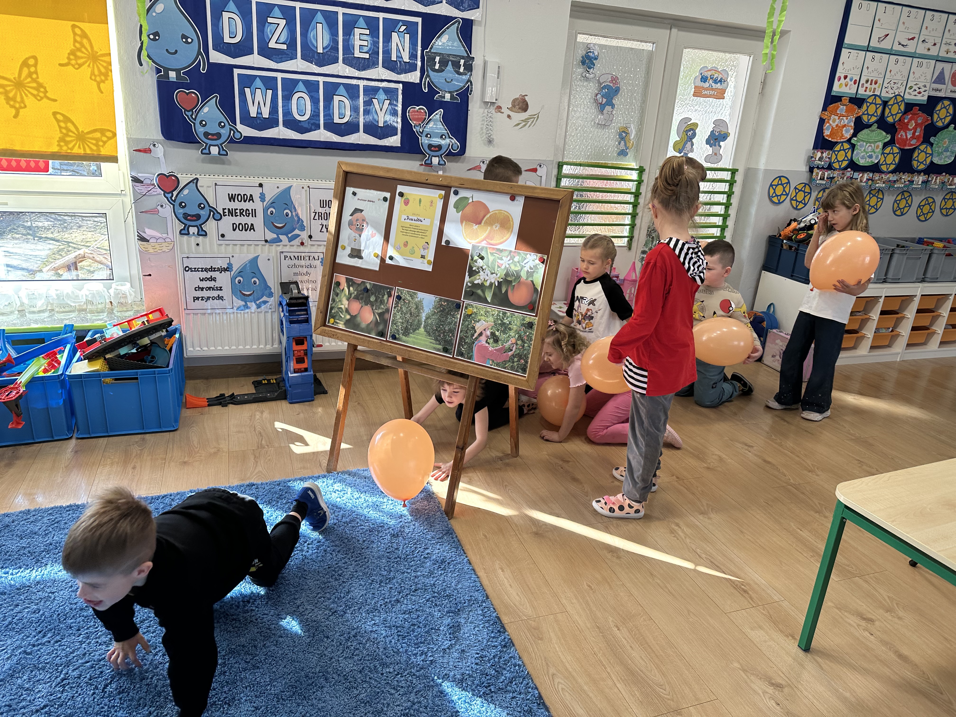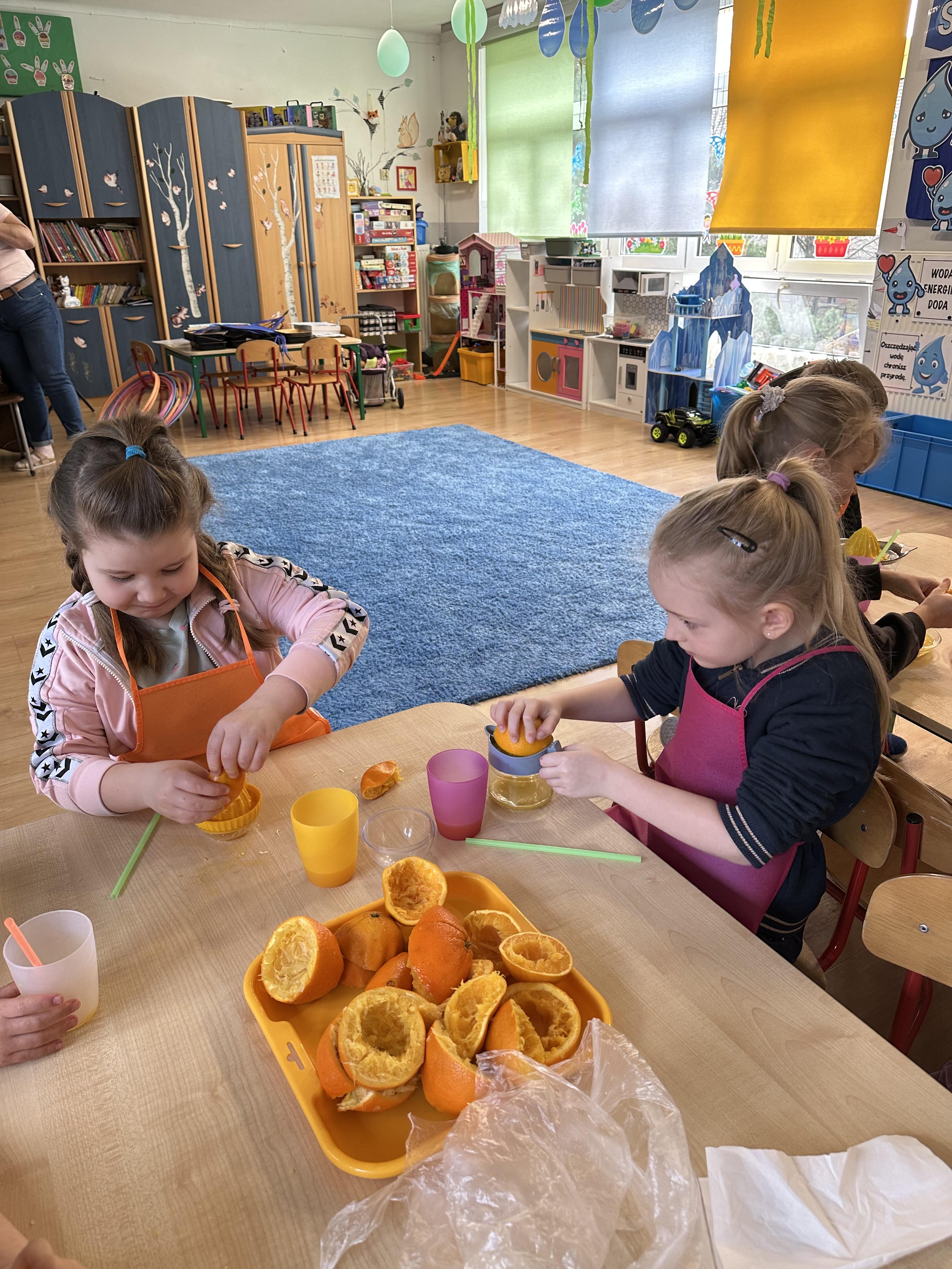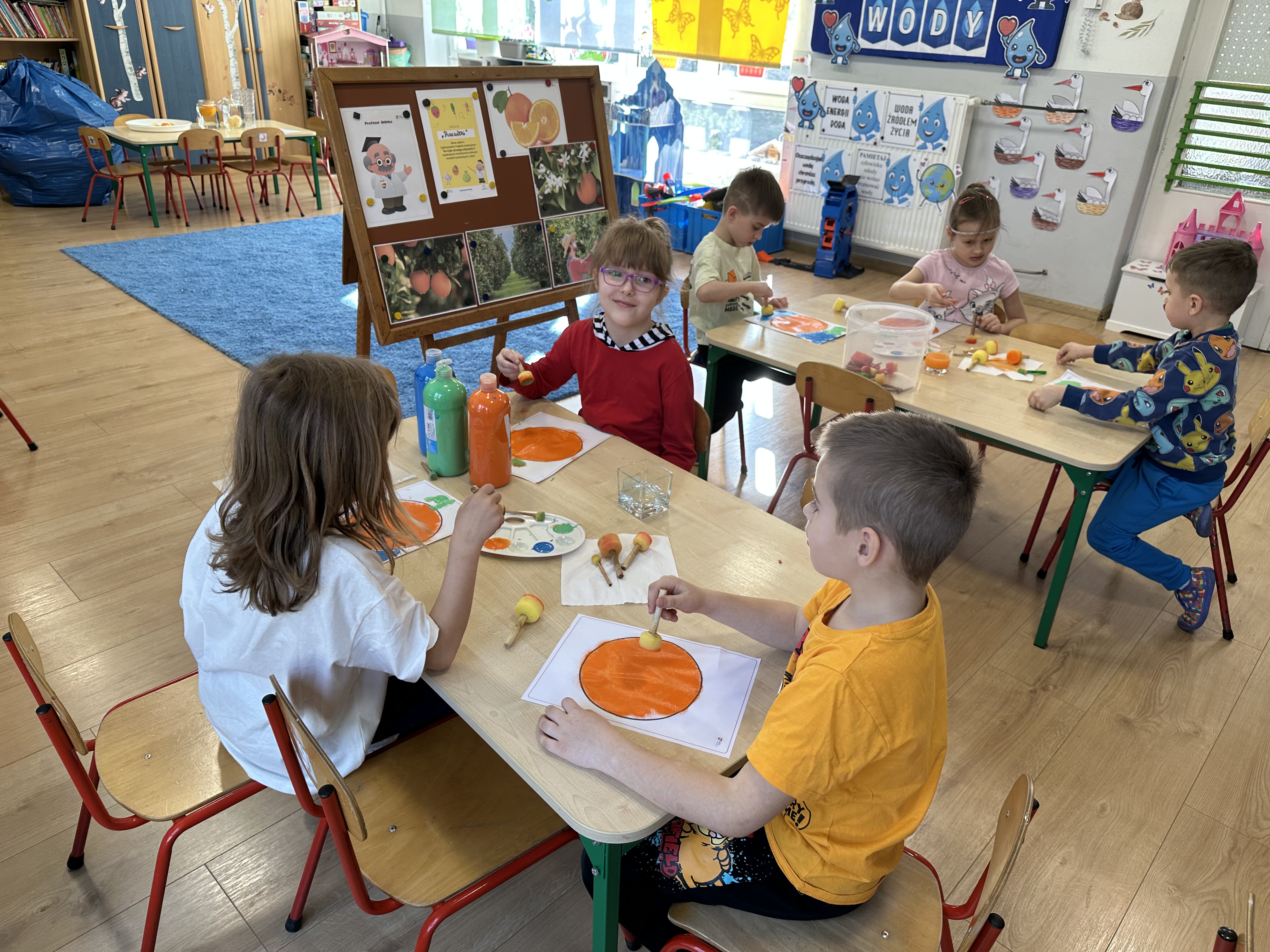 Zajęcia rozpoczęły się od otrzymania listu od profesora Animka, który wprowadził dzieci w temat kolejnej przygody. Na podstawie wskazówek zawartych w liście dzieci odgadły, że bohaterką zajęć będzie pomarańcza - owoc kojarzący się z energią i charakterystycznym kolorem. Następnie dzieci wysłuchały opowiadania pt. „Energetyczna pomarańcza” autorstwa K. Michoń. Po wysłuchaniu tekstu odbyła się rozmowa na temat jego treści. Dzieci miały możliwość poznania pomarańczy wszystkimi zmysłami - dotykały jej, wąchały oraz smakowały. Zapoznały się również z informacjami dotyczącymi uprawy pomarańczy na podstawie ilustracji. Podczas zajęć ruchowych dzieci rozwijały umiejętność reagowania na zmianę rytmu i tempa muzyki poprzez zabawy z balonem. Wykonały także pracę plastyczną przedstawiającą pomarańczę, rozwijając swoją kreatywność i zdolności manualne. W trakcie zabaw dydaktycznych dzieci doskonaliły umiejętności matematyczne, uczestnicząc w aktywności „Pomarańczowa matematyka”, polegającej między innymi na przyporządkowywaniu cyfr do odpowiedniej liczby pomarańczy. Starszaki brały również udział w eksperymencie „Czy pomarańcza pływa, czy tonie w wodzie?”, wyciągając własne wnioski i rozwijając umiejętność obserwacji. Dodatkowo dzieci ćwiczyły sprawność manualną podczas zajęć grafomotorycznych „Pomarańczowa grafomotoryka ”. Ważnym elementem zajęć było również rozwijanie samodzielności - dzieci samodzielnie przygotowały sok z pomarańczy. Na zakończenie dzieci poznały wartości odżywcze pomarańczy oraz umieściły ten owoc w „Skarbcu zaginionych składników odżywczych”, wzbogacając swoją wiedzę na temat zdrowego odżywiania.