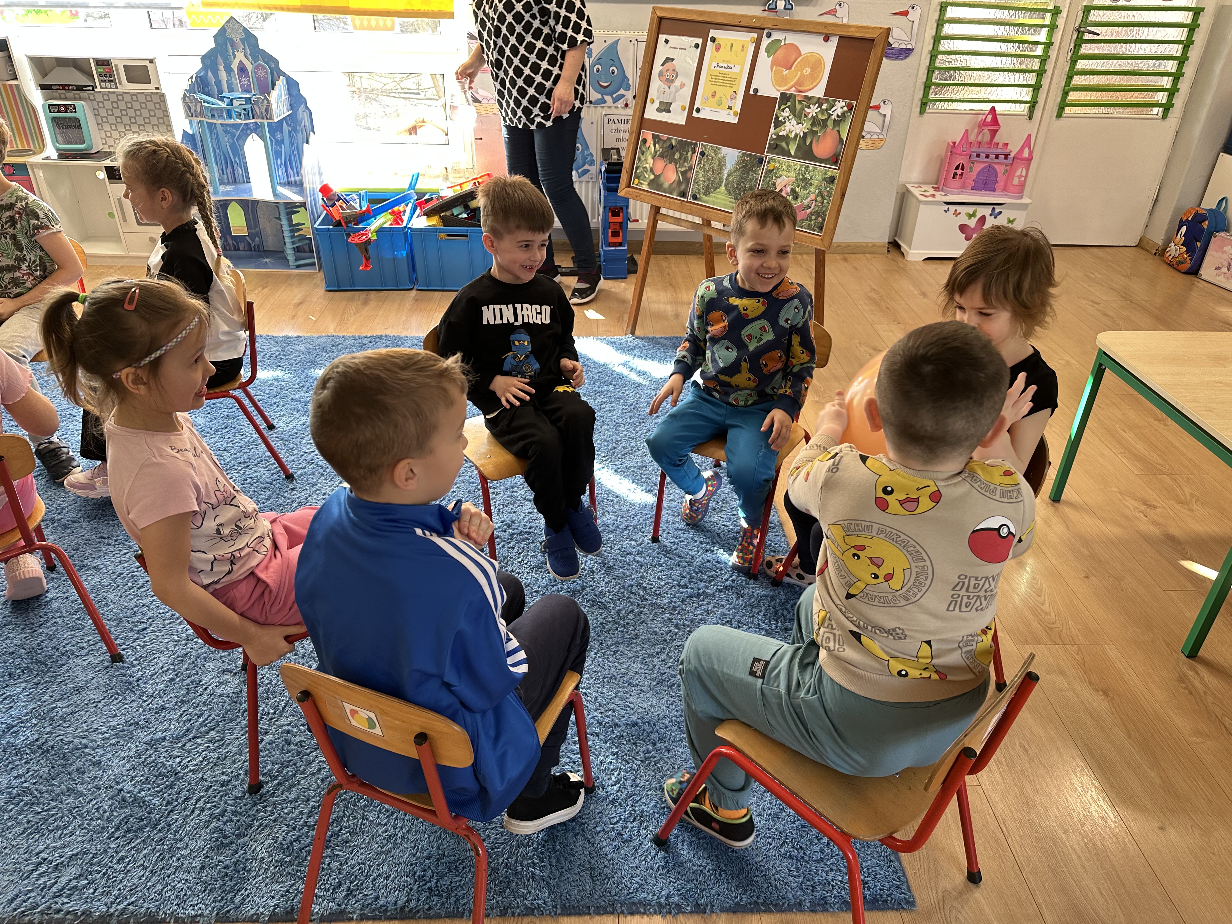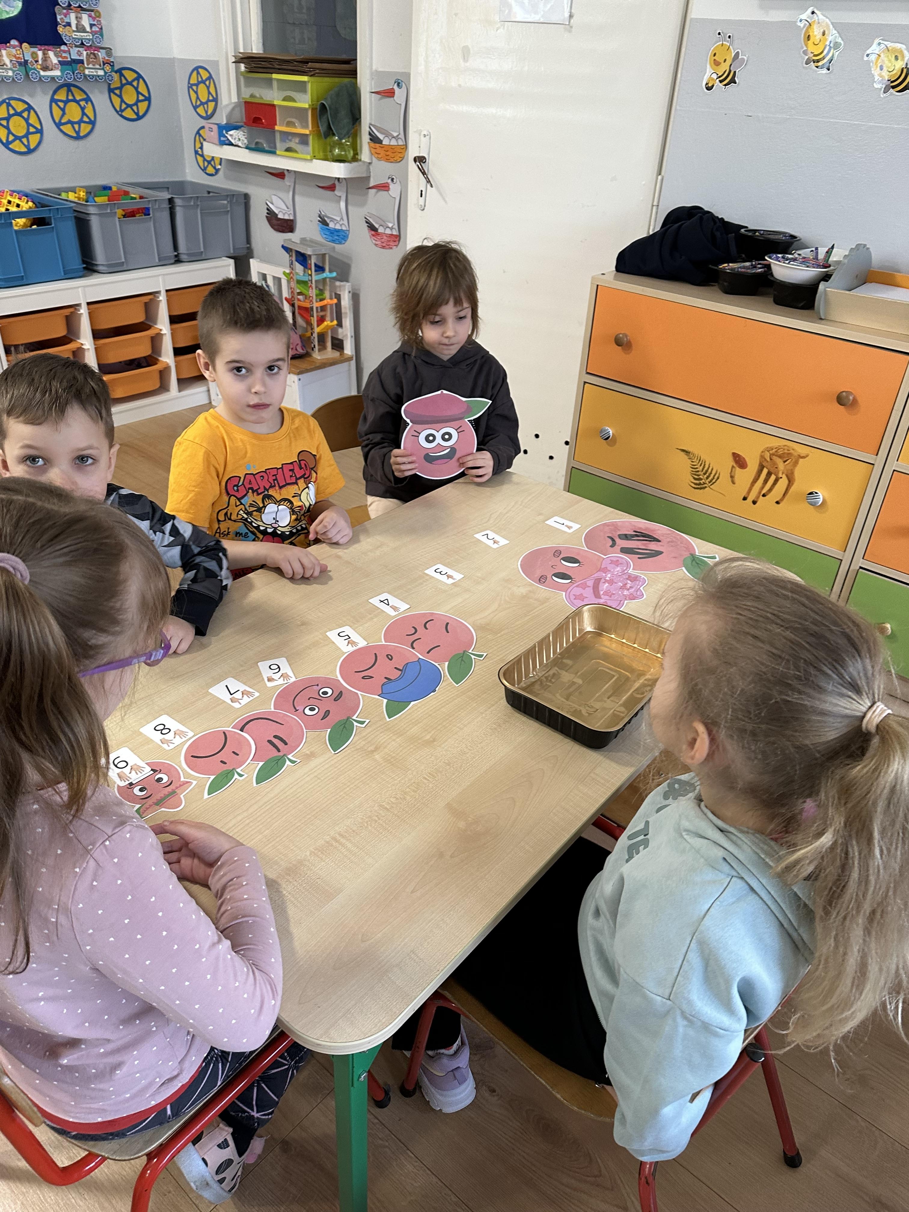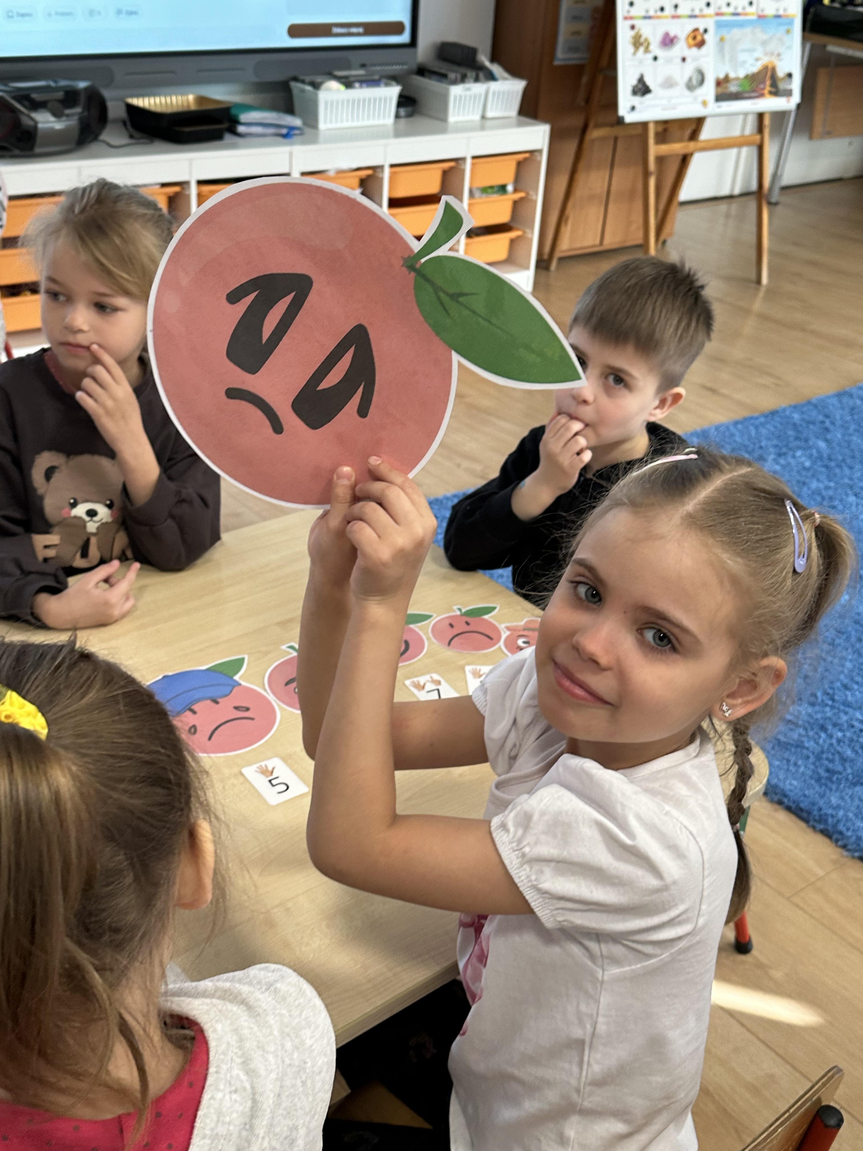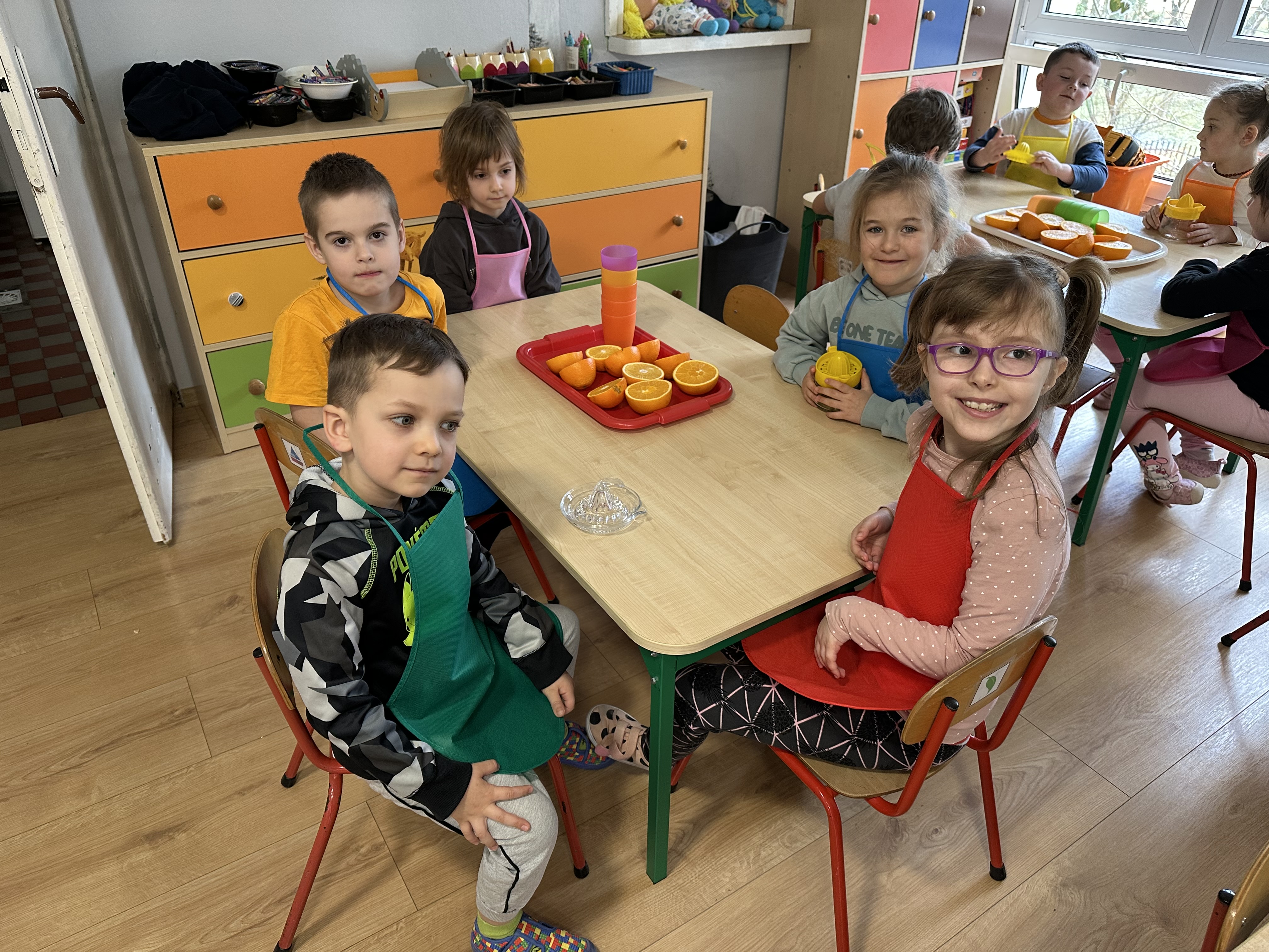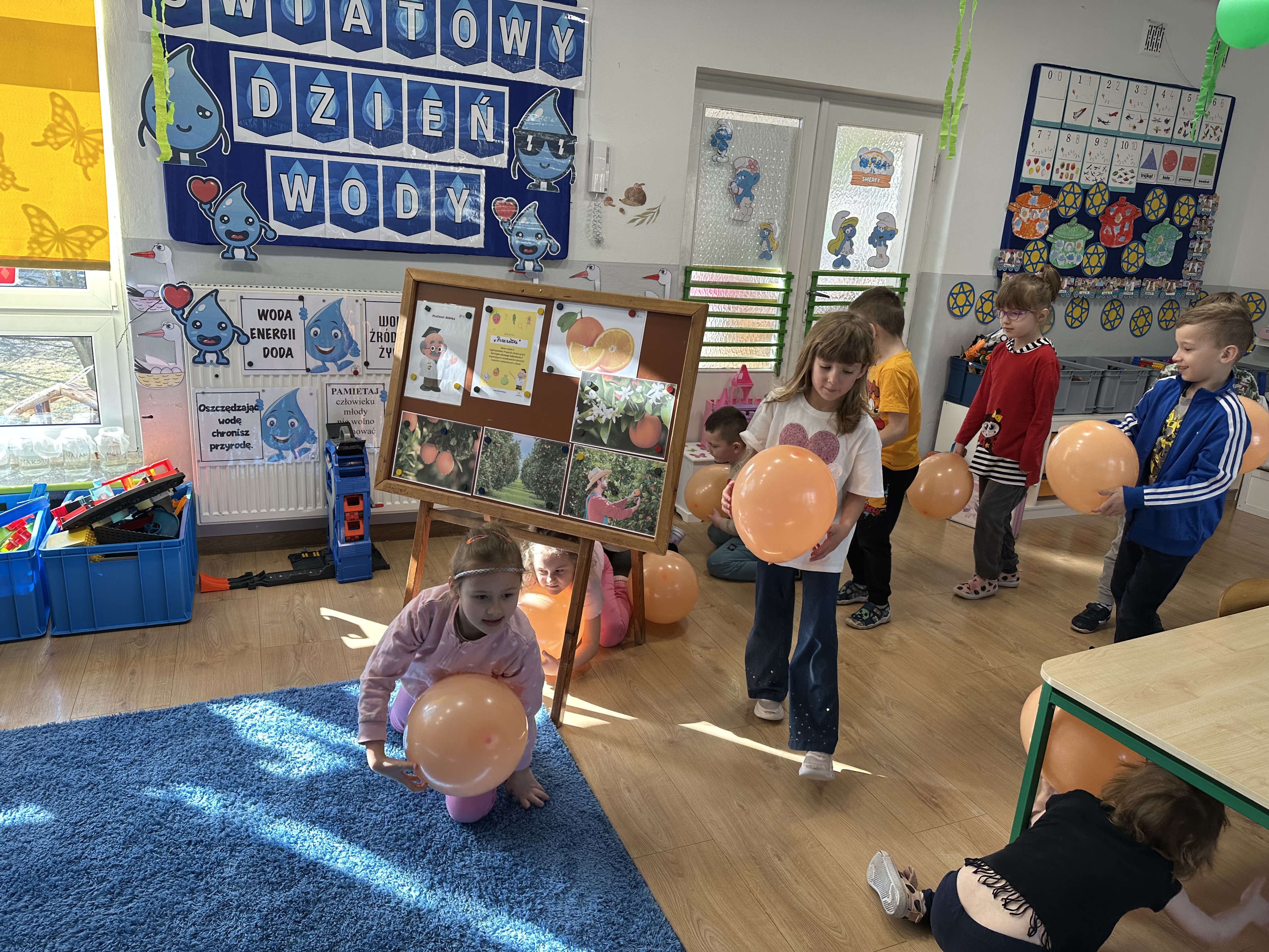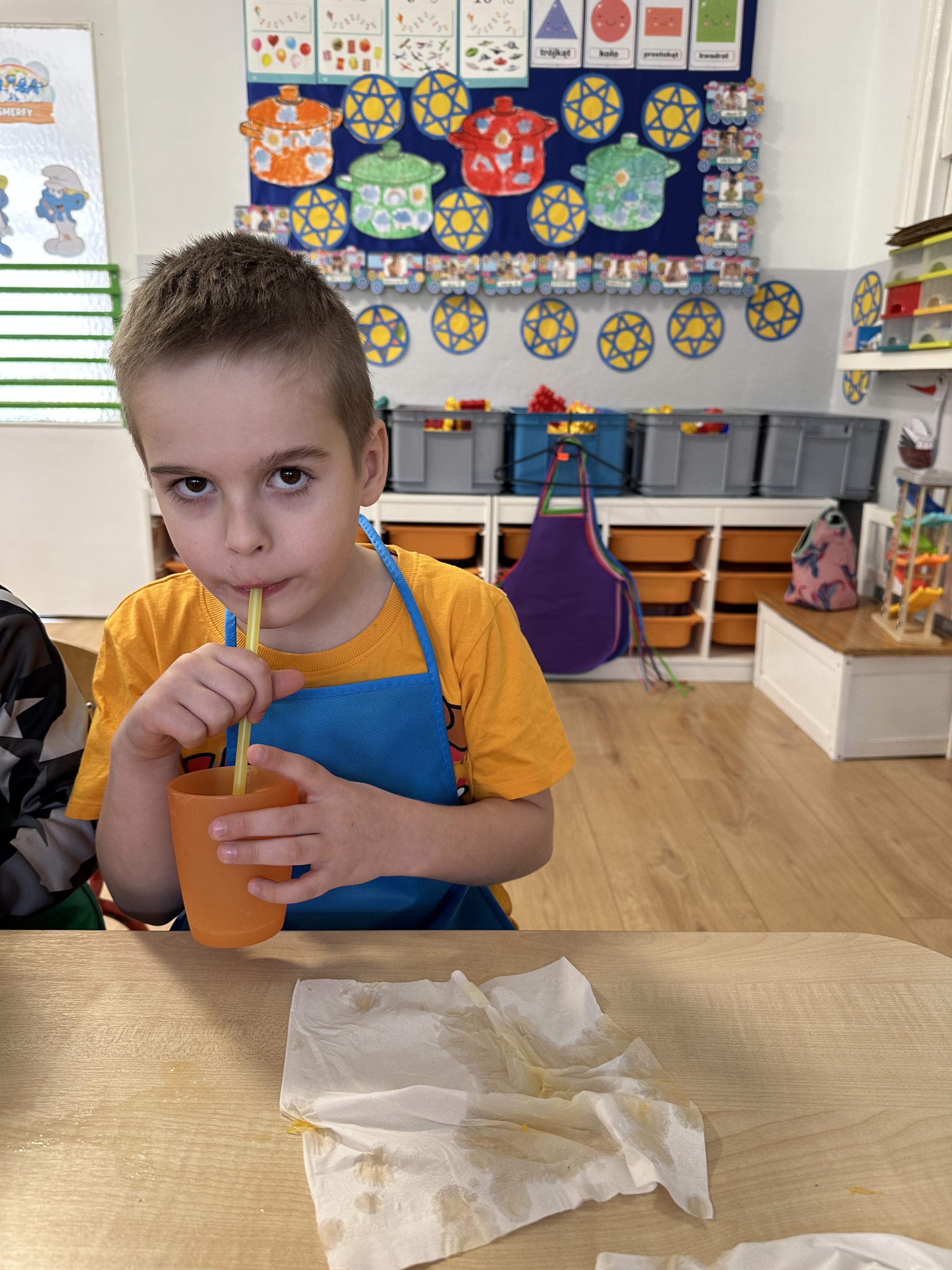 Zajęcia rozpoczęły się od otrzymania listu od profesora Animka, który wprowadził dzieci w temat kolejnej przygody. Na podstawie wskazówek zawartych w liście dzieci odgadły, że bohaterką zajęć będzie pomarańcza - owoc kojarzący się z energią i charakterystycznym kolorem. Następnie dzieci wysłuchały opowiadania pt. „Energetyczna pomarańcza” autorstwa K. Michoń. Po wysłuchaniu tekstu odbyła się rozmowa na temat jego treści. Dzieci miały możliwość poznania pomarańczy wszystkimi zmysłami - dotykały jej, wąchały oraz smakowały. Zapoznały się również z informacjami dotyczącymi uprawy pomarańczy na podstawie ilustracji. Podczas zajęć ruchowych dzieci rozwijały umiejętność reagowania na zmianę rytmu i tempa muzyki poprzez zabawy z balonem. Wykonały także pracę plastyczną przedstawiającą pomarańczę, rozwijając swoją kreatywność i zdolności manualne. W trakcie zabaw dydaktycznych dzieci doskonaliły umiejętności matematyczne, uczestnicząc w aktywności „Pomarańczowa matematyka”, polegającej między innymi na przyporządkowywaniu cyfr do odpowiedniej liczby pomarańczy. Starszaki brały również udział w eksperymencie „Czy pomarańcza pływa, czy tonie w wodzie?”, wyciągając własne wnioski i rozwijając umiejętność obserwacji. Dodatkowo dzieci ćwiczyły sprawność manualną podczas zajęć grafomotorycznych „Pomarańczowa grafomotoryka ”. Ważnym elementem zajęć było również rozwijanie samodzielności - dzieci samodzielnie przygotowały sok z pomarańczy. Na zakończenie dzieci poznały wartości odżywcze pomarańczy oraz umieściły ten owoc w „Skarbcu zaginionych składników odżywczych”, wzbogacając swoją wiedzę na temat zdrowego odżywiania.