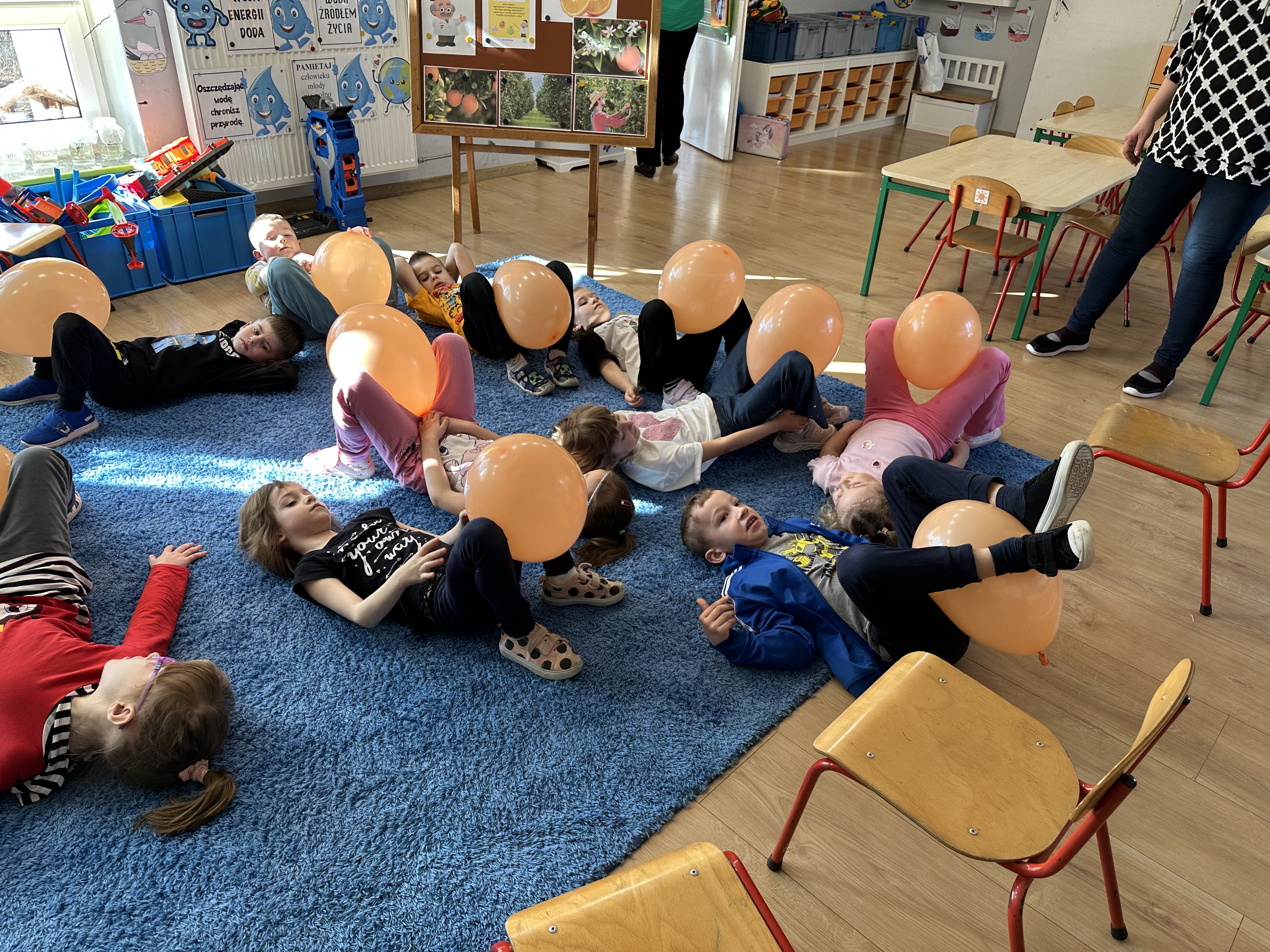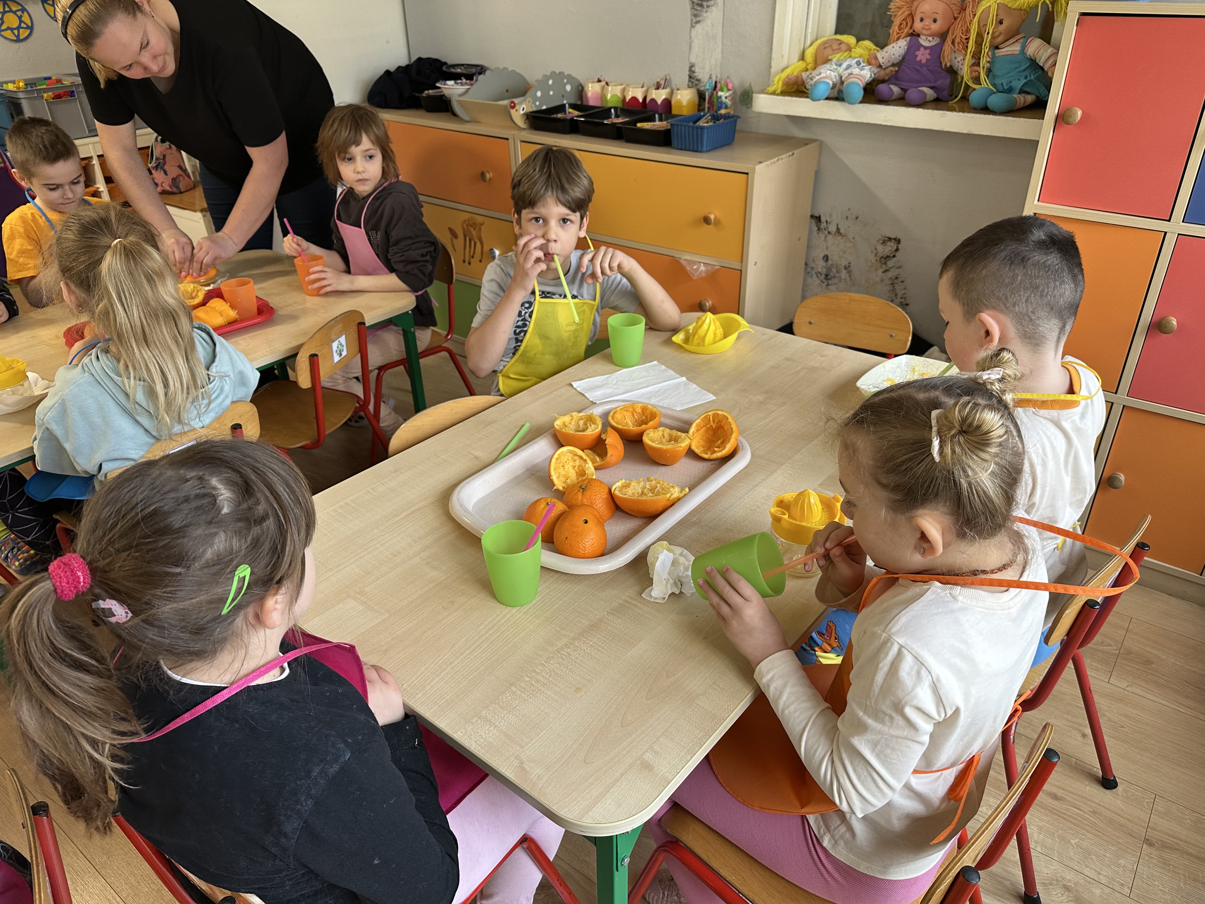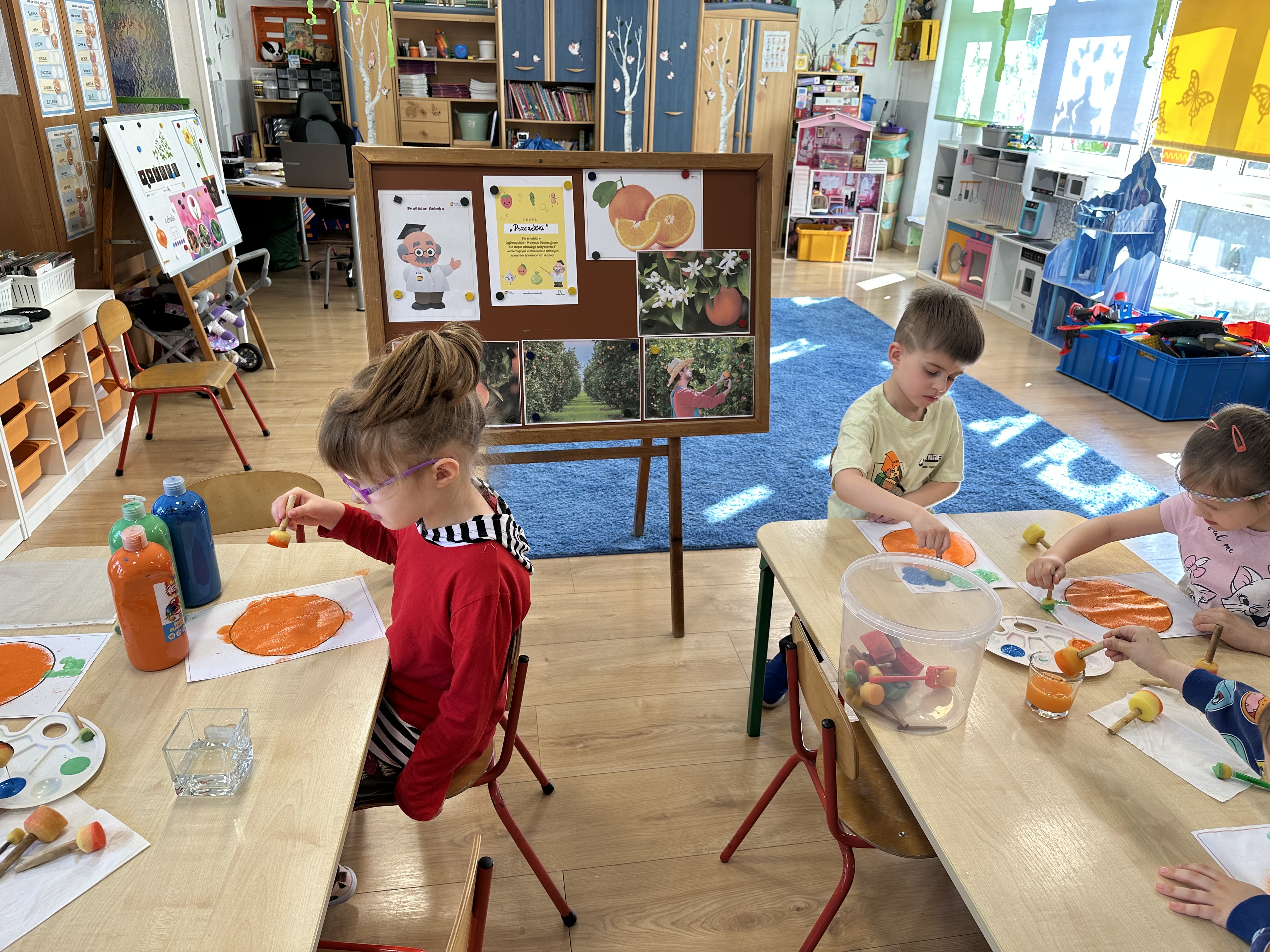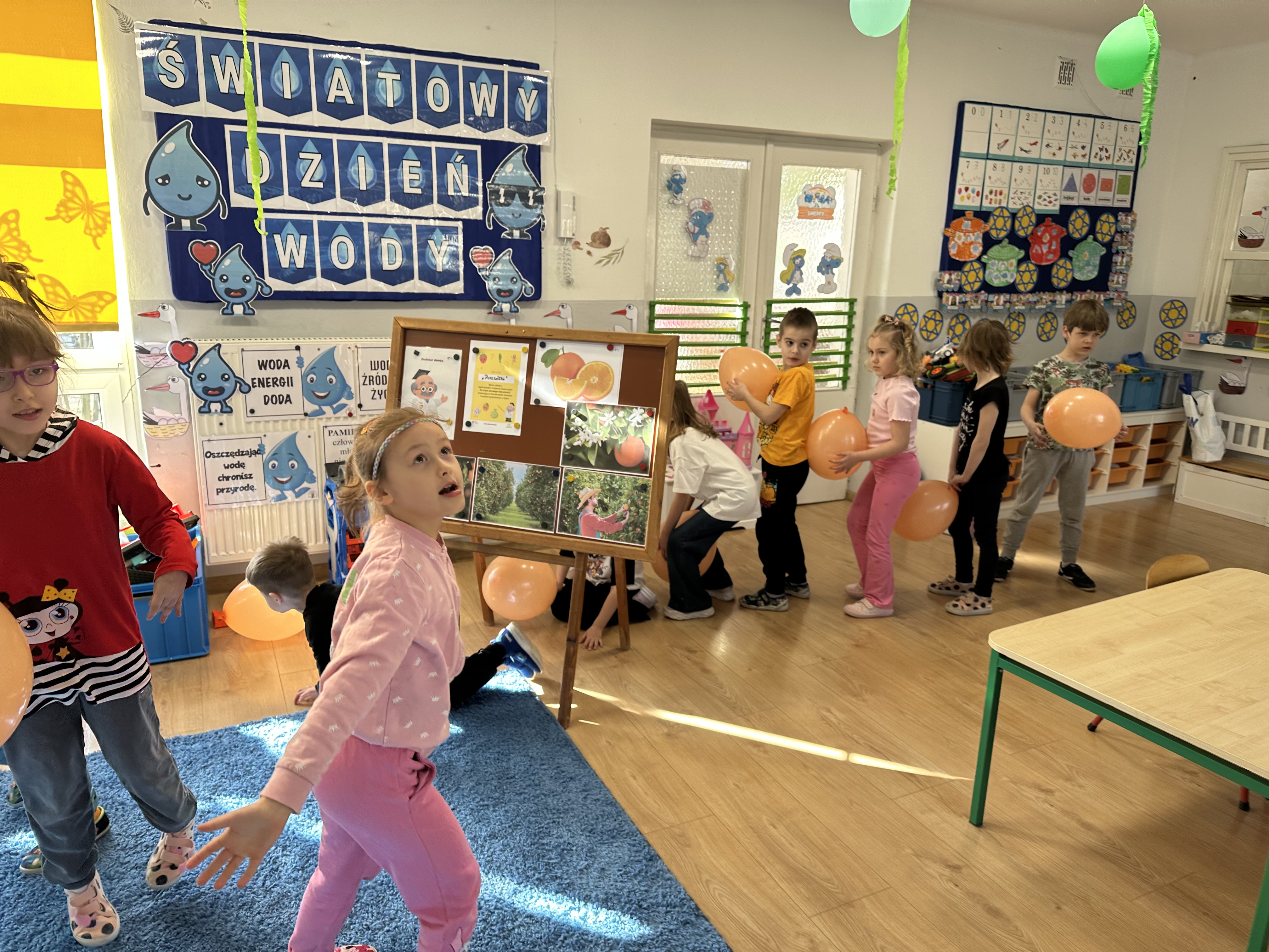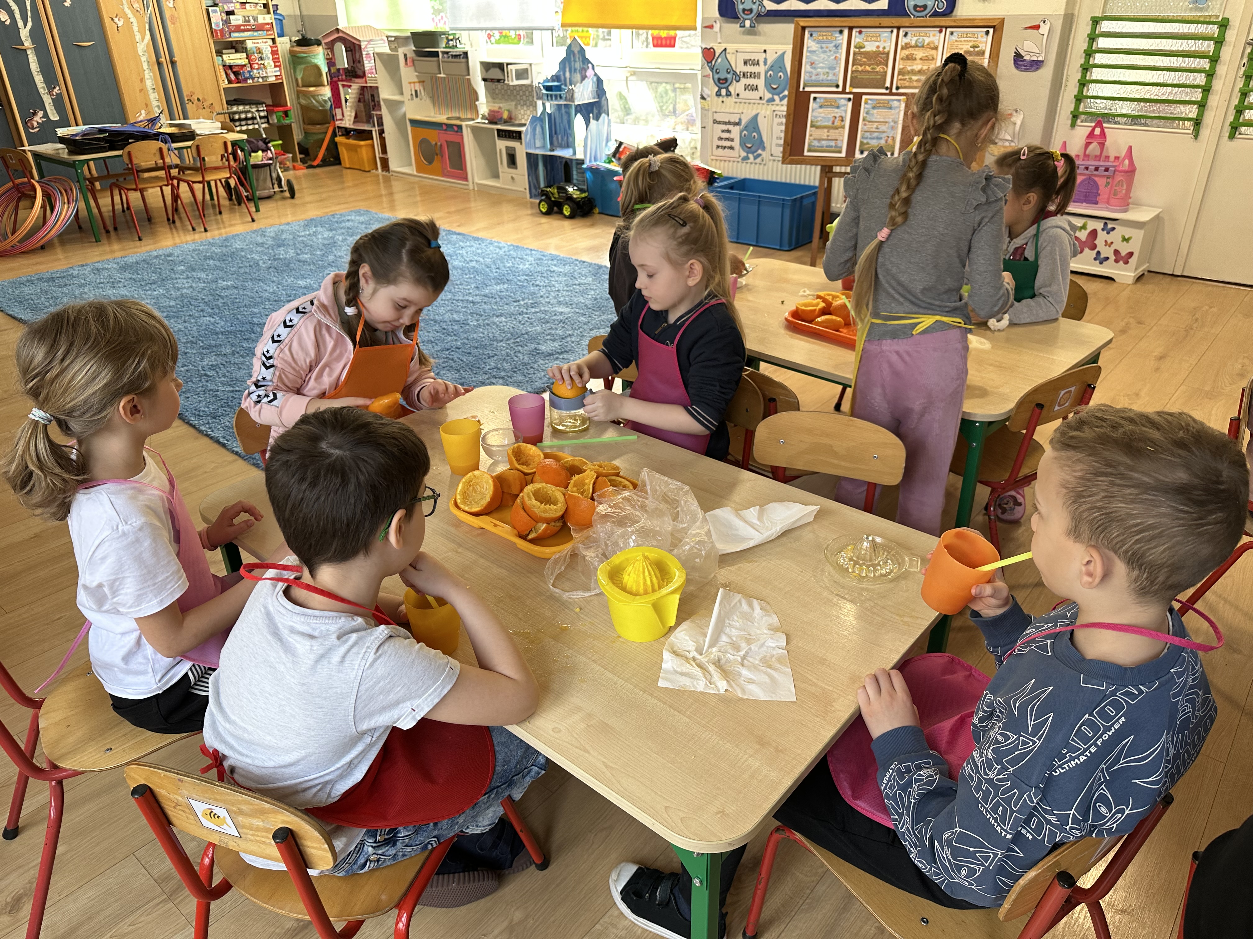 Zajęcia rozpoczęły się od otrzymania listu od profesora Animka, który wprowadził dzieci w temat kolejnej przygody. Na podstawie wskazówek zawartych w liście dzieci odgadły, że bohaterką zajęć będzie pomarańcza - owoc kojarzący się z energią i charakterystycznym kolorem. Następnie dzieci wysłuchały opowiadania pt. „Energetyczna pomarańcza” autorstwa K. Michoń. Po wysłuchaniu tekstu odbyła się rozmowa na temat jego treści. Dzieci miały możliwość poznania pomarańczy wszystkimi zmysłami - dotykały jej, wąchały oraz smakowały. Zapoznały się również z informacjami dotyczącymi uprawy pomarańczy na podstawie ilustracji. Podczas zajęć ruchowych dzieci rozwijały umiejętność reagowania na zmianę rytmu i tempa muzyki poprzez zabawy z balonem. Wykonały także pracę plastyczną przedstawiającą pomarańczę, rozwijając swoją kreatywność i zdolności manualne. W trakcie zabaw dydaktycznych dzieci doskonaliły umiejętności matematyczne, uczestnicząc w aktywności „Pomarańczowa matematyka”, polegającej między innymi na przyporządkowywaniu cyfr do odpowiedniej liczby pomarańczy. Starszaki brały również udział w eksperymencie „Czy pomarańcza pływa, czy tonie w wodzie?”, wyciągając własne wnioski i rozwijając umiejętność obserwacji. Dodatkowo dzieci ćwiczyły sprawność manualną podczas zajęć grafomotorycznych „Pomarańczowa grafomotoryka ”. Ważnym elementem zajęć było również rozwijanie samodzielności - dzieci samodzielnie przygotowały sok z pomarańczy. Na zakończenie dzieci poznały wartości odżywcze pomarańczy oraz umieściły ten owoc w „Skarbcu zaginionych składników odżywczych”, wzbogacając swoją wiedzę na temat zdrowego odżywiania.