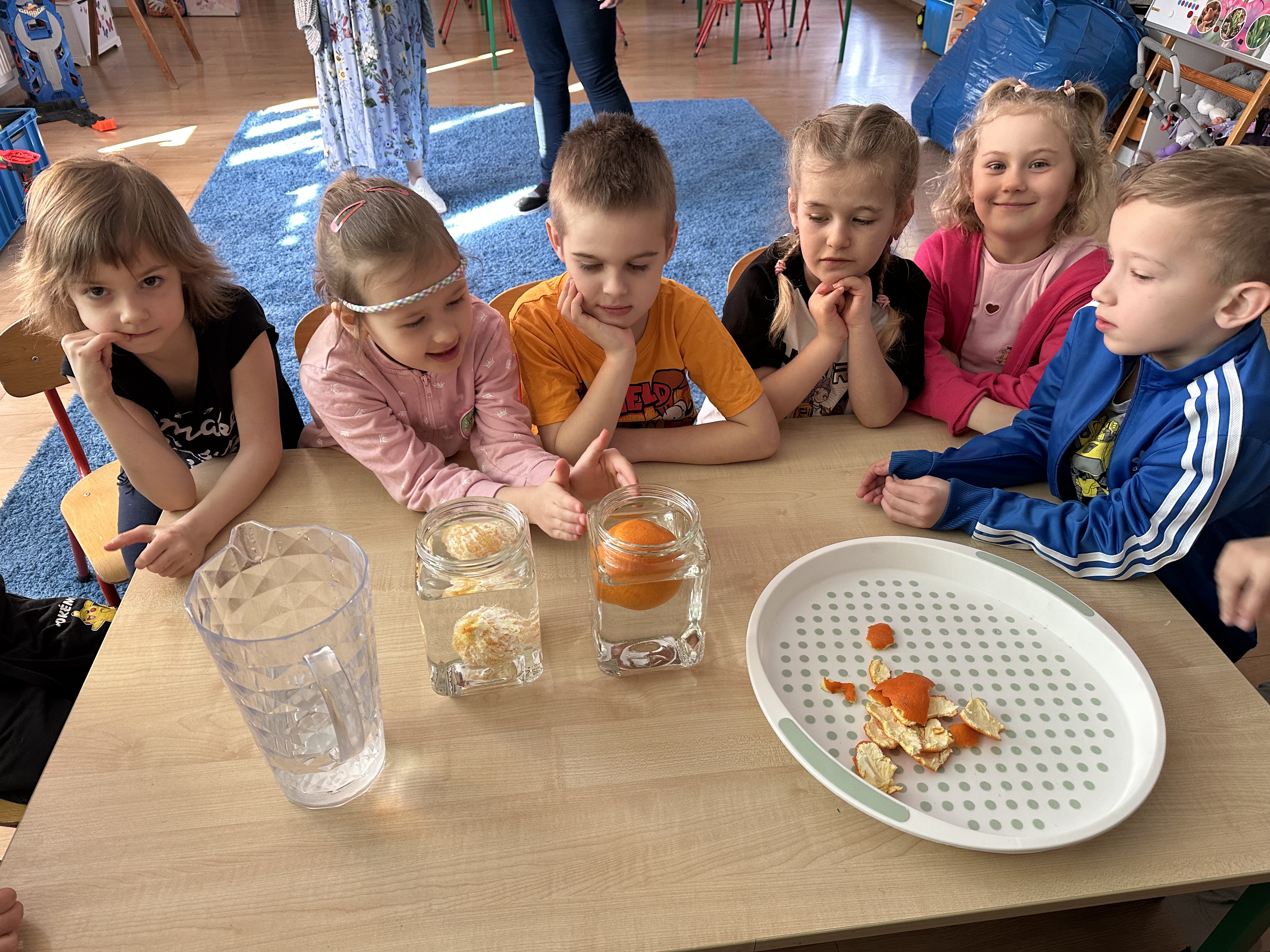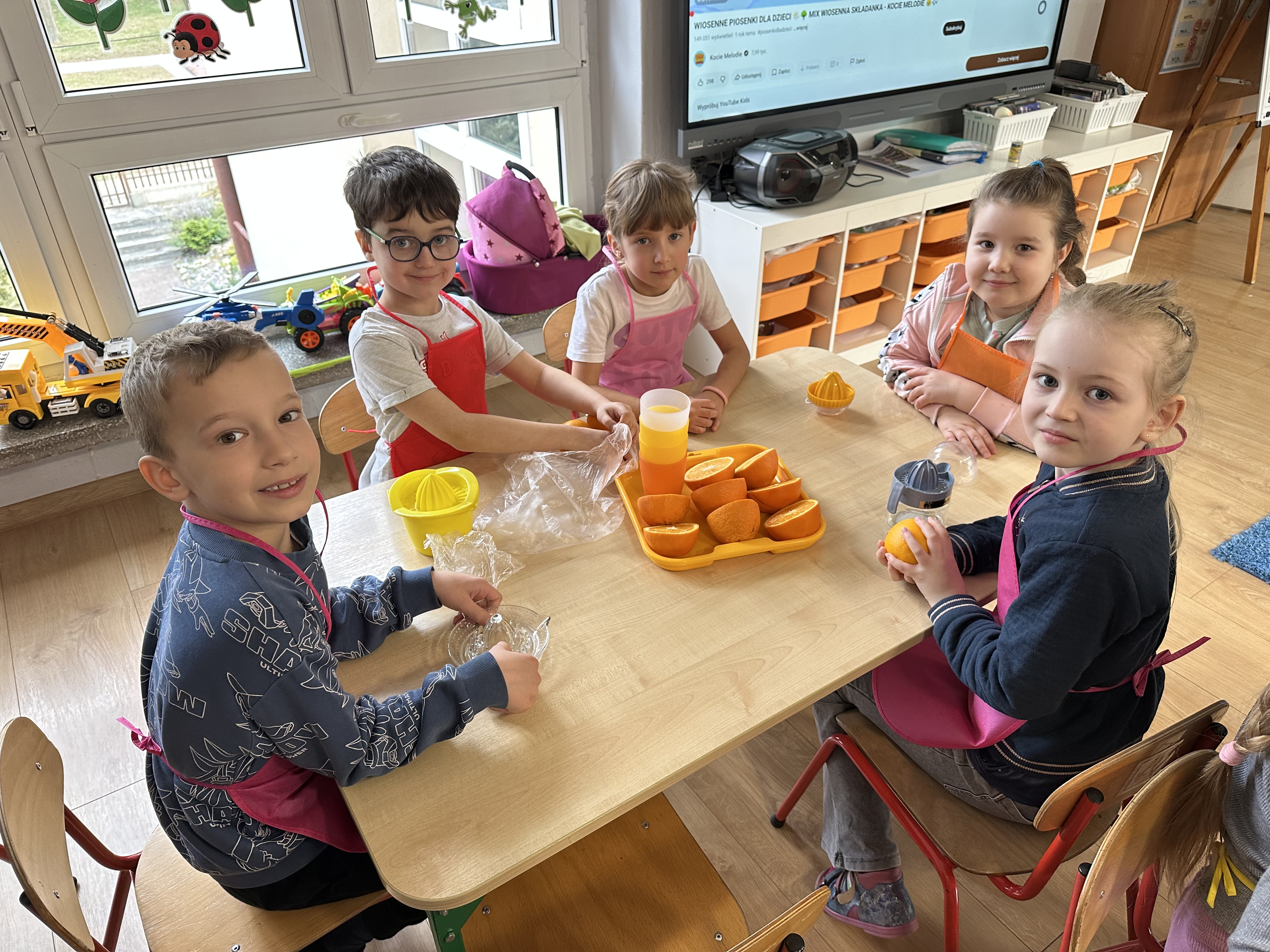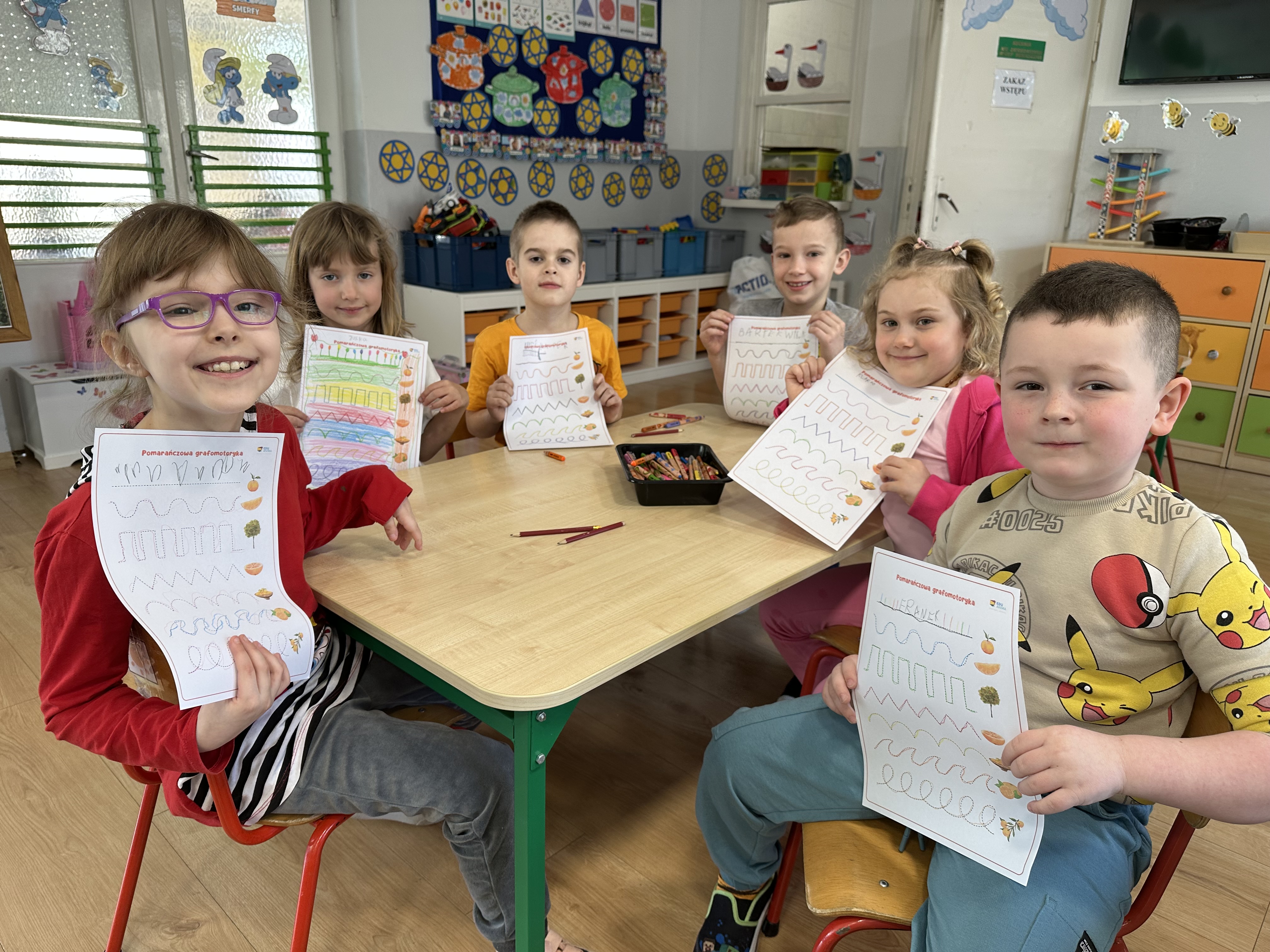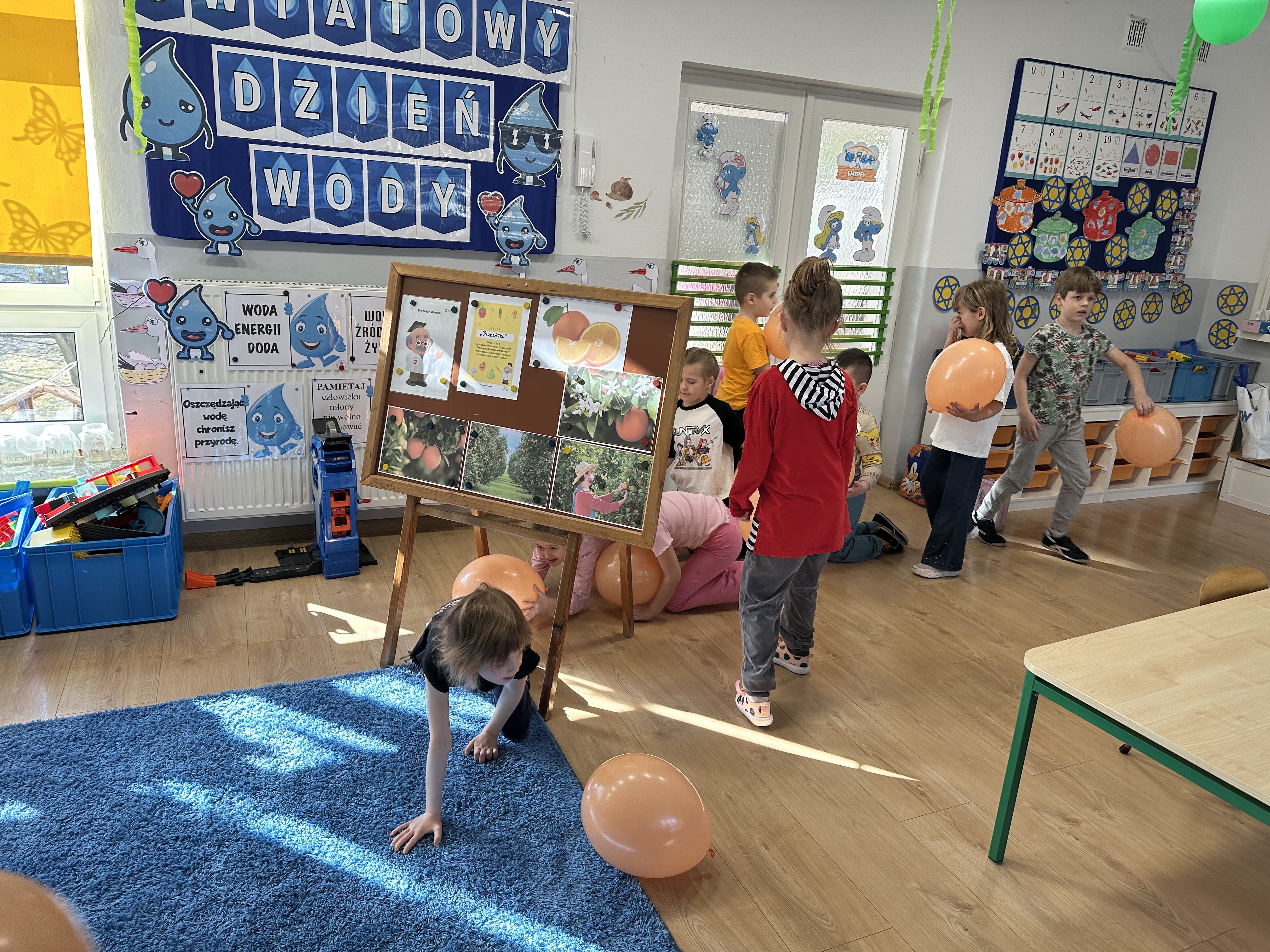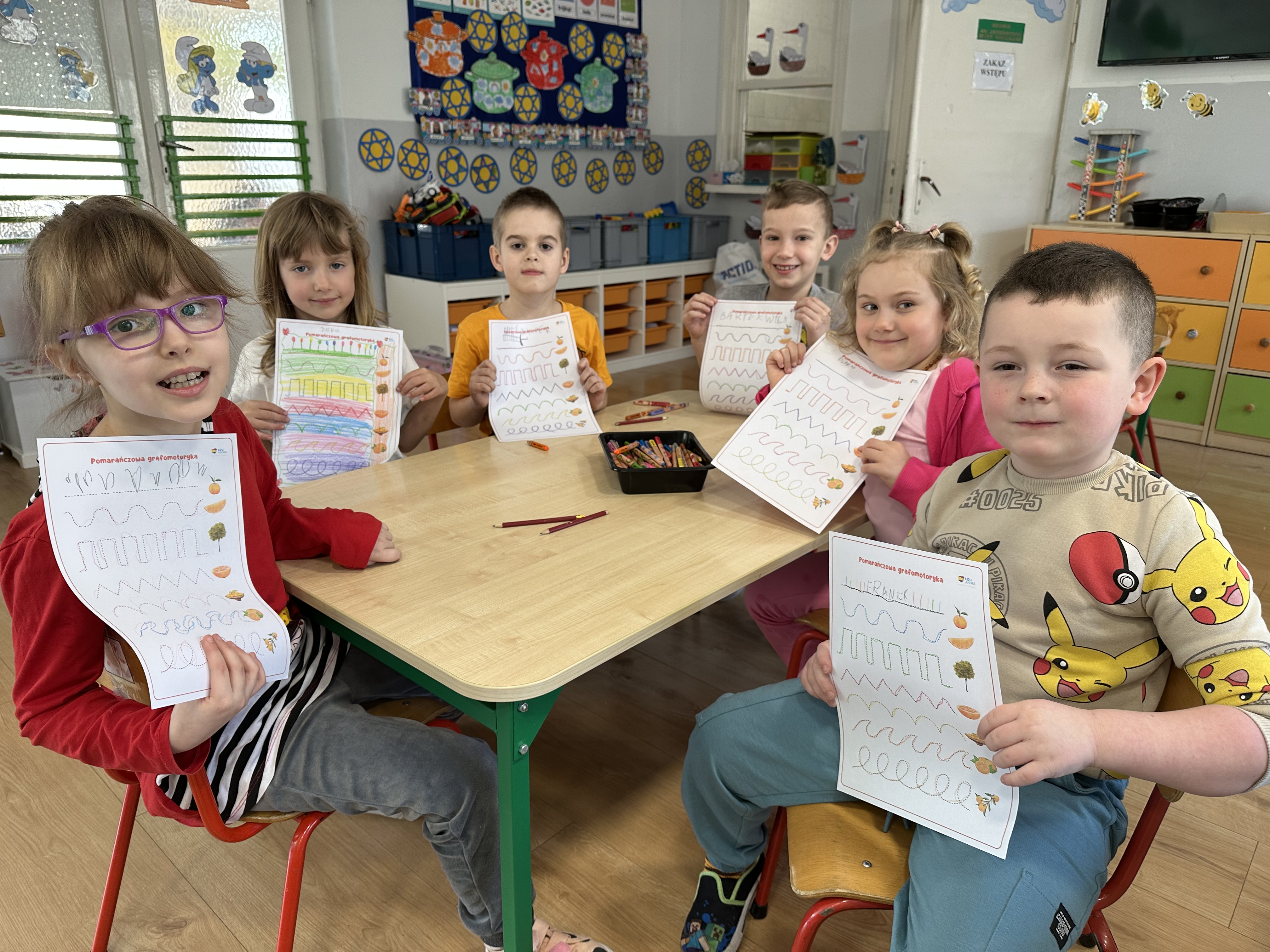 Zajęcia rozpoczęły się od otrzymania listu od profesora Animka, który wprowadził dzieci w temat kolejnej przygody. Na podstawie wskazówek zawartych w liście dzieci odgadły, że bohaterką zajęć będzie pomarańcza - owoc kojarzący się z energią i charakterystycznym kolorem. Następnie dzieci wysłuchały opowiadania pt. „Energetyczna pomarańcza” autorstwa K. Michoń. Po wysłuchaniu tekstu odbyła się rozmowa na temat jego treści. Dzieci miały możliwość poznania pomarańczy wszystkimi zmysłami - dotykały jej, wąchały oraz smakowały. Zapoznały się również z informacjami dotyczącymi uprawy pomarańczy na podstawie ilustracji. Podczas zajęć ruchowych dzieci rozwijały umiejętność reagowania na zmianę rytmu i tempa muzyki poprzez zabawy z balonem. Wykonały także pracę plastyczną przedstawiającą pomarańczę, rozwijając swoją kreatywność i zdolności manualne. W trakcie zabaw dydaktycznych dzieci doskonaliły umiejętności matematyczne, uczestnicząc w aktywności „Pomarańczowa matematyka”, polegającej między innymi na przyporządkowywaniu cyfr do odpowiedniej liczby pomarańczy. Starszaki brały również udział w eksperymencie „Czy pomarańcza pływa, czy tonie w wodzie?”, wyciągając własne wnioski i rozwijając umiejętność obserwacji. Dodatkowo dzieci ćwiczyły sprawność manualną podczas zajęć grafomotorycznych „Pomarańczowa grafomotoryka ”. Ważnym elementem zajęć było również rozwijanie samodzielności - dzieci samodzielnie przygotowały sok z pomarańczy. Na zakończenie dzieci poznały wartości odżywcze pomarańczy oraz umieściły ten owoc w „Skarbcu zaginionych składników odżywczych”, wzbogacając swoją wiedzę na temat zdrowego odżywiania.