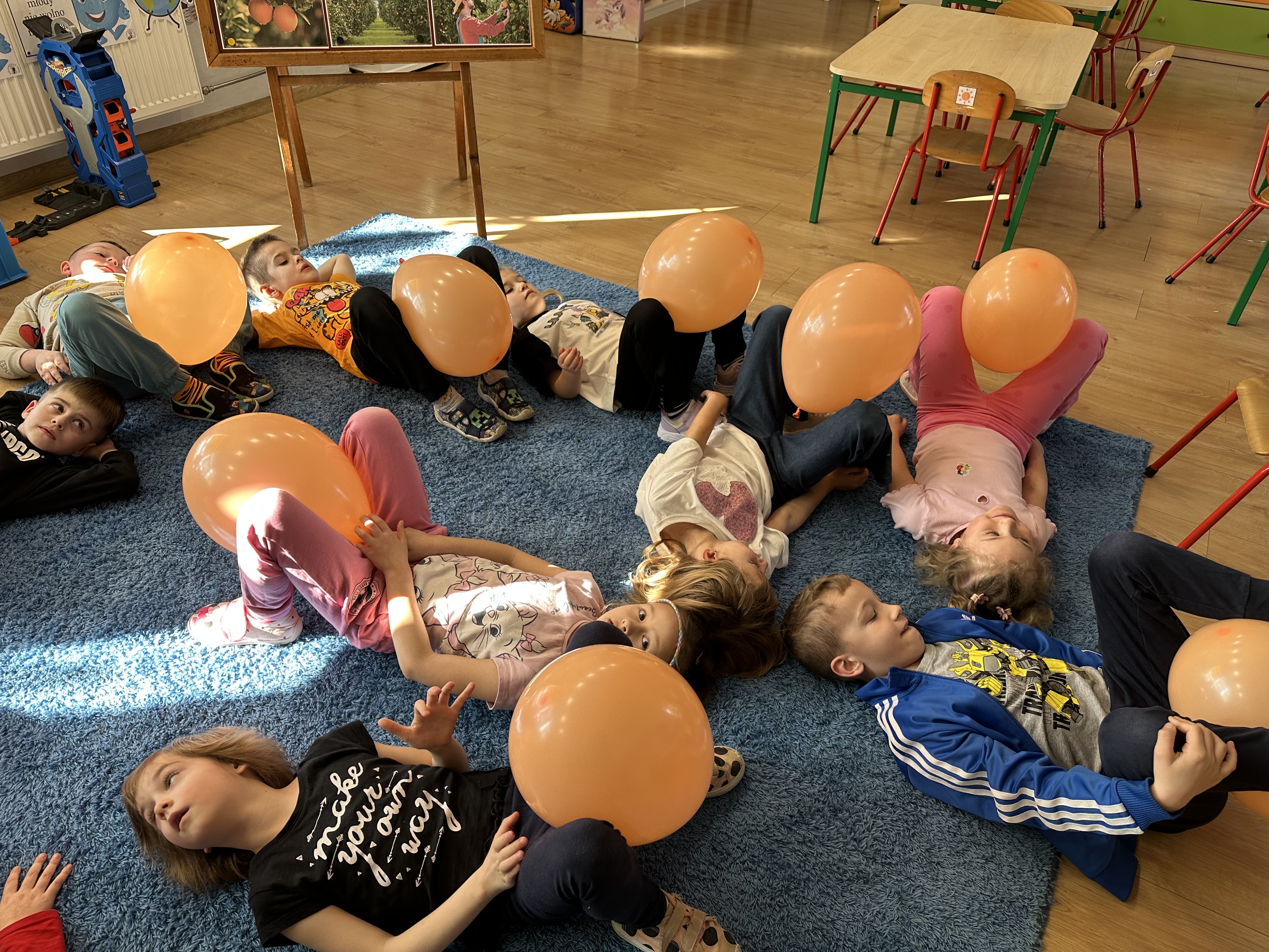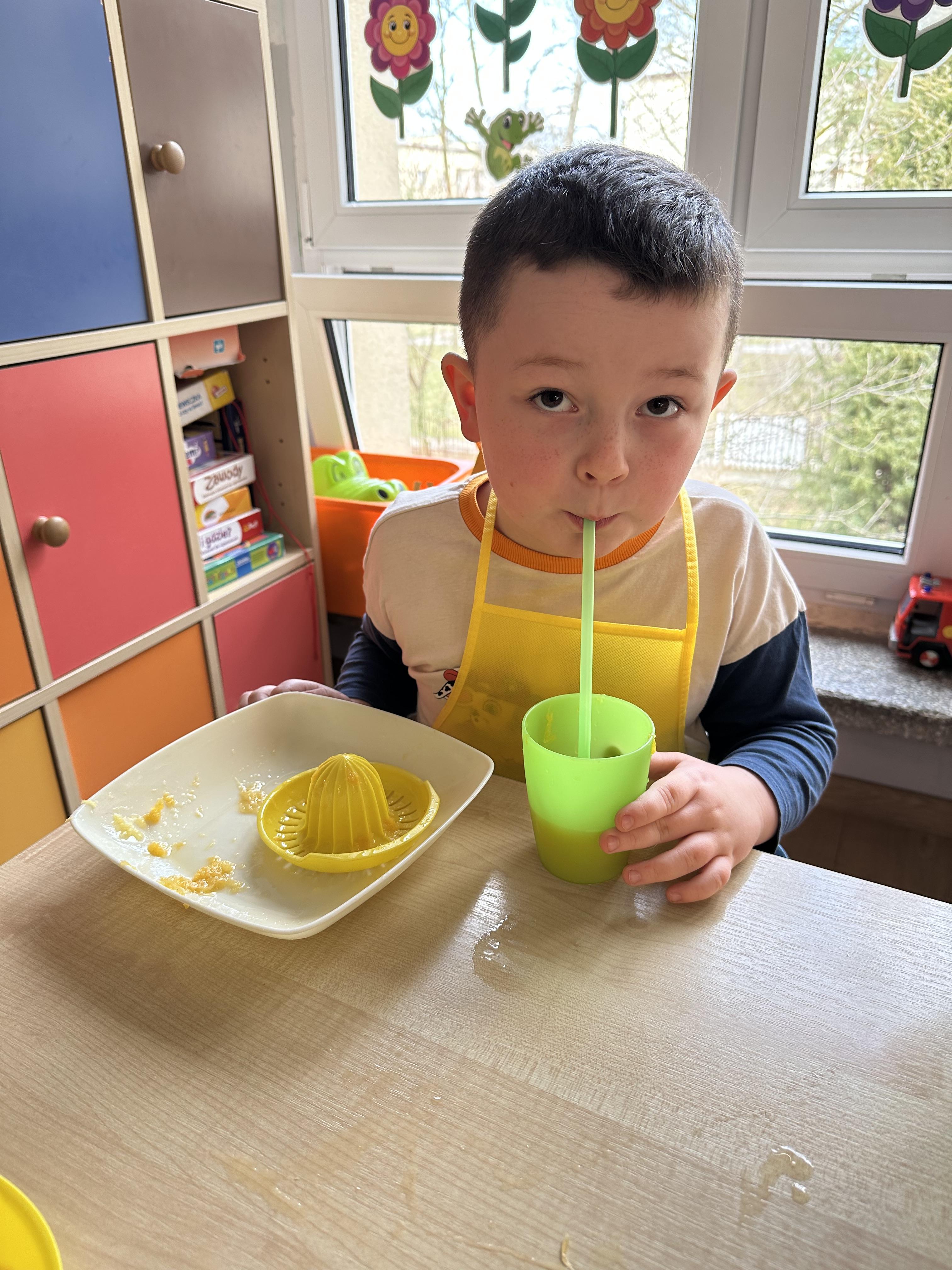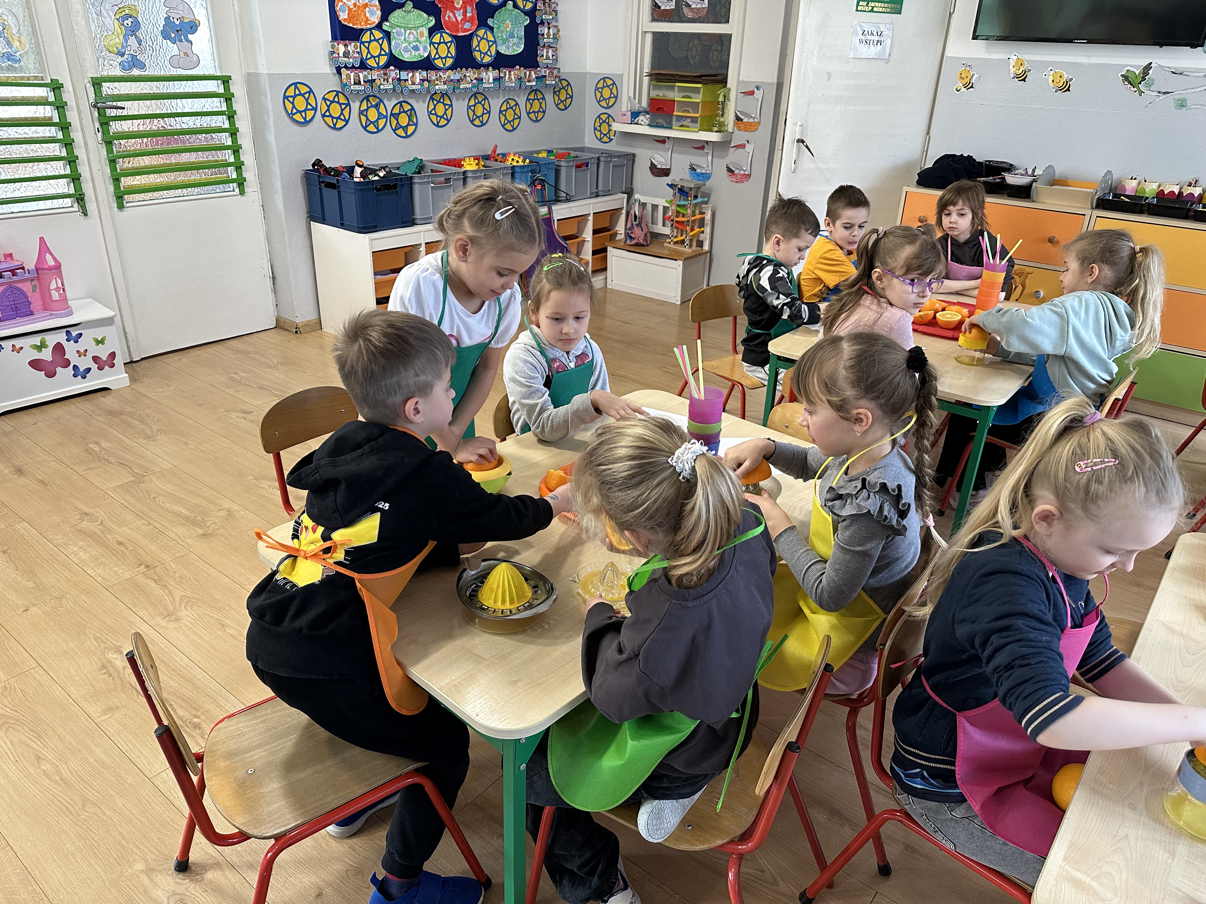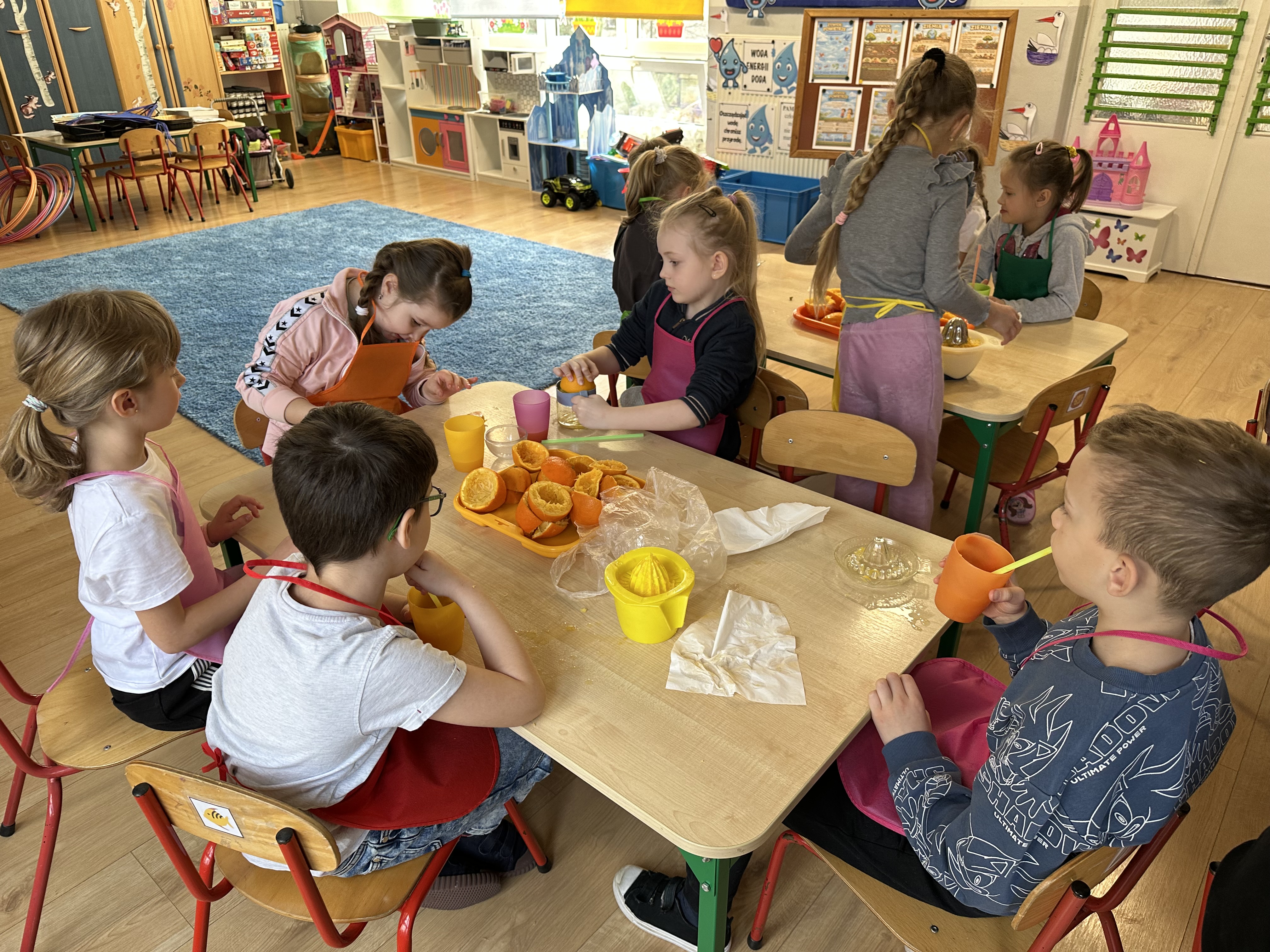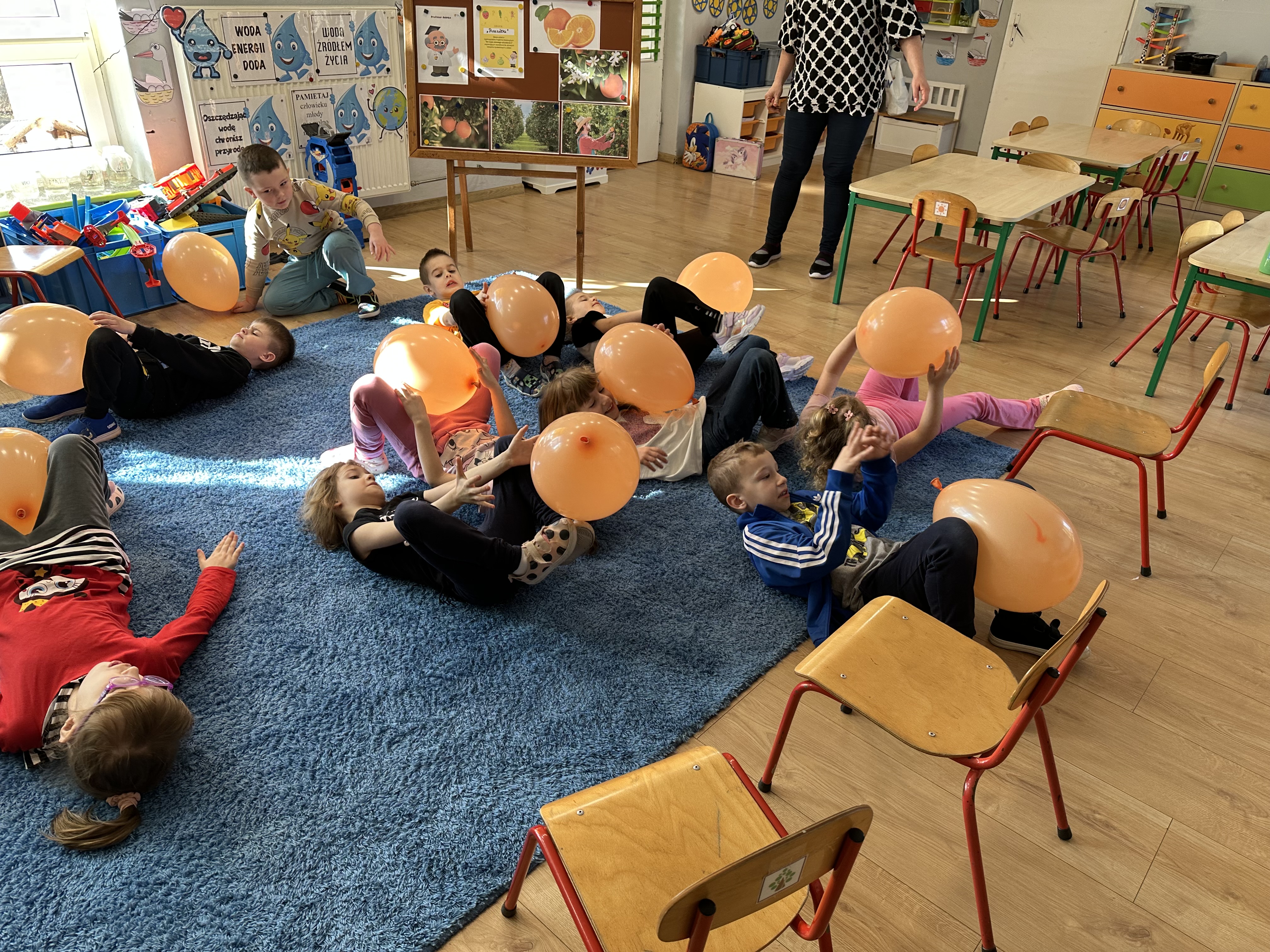 Zajęcia rozpoczęły się od otrzymania listu od profesora Animka, który wprowadził dzieci w temat kolejnej przygody. Na podstawie wskazówek zawartych w liście dzieci odgadły, że bohaterką zajęć będzie pomarańcza - owoc kojarzący się z energią i charakterystycznym kolorem. Następnie dzieci wysłuchały opowiadania pt. „Energetyczna pomarańcza” autorstwa K. Michoń. Po wysłuchaniu tekstu odbyła się rozmowa na temat jego treści. Dzieci miały możliwość poznania pomarańczy wszystkimi zmysłami - dotykały jej, wąchały oraz smakowały. Zapoznały się również z informacjami dotyczącymi uprawy pomarańczy na podstawie ilustracji. Podczas zajęć ruchowych dzieci rozwijały umiejętność reagowania na zmianę rytmu i tempa muzyki poprzez zabawy z balonem. Wykonały także pracę plastyczną przedstawiającą pomarańczę, rozwijając swoją kreatywność i zdolności manualne. W trakcie zabaw dydaktycznych dzieci doskonaliły umiejętności matematyczne, uczestnicząc w aktywności „Pomarańczowa matematyka”, polegającej między innymi na przyporządkowywaniu cyfr do odpowiedniej liczby pomarańczy. Starszaki brały również udział w eksperymencie „Czy pomarańcza pływa, czy tonie w wodzie?”, wyciągając własne wnioski i rozwijając umiejętność obserwacji. Dodatkowo dzieci ćwiczyły sprawność manualną podczas zajęć grafomotorycznych „Pomarańczowa grafomotoryka ”. Ważnym elementem zajęć było również rozwijanie samodzielności - dzieci samodzielnie przygotowały sok z pomarańczy. Na zakończenie dzieci poznały wartości odżywcze pomarańczy oraz umieściły ten owoc w „Skarbcu zaginionych składników odżywczych”, wzbogacając swoją wiedzę na temat zdrowego odżywiania.