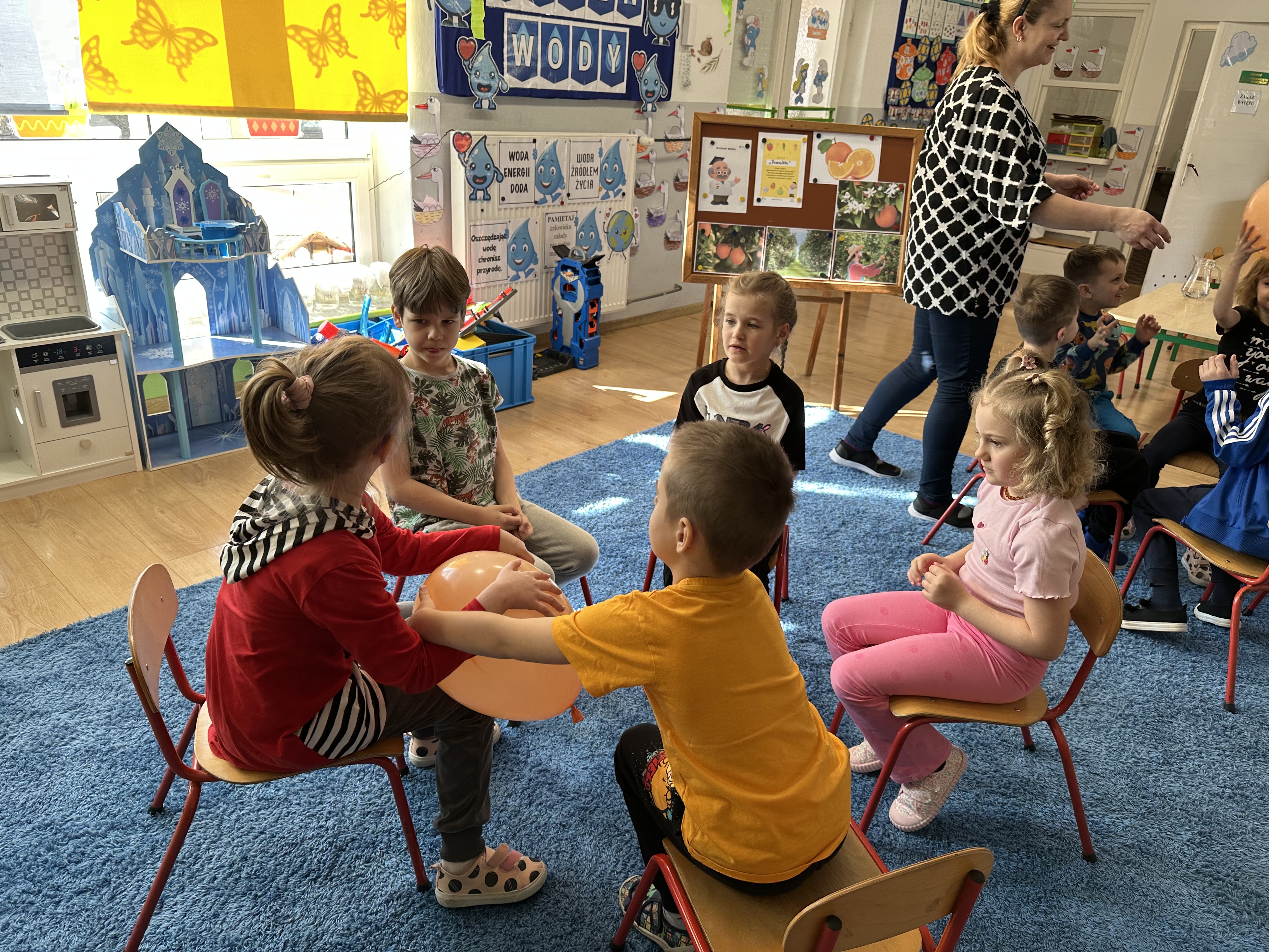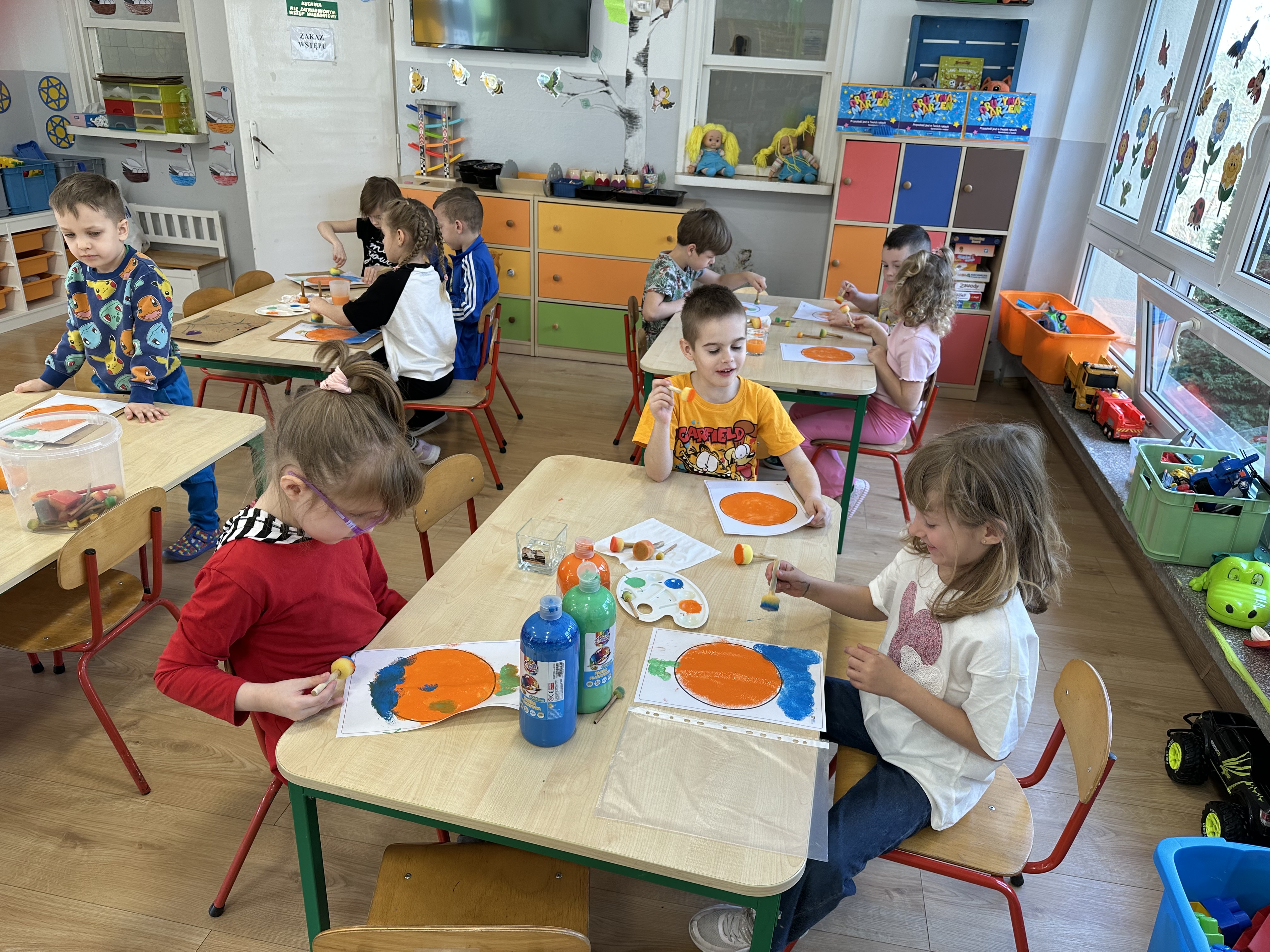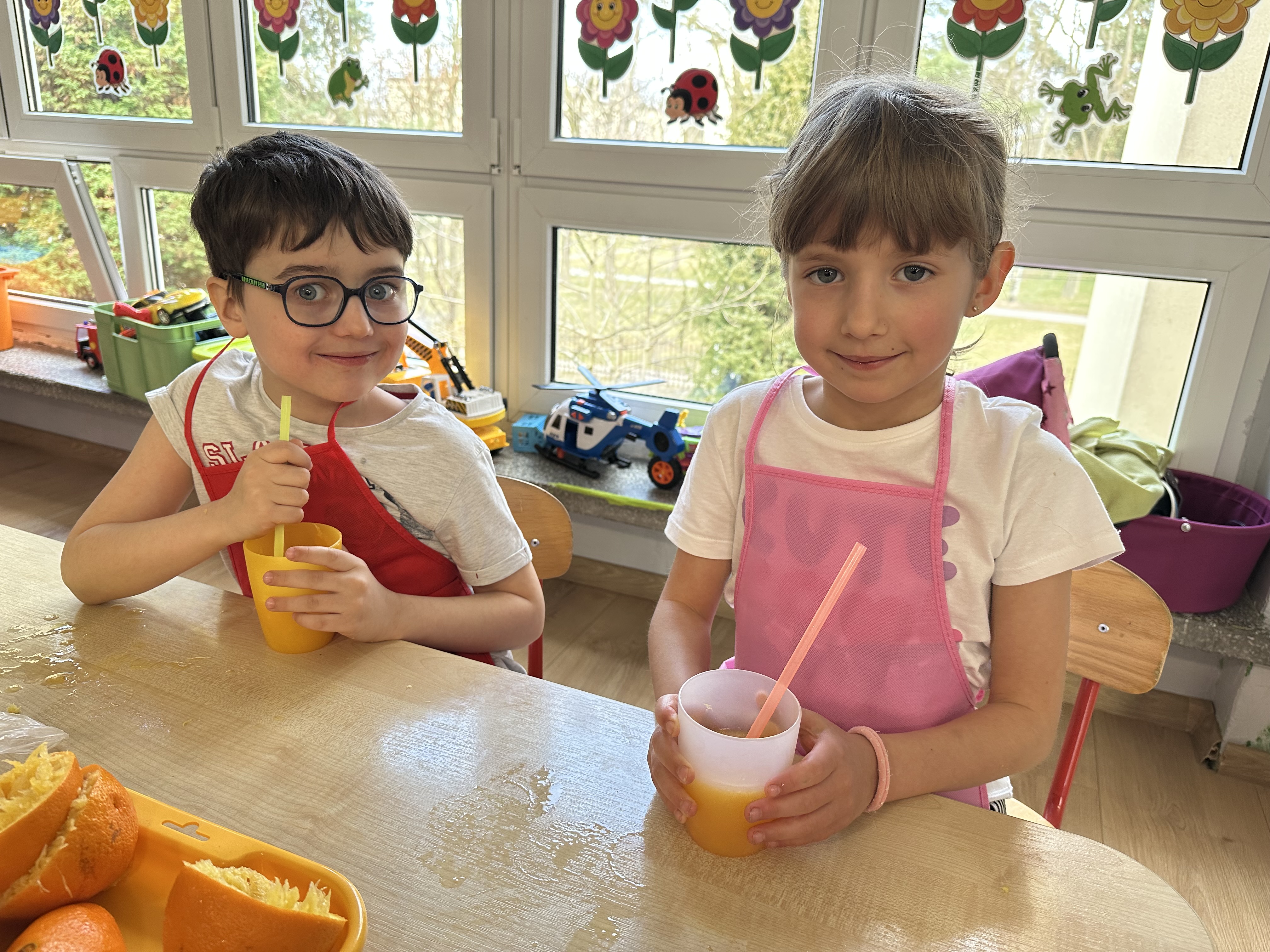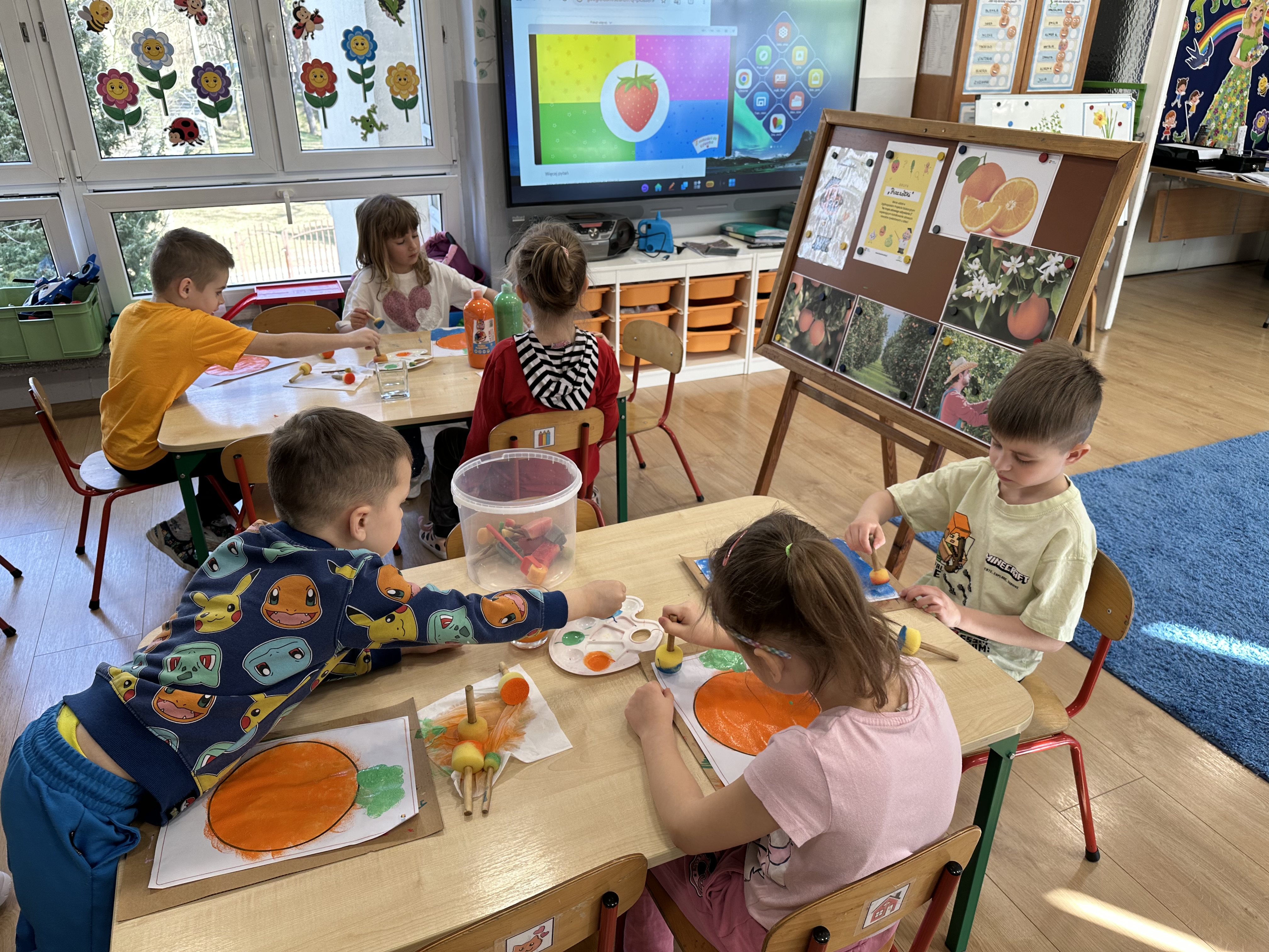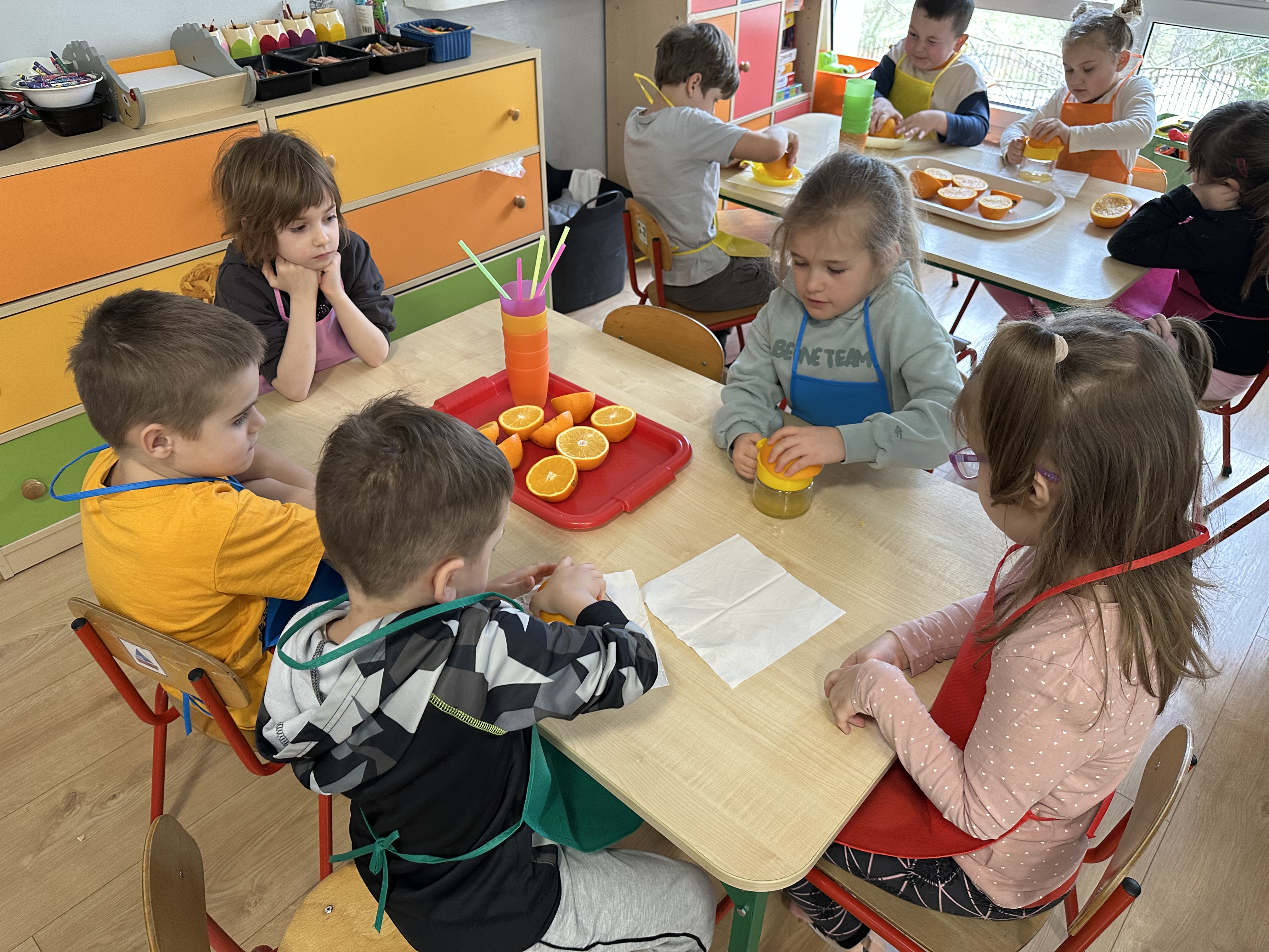 Zajęcia rozpoczęły się od otrzymania listu od profesora Animka, który wprowadził dzieci w temat kolejnej przygody. Na podstawie wskazówek zawartych w liście dzieci odgadły, że bohaterką zajęć będzie pomarańcza - owoc kojarzący się z energią i charakterystycznym kolorem. Następnie dzieci wysłuchały opowiadania pt. „Energetyczna pomarańcza” autorstwa K. Michoń. Po wysłuchaniu tekstu odbyła się rozmowa na temat jego treści. Dzieci miały możliwość poznania pomarańczy wszystkimi zmysłami - dotykały jej, wąchały oraz smakowały. Zapoznały się również z informacjami dotyczącymi uprawy pomarańczy na podstawie ilustracji. Podczas zajęć ruchowych dzieci rozwijały umiejętność reagowania na zmianę rytmu i tempa muzyki poprzez zabawy z balonem. Wykonały także pracę plastyczną przedstawiającą pomarańczę, rozwijając swoją kreatywność i zdolności manualne. W trakcie zabaw dydaktycznych dzieci doskonaliły umiejętności matematyczne, uczestnicząc w aktywności „Pomarańczowa matematyka”, polegającej między innymi na przyporządkowywaniu cyfr do odpowiedniej liczby pomarańczy. Starszaki brały również udział w eksperymencie „Czy pomarańcza pływa, czy tonie w wodzie?”, wyciągając własne wnioski i rozwijając umiejętność obserwacji. Dodatkowo dzieci ćwiczyły sprawność manualną podczas zajęć grafomotorycznych „Pomarańczowa grafomotoryka ”. Ważnym elementem zajęć było również rozwijanie samodzielności - dzieci samodzielnie przygotowały sok z pomarańczy. Na zakończenie dzieci poznały wartości odżywcze pomarańczy oraz umieściły ten owoc w „Skarbcu zaginionych składników odżywczych”, wzbogacając swoją wiedzę na temat zdrowego odżywiania.