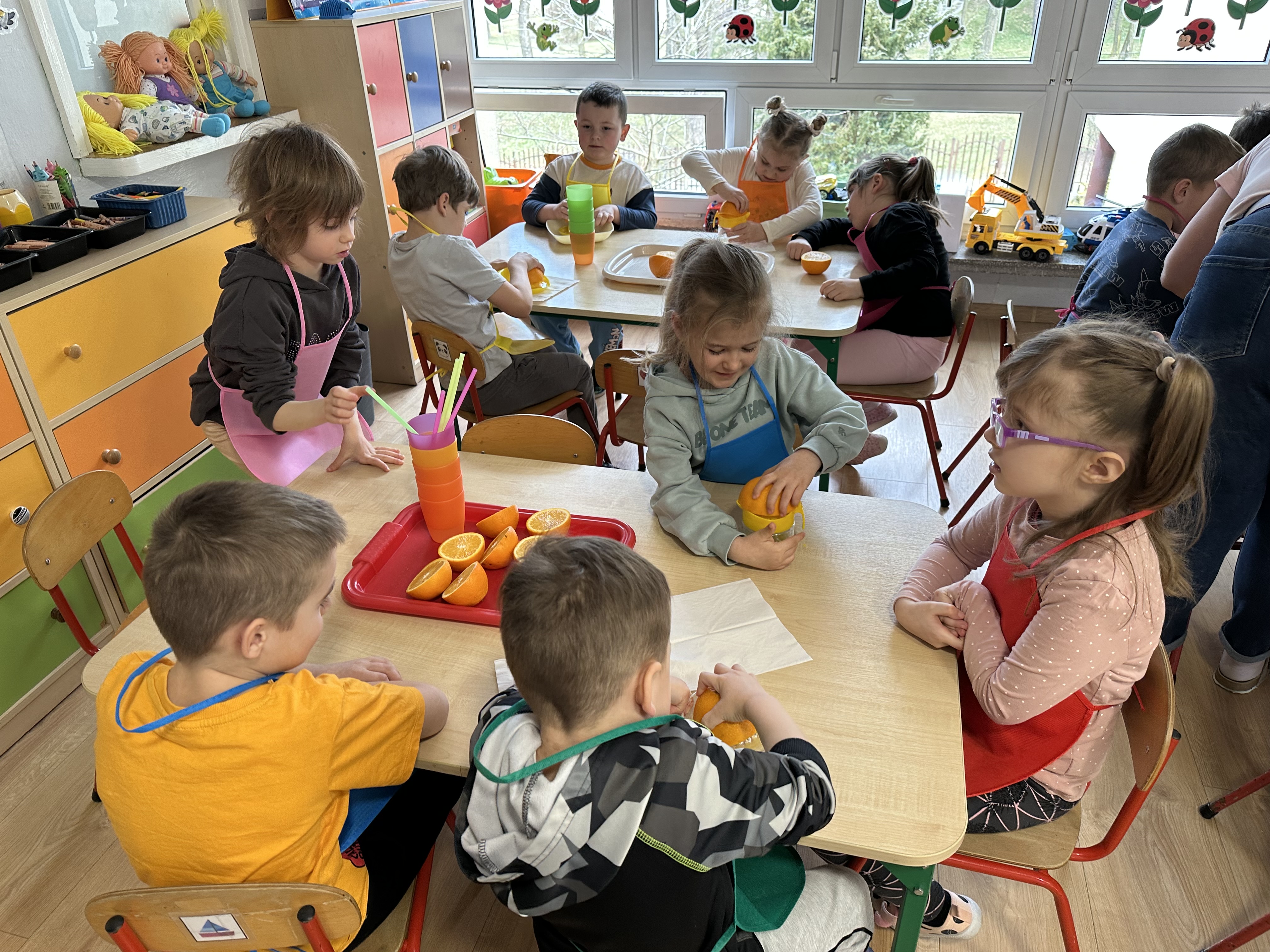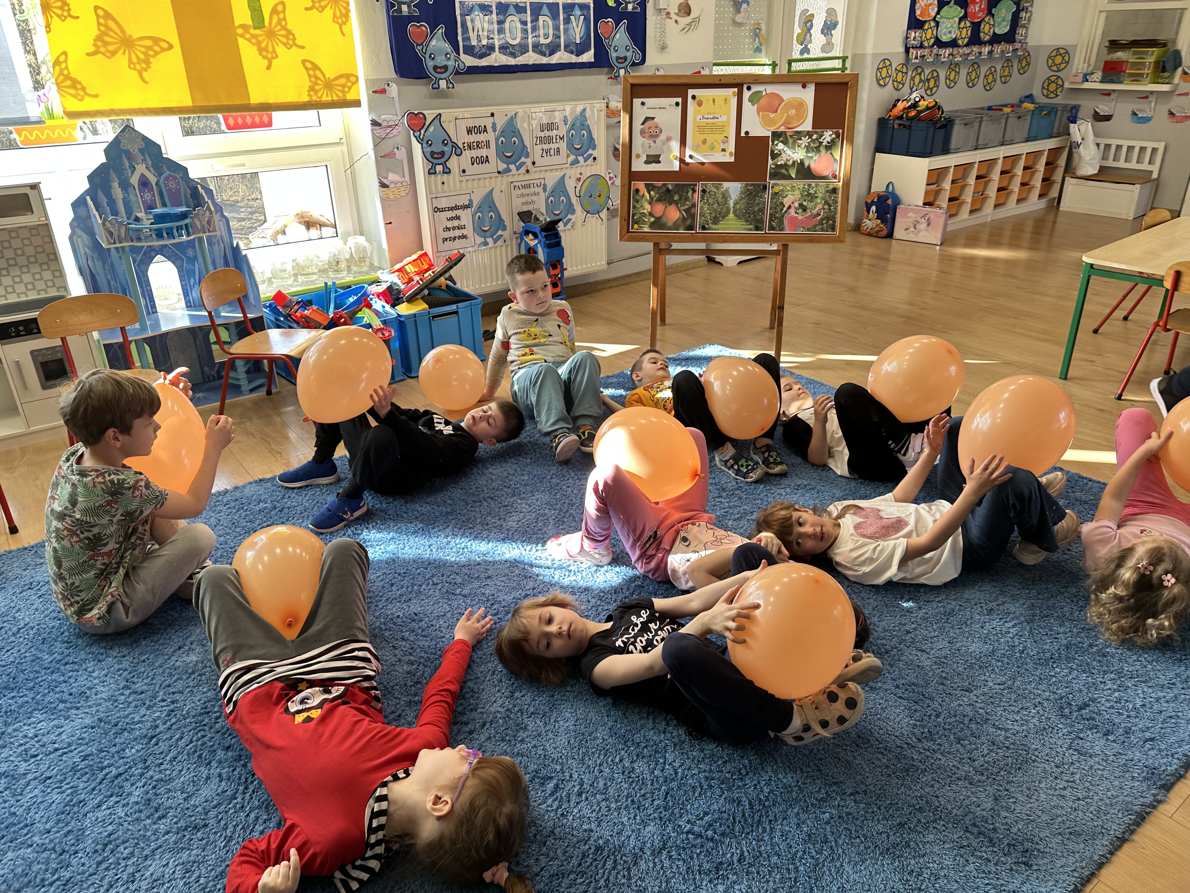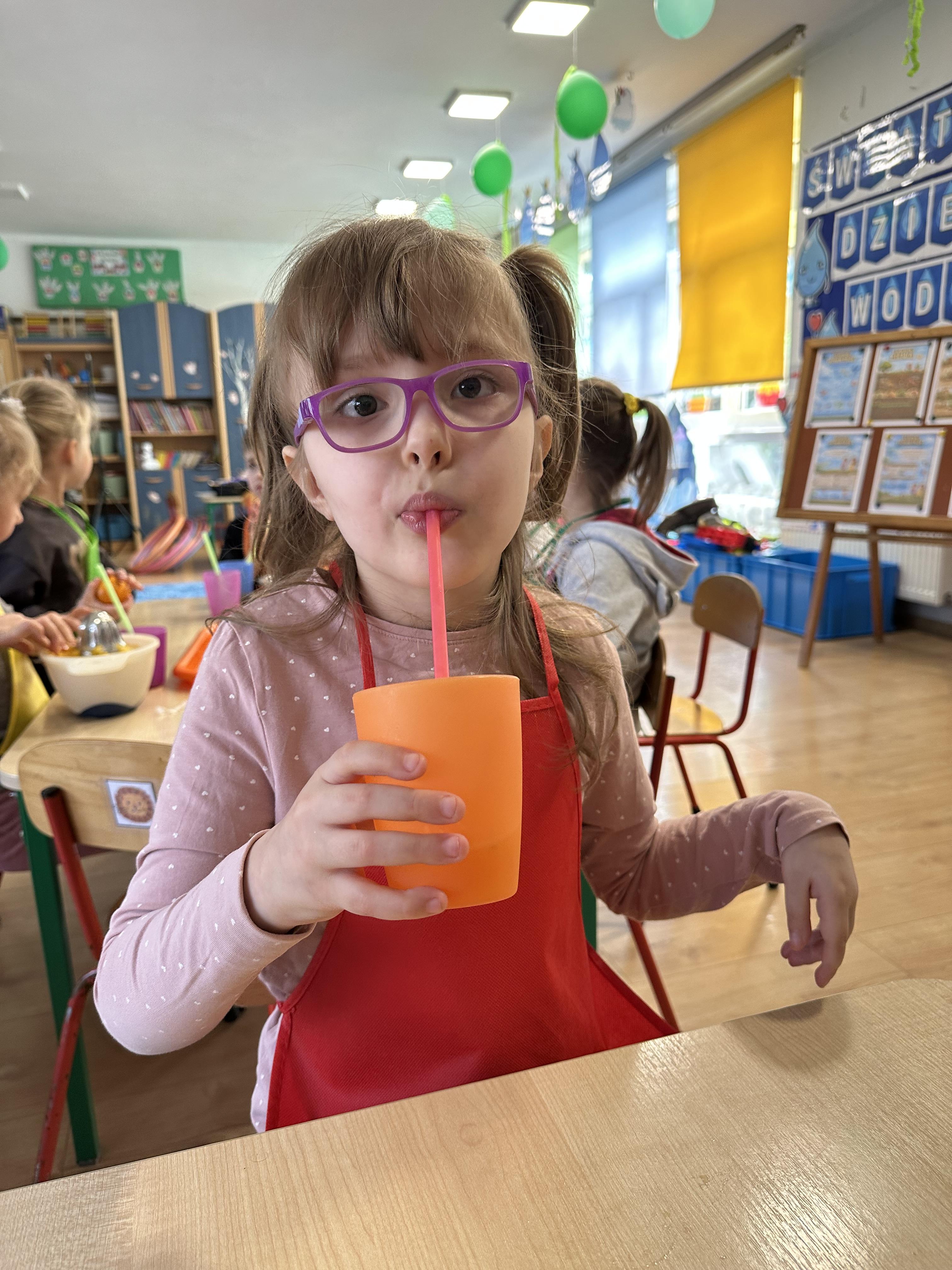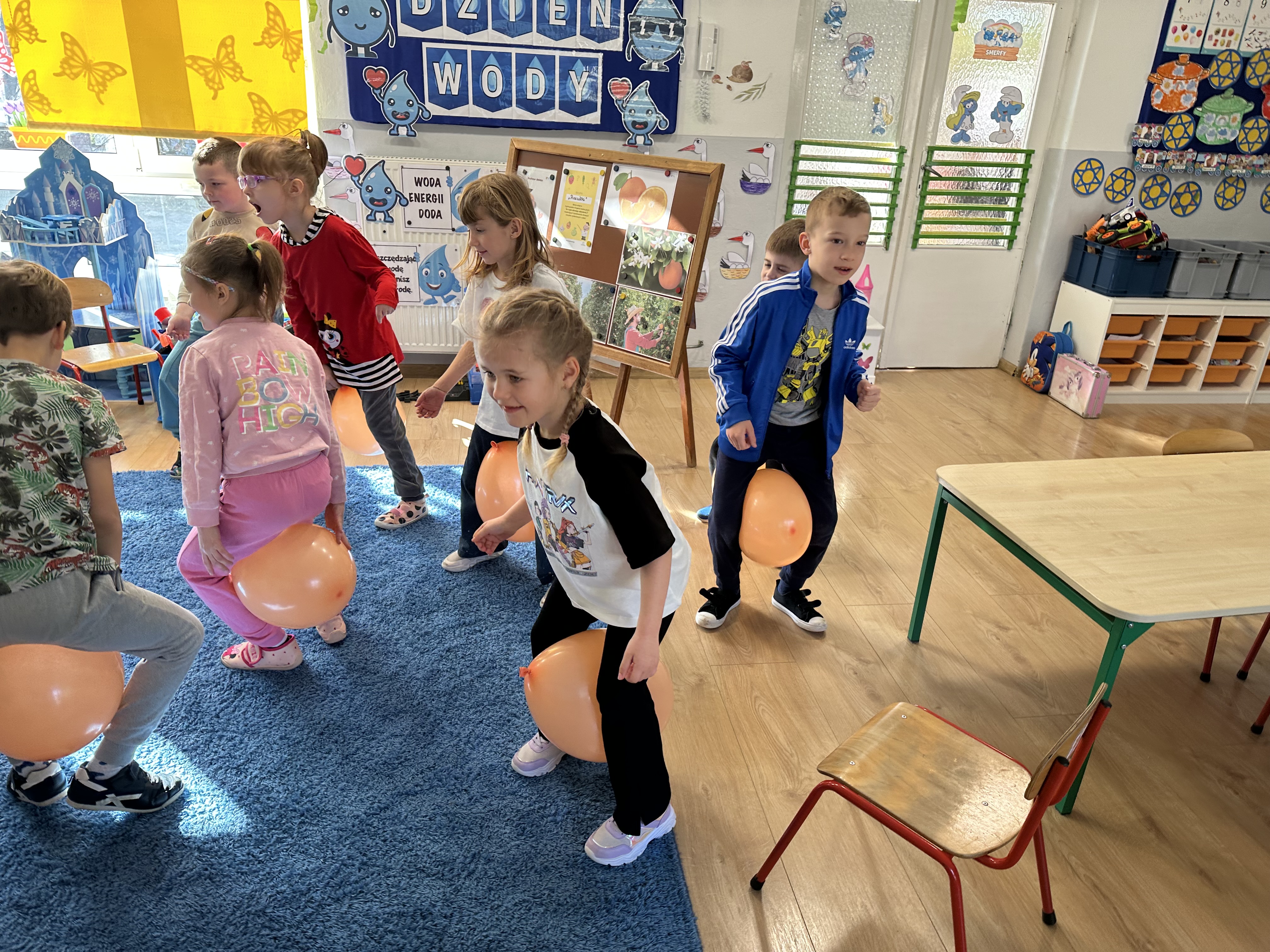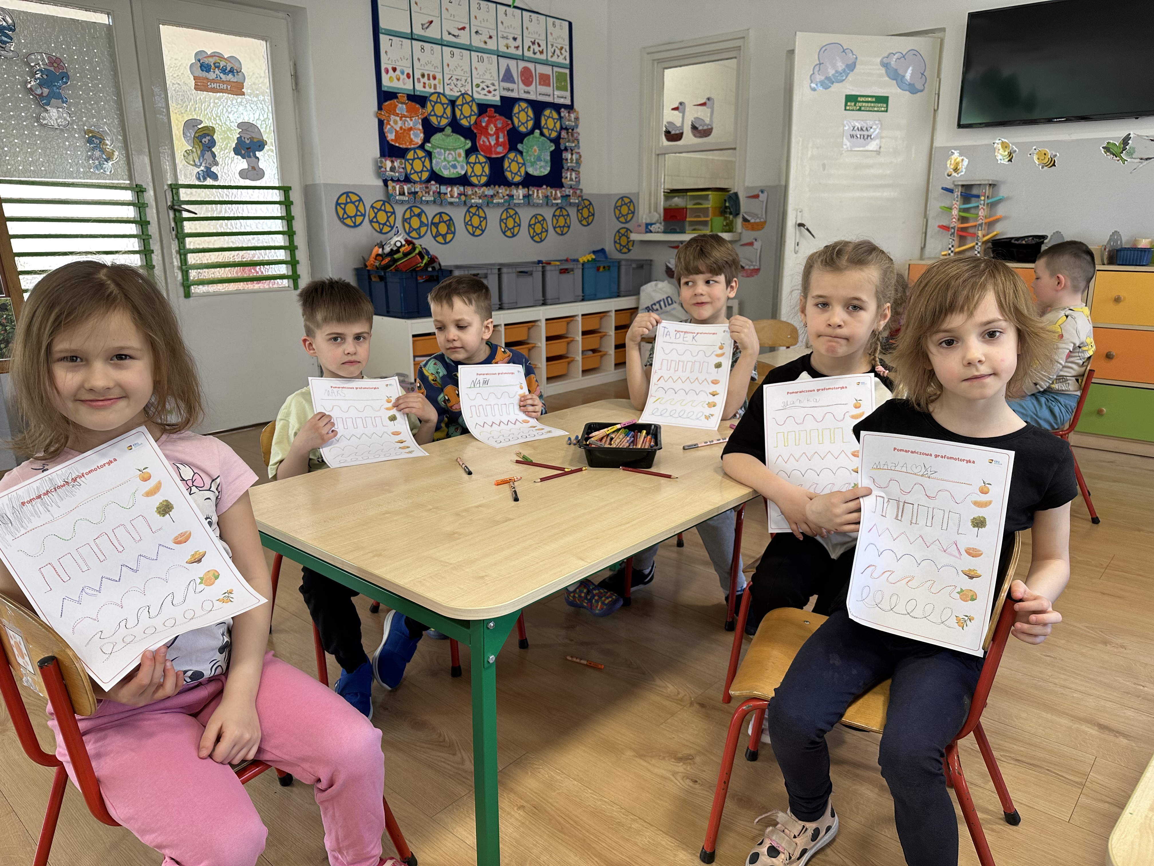 Zajęcia rozpoczęły się od otrzymania listu od profesora Animka, który wprowadził dzieci w temat kolejnej przygody. Na podstawie wskazówek zawartych w liście dzieci odgadły, że bohaterką zajęć będzie pomarańcza - owoc kojarzący się z energią i charakterystycznym kolorem. Następnie dzieci wysłuchały opowiadania pt. „Energetyczna pomarańcza” autorstwa K. Michoń. Po wysłuchaniu tekstu odbyła się rozmowa na temat jego treści. Dzieci miały możliwość poznania pomarańczy wszystkimi zmysłami - dotykały jej, wąchały oraz smakowały. Zapoznały się również z informacjami dotyczącymi uprawy pomarańczy na podstawie ilustracji. Podczas zajęć ruchowych dzieci rozwijały umiejętność reagowania na zmianę rytmu i tempa muzyki poprzez zabawy z balonem. Wykonały także pracę plastyczną przedstawiającą pomarańczę, rozwijając swoją kreatywność i zdolności manualne. W trakcie zabaw dydaktycznych dzieci doskonaliły umiejętności matematyczne, uczestnicząc w aktywności „Pomarańczowa matematyka”, polegającej między innymi na przyporządkowywaniu cyfr do odpowiedniej liczby pomarańczy. Starszaki brały również udział w eksperymencie „Czy pomarańcza pływa, czy tonie w wodzie?”, wyciągając własne wnioski i rozwijając umiejętność obserwacji. Dodatkowo dzieci ćwiczyły sprawność manualną podczas zajęć grafomotorycznych „Pomarańczowa grafomotoryka ”. Ważnym elementem zajęć było również rozwijanie samodzielności - dzieci samodzielnie przygotowały sok z pomarańczy. Na zakończenie dzieci poznały wartości odżywcze pomarańczy oraz umieściły ten owoc w „Skarbcu zaginionych składników odżywczych”, wzbogacając swoją wiedzę na temat zdrowego odżywiania.