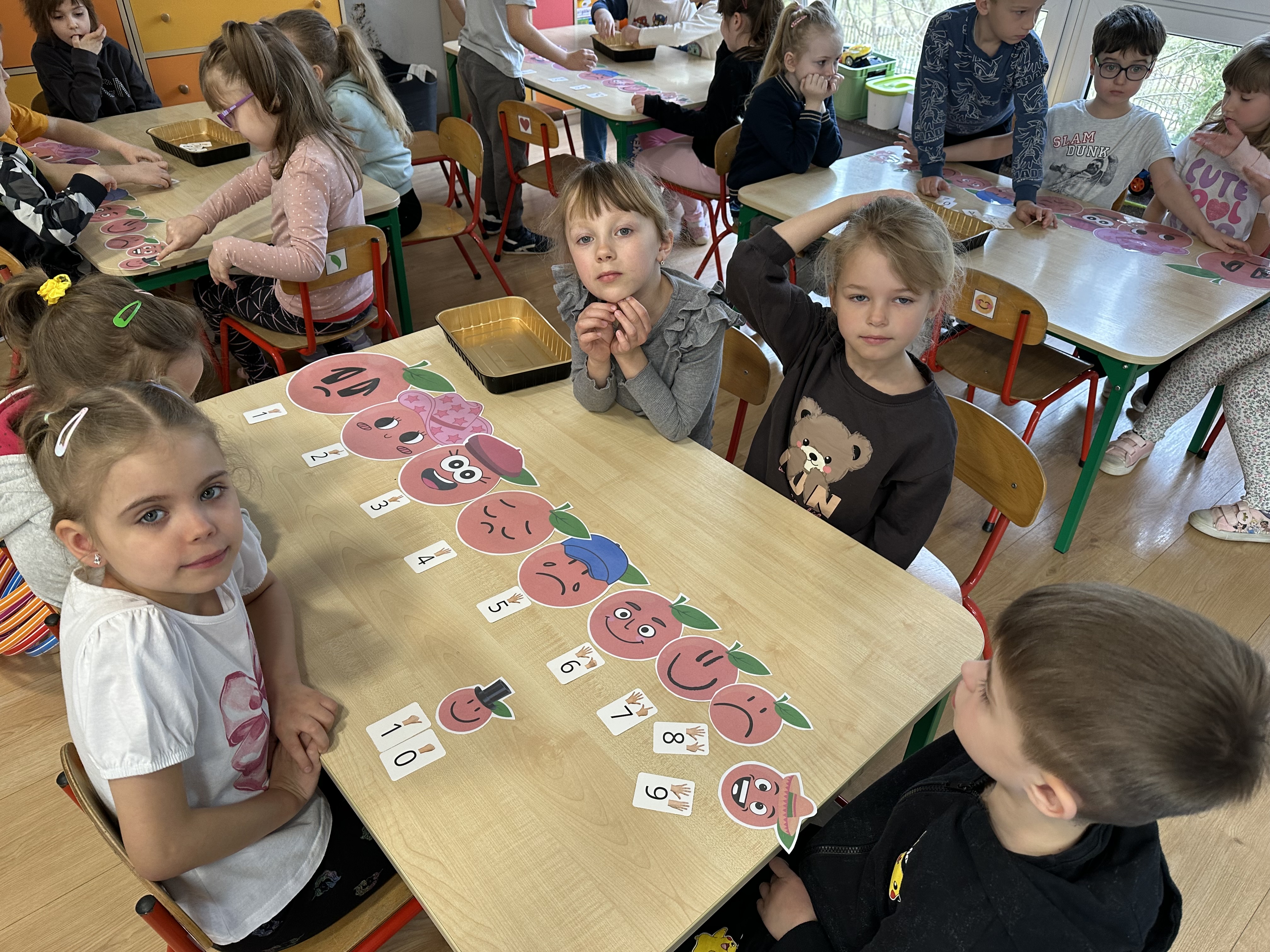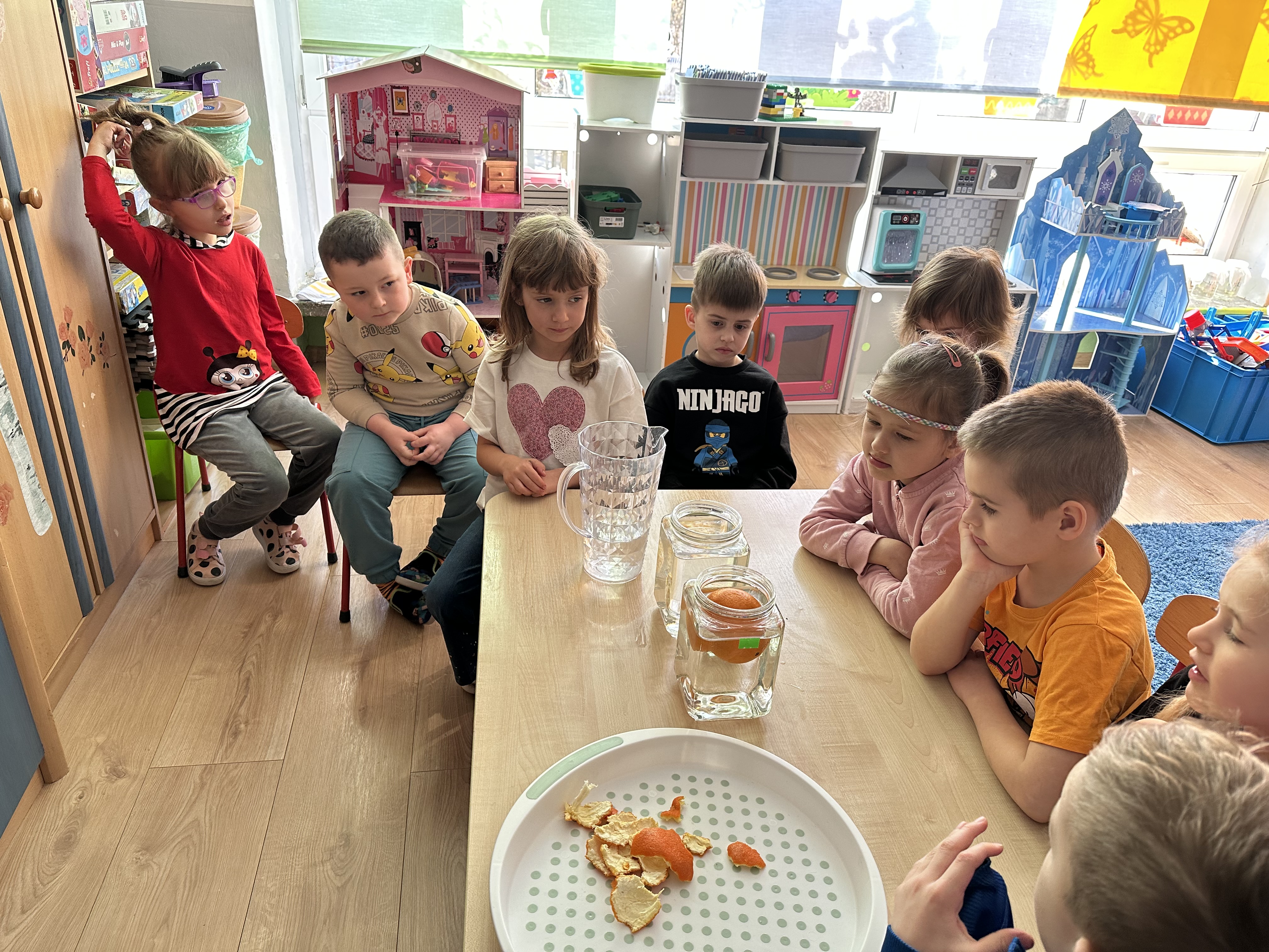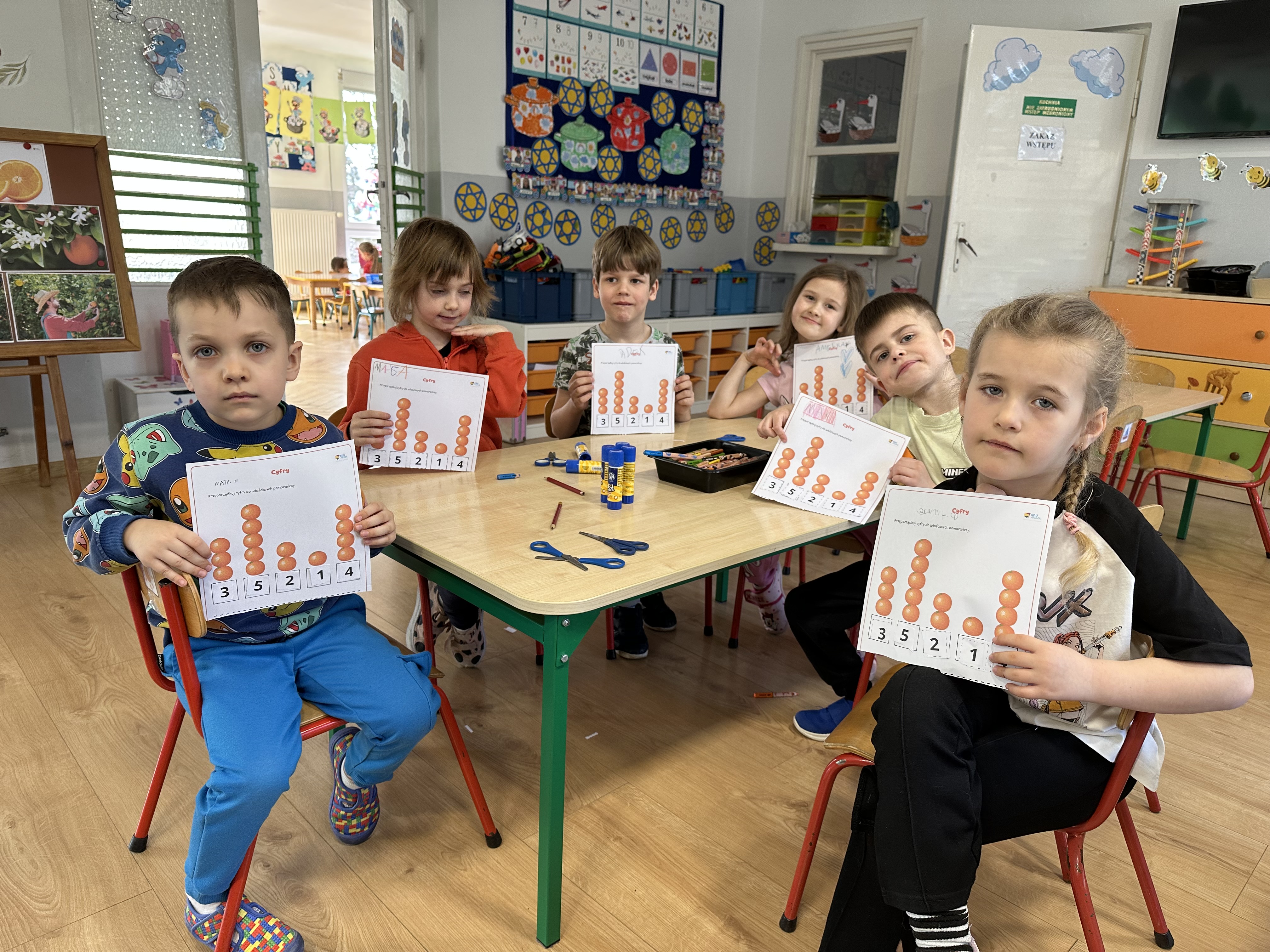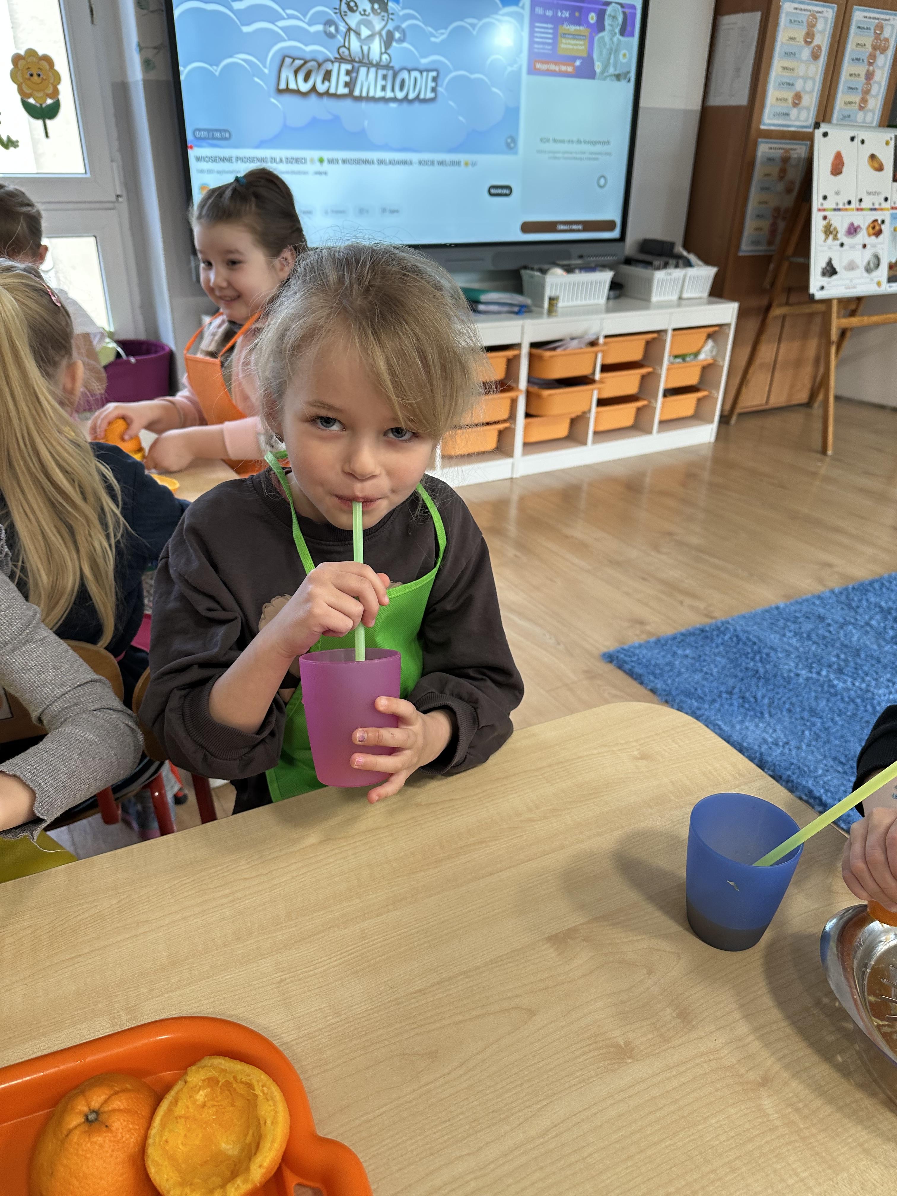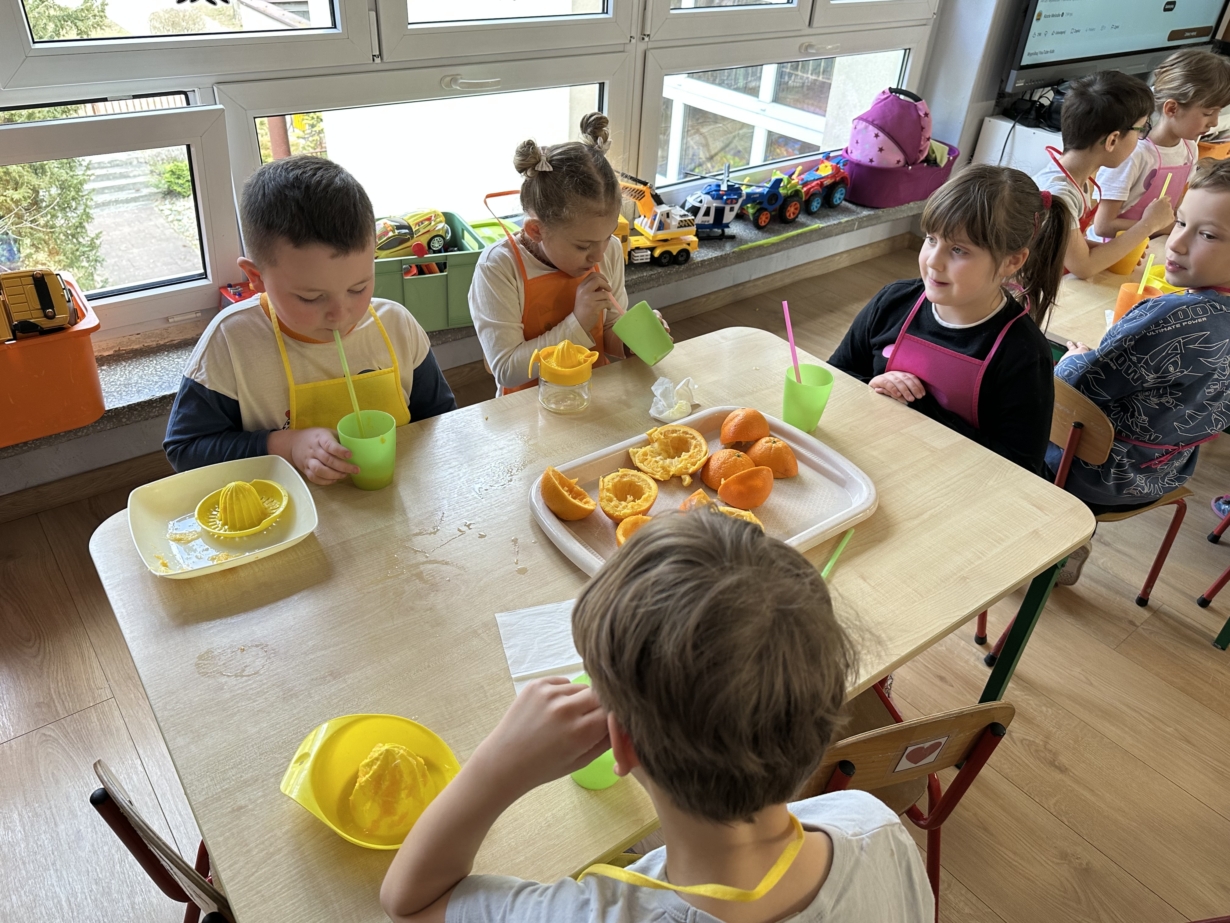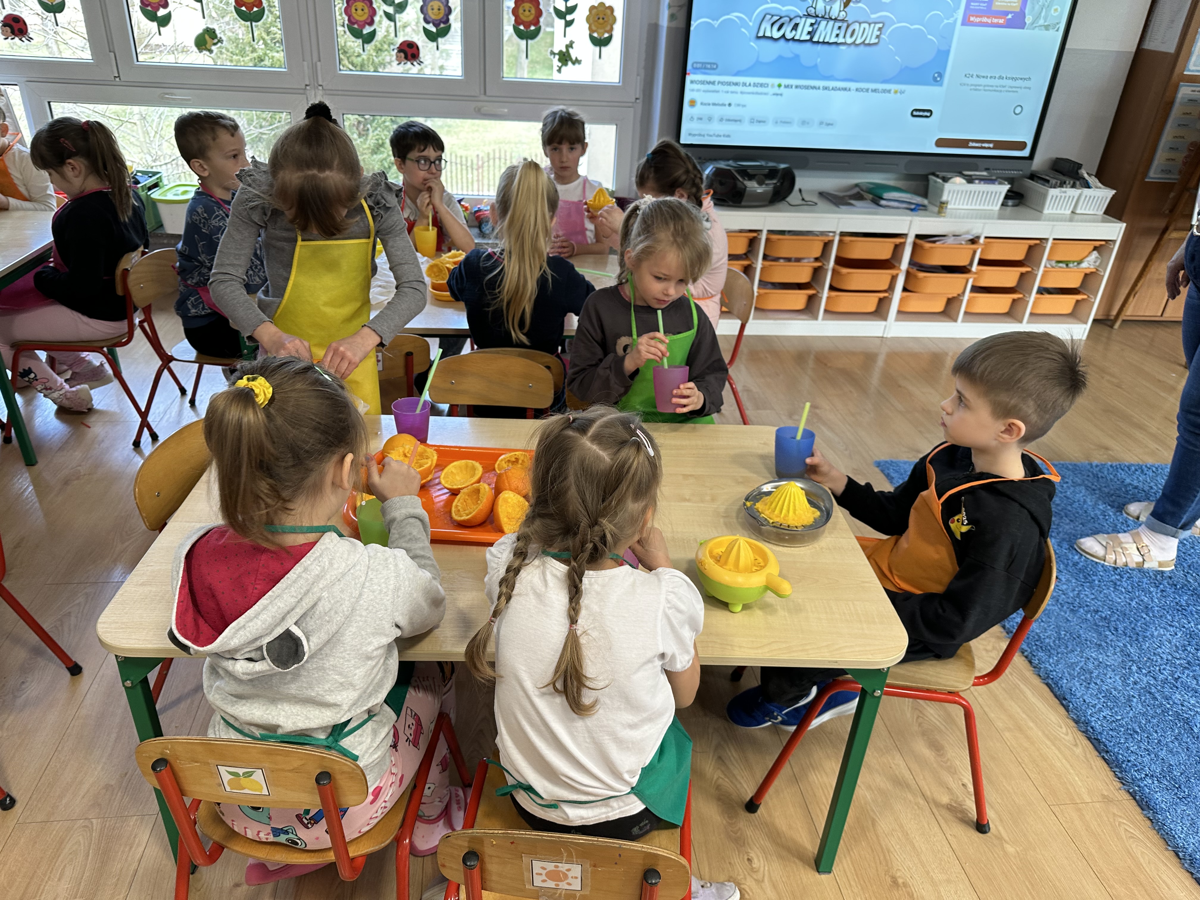 Zajęcia rozpoczęły się od otrzymania listu od profesora Animka, który wprowadził dzieci w temat kolejnej przygody. Na podstawie wskazówek zawartych w liście dzieci odgadły, że bohaterką zajęć będzie pomarańcza - owoc kojarzący się z energią i charakterystycznym kolorem. Następnie dzieci wysłuchały opowiadania pt. „Energetyczna pomarańcza” autorstwa K. Michoń. Po wysłuchaniu tekstu odbyła się rozmowa na temat jego treści. Dzieci miały możliwość poznania pomarańczy wszystkimi zmysłami - dotykały jej, wąchały oraz smakowały. Zapoznały się również z informacjami dotyczącymi uprawy pomarańczy na podstawie ilustracji. Podczas zajęć ruchowych dzieci rozwijały umiejętność reagowania na zmianę rytmu i tempa muzyki poprzez zabawy z balonem. Wykonały także pracę plastyczną przedstawiającą pomarańczę, rozwijając swoją kreatywność i zdolności manualne. W trakcie zabaw dydaktycznych dzieci doskonaliły umiejętności matematyczne, uczestnicząc w aktywności „Pomarańczowa matematyka”, polegającej między innymi na przyporządkowywaniu cyfr do odpowiedniej liczby pomarańczy. Starszaki brały również udział w eksperymencie „Czy pomarańcza pływa, czy tonie w wodzie?”, wyciągając własne wnioski i rozwijając umiejętność obserwacji. Dodatkowo dzieci ćwiczyły sprawność manualną podczas zajęć grafomotorycznych „Pomarańczowa grafomotoryka ”. Ważnym elementem zajęć było również rozwijanie samodzielności - dzieci samodzielnie przygotowały sok z pomarańczy. Na zakończenie dzieci poznały wartości odżywcze pomarańczy oraz umieściły ten owoc w „Skarbcu zaginionych składników odżywczych”, wzbogacając swoją wiedzę na temat zdrowego odżywiania.