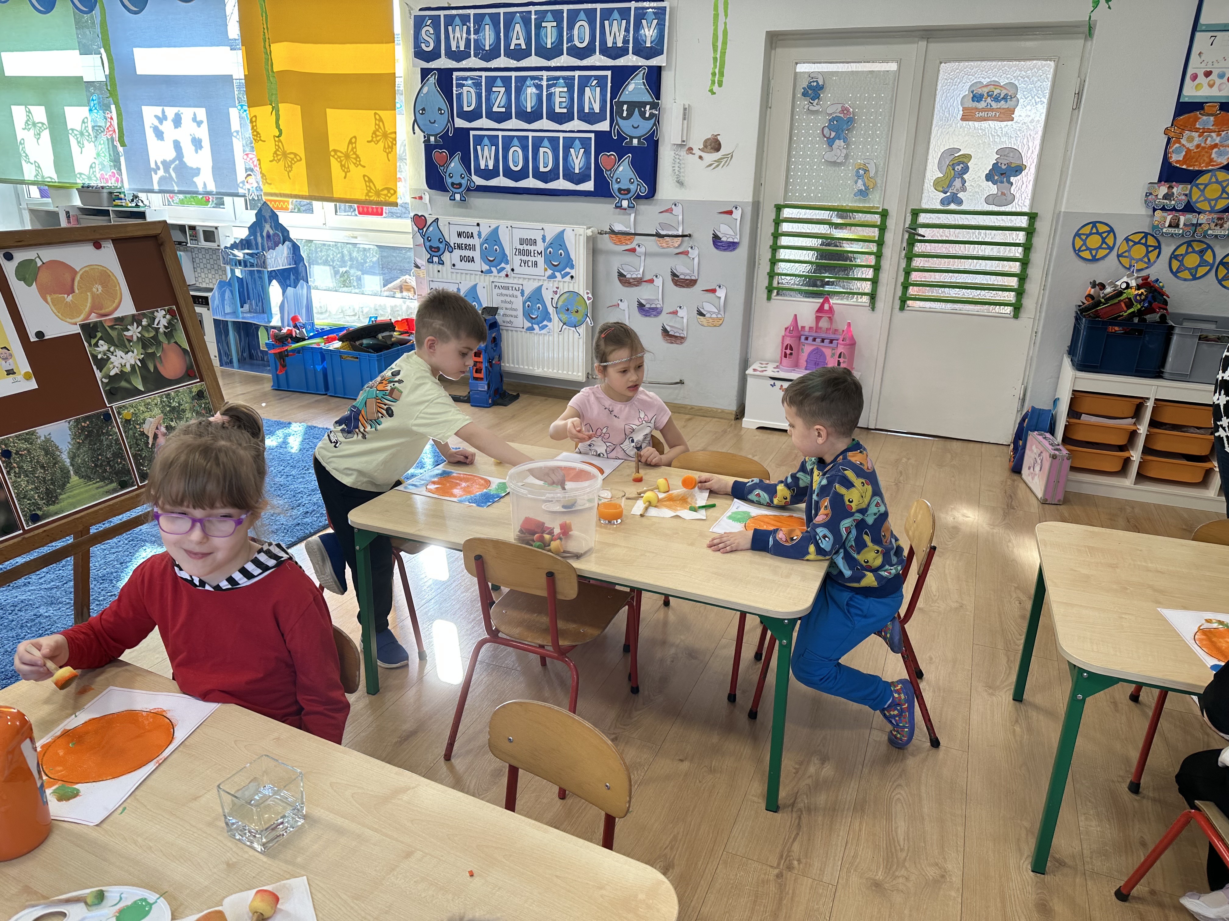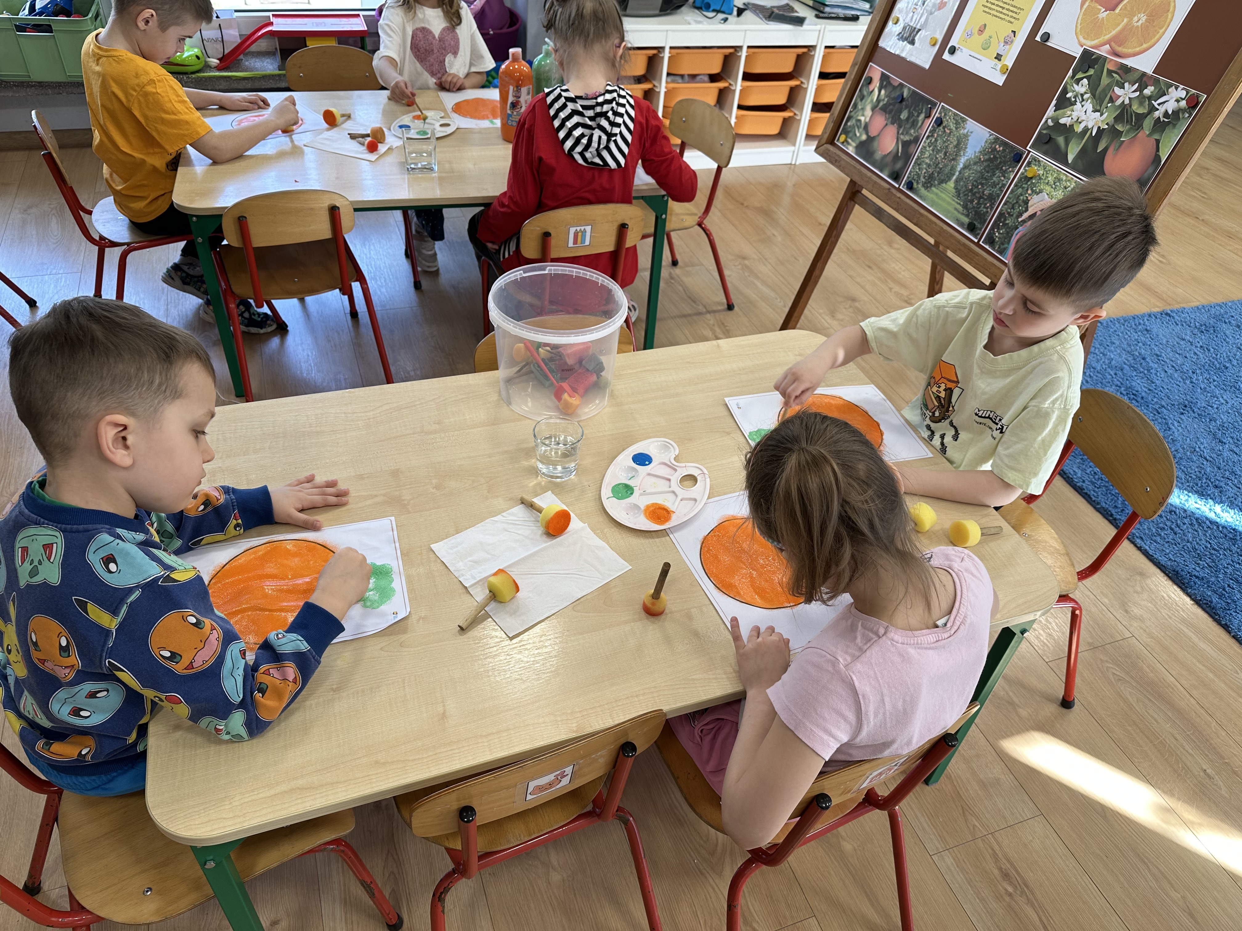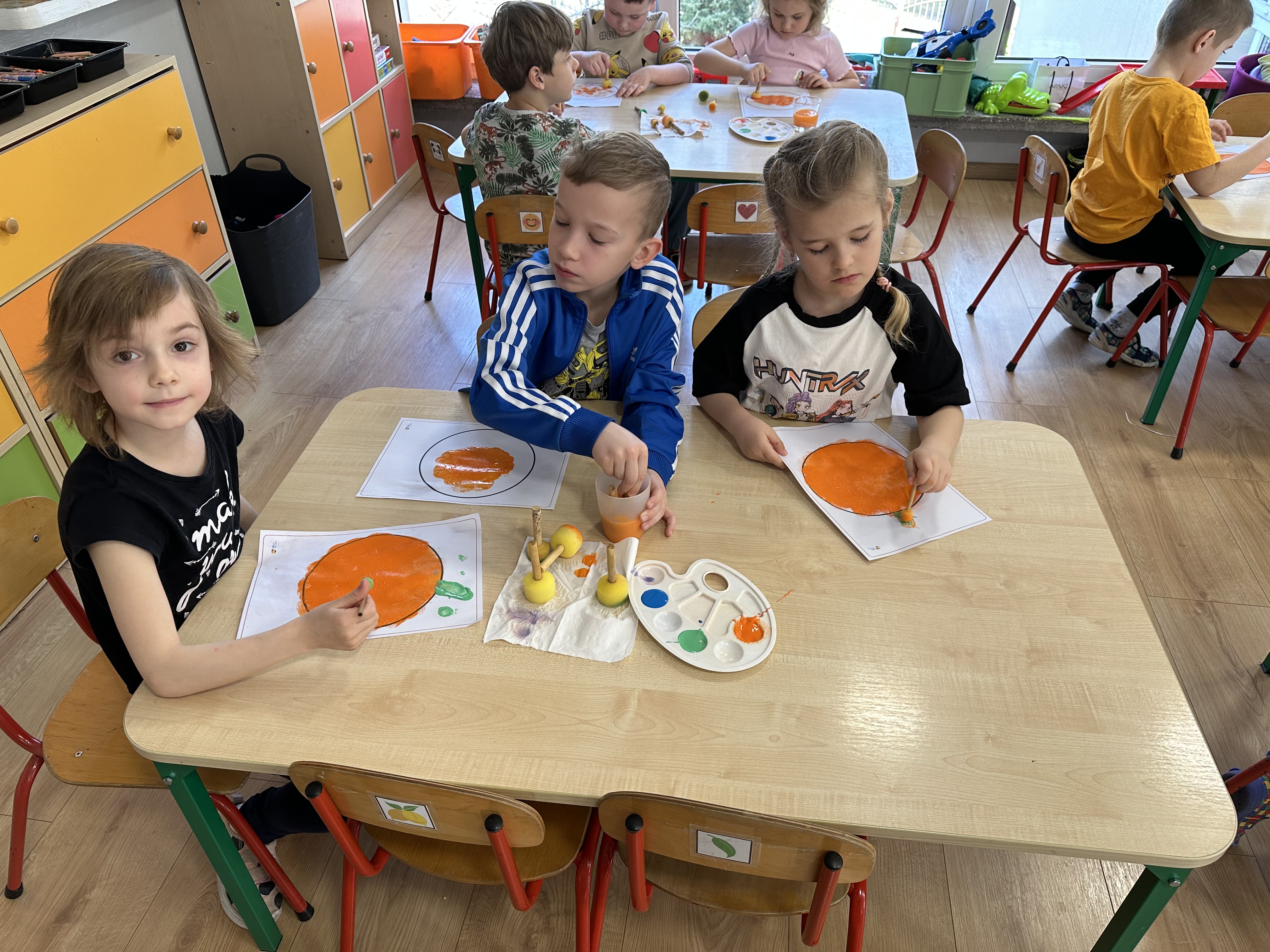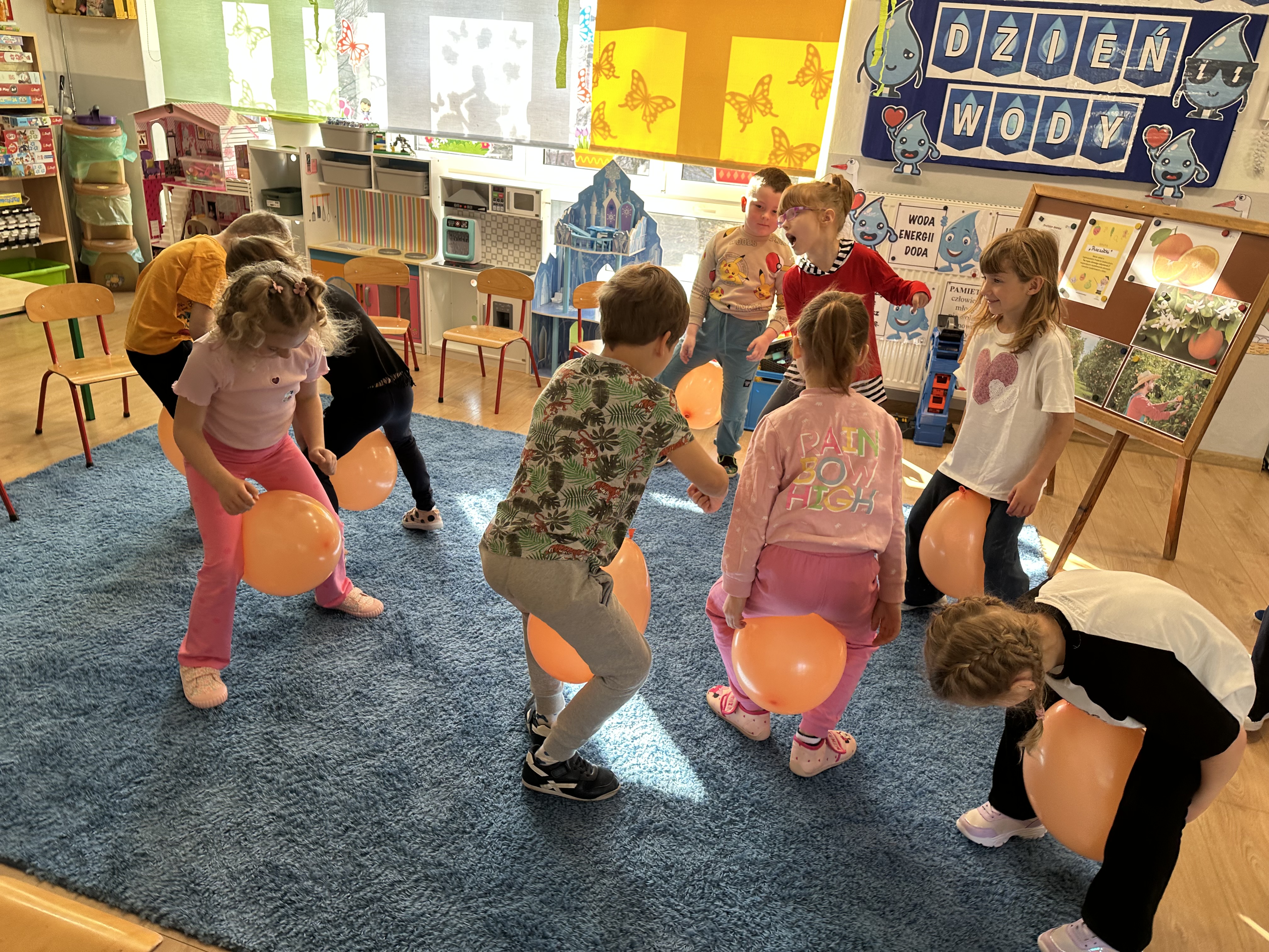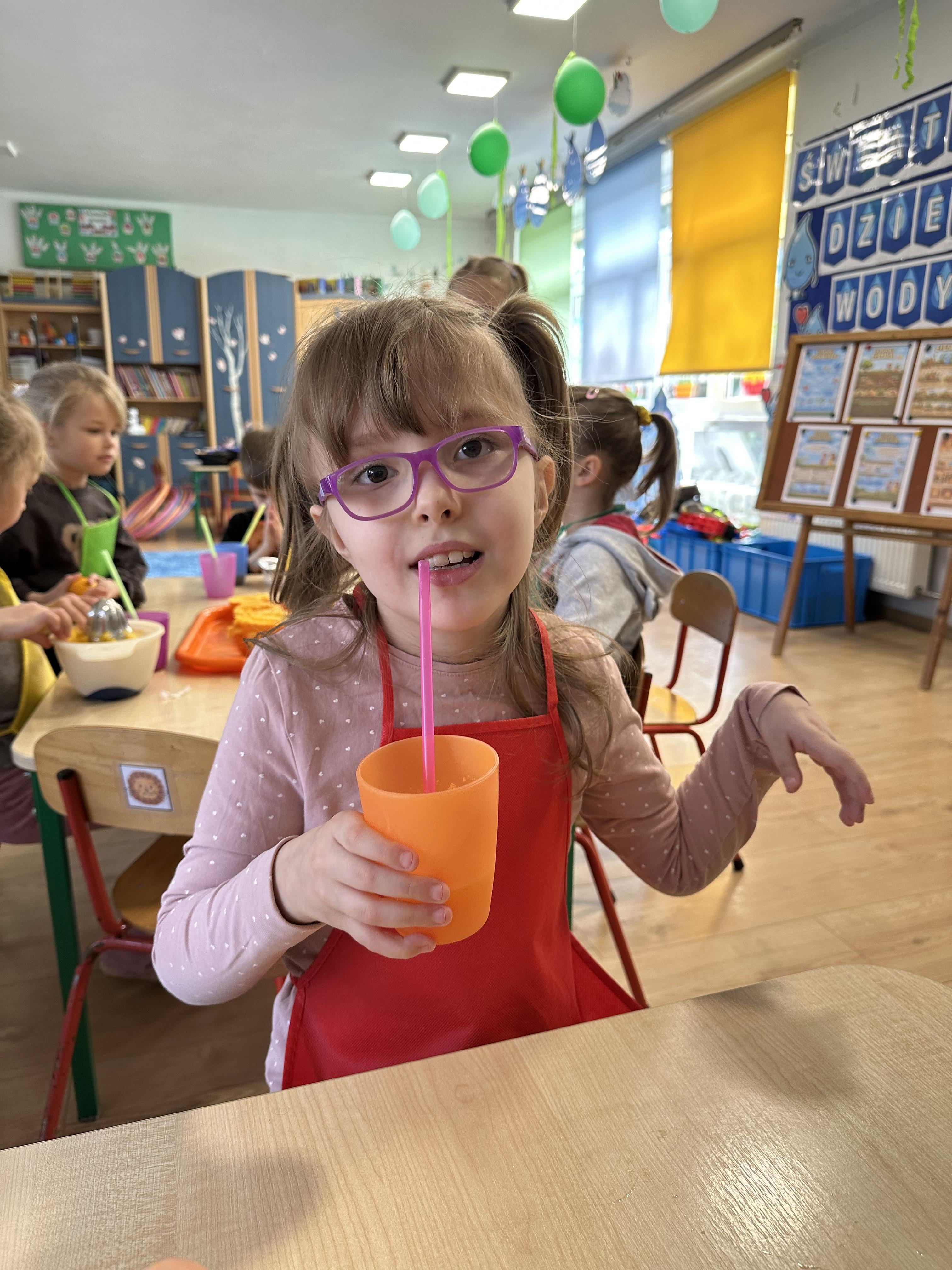 Zajęcia rozpoczęły się od otrzymania listu od profesora Animka, który wprowadził dzieci w temat kolejnej przygody. Na podstawie wskazówek zawartych w liście dzieci odgadły, że bohaterką zajęć będzie pomarańcza - owoc kojarzący się z energią i charakterystycznym kolorem. Następnie dzieci wysłuchały opowiadania pt. „Energetyczna pomarańcza” autorstwa K. Michoń. Po wysłuchaniu tekstu odbyła się rozmowa na temat jego treści. Dzieci miały możliwość poznania pomarańczy wszystkimi zmysłami - dotykały jej, wąchały oraz smakowały. Zapoznały się również z informacjami dotyczącymi uprawy pomarańczy na podstawie ilustracji. Podczas zajęć ruchowych dzieci rozwijały umiejętność reagowania na zmianę rytmu i tempa muzyki poprzez zabawy z balonem. Wykonały także pracę plastyczną przedstawiającą pomarańczę, rozwijając swoją kreatywność i zdolności manualne. W trakcie zabaw dydaktycznych dzieci doskonaliły umiejętności matematyczne, uczestnicząc w aktywności „Pomarańczowa matematyka”, polegającej między innymi na przyporządkowywaniu cyfr do odpowiedniej liczby pomarańczy. Starszaki brały również udział w eksperymencie „Czy pomarańcza pływa, czy tonie w wodzie?”, wyciągając własne wnioski i rozwijając umiejętność obserwacji. Dodatkowo dzieci ćwiczyły sprawność manualną podczas zajęć grafomotorycznych „Pomarańczowa grafomotoryka ”. Ważnym elementem zajęć było również rozwijanie samodzielności - dzieci samodzielnie przygotowały sok z pomarańczy. Na zakończenie dzieci poznały wartości odżywcze pomarańczy oraz umieściły ten owoc w „Skarbcu zaginionych składników odżywczych”, wzbogacając swoją wiedzę na temat zdrowego odżywiania.