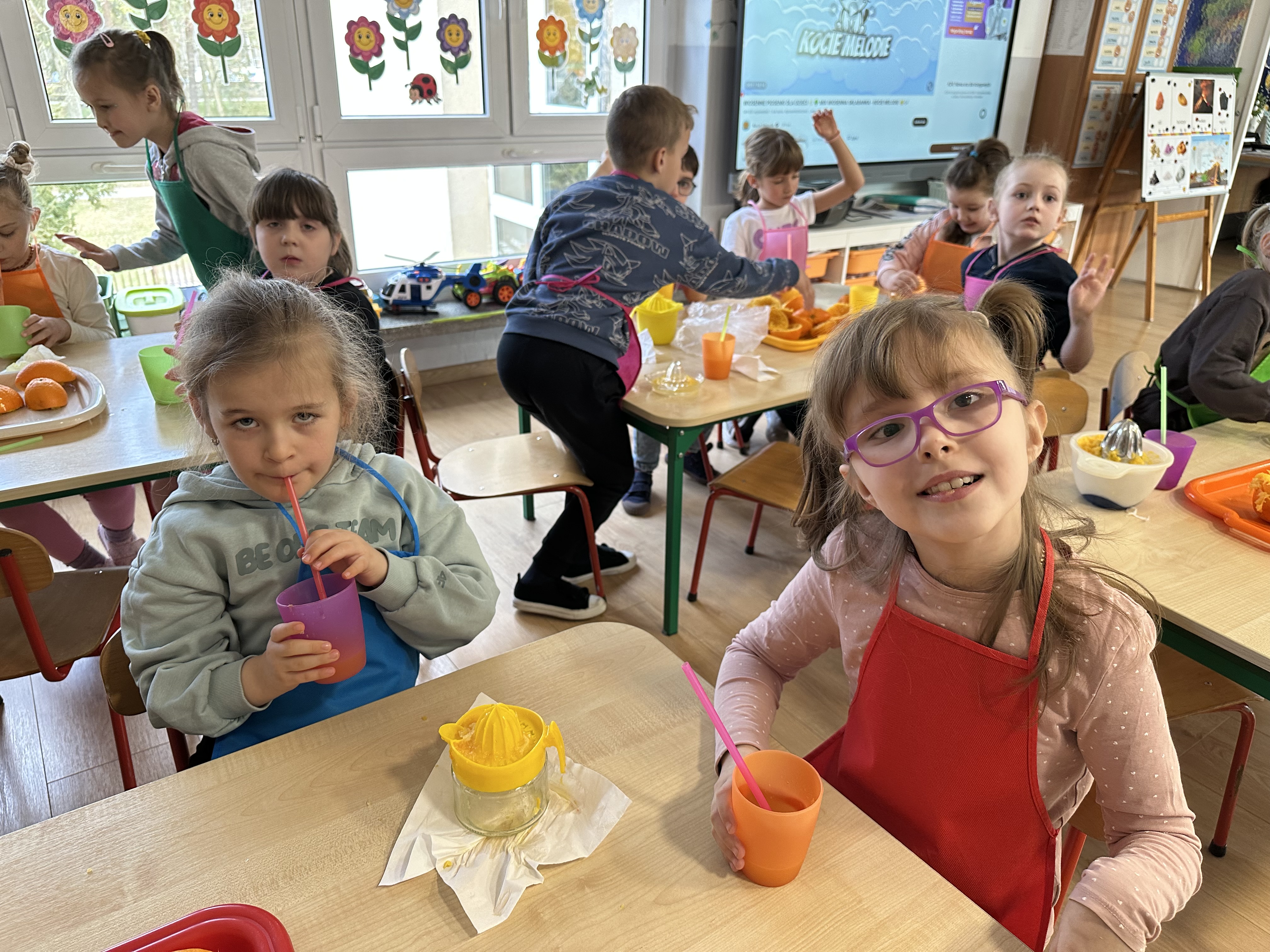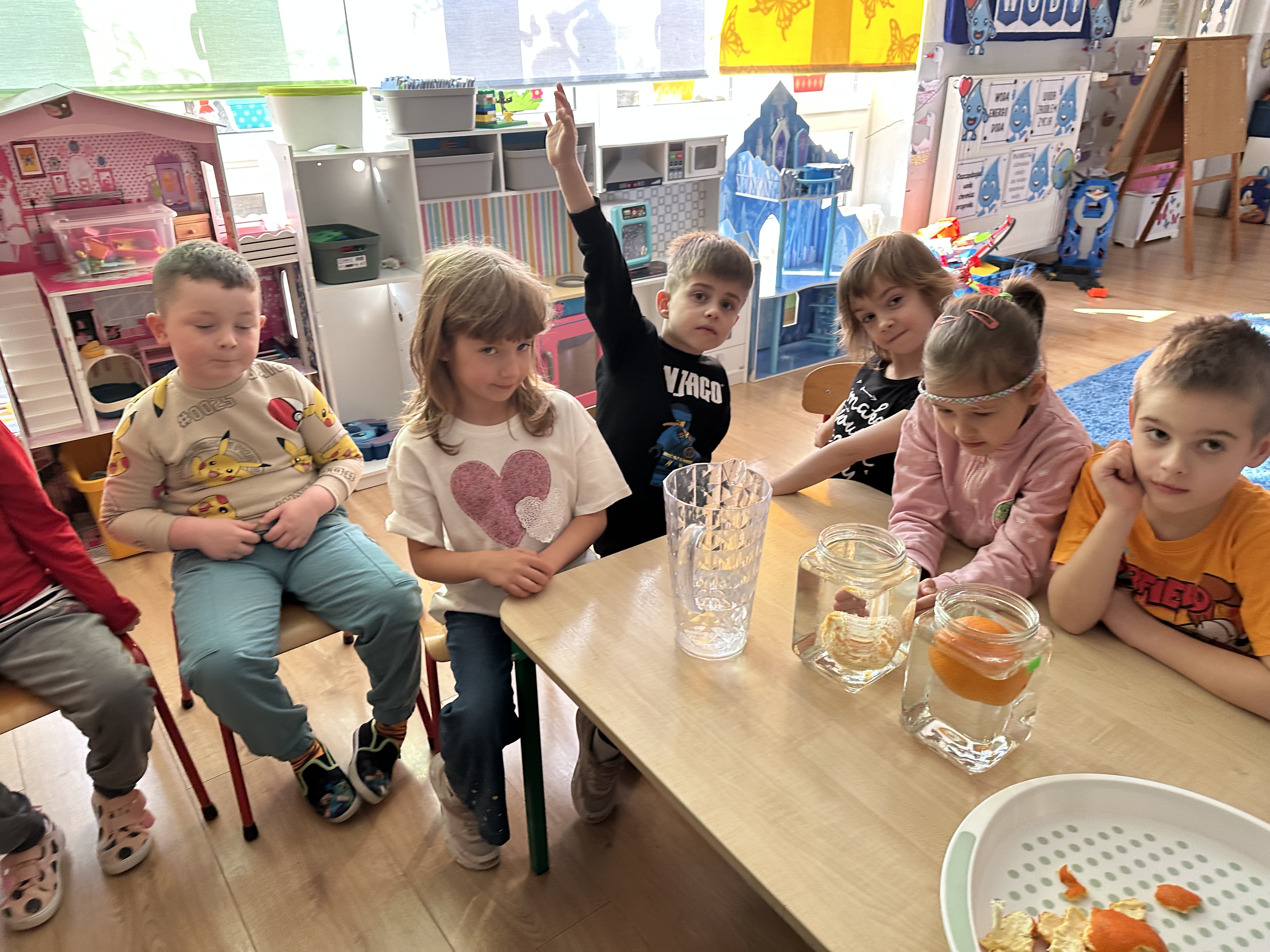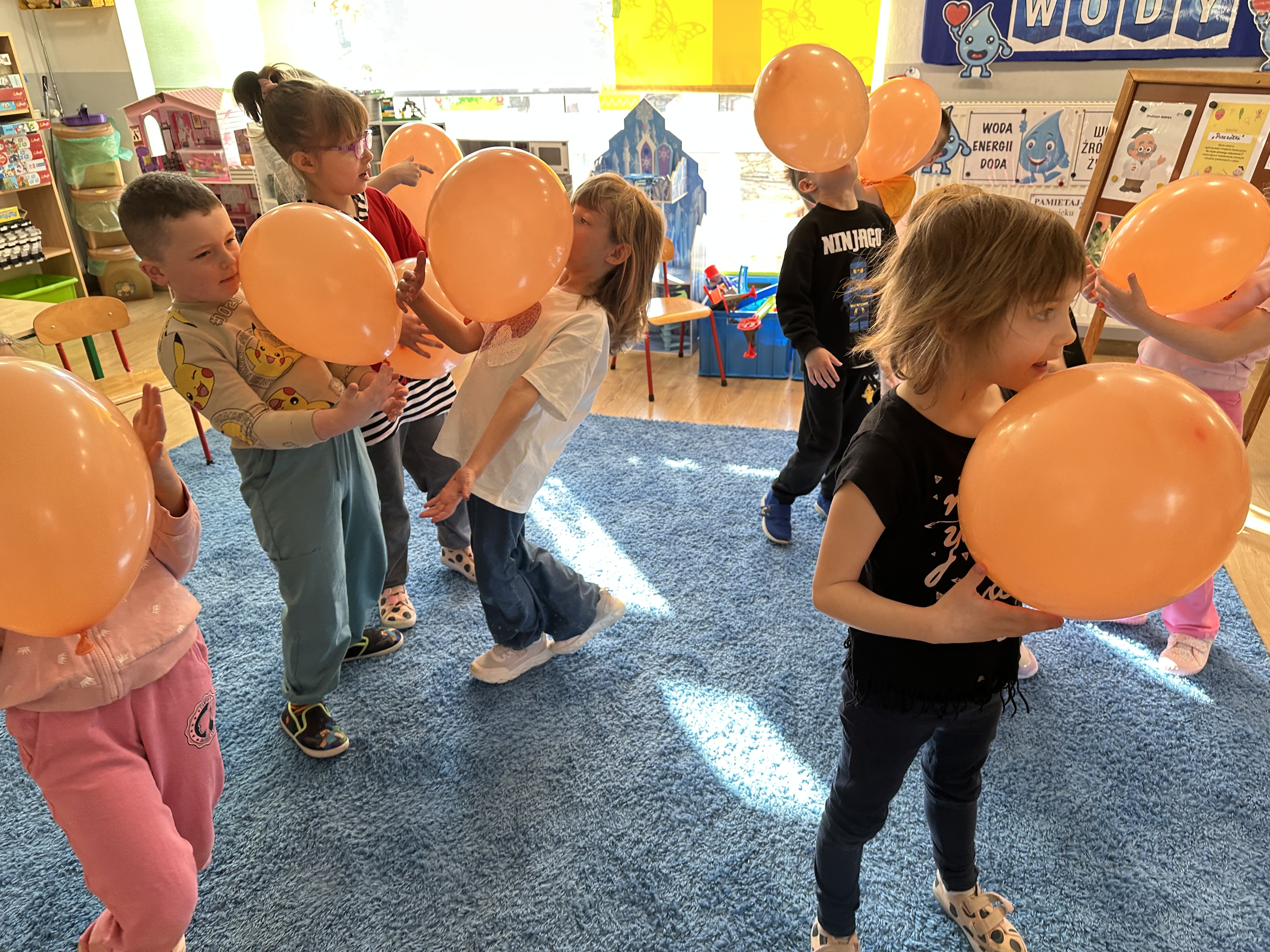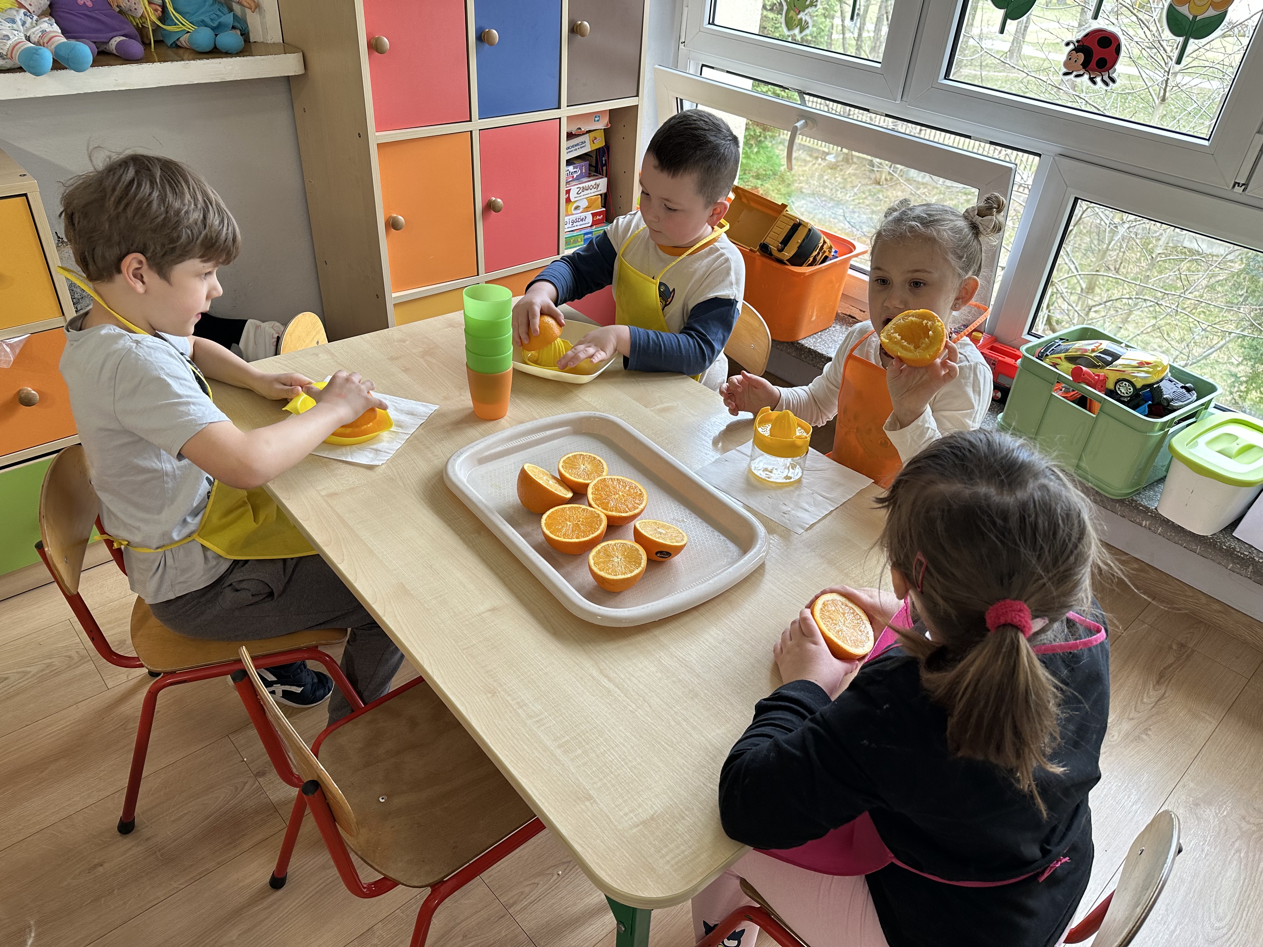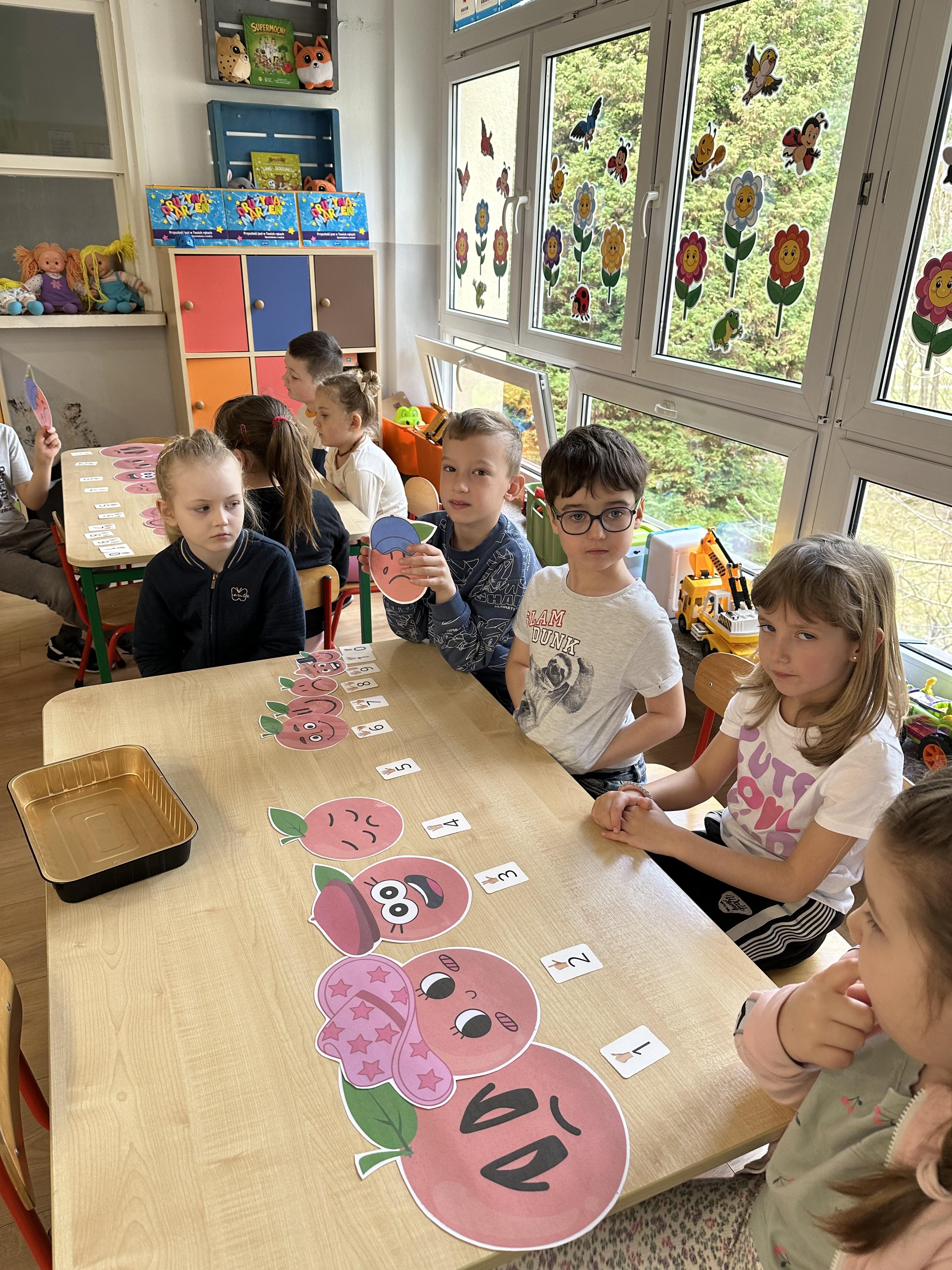 Zajęcia rozpoczęły się od otrzymania listu od profesora Animka, który wprowadził dzieci w temat kolejnej przygody. Na podstawie wskazówek zawartych w liście dzieci odgadły, że bohaterką zajęć będzie pomarańcza - owoc kojarzący się z energią i charakterystycznym kolorem. Następnie dzieci wysłuchały opowiadania pt. „Energetyczna pomarańcza” autorstwa K. Michoń. Po wysłuchaniu tekstu odbyła się rozmowa na temat jego treści. Dzieci miały możliwość poznania pomarańczy wszystkimi zmysłami - dotykały jej, wąchały oraz smakowały. Zapoznały się również z informacjami dotyczącymi uprawy pomarańczy na podstawie ilustracji. Podczas zajęć ruchowych dzieci rozwijały umiejętność reagowania na zmianę rytmu i tempa muzyki poprzez zabawy z balonem. Wykonały także pracę plastyczną przedstawiającą pomarańczę, rozwijając swoją kreatywność i zdolności manualne. W trakcie zabaw dydaktycznych dzieci doskonaliły umiejętności matematyczne, uczestnicząc w aktywności „Pomarańczowa matematyka”, polegającej między innymi na przyporządkowywaniu cyfr do odpowiedniej liczby pomarańczy. Starszaki brały również udział w eksperymencie „Czy pomarańcza pływa, czy tonie w wodzie?”, wyciągając własne wnioski i rozwijając umiejętność obserwacji. Dodatkowo dzieci ćwiczyły sprawność manualną podczas zajęć grafomotorycznych „Pomarańczowa grafomotoryka ”. Ważnym elementem zajęć było również rozwijanie samodzielności - dzieci samodzielnie przygotowały sok z pomarańczy. Na zakończenie dzieci poznały wartości odżywcze pomarańczy oraz umieściły ten owoc w „Skarbcu zaginionych składników odżywczych”, wzbogacając swoją wiedzę na temat zdrowego odżywiania.
