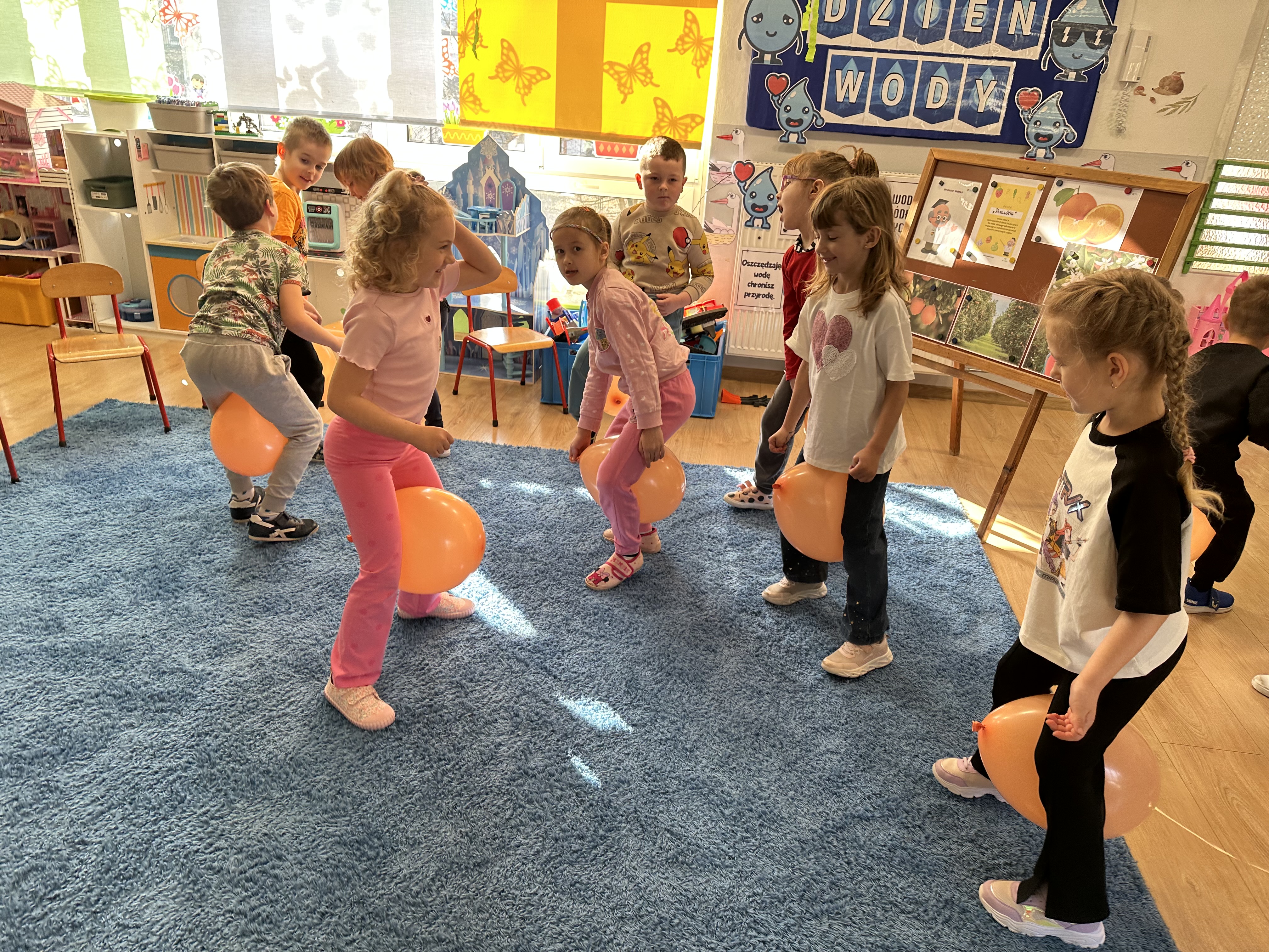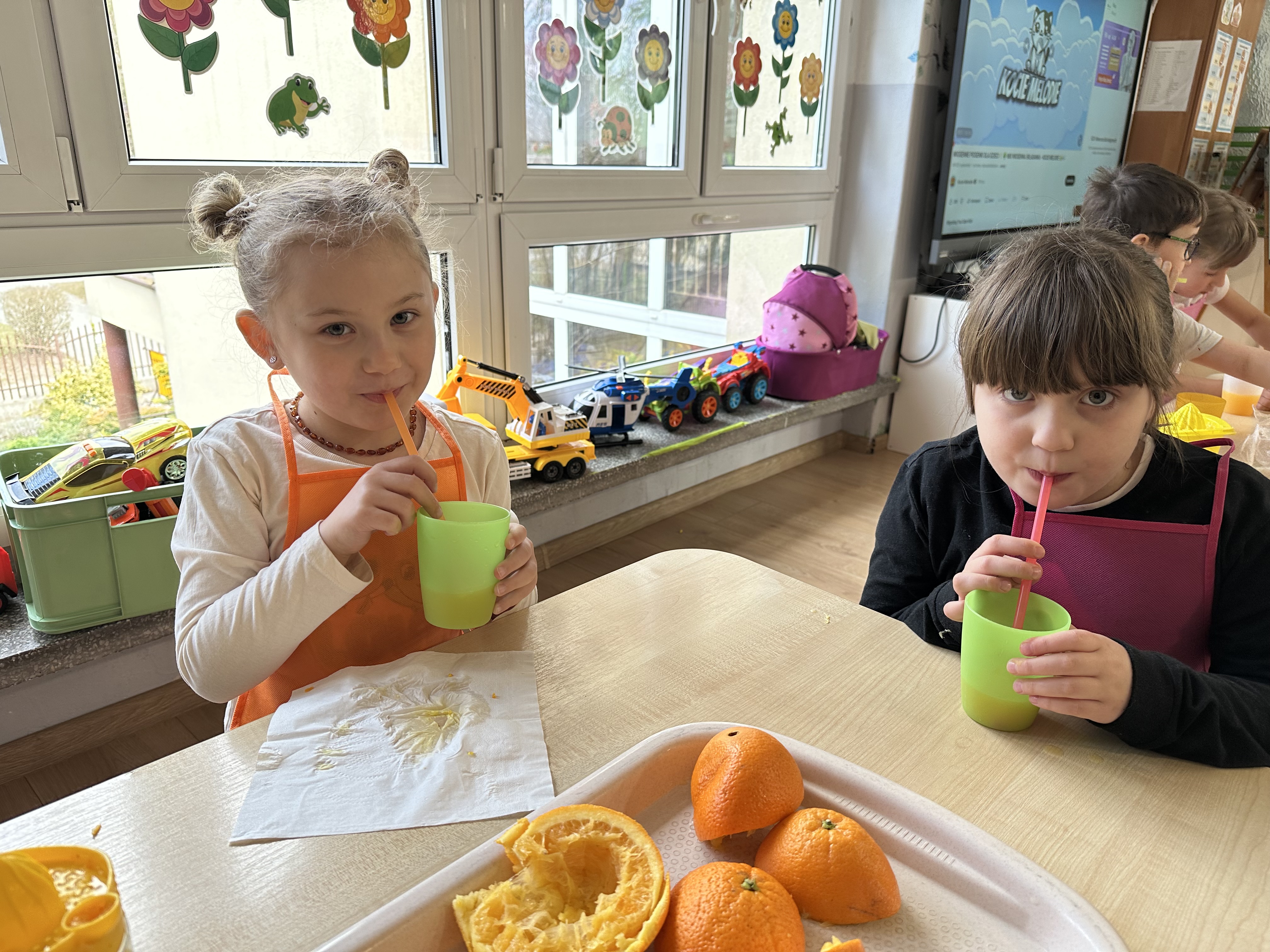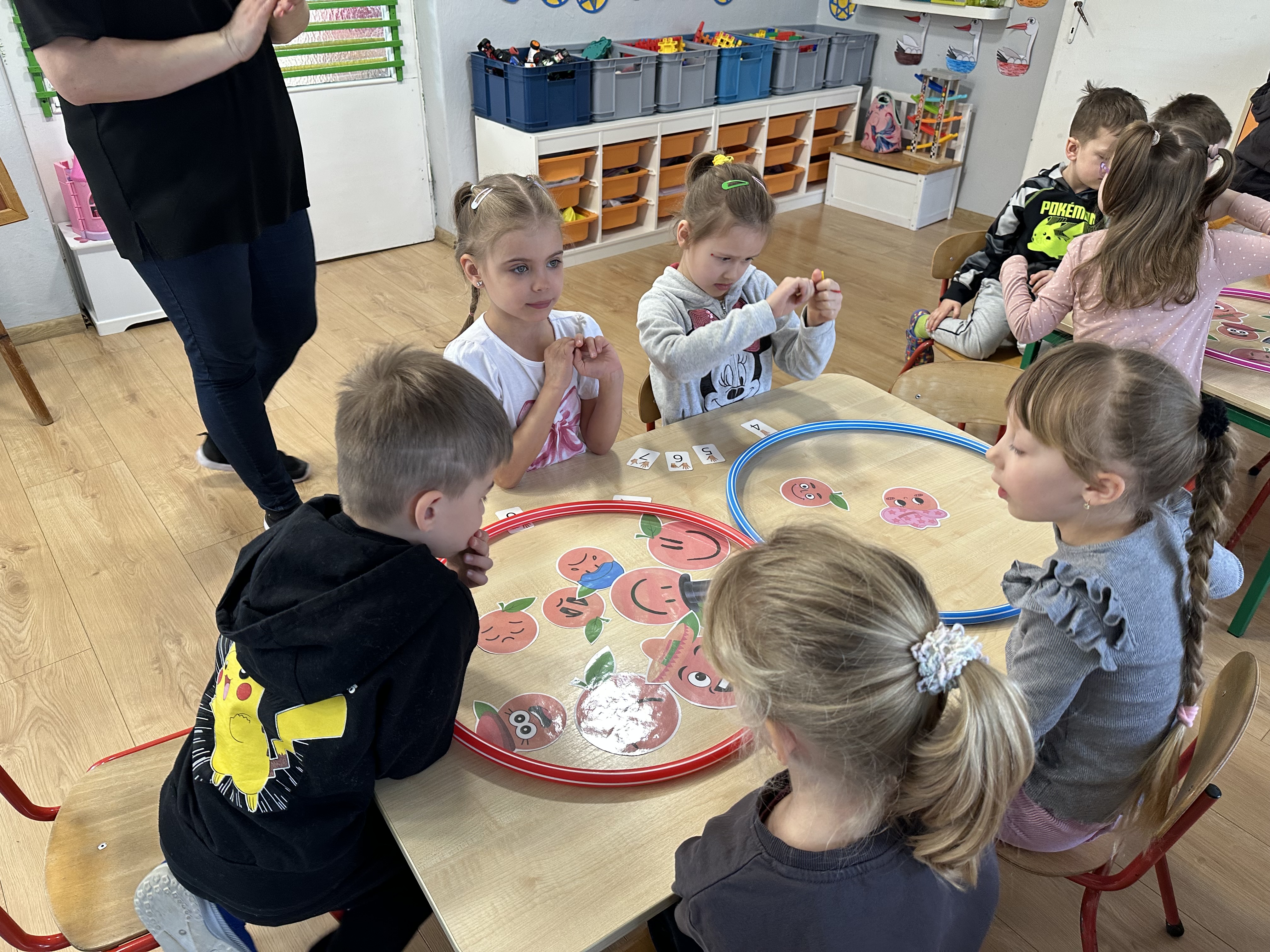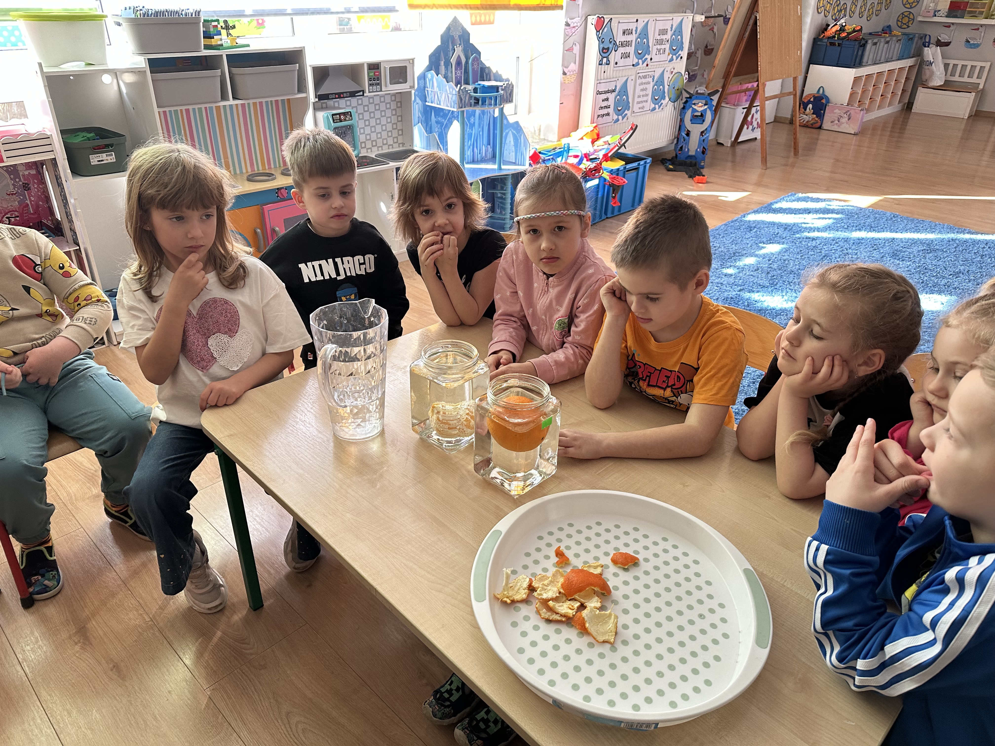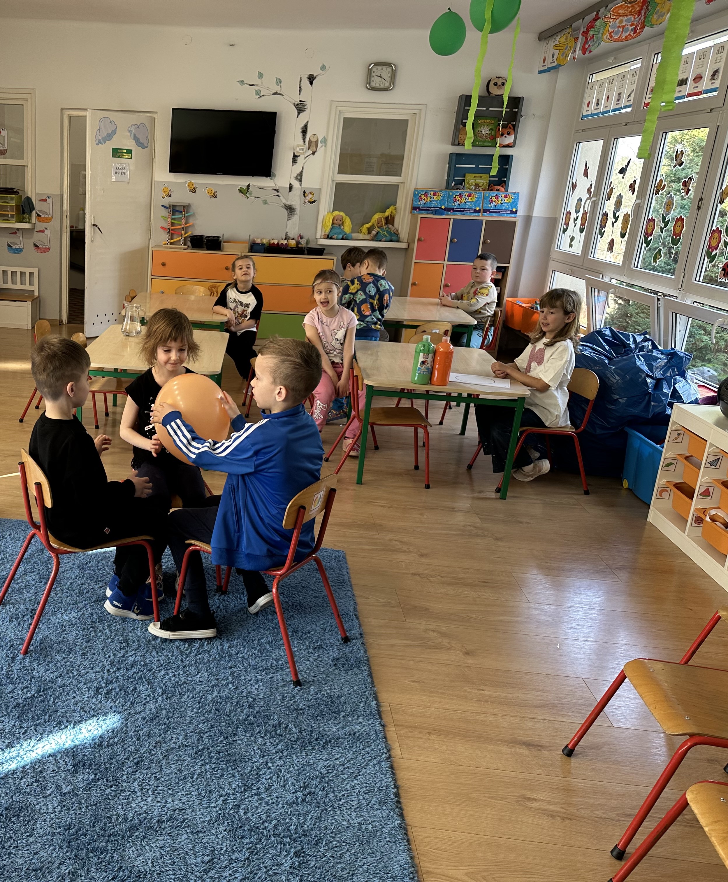 Zajęcia rozpoczęły się od otrzymania listu od profesora Animka, który wprowadził dzieci w temat kolejnej przygody. Na podstawie wskazówek zawartych w liście dzieci odgadły, że bohaterką zajęć będzie pomarańcza - owoc kojarzący się z energią i charakterystycznym kolorem. Następnie dzieci wysłuchały opowiadania pt. „Energetyczna pomarańcza” autorstwa K. Michoń. Po wysłuchaniu tekstu odbyła się rozmowa na temat jego treści. Dzieci miały możliwość poznania pomarańczy wszystkimi zmysłami - dotykały jej, wąchały oraz smakowały. Zapoznały się również z informacjami dotyczącymi uprawy pomarańczy na podstawie ilustracji. Podczas zajęć ruchowych dzieci rozwijały umiejętność reagowania na zmianę rytmu i tempa muzyki poprzez zabawy z balonem. Wykonały także pracę plastyczną przedstawiającą pomarańczę, rozwijając swoją kreatywność i zdolności manualne. W trakcie zabaw dydaktycznych dzieci doskonaliły umiejętności matematyczne, uczestnicząc w aktywności „Pomarańczowa matematyka”, polegającej między innymi na przyporządkowywaniu cyfr do odpowiedniej liczby pomarańczy. Starszaki brały również udział w eksperymencie „Czy pomarańcza pływa, czy tonie w wodzie?”, wyciągając własne wnioski i rozwijając umiejętność obserwacji. Dodatkowo dzieci ćwiczyły sprawność manualną podczas zajęć grafomotorycznych „Pomarańczowa grafomotoryka ”. Ważnym elementem zajęć było również rozwijanie samodzielności - dzieci samodzielnie przygotowały sok z pomarańczy. Na zakończenie dzieci poznały wartości odżywcze pomarańczy oraz umieściły ten owoc w „Skarbcu zaginionych składników odżywczych”, wzbogacając swoją wiedzę na temat zdrowego odżywiania.