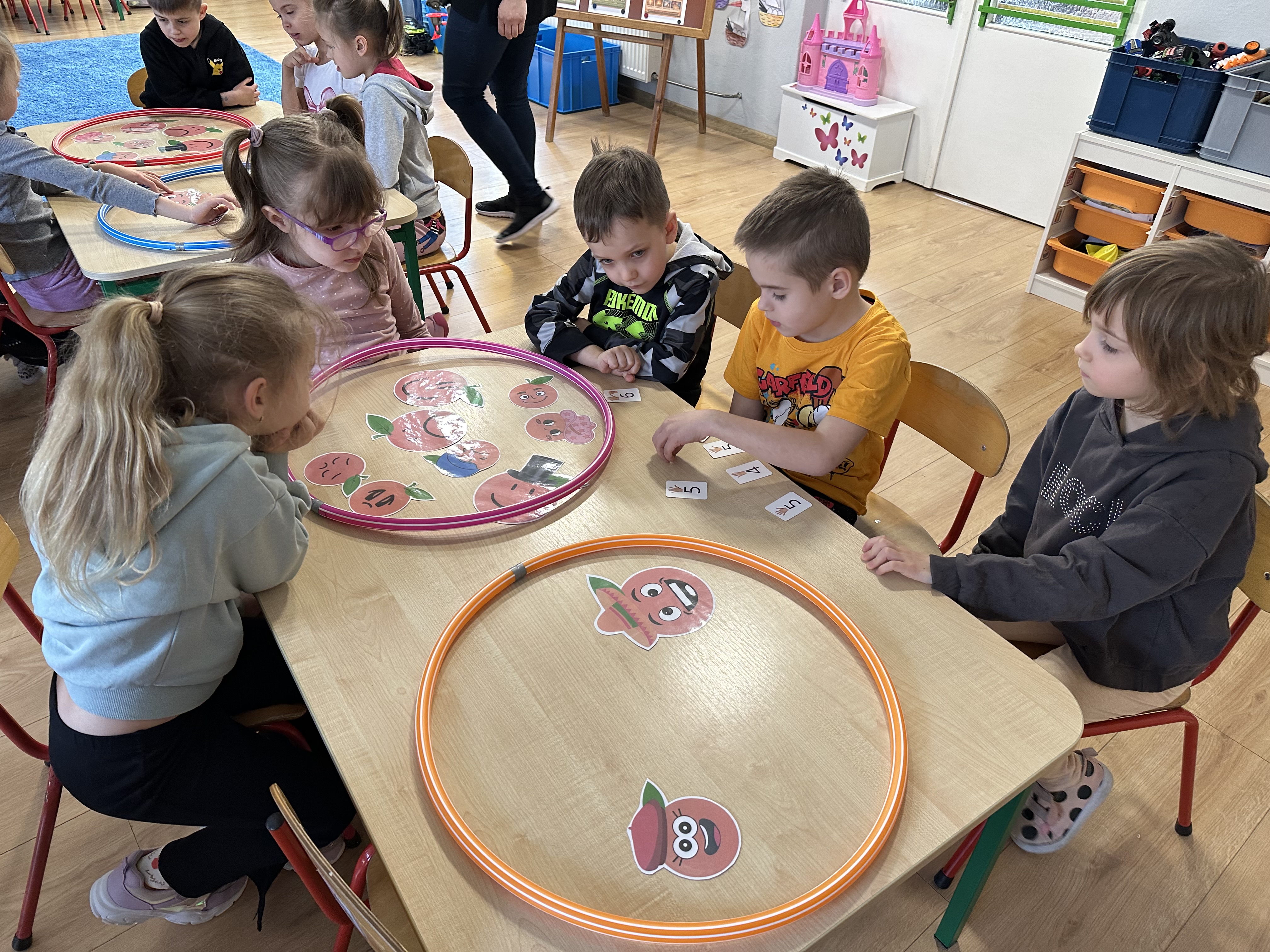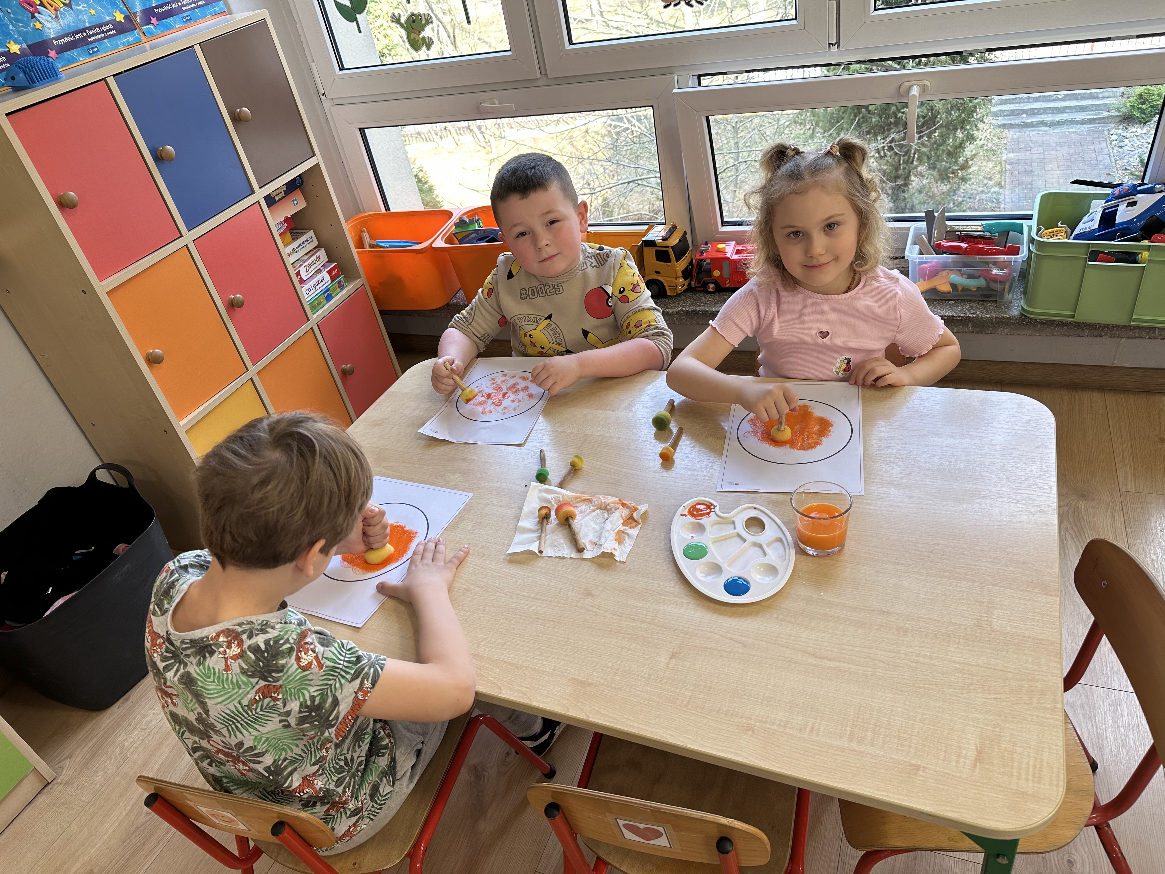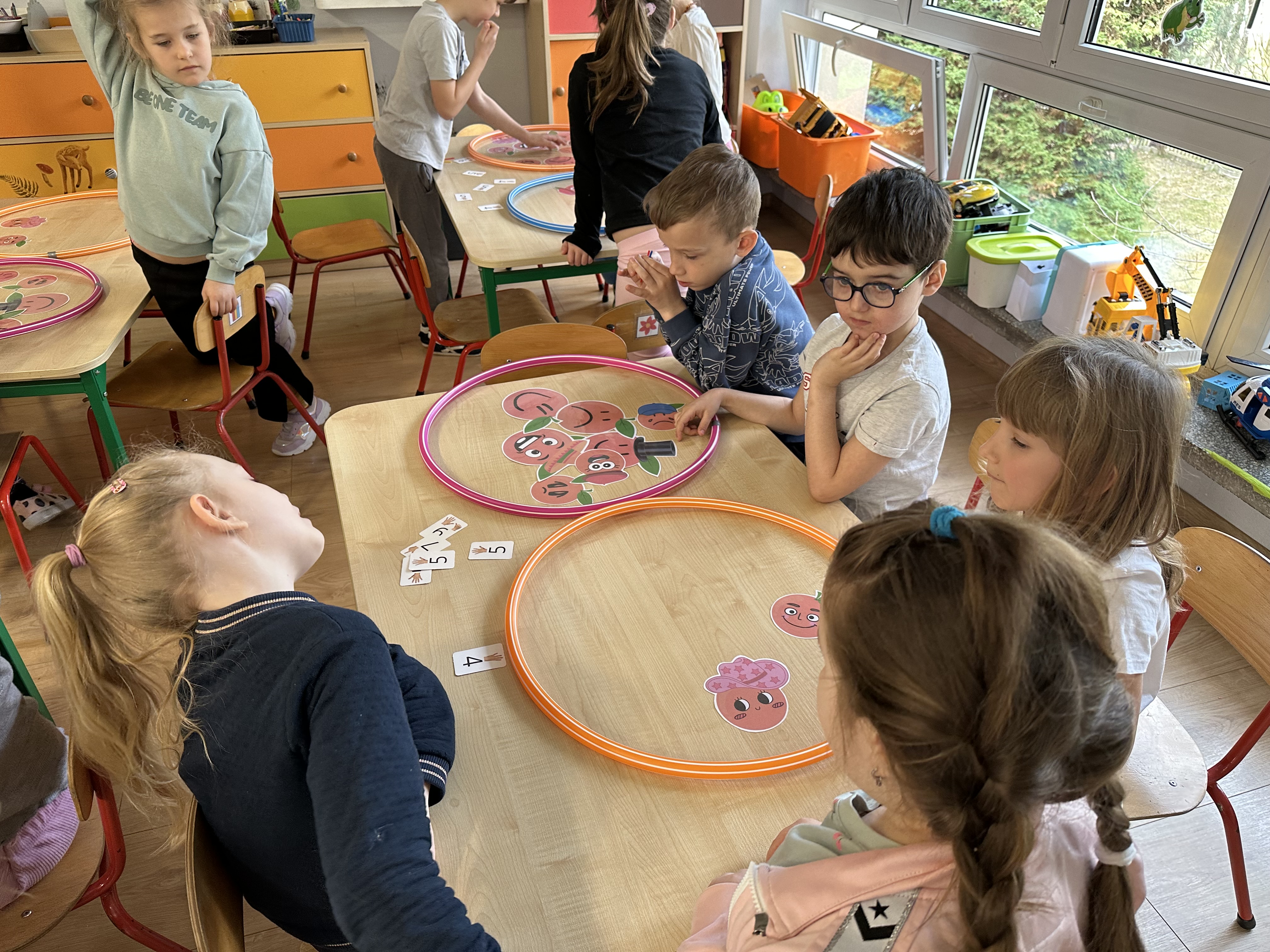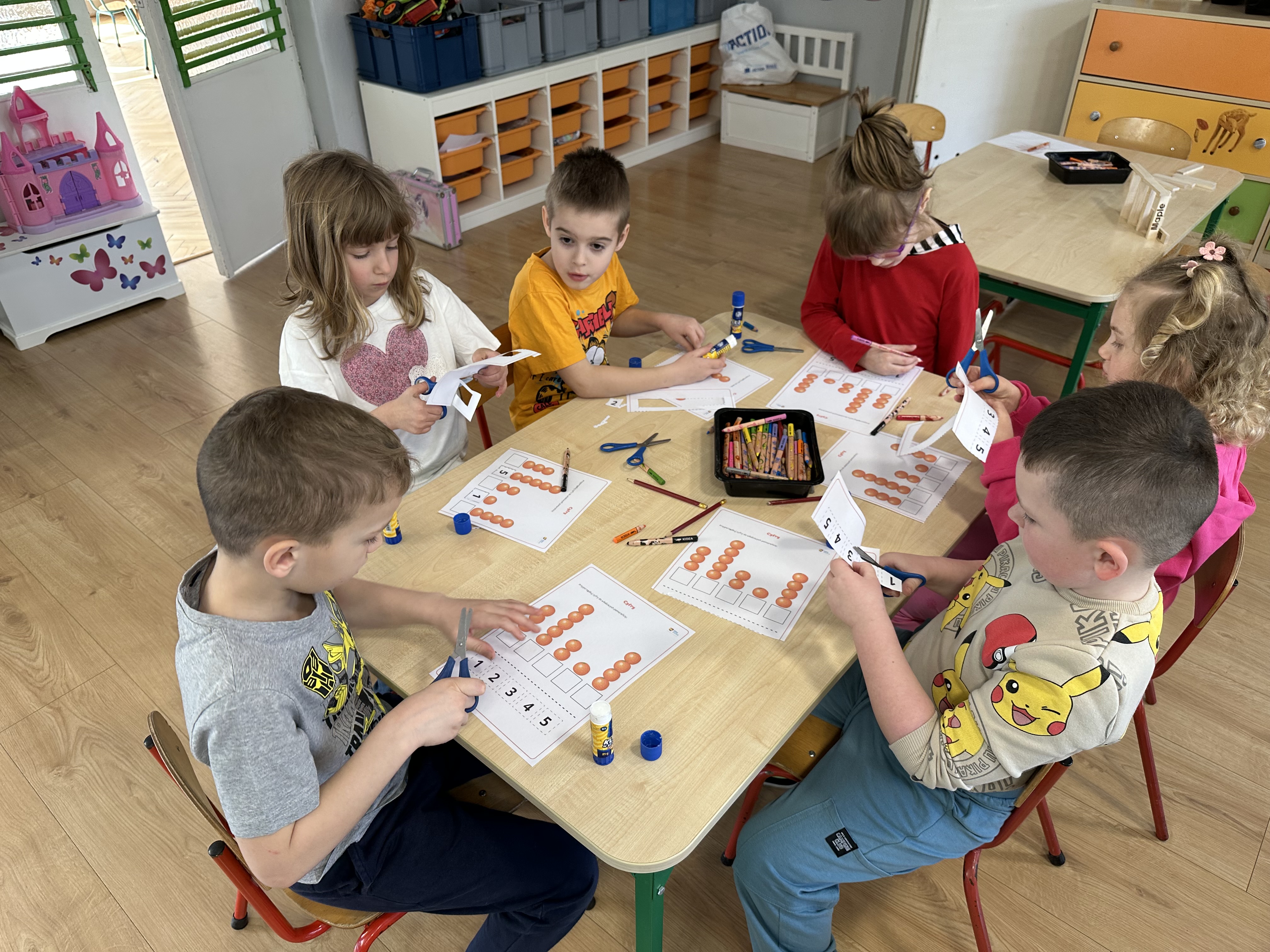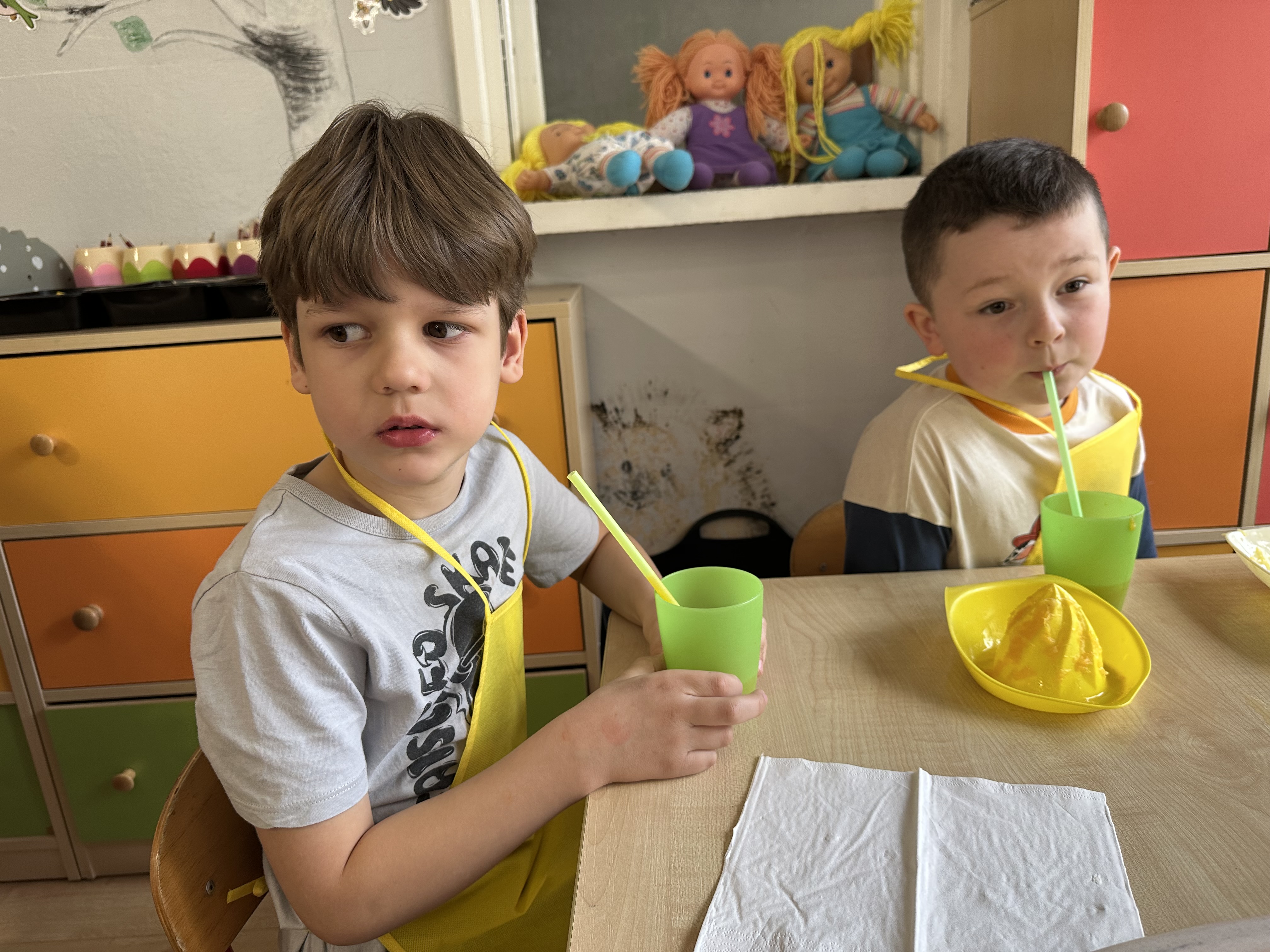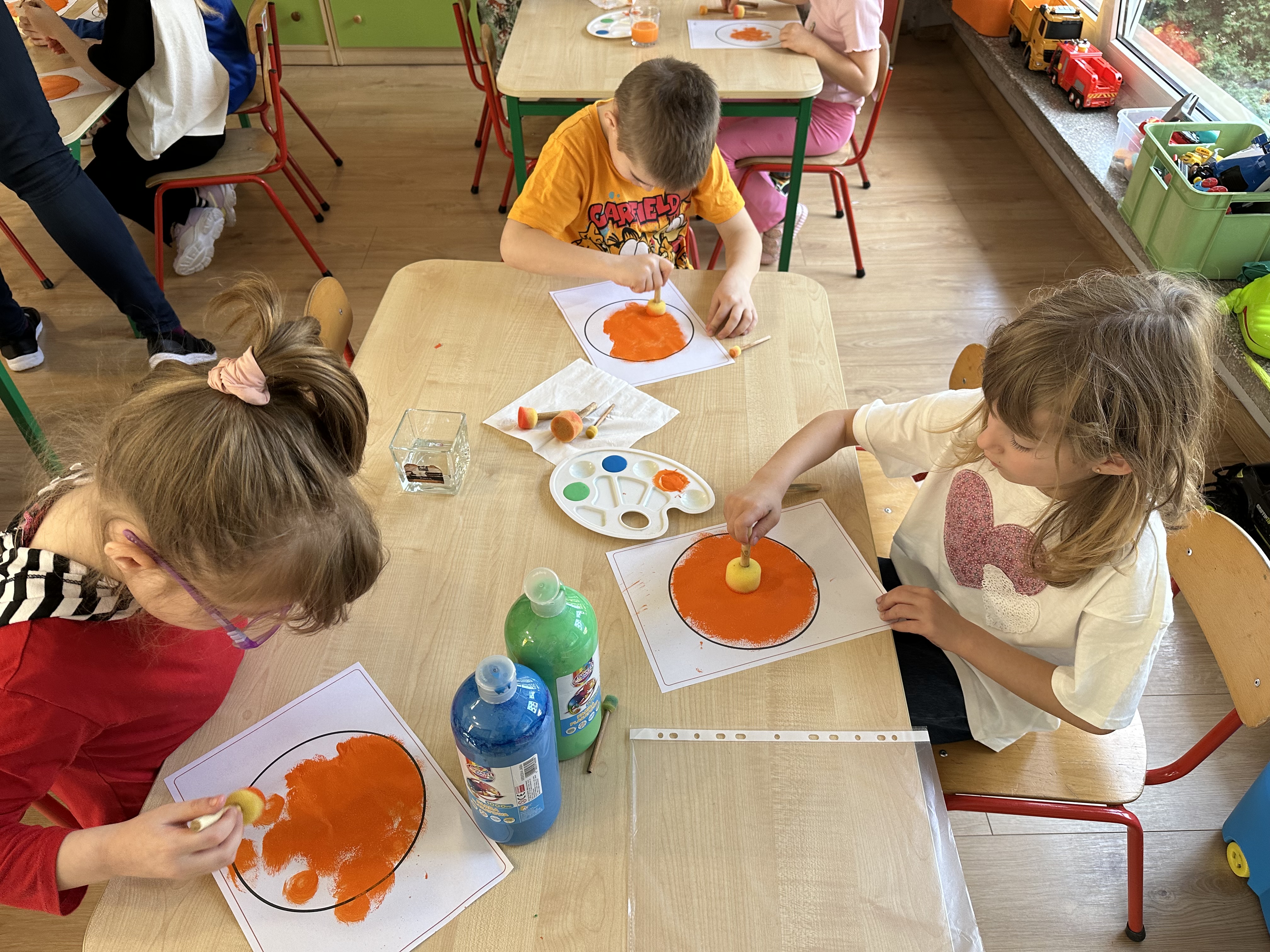 Zajęcia rozpoczęły się od otrzymania listu od profesora Animka, który wprowadził dzieci w temat kolejnej przygody. Na podstawie wskazówek zawartych w liście dzieci odgadły, że bohaterką zajęć będzie pomarańcza - owoc kojarzący się z energią i charakterystycznym kolorem. Następnie dzieci wysłuchały opowiadania pt. „Energetyczna pomarańcza” autorstwa K. Michoń. Po wysłuchaniu tekstu odbyła się rozmowa na temat jego treści. Dzieci miały możliwość poznania pomarańczy wszystkimi zmysłami - dotykały jej, wąchały oraz smakowały. Zapoznały się również z informacjami dotyczącymi uprawy pomarańczy na podstawie ilustracji. Podczas zajęć ruchowych dzieci rozwijały umiejętność reagowania na zmianę rytmu i tempa muzyki poprzez zabawy z balonem. Wykonały także pracę plastyczną przedstawiającą pomarańczę, rozwijając swoją kreatywność i zdolności manualne. W trakcie zabaw dydaktycznych dzieci doskonaliły umiejętności matematyczne, uczestnicząc w aktywności „Pomarańczowa matematyka”, polegającej między innymi na przyporządkowywaniu cyfr do odpowiedniej liczby pomarańczy. Starszaki brały również udział w eksperymencie „Czy pomarańcza pływa, czy tonie w wodzie?”, wyciągając własne wnioski i rozwijając umiejętność obserwacji. Dodatkowo dzieci ćwiczyły sprawność manualną podczas zajęć grafomotorycznych „Pomarańczowa grafomotoryka ”. Ważnym elementem zajęć było również rozwijanie samodzielności - dzieci samodzielnie przygotowały sok z pomarańczy. Na zakończenie dzieci poznały wartości odżywcze pomarańczy oraz umieściły ten owoc w „Skarbcu zaginionych składników odżywczych”, wzbogacając swoją wiedzę na temat zdrowego odżywiania.