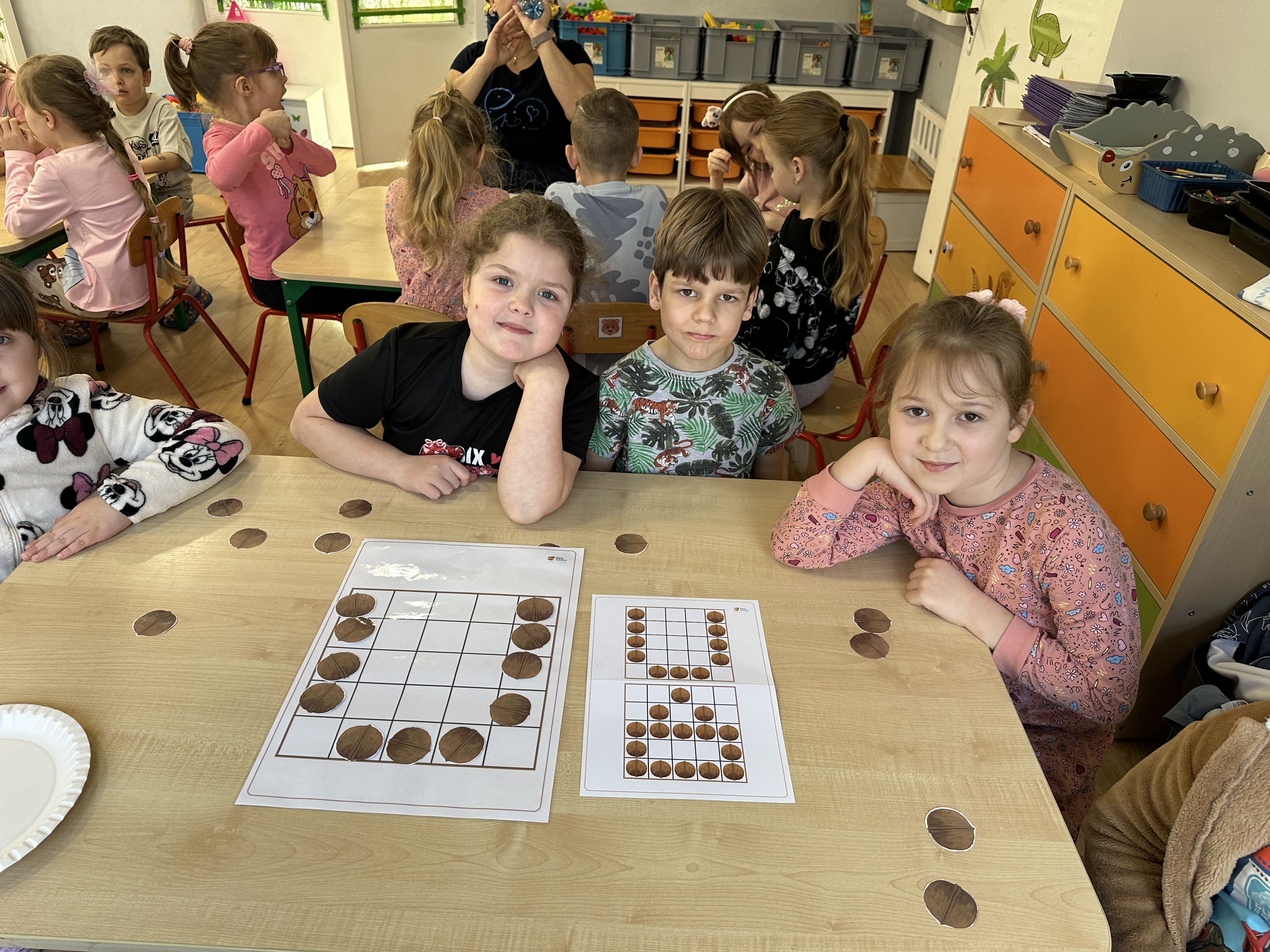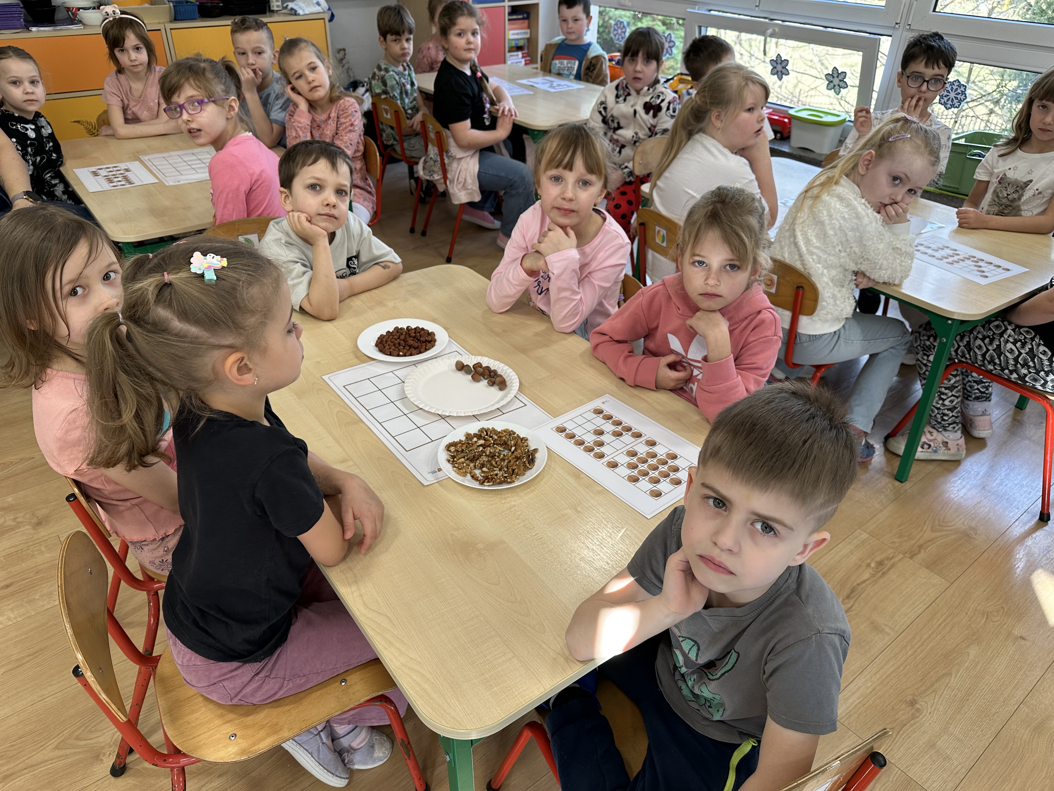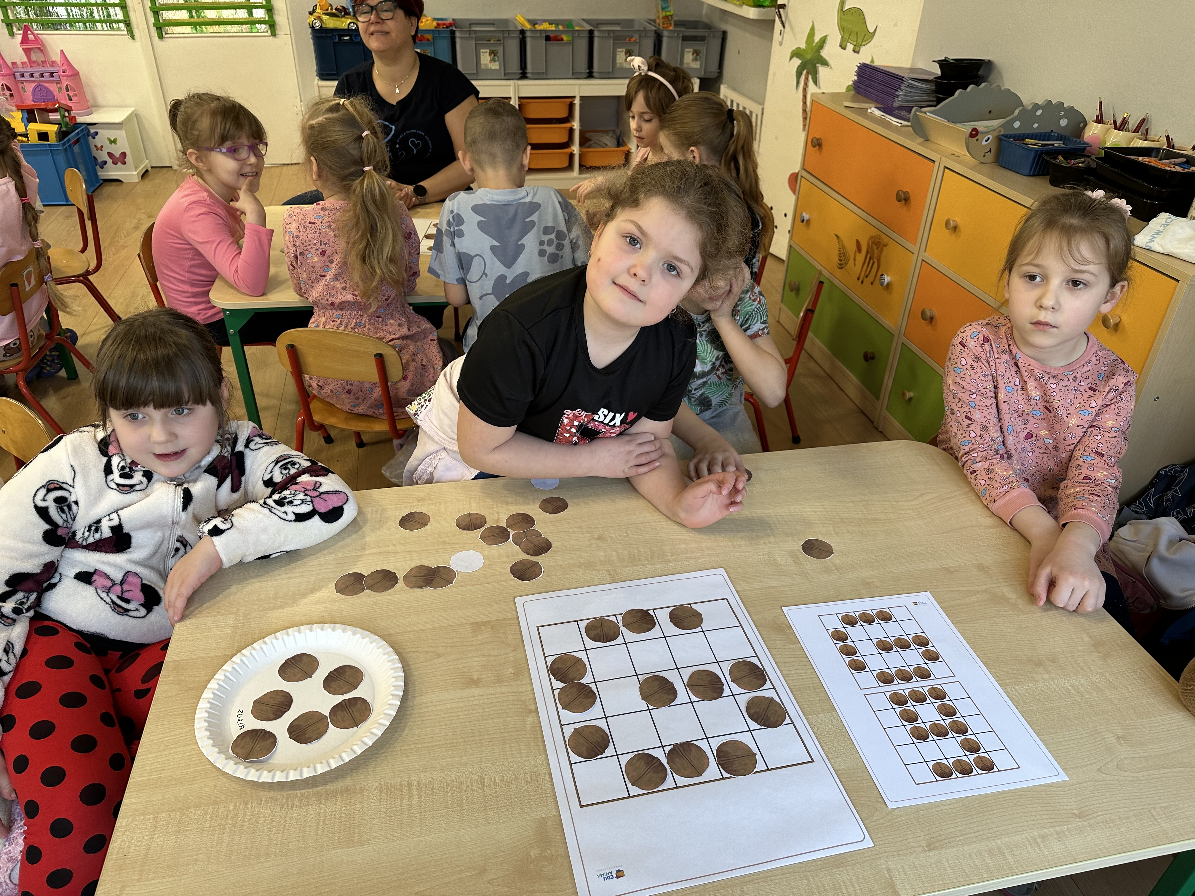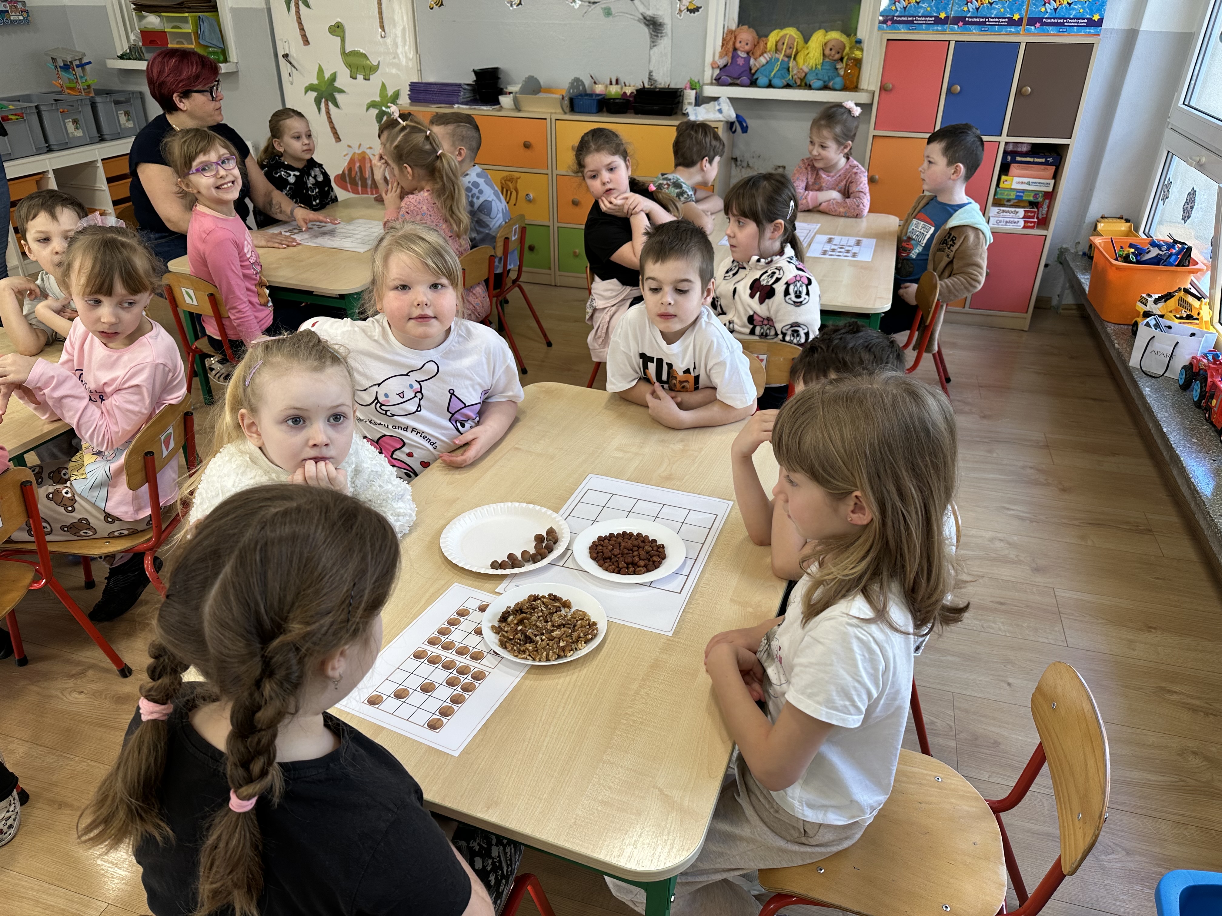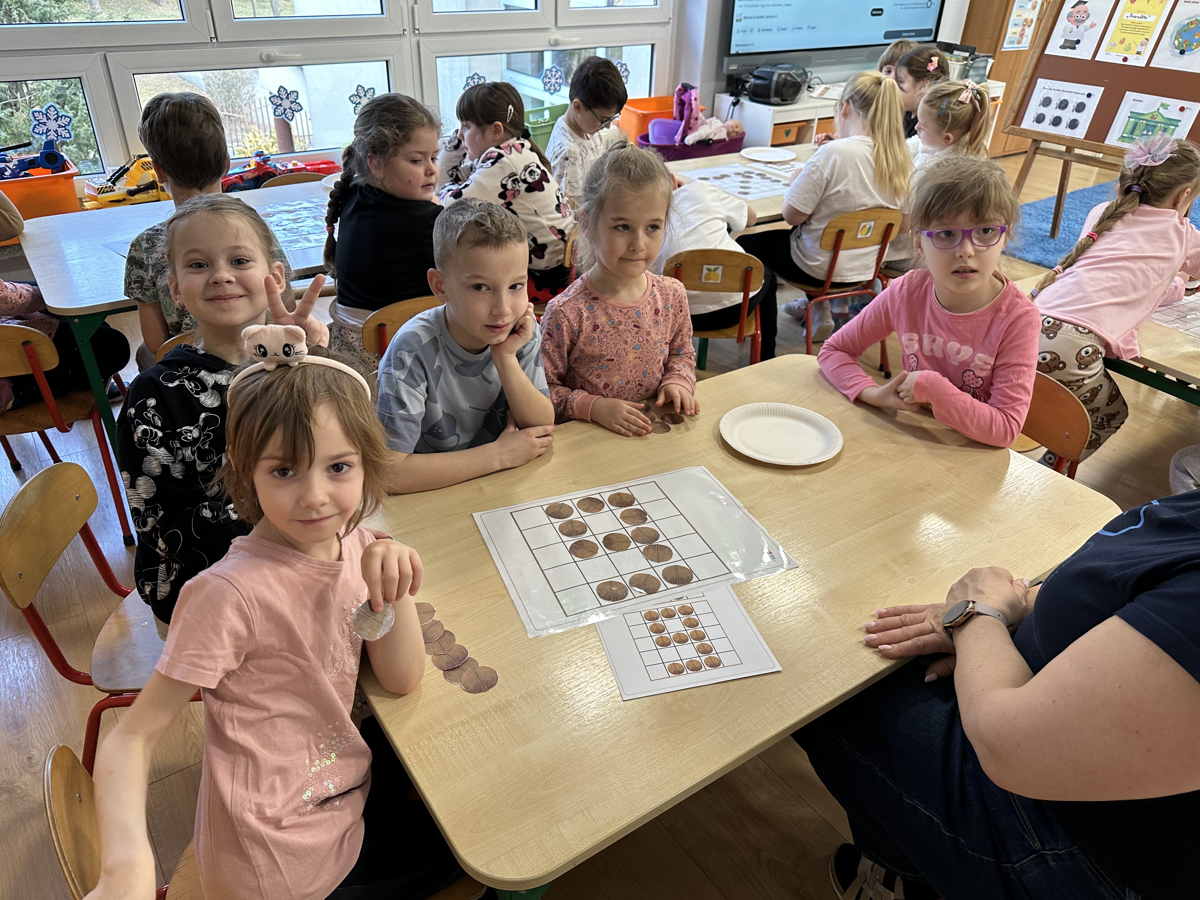 W ramach realizacji kolejnego modułu projektu edukacyjnego grupa „Pszczółek” poznawała wartości odżywcze orzechów. Wprowadzeniem do zajęć było wysłuchanie wiersza pt. „Orzechowy skarb”, który stał się inspiracją do rozmowy na temat różnych rodzajów orzechów. Dzieci aktywnie uczestniczyły w dyskusji – wymieniały znane im rodzaje orzechów oraz dzieliły się swoimi preferencjami smakowymi. Następnie oglądały ilustracje przedstawiające różnorodne orzechy oraz wysłuchały ciekawostek na ich temat. Miały również okazję do bezpośredniego kontaktu z wybranymi okazami – orzechami włoskimi i laskowymi - poprzez dotykanie, wąchanie i degustację. Dużym zainteresowaniem cieszył się film edukacyjny przedstawiający proces wzrostu orzechów ziemnych w przyspieszonym tempie. Po jego obejrzeniu dzieci utrwalały zdobytą wiedzę, układając ilustracje w odpowiedniej kolejności. W trakcie zajęć nie zabrakło również aktywności ruchowych – dzieci brały udział w zabawie „Wiewiórka hop do dziupli z orzeszkiem – wiewiórka z dziupli”, która rozwijała ich sprawność fizyczną i refleks. W dalszej części zajęć dzieci zapoznały się z nazwami zdrowych potraw zawierających orzechy oraz uczestniczyły w zabawie „Układanka lewopółkulowa”, odwzorowując kształty z orzechów na planszach oraz tworząc własne kompozycje. Ćwiczyły również spostrzegawczość w zabawie „Rozpoznaj i połącz”. Zrealizowane działania pozwoliły dzieciom poszerzyć wiedzę na temat zdrowego odżywiania, rozwijać zmysły oraz umiejętności poznawcze i manualne.