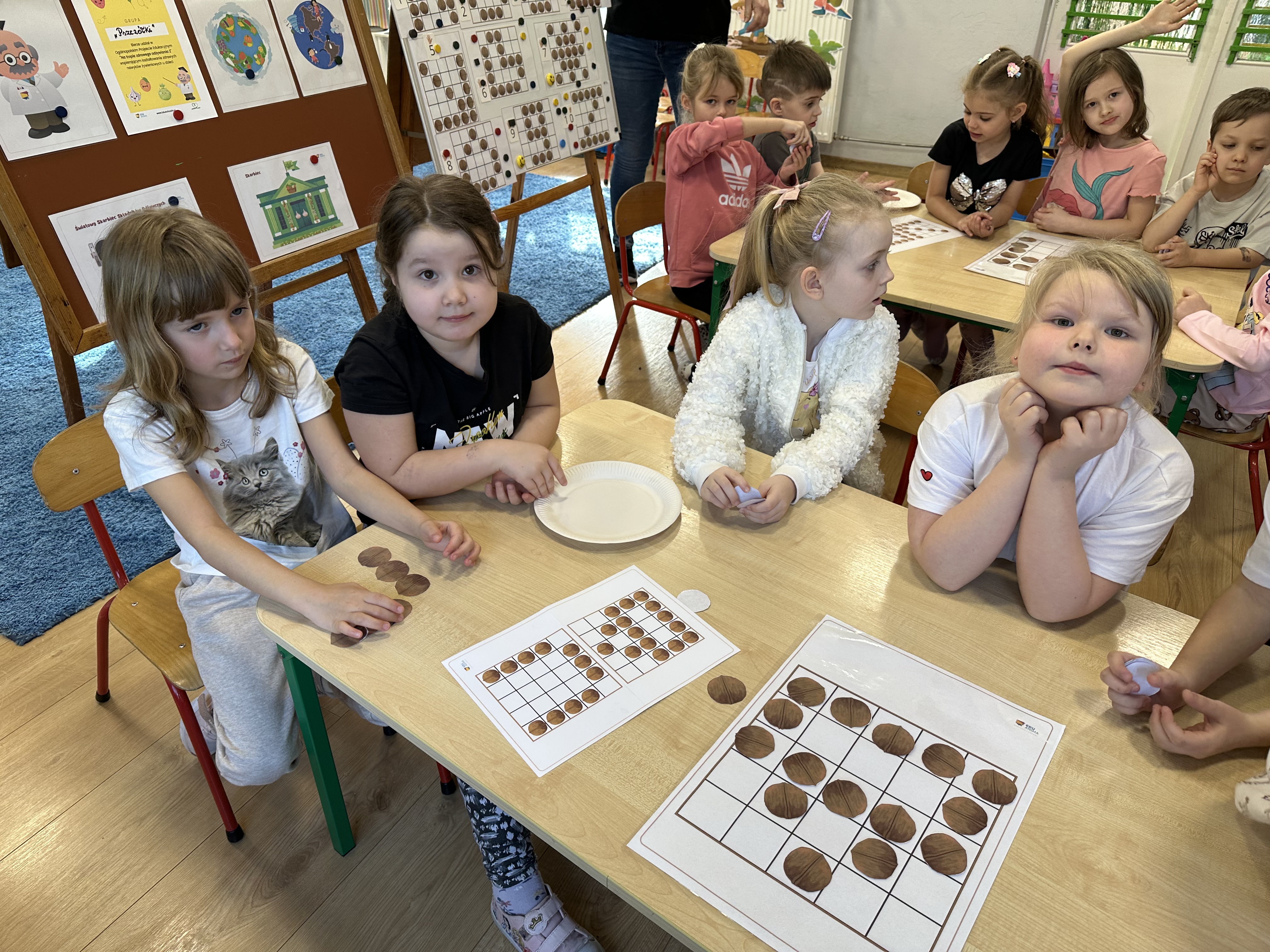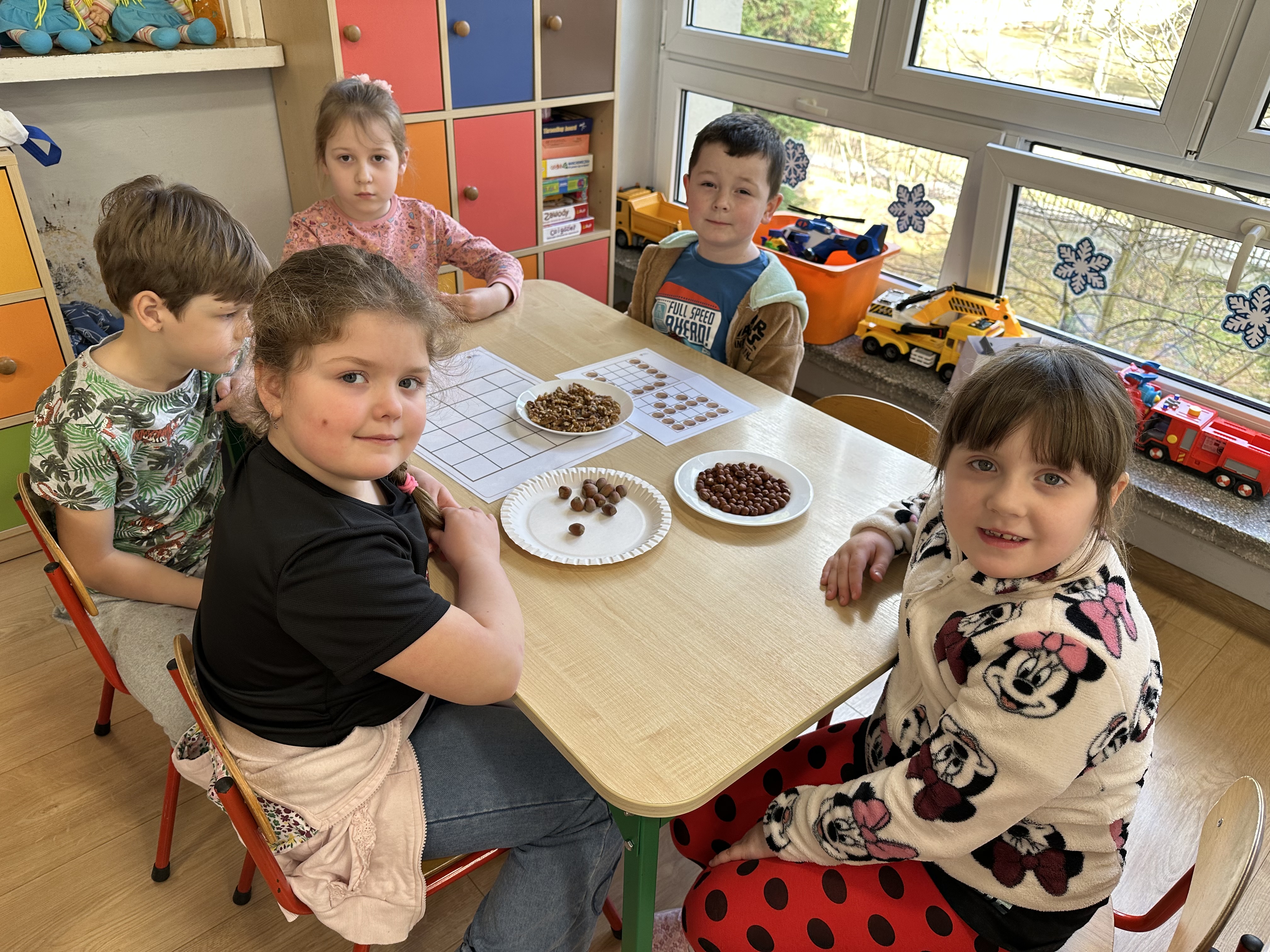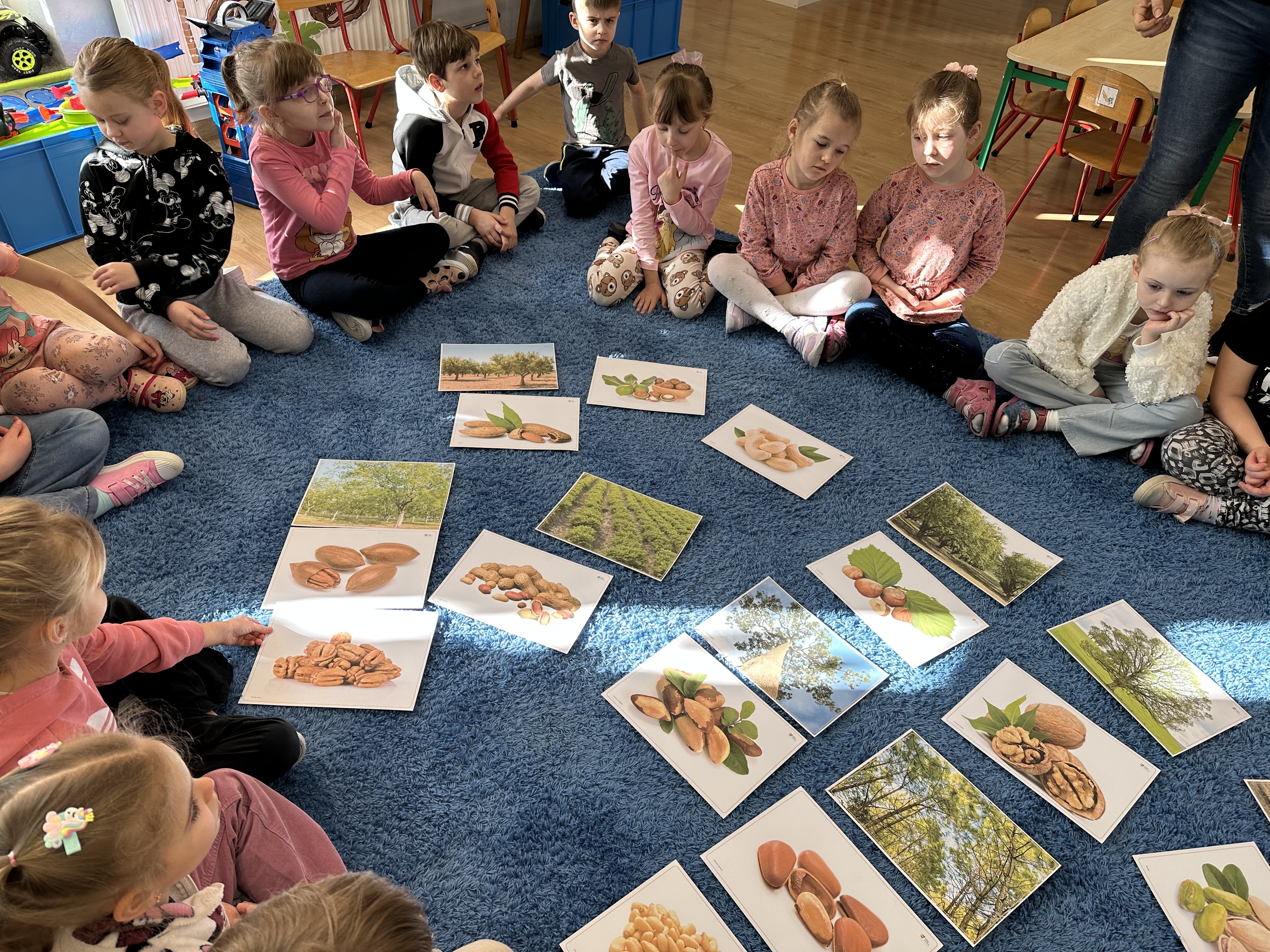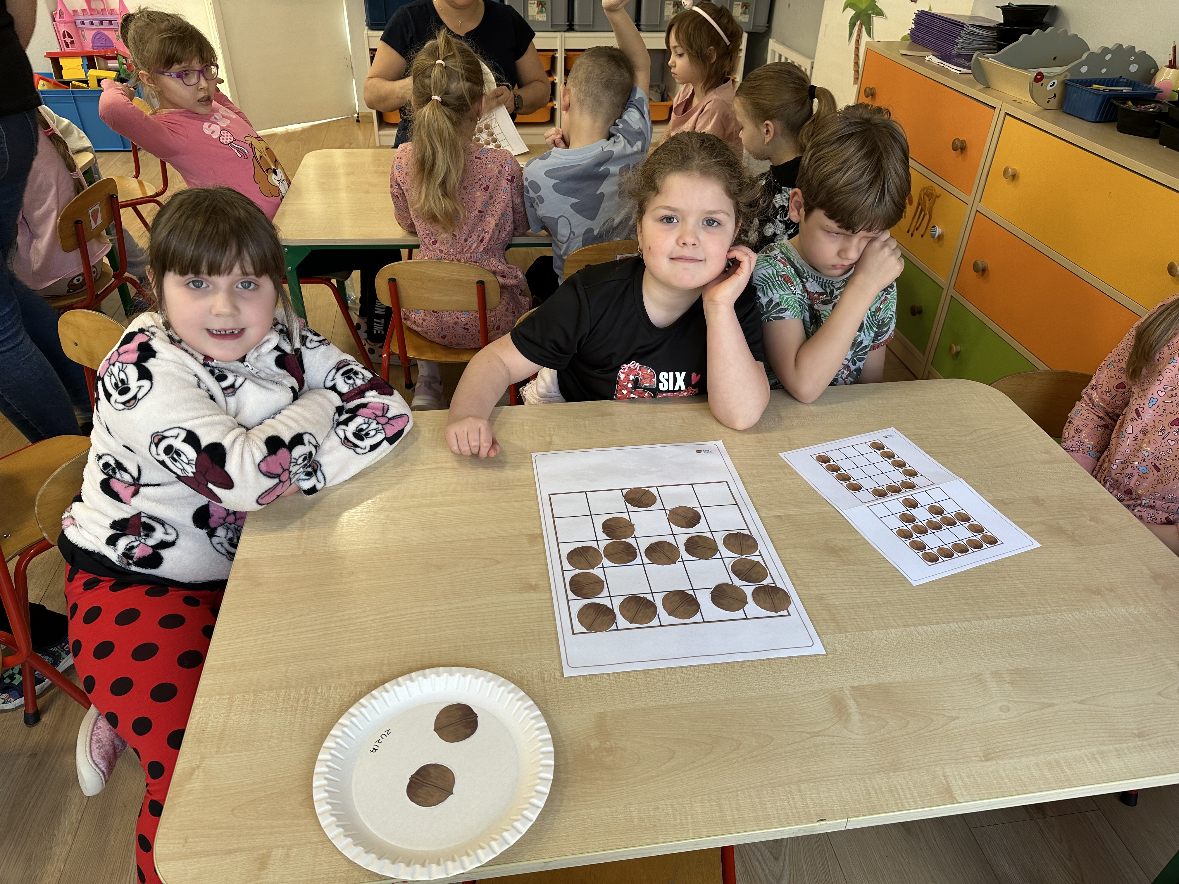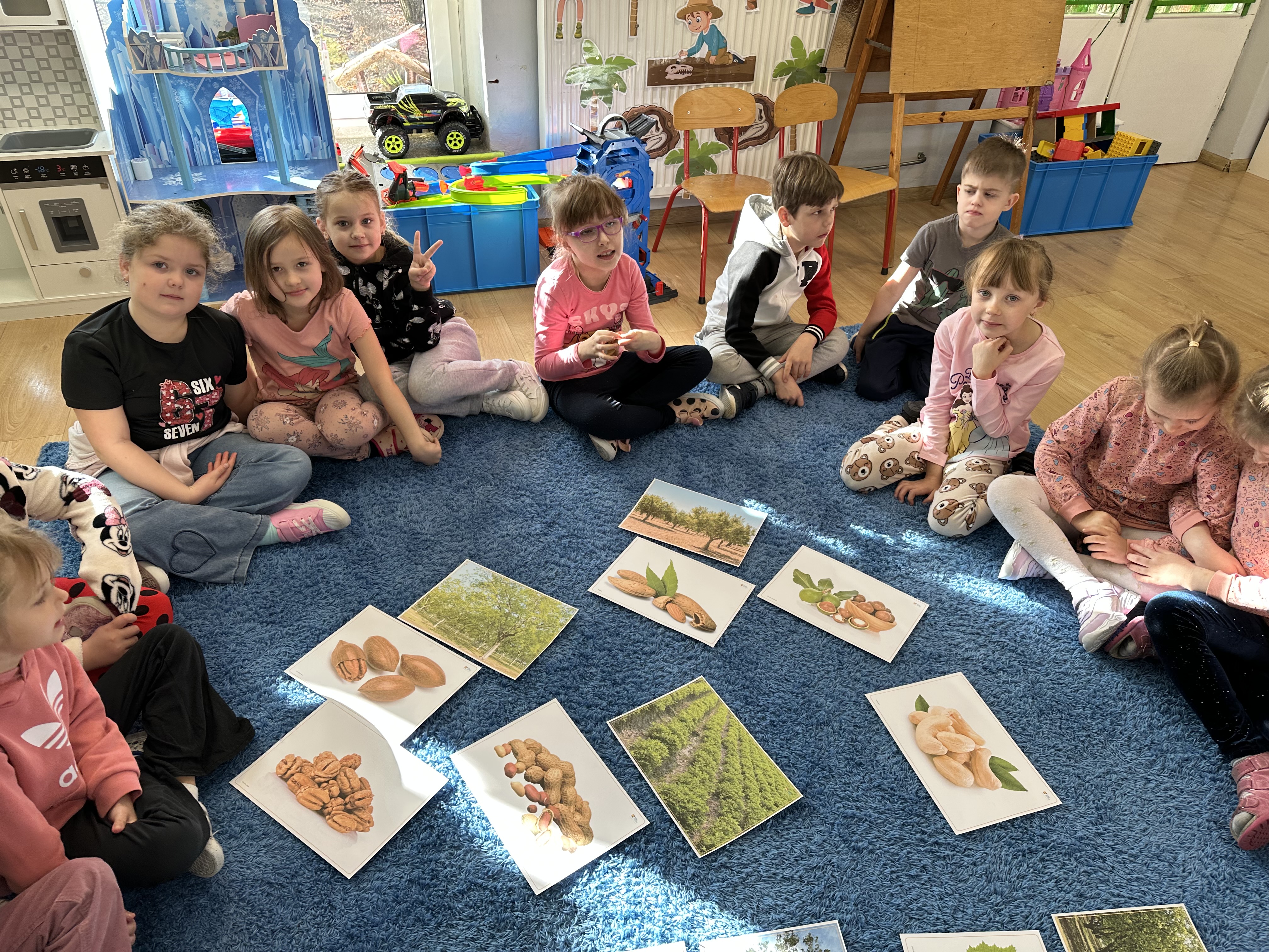 W ramach realizacji kolejnego modułu projektu edukacyjnego grupa „Pszczółek” poznawała wartości odżywcze orzechów. Wprowadzeniem do zajęć było wysłuchanie wiersza pt. „Orzechowy skarb”, który stał się inspiracją do rozmowy na temat różnych rodzajów orzechów. Dzieci aktywnie uczestniczyły w dyskusji – wymieniały znane im rodzaje orzechów oraz dzieliły się swoimi preferencjami smakowymi. Następnie oglądały ilustracje przedstawiające różnorodne orzechy oraz wysłuchały ciekawostek na ich temat. Miały również okazję do bezpośredniego kontaktu z wybranymi okazami – orzechami włoskimi i laskowymi - poprzez dotykanie, wąchanie i degustację. Dużym zainteresowaniem cieszył się film edukacyjny przedstawiający proces wzrostu orzechów ziemnych w przyspieszonym tempie. Po jego obejrzeniu dzieci utrwalały zdobytą wiedzę, układając ilustracje w odpowiedniej kolejności. W trakcie zajęć nie zabrakło również aktywności ruchowych – dzieci brały udział w zabawie „Wiewiórka hop do dziupli z orzeszkiem – wiewiórka z dziupli”, która rozwijała ich sprawność fizyczną i refleks. W dalszej części zajęć dzieci zapoznały się z nazwami zdrowych potraw zawierających orzechy oraz uczestniczyły w zabawie „Układanka lewopółkulowa”, odwzorowując kształty z orzechów na planszach oraz tworząc własne kompozycje. Ćwiczyły również spostrzegawczość w zabawie „Rozpoznaj i połącz”. Zrealizowane działania pozwoliły dzieciom poszerzyć wiedzę na temat zdrowego odżywiania, rozwijać zmysły oraz umiejętności poznawcze i manualne.