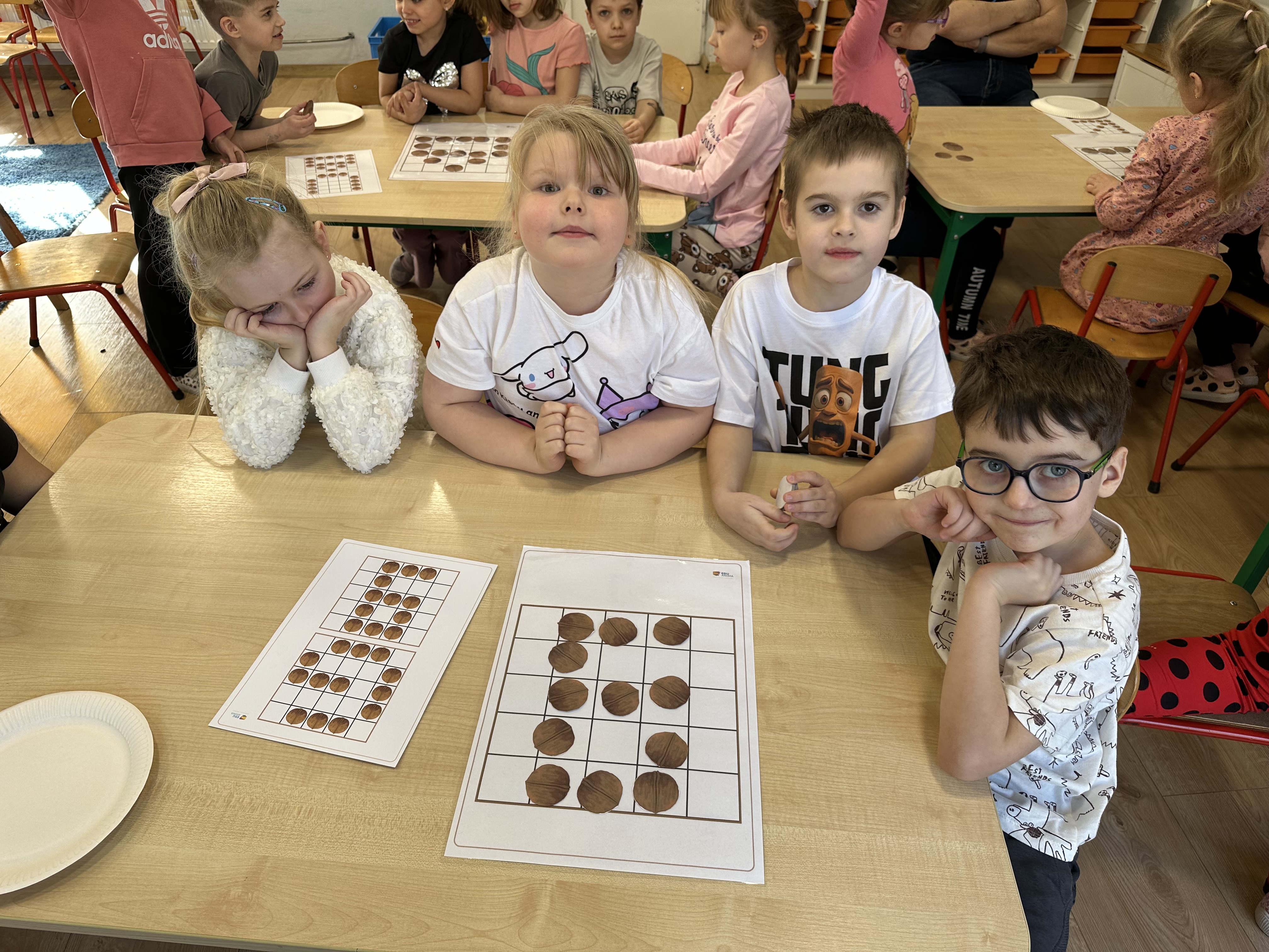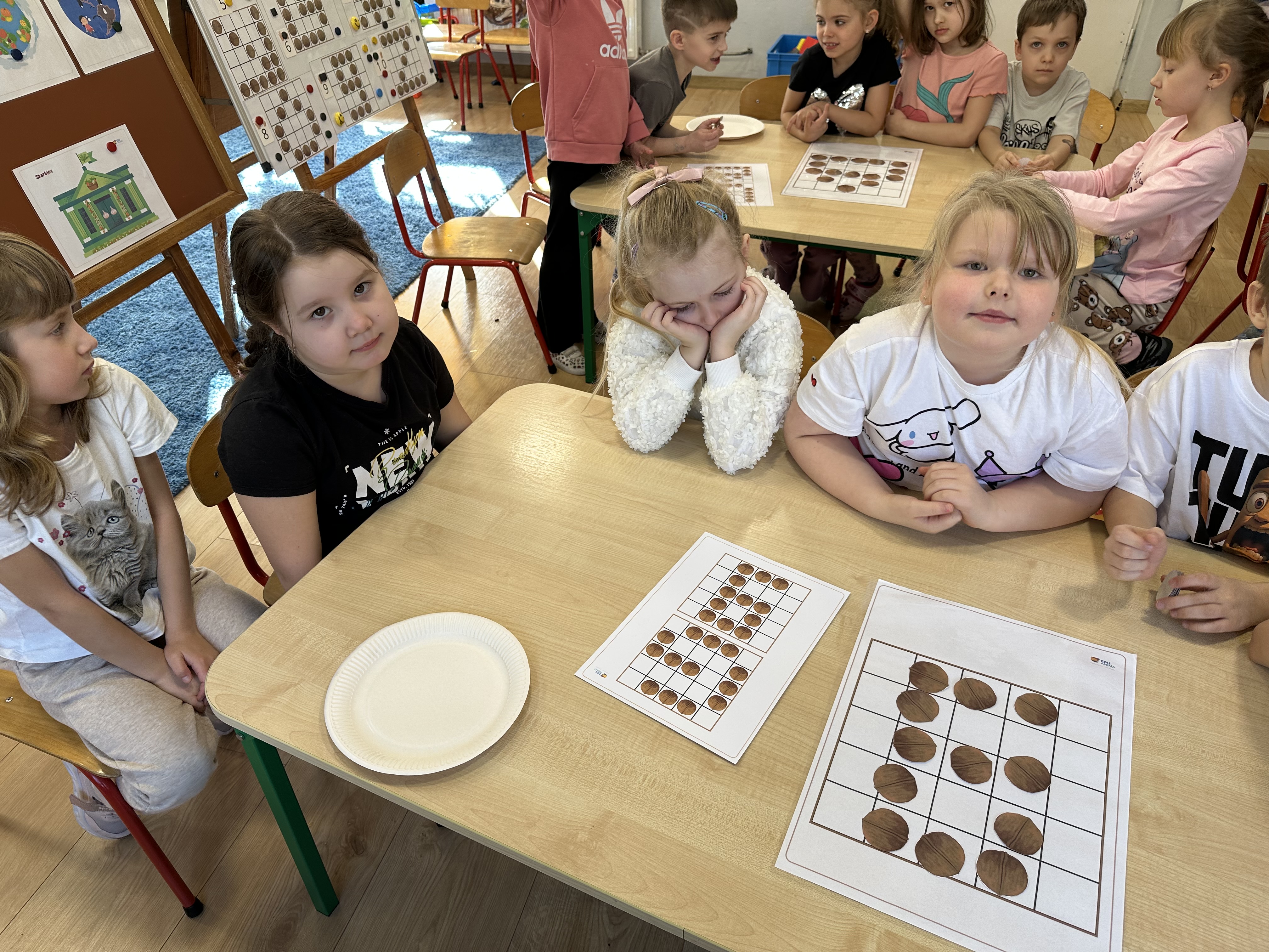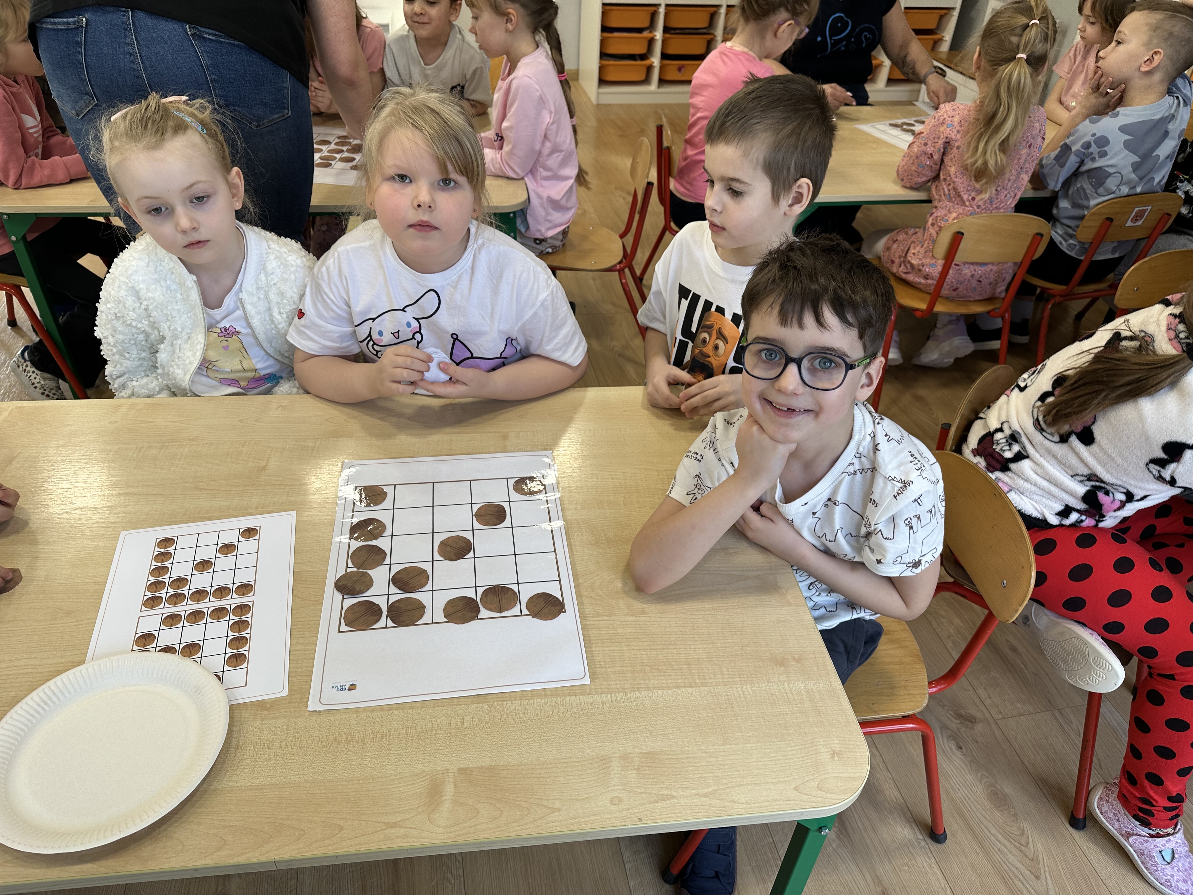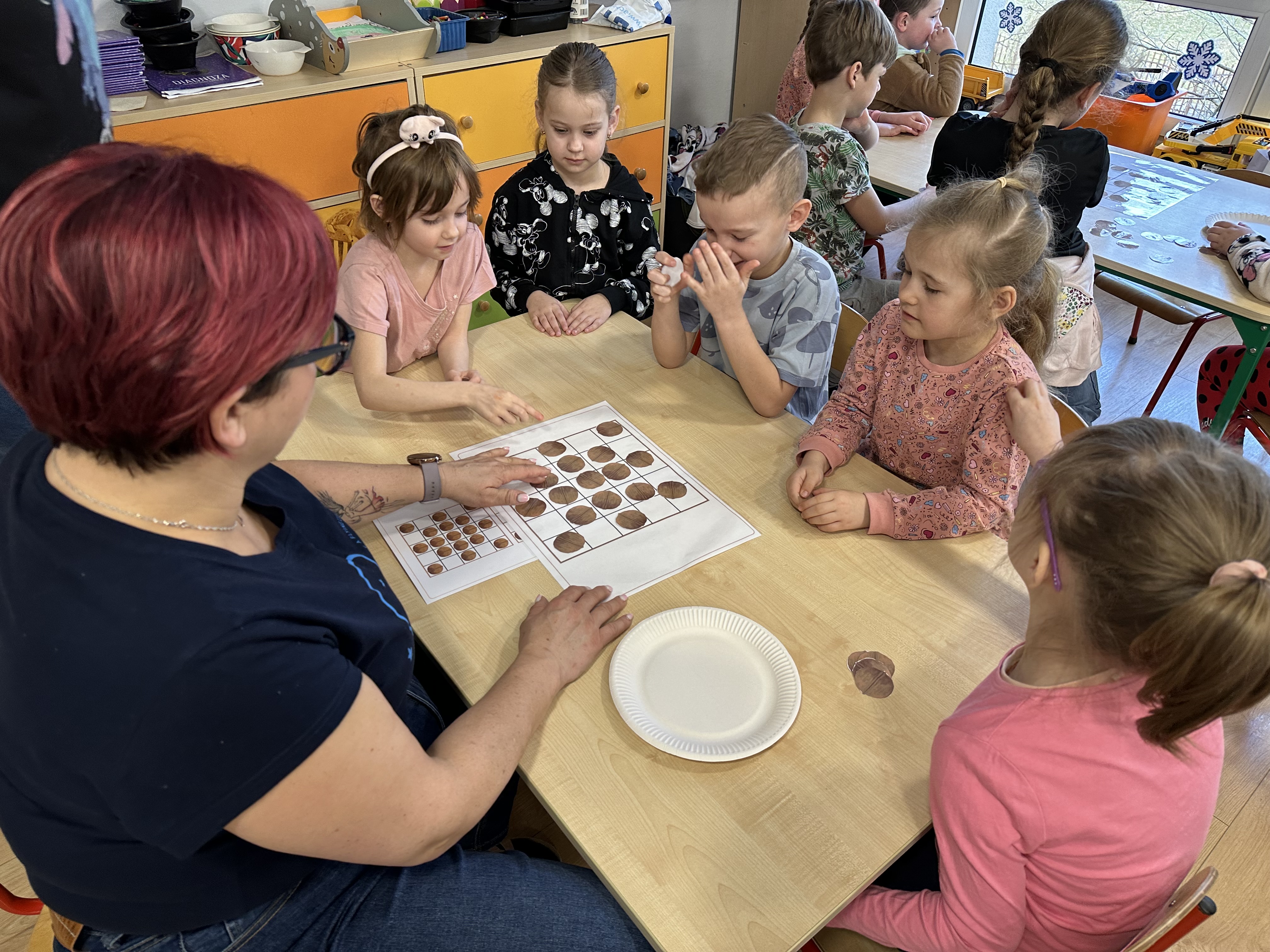 W ramach realizacji kolejnego modułu projektu edukacyjnego grupa „Pszczółek” poznawała wartości odżywcze orzechów. Wprowadzeniem do zajęć było wysłuchanie wiersza pt. „Orzechowy skarb”, który stał się inspiracją do rozmowy na temat różnych rodzajów orzechów. Dzieci aktywnie uczestniczyły w dyskusji – wymieniały znane im rodzaje orzechów oraz dzieliły się swoimi preferencjami smakowymi. Następnie oglądały ilustracje przedstawiające różnorodne orzechy oraz wysłuchały ciekawostek na ich temat. Miały również okazję do bezpośredniego kontaktu z wybranymi okazami – orzechami włoskimi i laskowymi - poprzez dotykanie, wąchanie i degustację. Dużym zainteresowaniem cieszył się film edukacyjny przedstawiający proces wzrostu orzechów ziemnych w przyspieszonym tempie. Po jego obejrzeniu dzieci utrwalały zdobytą wiedzę, układając ilustracje w odpowiedniej kolejności. W trakcie zajęć nie zabrakło również aktywności ruchowych – dzieci brały udział w zabawie „Wiewiórka hop do dziupli z orzeszkiem – wiewiórka z dziupli”, która rozwijała ich sprawność fizyczną i refleks. W dalszej części zajęć dzieci zapoznały się z nazwami zdrowych potraw zawierających orzechy oraz uczestniczyły w zabawie „Układanka lewopółkulowa”, odwzorowując kształty z orzechów na planszach oraz tworząc własne kompozycje. Ćwiczyły również spostrzegawczość w zabawie „Rozpoznaj i połącz”. Zrealizowane działania pozwoliły dzieciom poszerzyć wiedzę na temat zdrowego odżywiania, rozwijać zmysły oraz umiejętności poznawcze i manualne.