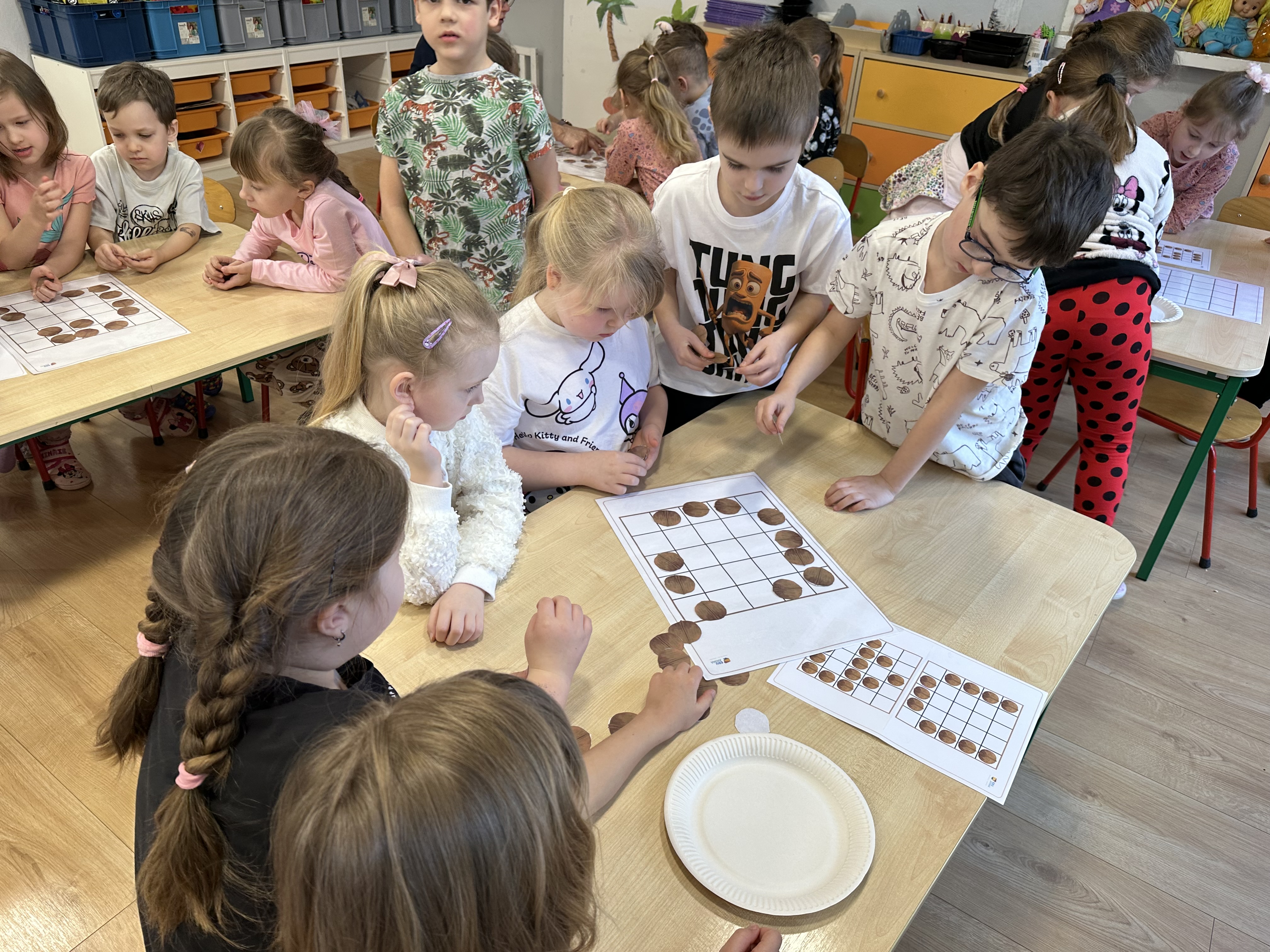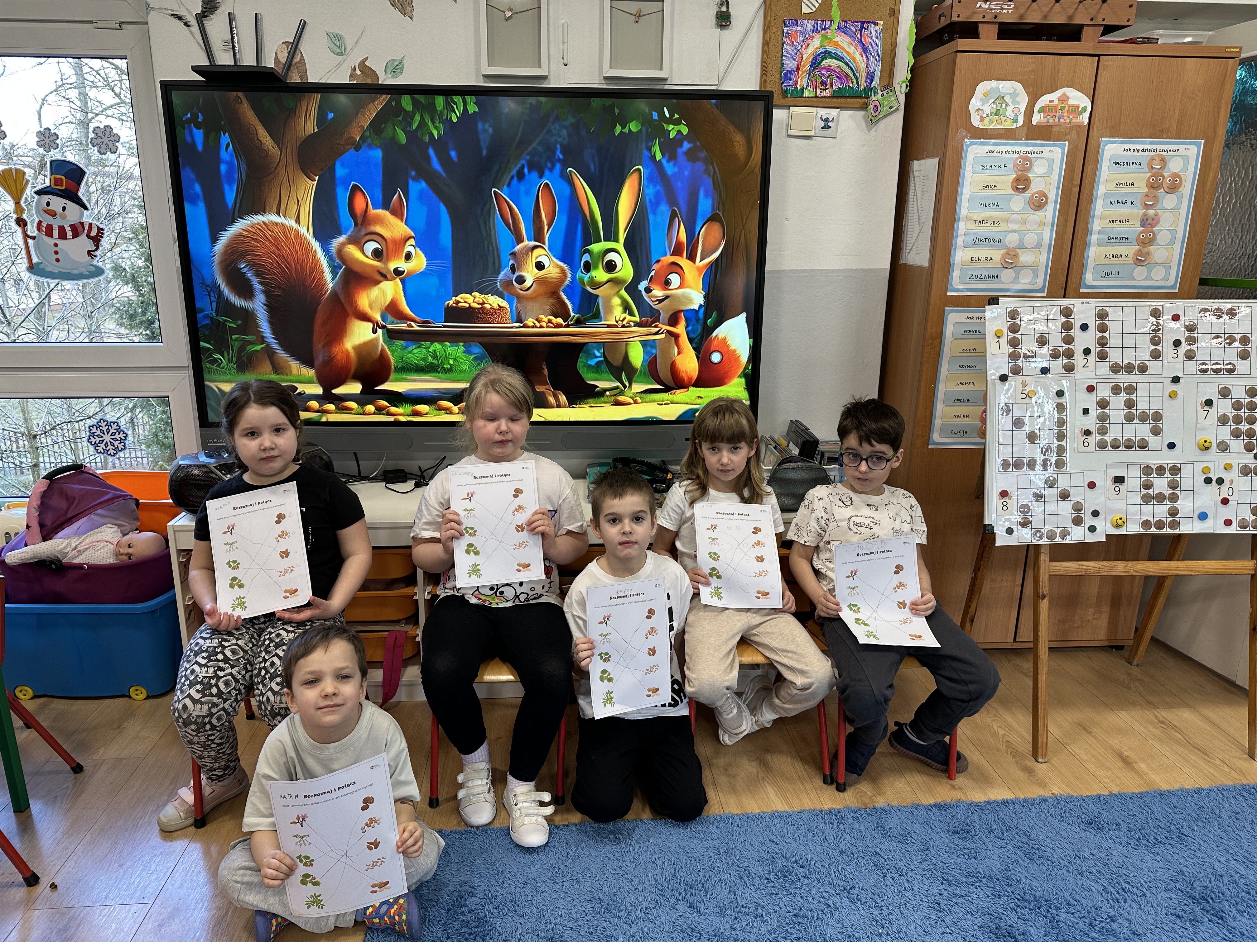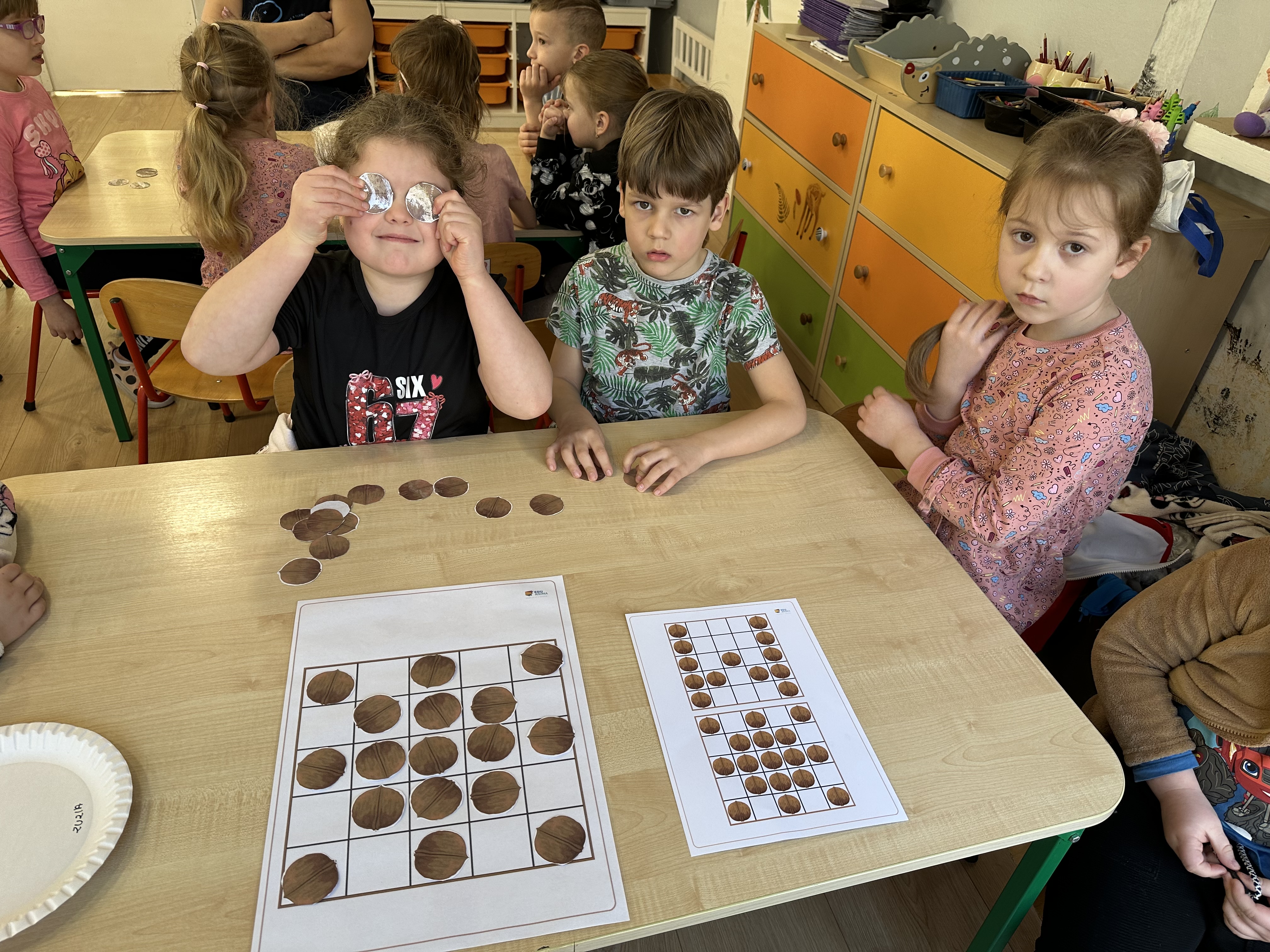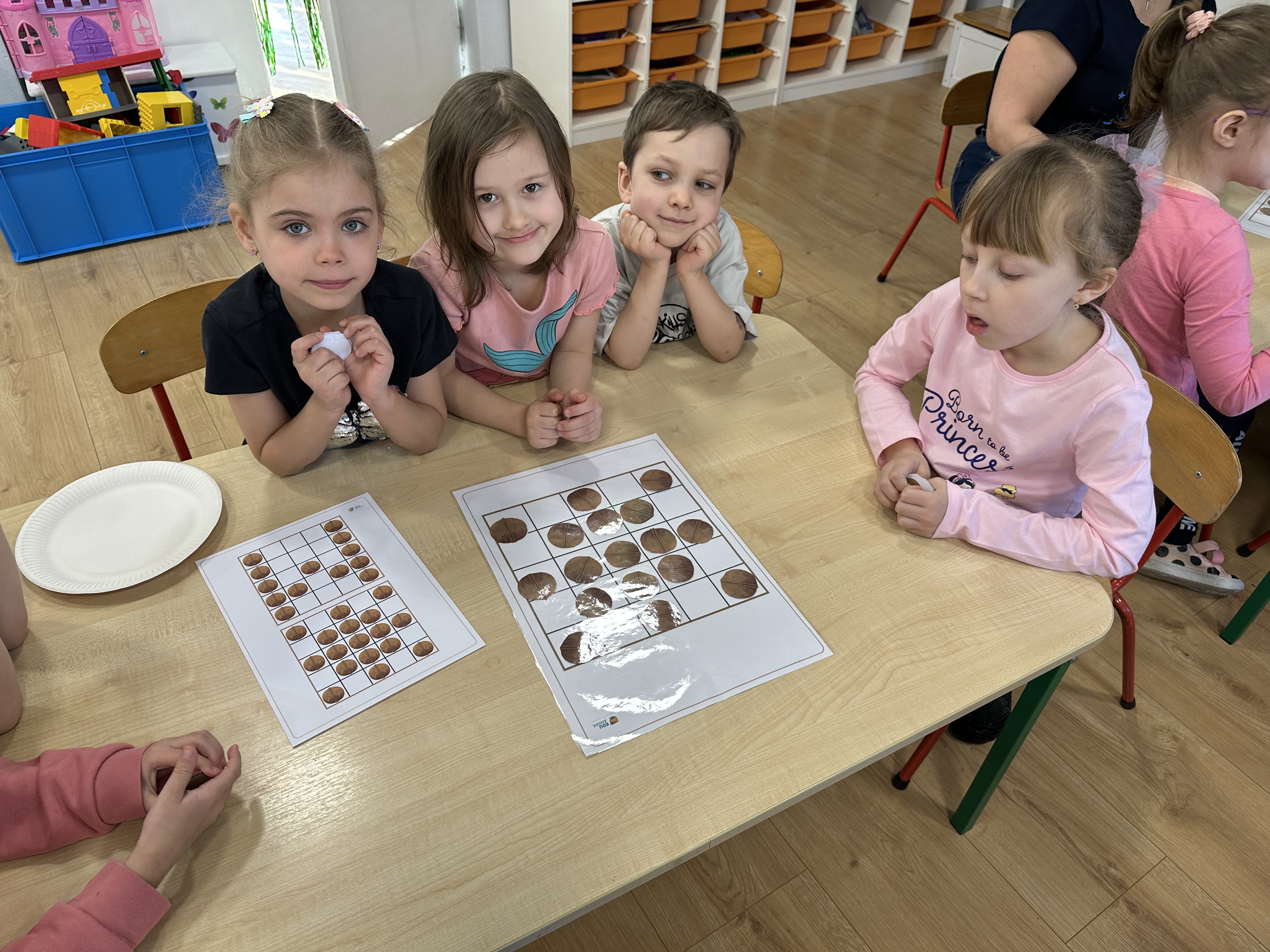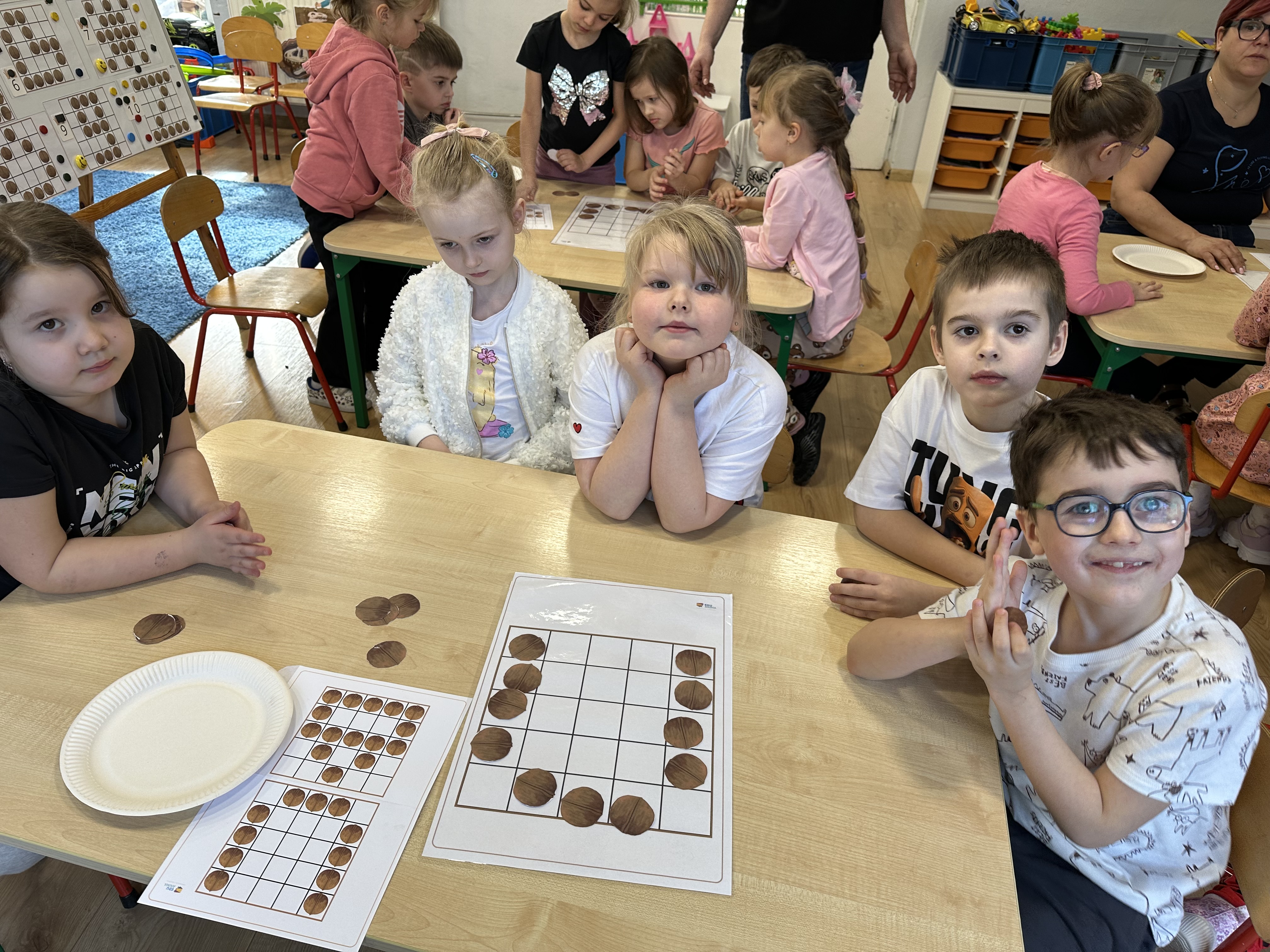 W ramach realizacji kolejnego modułu projektu edukacyjnego grupa „Pszczółek” poznawała wartości odżywcze orzechów. Wprowadzeniem do zajęć było wysłuchanie wiersza pt. „Orzechowy skarb”, który stał się inspiracją do rozmowy na temat różnych rodzajów orzechów. Dzieci aktywnie uczestniczyły w dyskusji – wymieniały znane im rodzaje orzechów oraz dzieliły się swoimi preferencjami smakowymi. Następnie oglądały ilustracje przedstawiające różnorodne orzechy oraz wysłuchały ciekawostek na ich temat. Miały również okazję do bezpośredniego kontaktu z wybranymi okazami – orzechami włoskimi i laskowymi - poprzez dotykanie, wąchanie i degustację. Dużym zainteresowaniem cieszył się film edukacyjny przedstawiający proces wzrostu orzechów ziemnych w przyspieszonym tempie. Po jego obejrzeniu dzieci utrwalały zdobytą wiedzę, układając ilustracje w odpowiedniej kolejności. W trakcie zajęć nie zabrakło również aktywności ruchowych – dzieci brały udział w zabawie „Wiewiórka hop do dziupli z orzeszkiem – wiewiórka z dziupli”, która rozwijała ich sprawność fizyczną i refleks. W dalszej części zajęć dzieci zapoznały się z nazwami zdrowych potraw zawierających orzechy oraz uczestniczyły w zabawie „Układanka lewopółkulowa”, odwzorowując kształty z orzechów na planszach oraz tworząc własne kompozycje. Ćwiczyły również spostrzegawczość w zabawie „Rozpoznaj i połącz”. Zrealizowane działania pozwoliły dzieciom poszerzyć wiedzę na temat zdrowego odżywiania, rozwijać zmysły oraz umiejętności poznawcze i manualne.