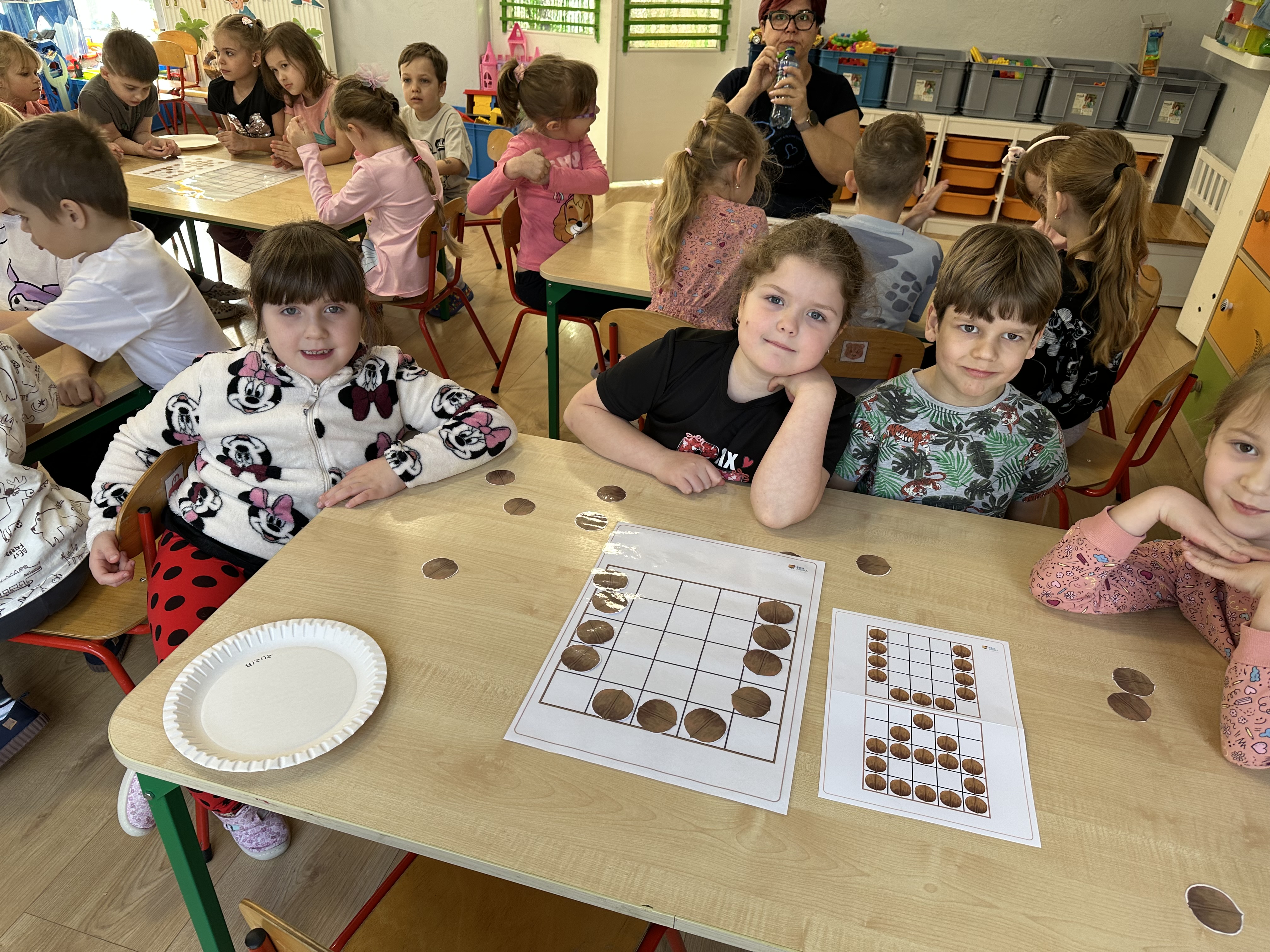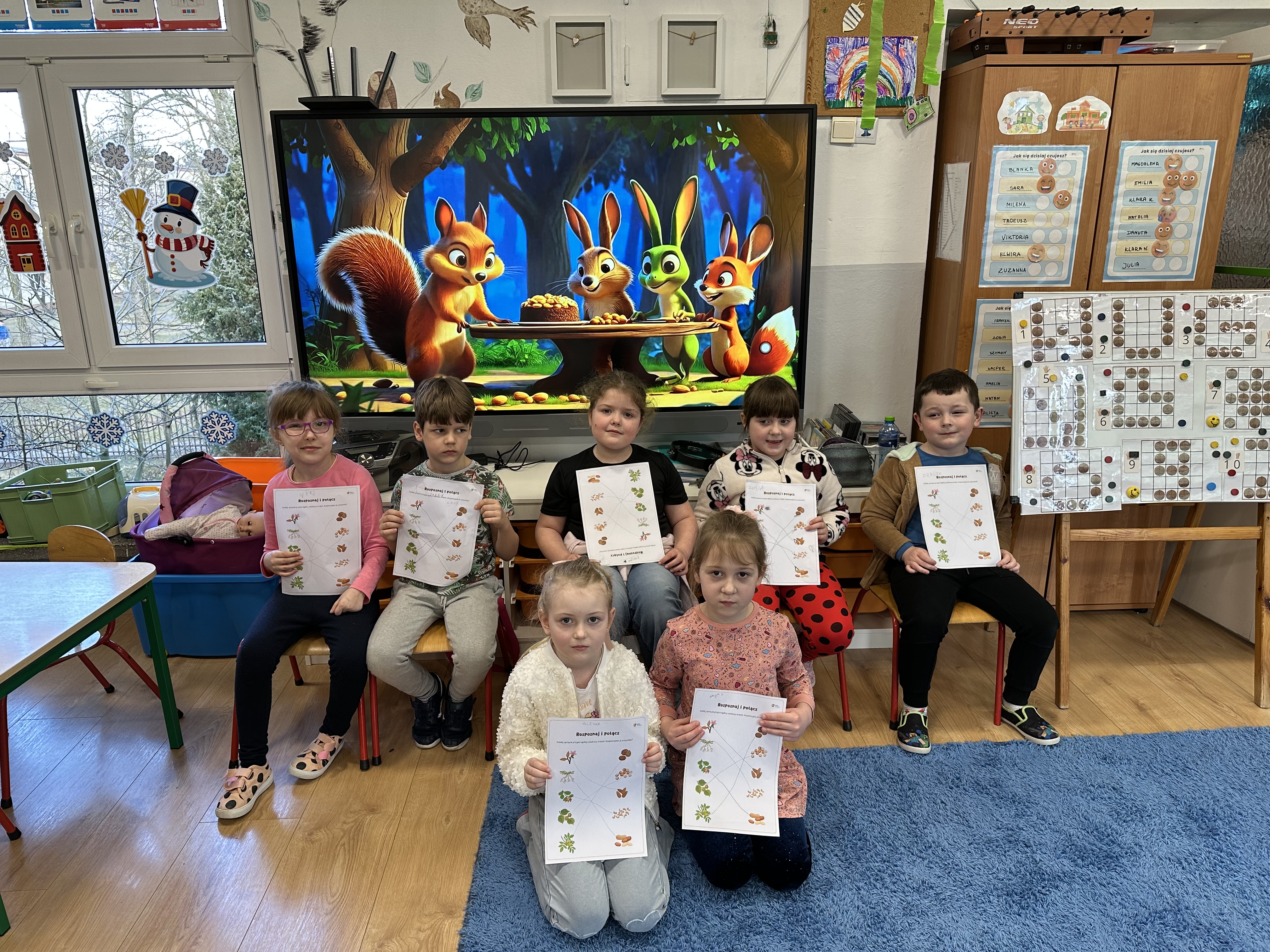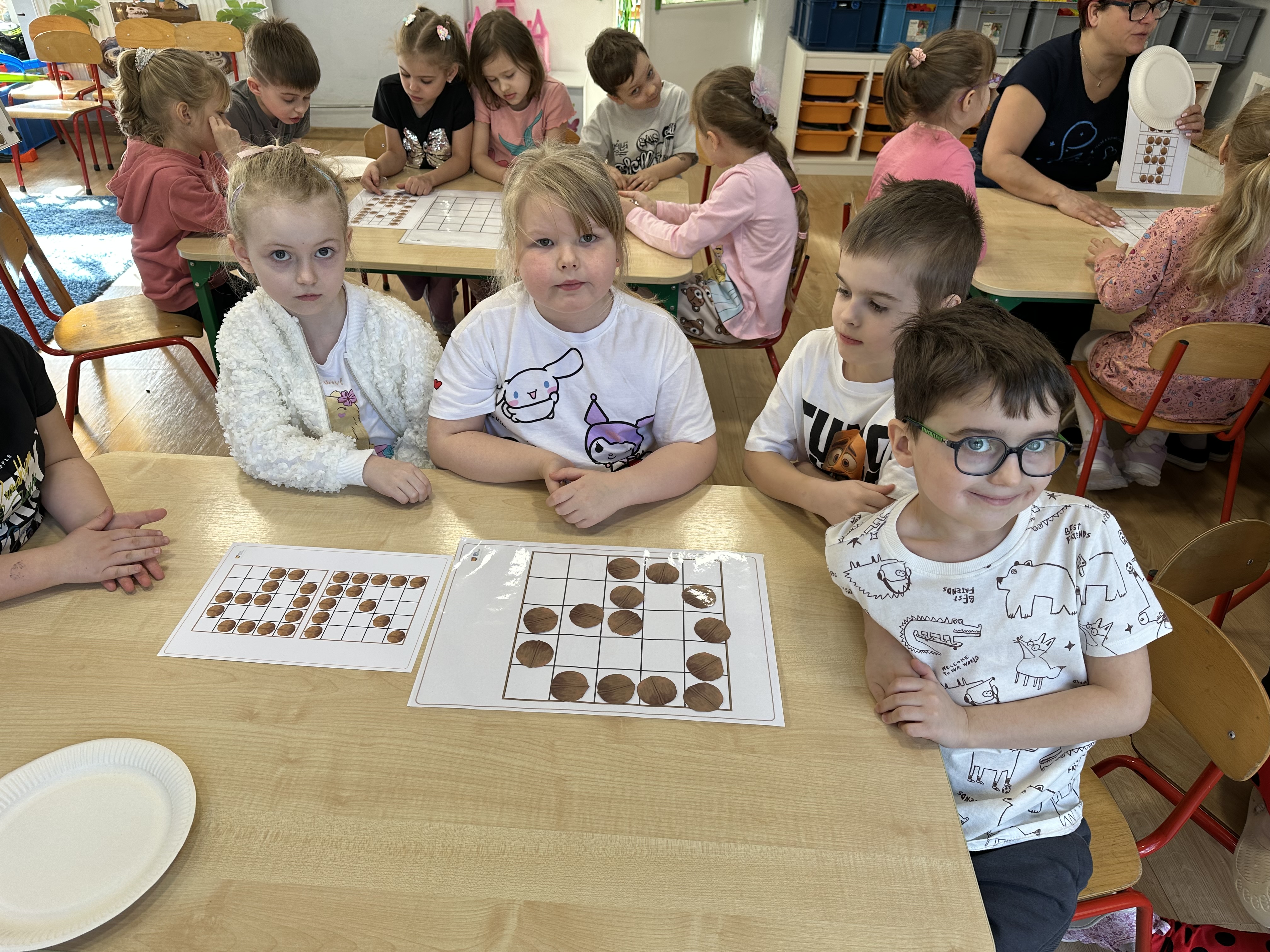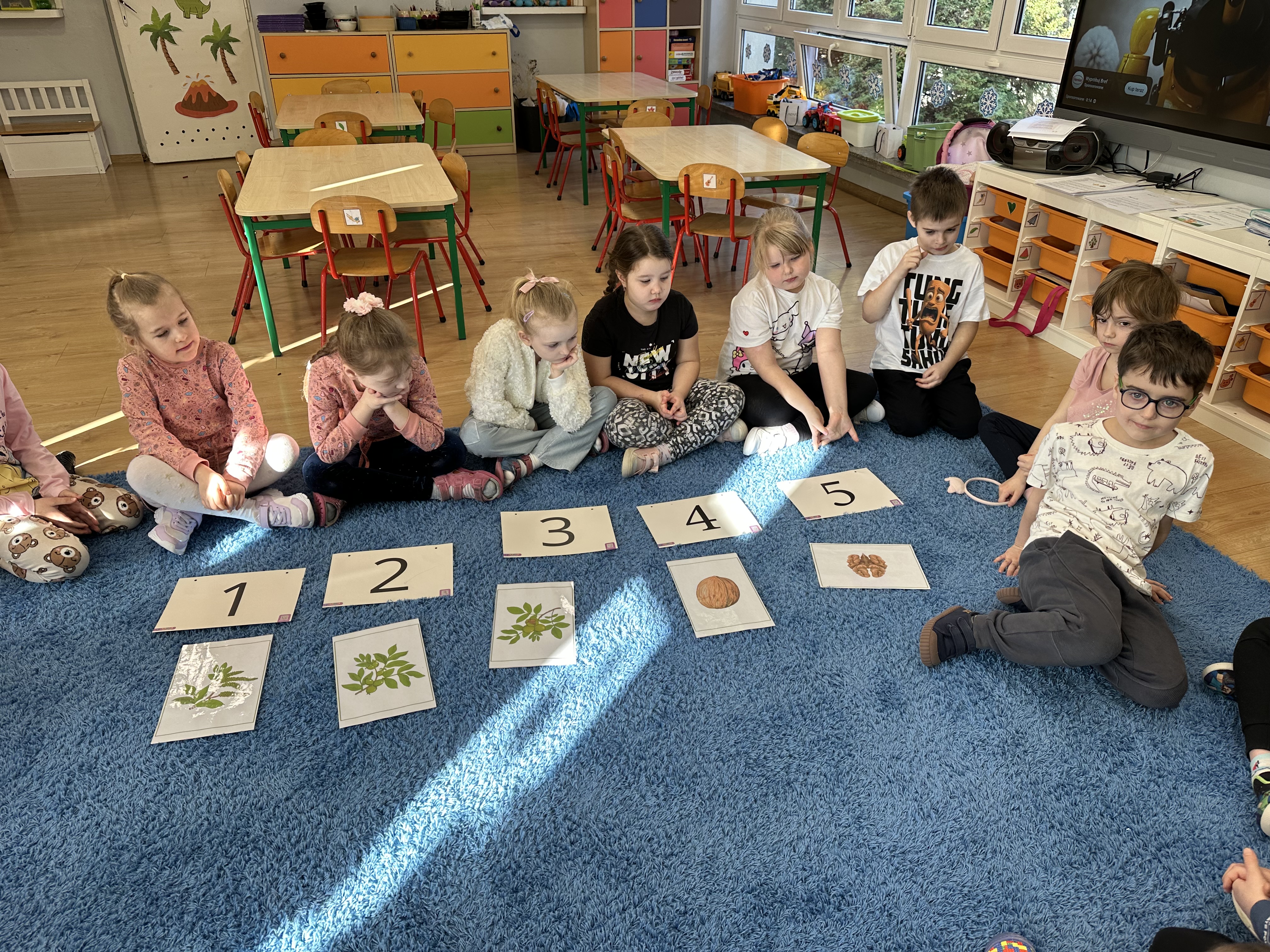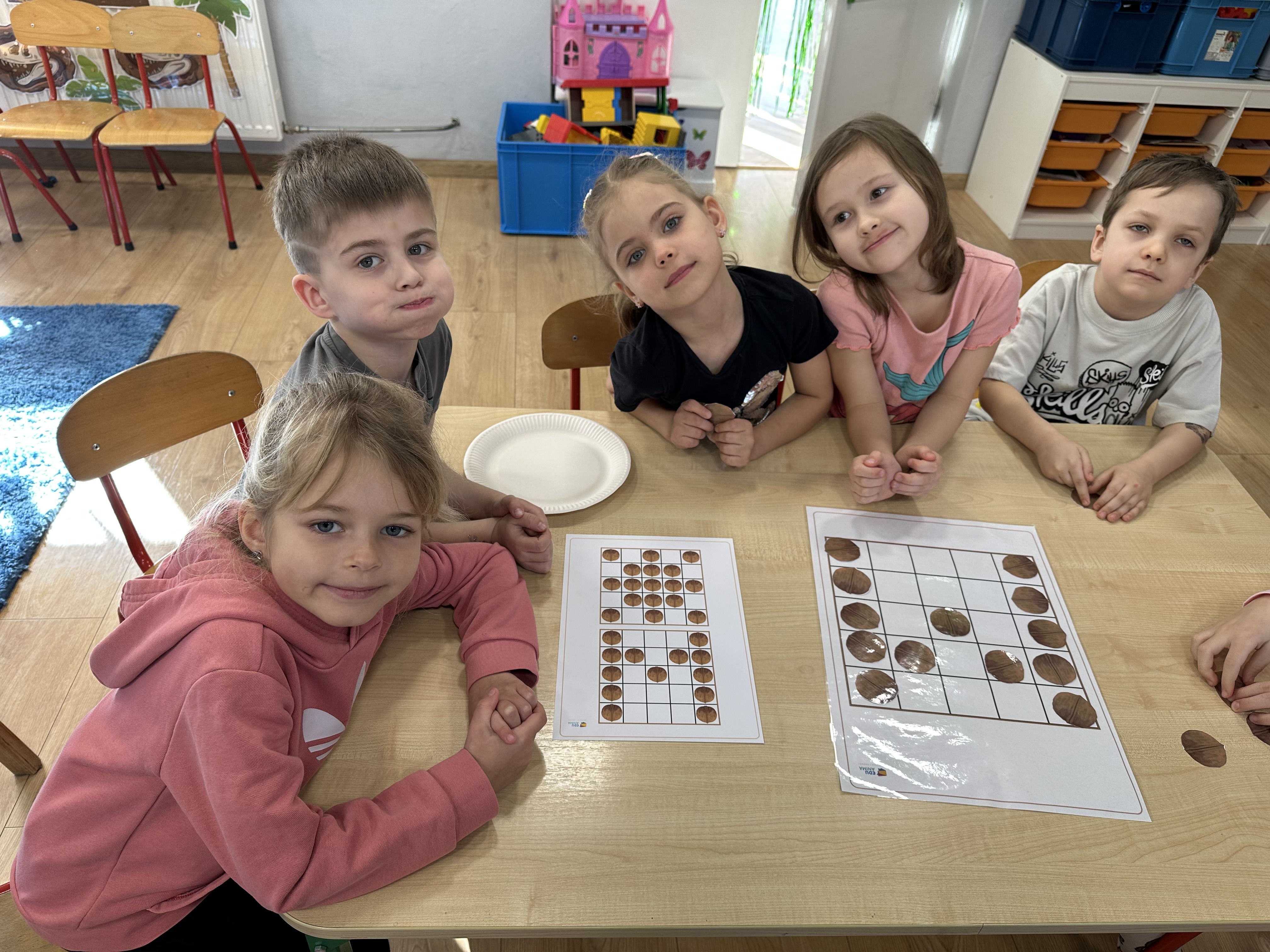 W ramach realizacji kolejnego modułu projektu edukacyjnego grupa „Pszczółek” poznawała wartości odżywcze orzechów. Wprowadzeniem do zajęć było wysłuchanie wiersza pt. „Orzechowy skarb”, który stał się inspiracją do rozmowy na temat różnych rodzajów orzechów. Dzieci aktywnie uczestniczyły w dyskusji – wymieniały znane im rodzaje orzechów oraz dzieliły się swoimi preferencjami smakowymi. Następnie oglądały ilustracje przedstawiające różnorodne orzechy oraz wysłuchały ciekawostek na ich temat. Miały również okazję do bezpośredniego kontaktu z wybranymi okazami – orzechami włoskimi i laskowymi - poprzez dotykanie, wąchanie i degustację. Dużym zainteresowaniem cieszył się film edukacyjny przedstawiający proces wzrostu orzechów ziemnych w przyspieszonym tempie. Po jego obejrzeniu dzieci utrwalały zdobytą wiedzę, układając ilustracje w odpowiedniej kolejności. W trakcie zajęć nie zabrakło również aktywności ruchowych – dzieci brały udział w zabawie „Wiewiórka hop do dziupli z orzeszkiem – wiewiórka z dziupli”, która rozwijała ich sprawność fizyczną i refleks. W dalszej części zajęć dzieci zapoznały się z nazwami zdrowych potraw zawierających orzechy oraz uczestniczyły w zabawie „Układanka lewopółkulowa”, odwzorowując kształty z orzechów na planszach oraz tworząc własne kompozycje. Ćwiczyły również spostrzegawczość w zabawie „Rozpoznaj i połącz”. Zrealizowane działania pozwoliły dzieciom poszerzyć wiedzę na temat zdrowego odżywiania, rozwijać zmysły oraz umiejętności poznawcze i manualne.