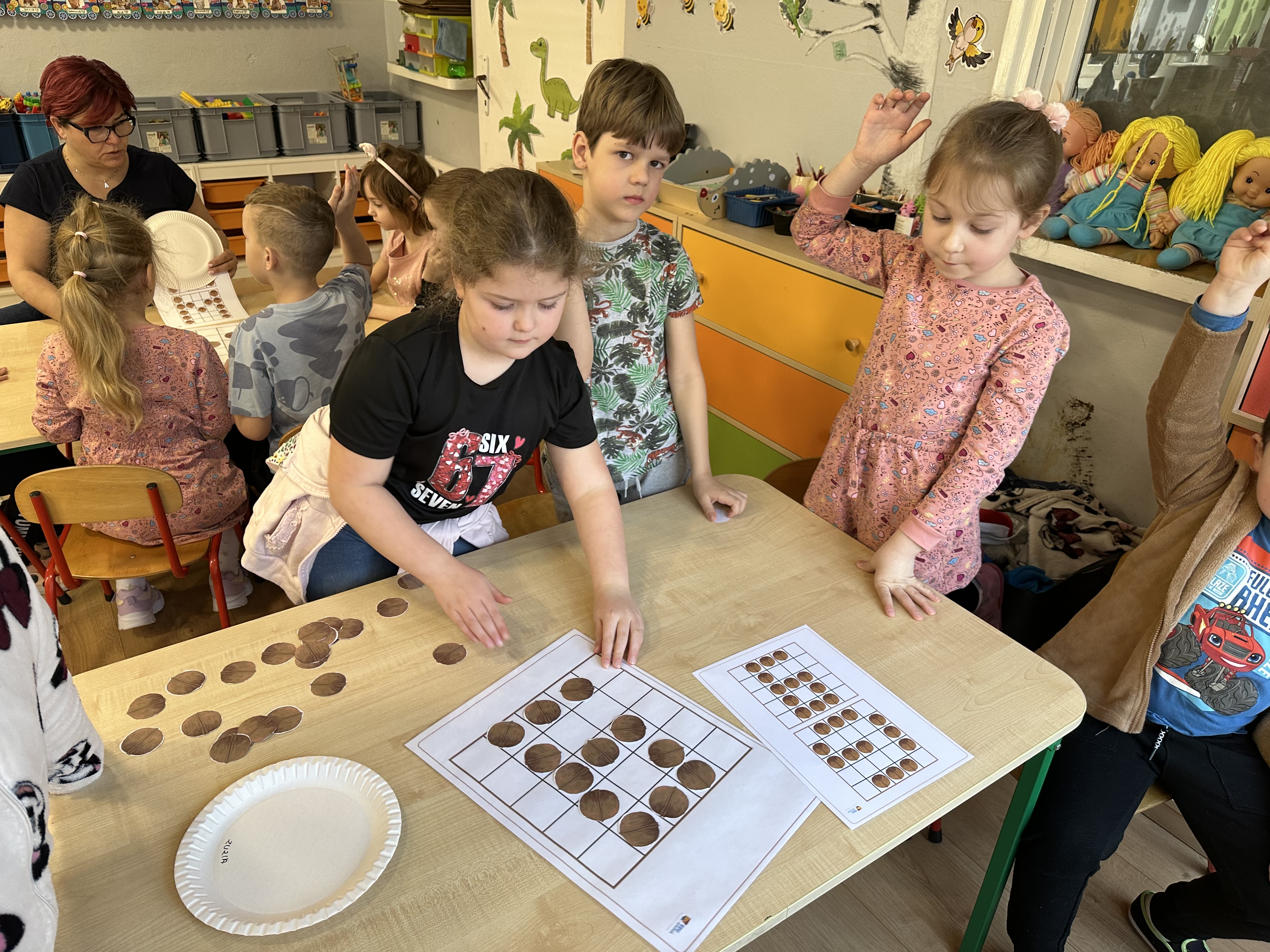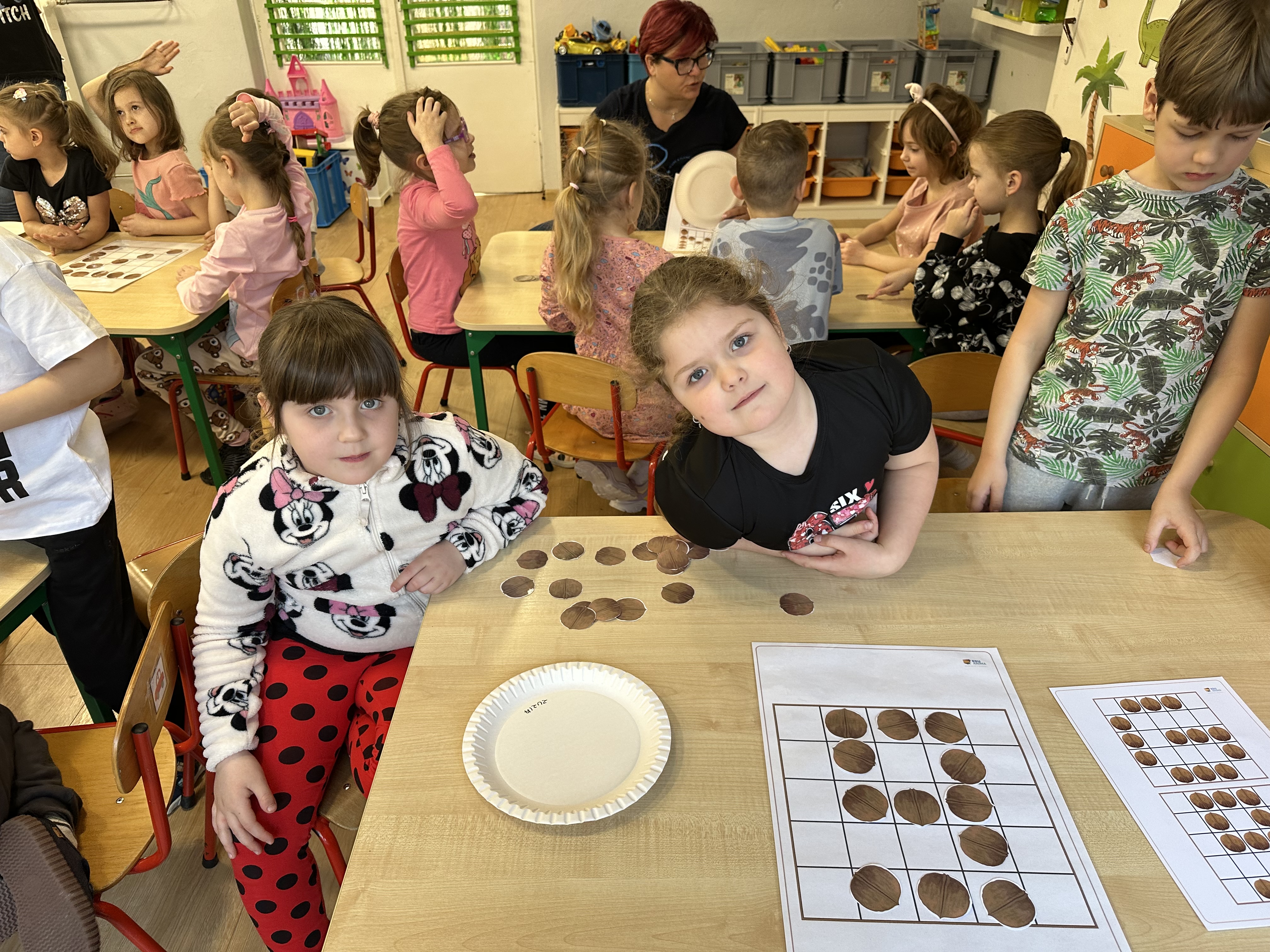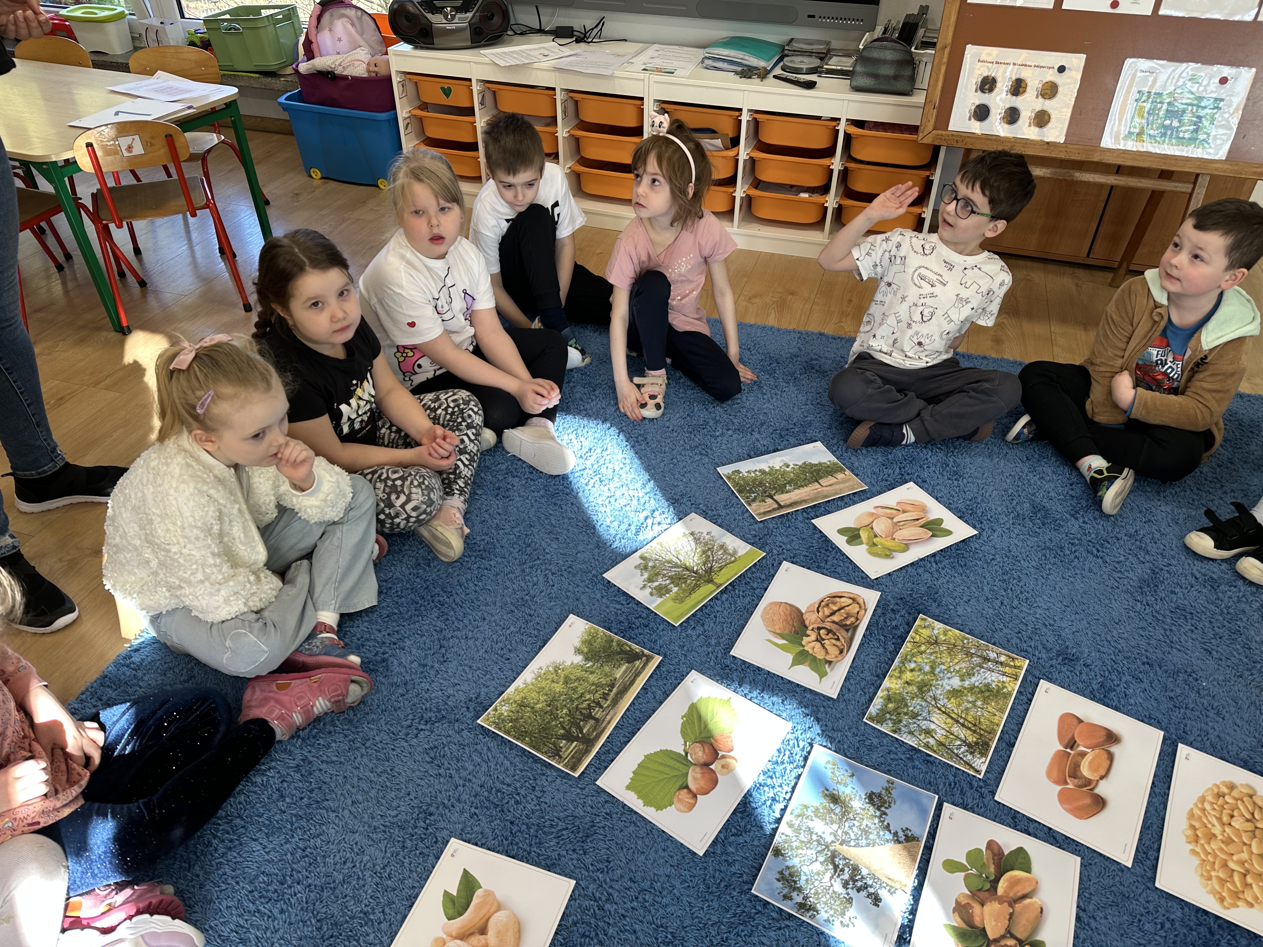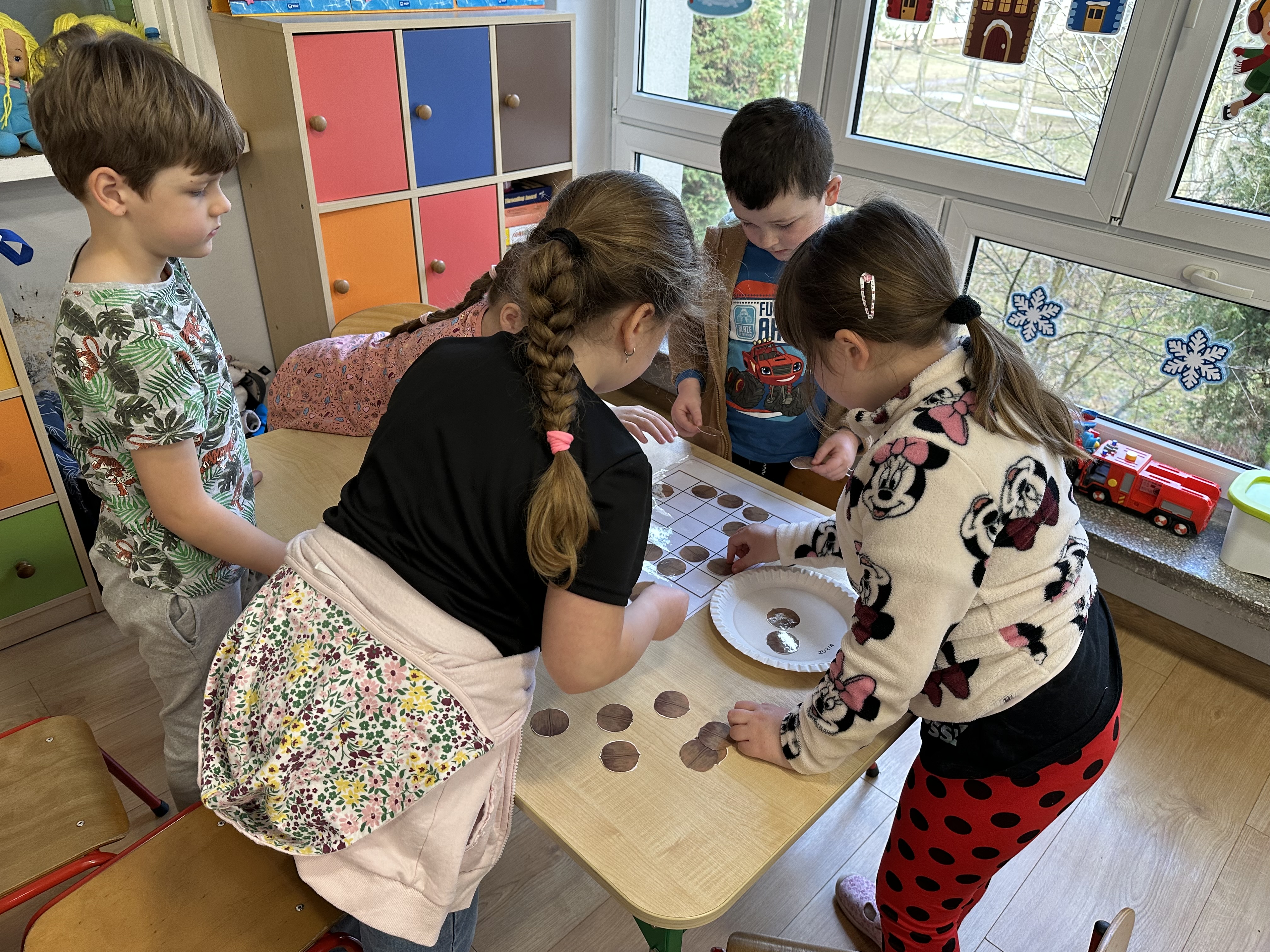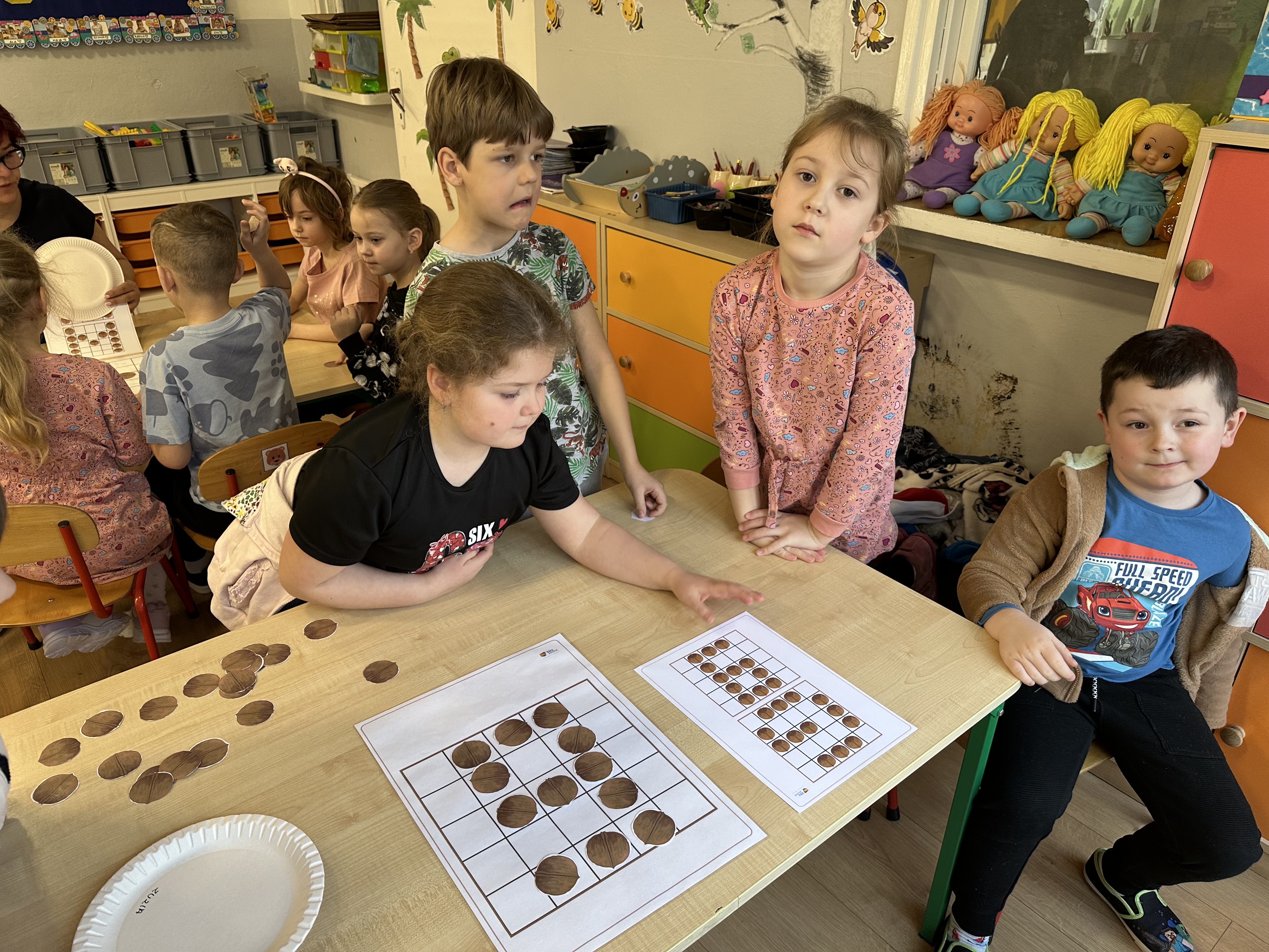 W ramach realizacji kolejnego modułu projektu edukacyjnego grupa „Pszczółek” poznawała wartości odżywcze orzechów. Wprowadzeniem do zajęć było wysłuchanie wiersza pt. „Orzechowy skarb”, który stał się inspiracją do rozmowy na temat różnych rodzajów orzechów. Dzieci aktywnie uczestniczyły w dyskusji – wymieniały znane im rodzaje orzechów oraz dzieliły się swoimi preferencjami smakowymi. Następnie oglądały ilustracje przedstawiające różnorodne orzechy oraz wysłuchały ciekawostek na ich temat. Miały również okazję do bezpośredniego kontaktu z wybranymi okazami – orzechami włoskimi i laskowymi - poprzez dotykanie, wąchanie i degustację. Dużym zainteresowaniem cieszył się film edukacyjny przedstawiający proces wzrostu orzechów ziemnych w przyspieszonym tempie. Po jego obejrzeniu dzieci utrwalały zdobytą wiedzę, układając ilustracje w odpowiedniej kolejności. W trakcie zajęć nie zabrakło również aktywności ruchowych – dzieci brały udział w zabawie „Wiewiórka hop do dziupli z orzeszkiem – wiewiórka z dziupli”, która rozwijała ich sprawność fizyczną i refleks. W dalszej części zajęć dzieci zapoznały się z nazwami zdrowych potraw zawierających orzechy oraz uczestniczyły w zabawie „Układanka lewopółkulowa”, odwzorowując kształty z orzechów na planszach oraz tworząc własne kompozycje. Ćwiczyły również spostrzegawczość w zabawie „Rozpoznaj i połącz”. Zrealizowane działania pozwoliły dzieciom poszerzyć wiedzę na temat zdrowego odżywiania, rozwijać zmysły oraz umiejętności poznawcze i manualne.