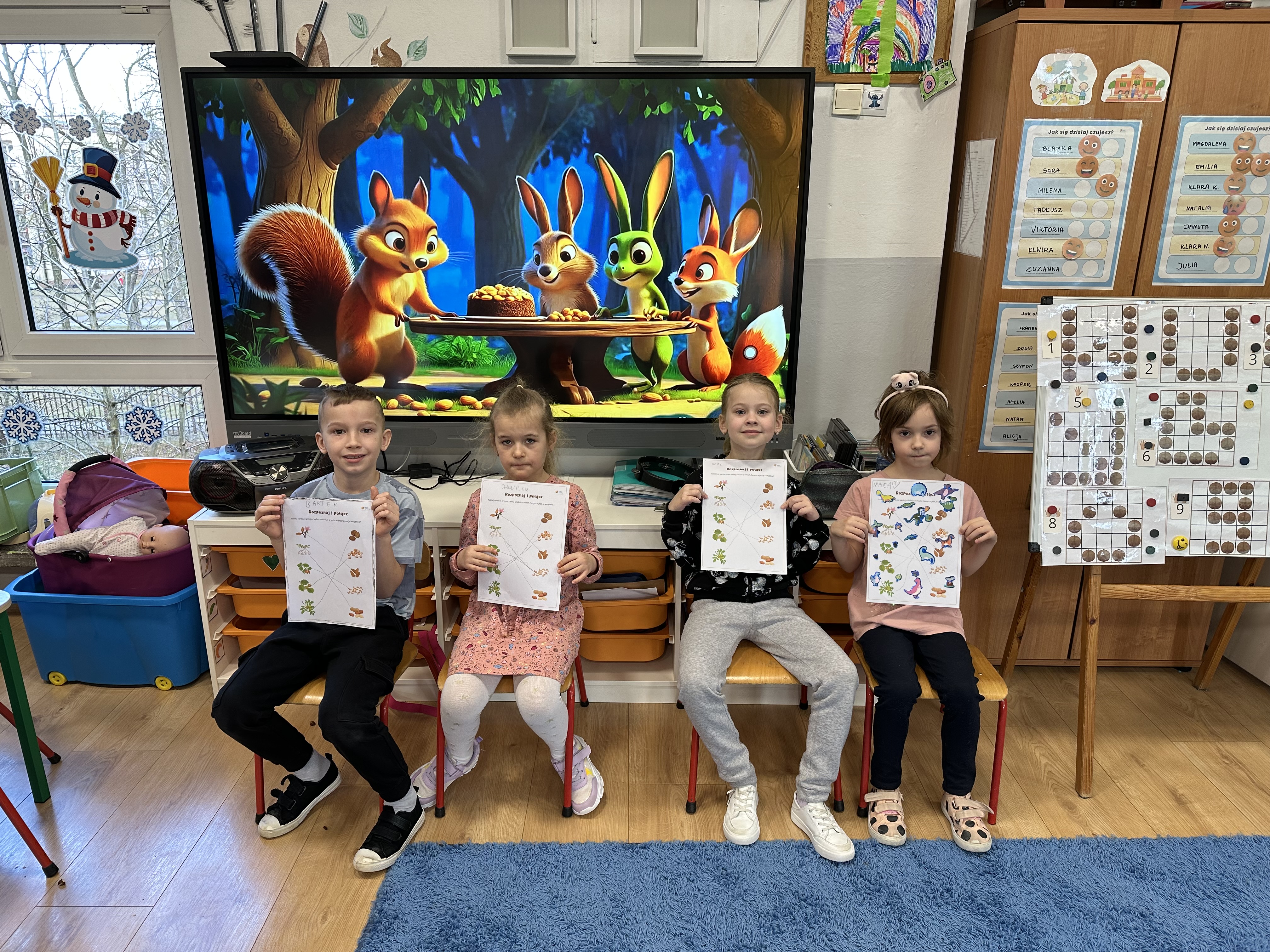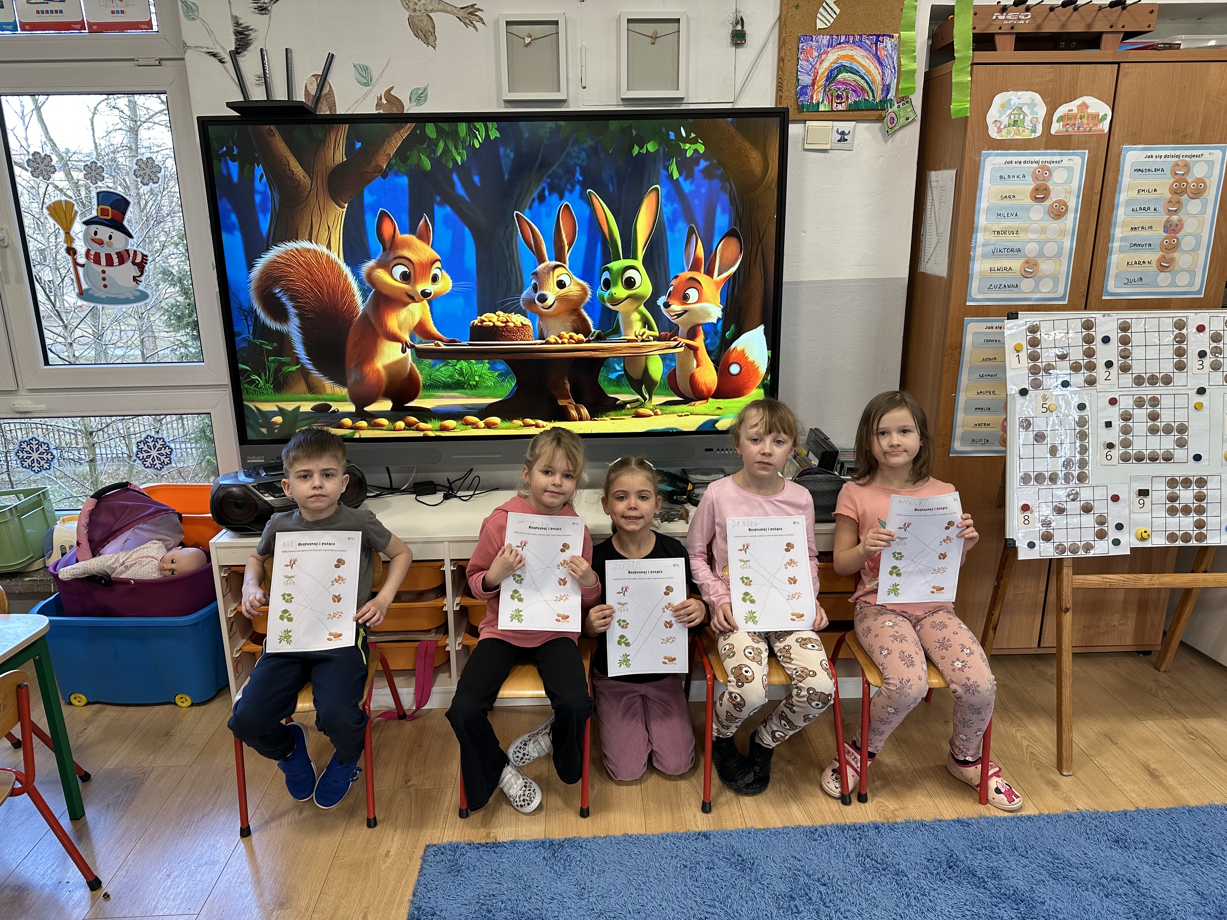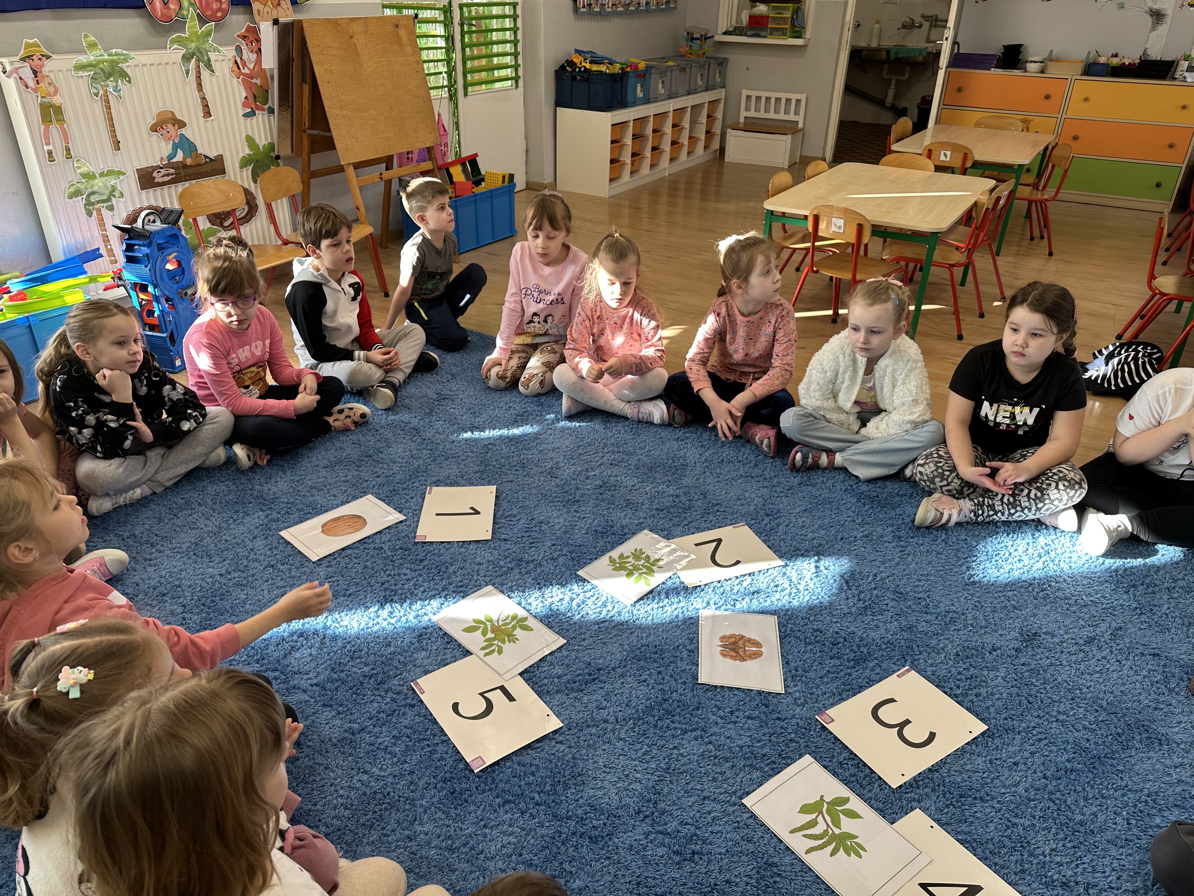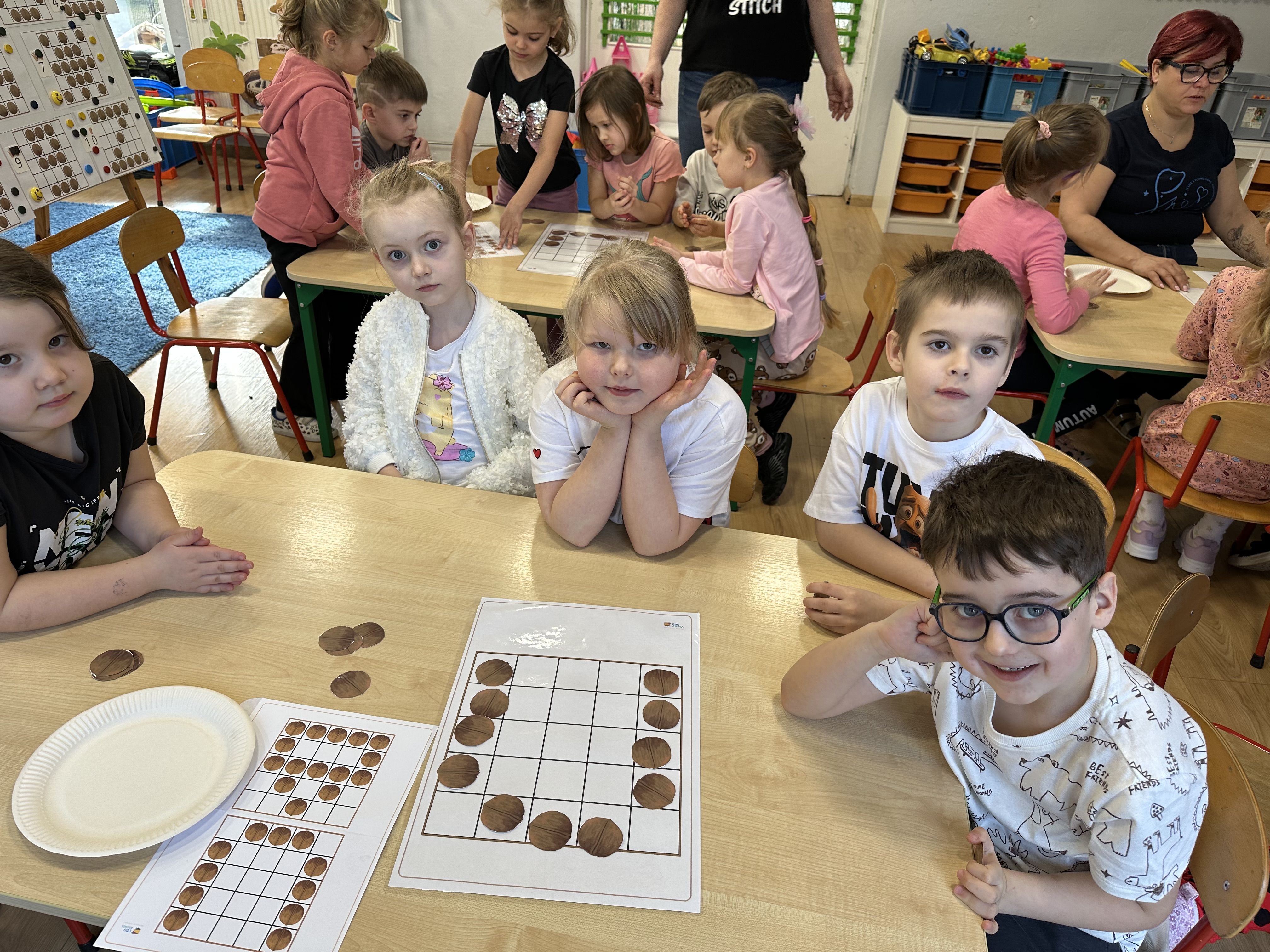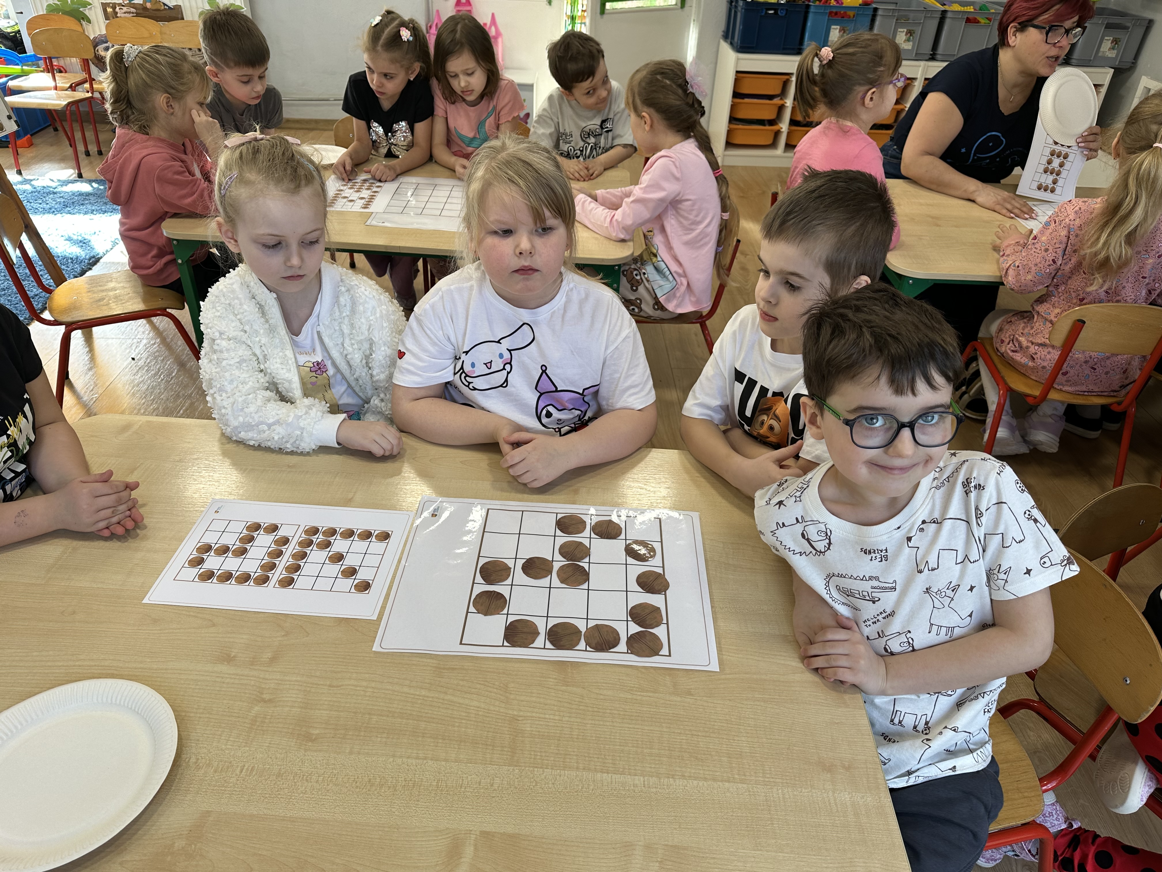 W ramach realizacji kolejnego modułu projektu edukacyjnego grupa „Pszczółek” poznawała wartości odżywcze orzechów. Wprowadzeniem do zajęć było wysłuchanie wiersza pt. „Orzechowy skarb”, który stał się inspiracją do rozmowy na temat różnych rodzajów orzechów. Dzieci aktywnie uczestniczyły w dyskusji – wymieniały znane im rodzaje orzechów oraz dzieliły się swoimi preferencjami smakowymi. Następnie oglądały ilustracje przedstawiające różnorodne orzechy oraz wysłuchały ciekawostek na ich temat. Miały również okazję do bezpośredniego kontaktu z wybranymi okazami – orzechami włoskimi i laskowymi - poprzez dotykanie, wąchanie i degustację. Dużym zainteresowaniem cieszył się film edukacyjny przedstawiający proces wzrostu orzechów ziemnych w przyspieszonym tempie. Po jego obejrzeniu dzieci utrwalały zdobytą wiedzę, układając ilustracje w odpowiedniej kolejności. W trakcie zajęć nie zabrakło również aktywności ruchowych – dzieci brały udział w zabawie „Wiewiórka hop do dziupli z orzeszkiem – wiewiórka z dziupli”, która rozwijała ich sprawność fizyczną i refleks. W dalszej części zajęć dzieci zapoznały się z nazwami zdrowych potraw zawierających orzechy oraz uczestniczyły w zabawie „Układanka lewopółkulowa”, odwzorowując kształty z orzechów na planszach oraz tworząc własne kompozycje. Ćwiczyły również spostrzegawczość w zabawie „Rozpoznaj i połącz”. Zrealizowane działania pozwoliły dzieciom poszerzyć wiedzę na temat zdrowego odżywiania, rozwijać zmysły oraz umiejętności poznawcze i manualne.